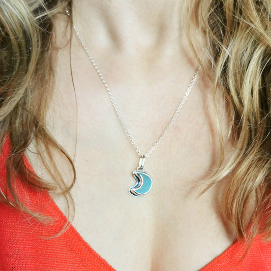 Aqua crescent moon sea glass & sterling silver pendant.