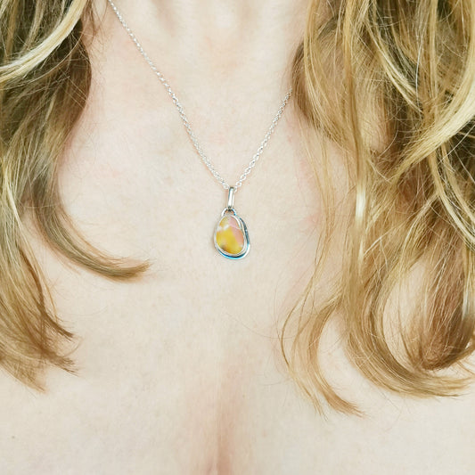 Opalescent crescent moon sea glass & sterling silver pendant.