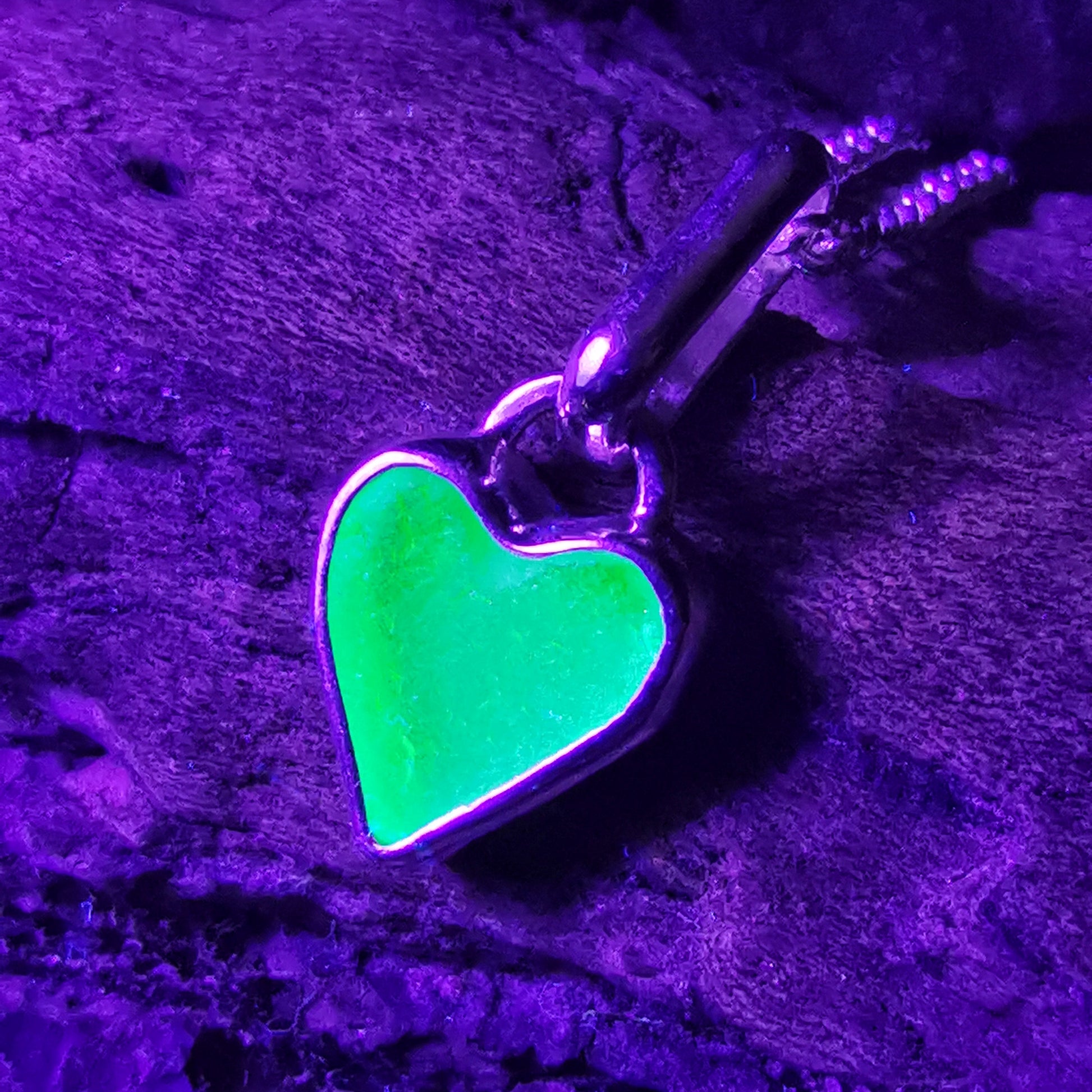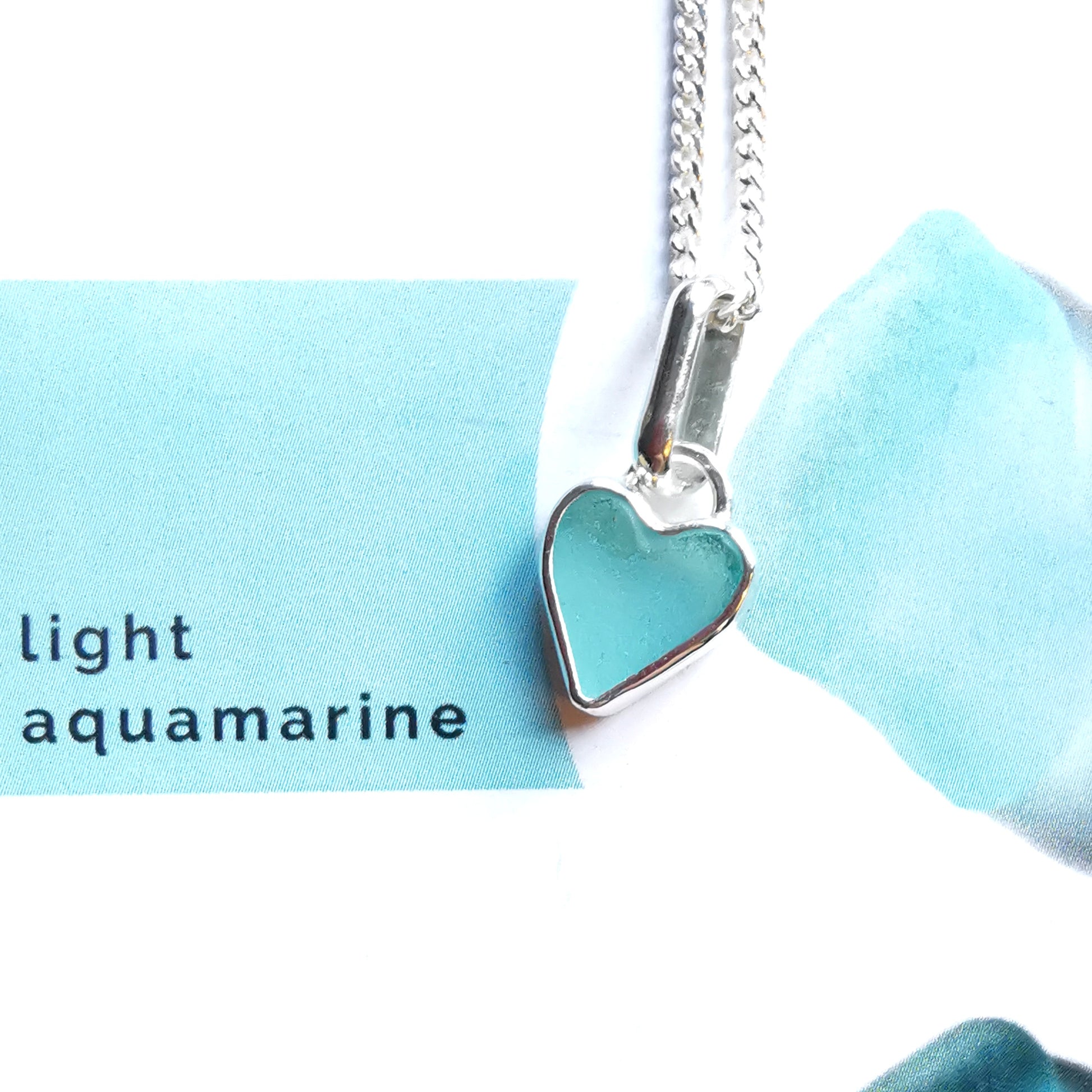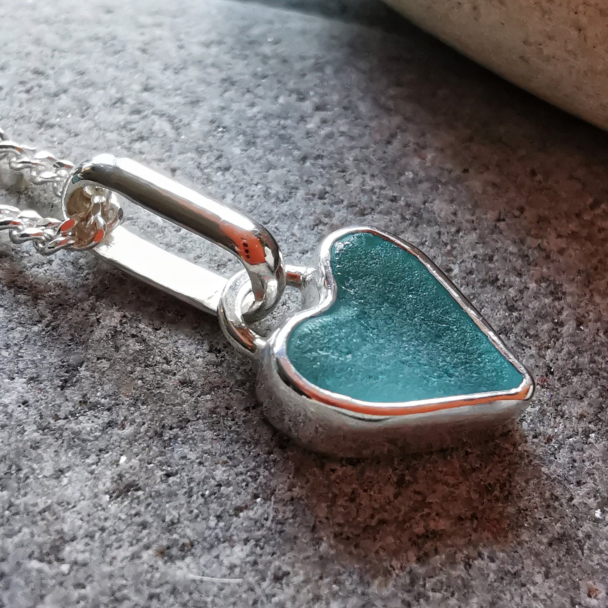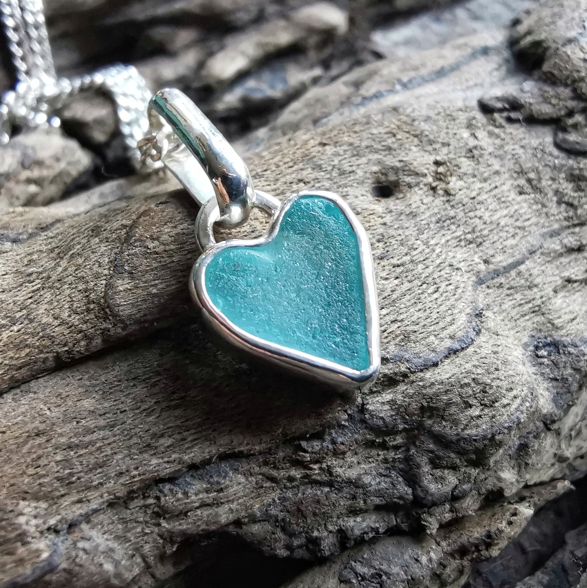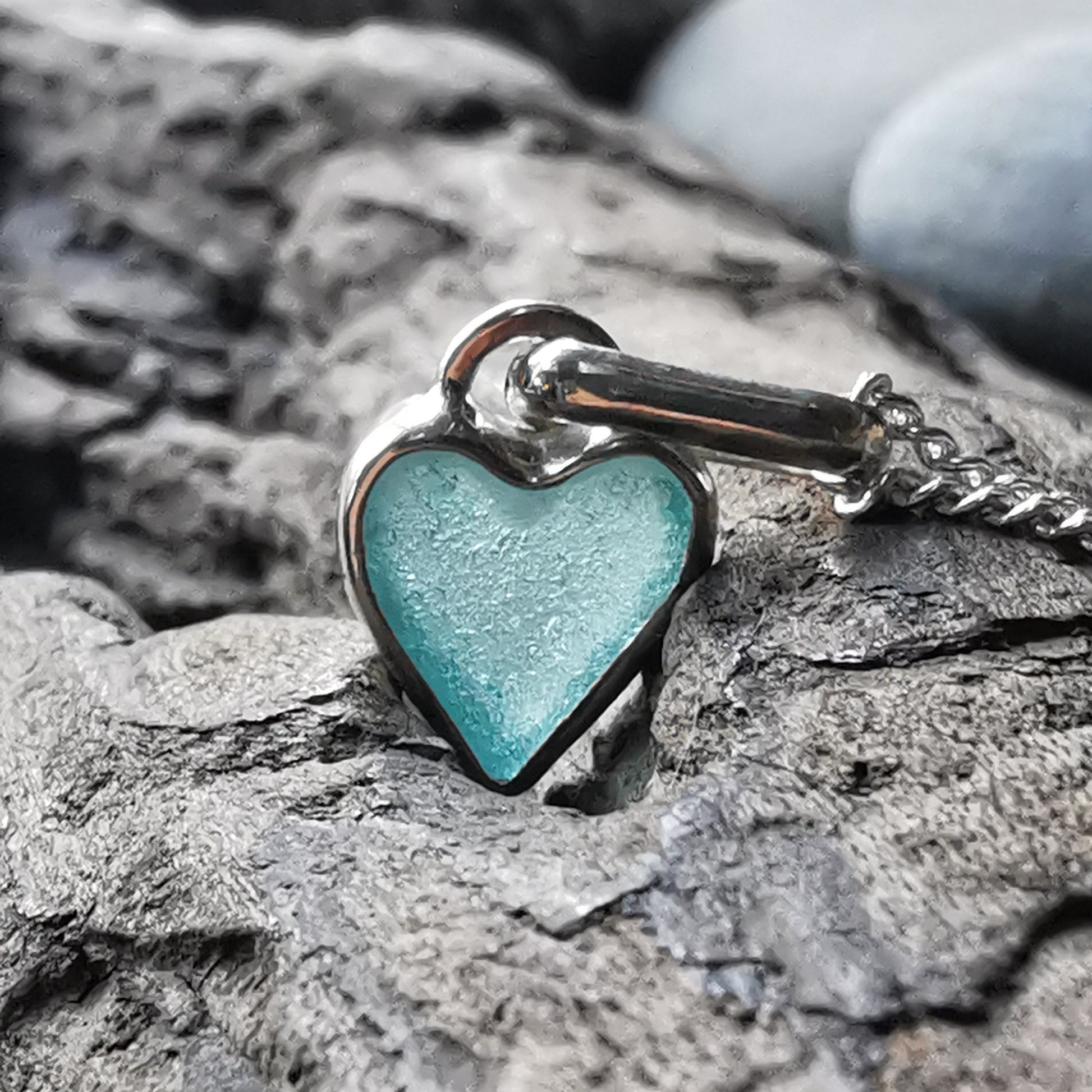 Aqua blue UV sea glass heart & sterling silver pendant.
