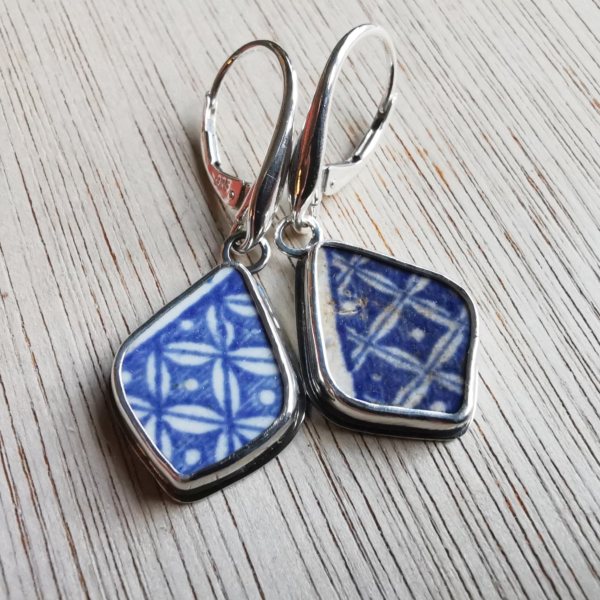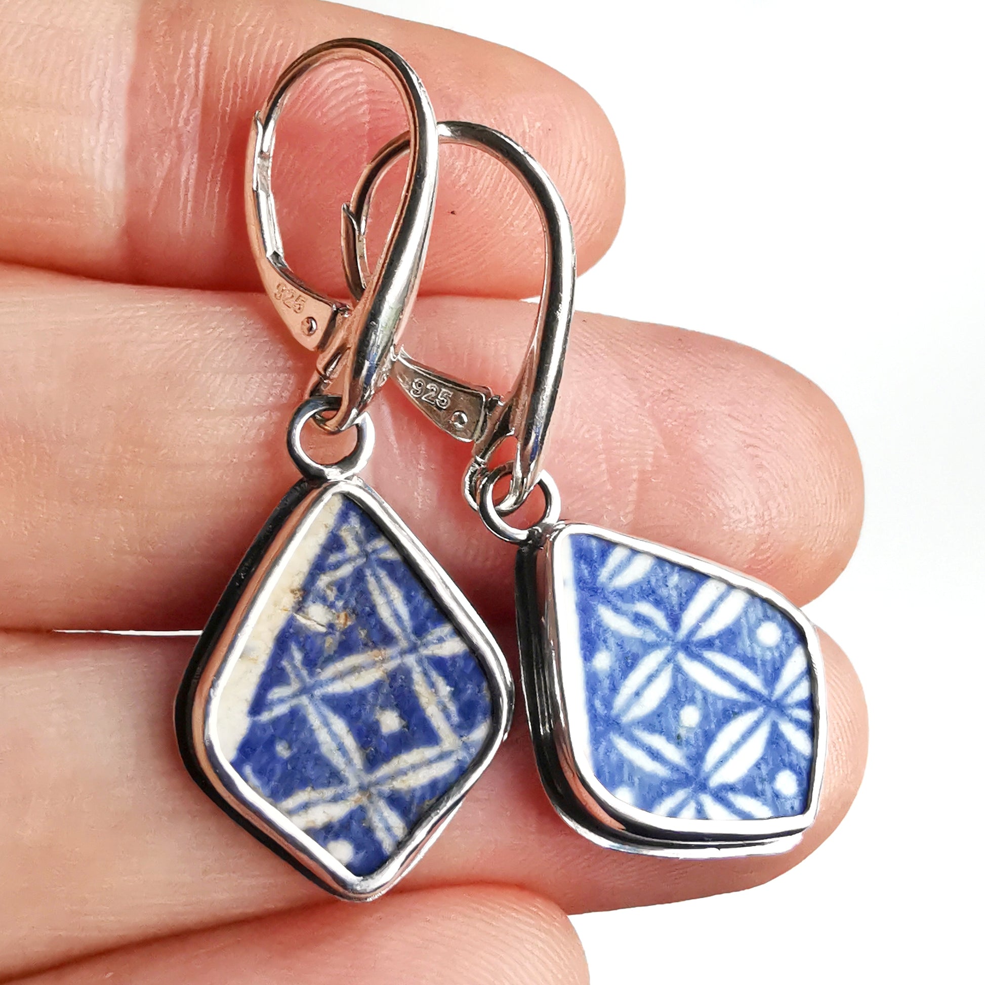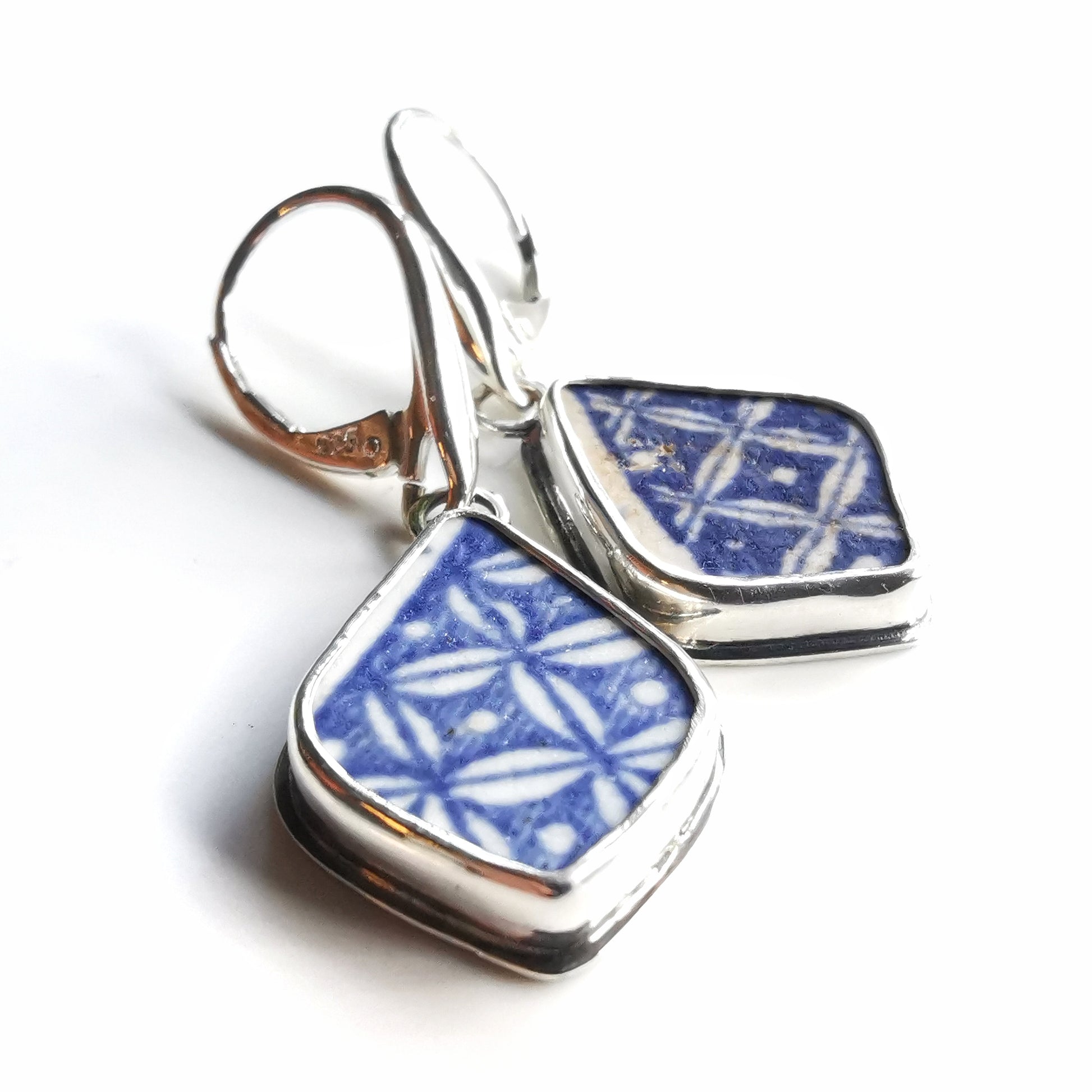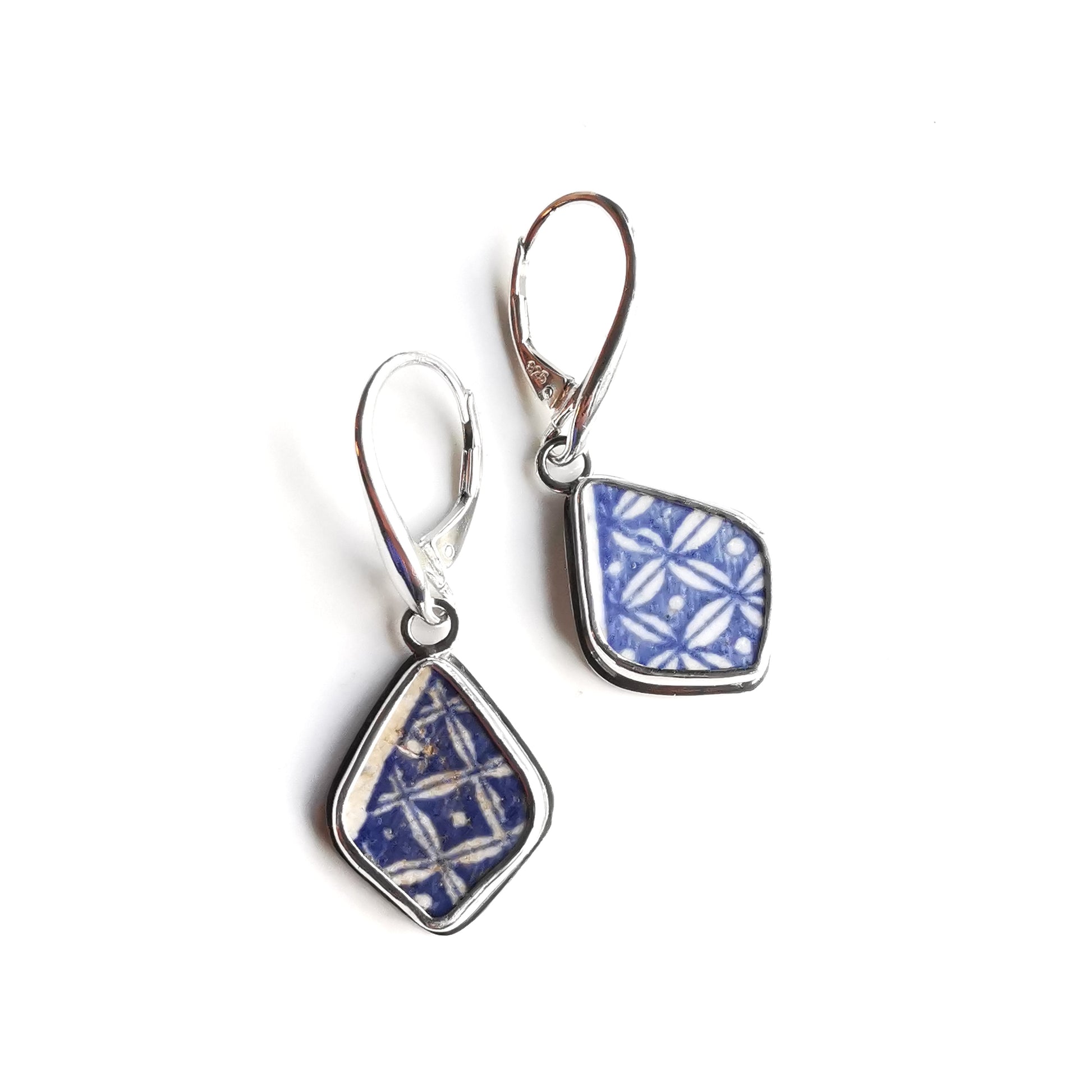 Blue and white sea pottery & sterling silver earrings.