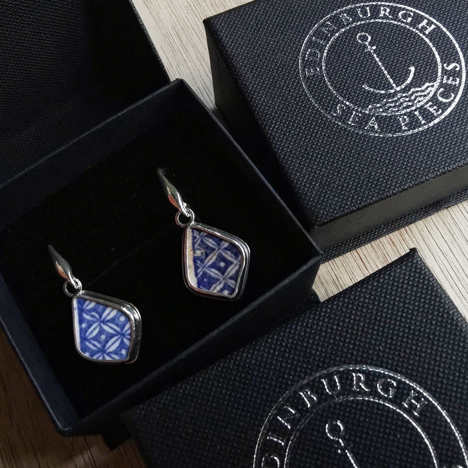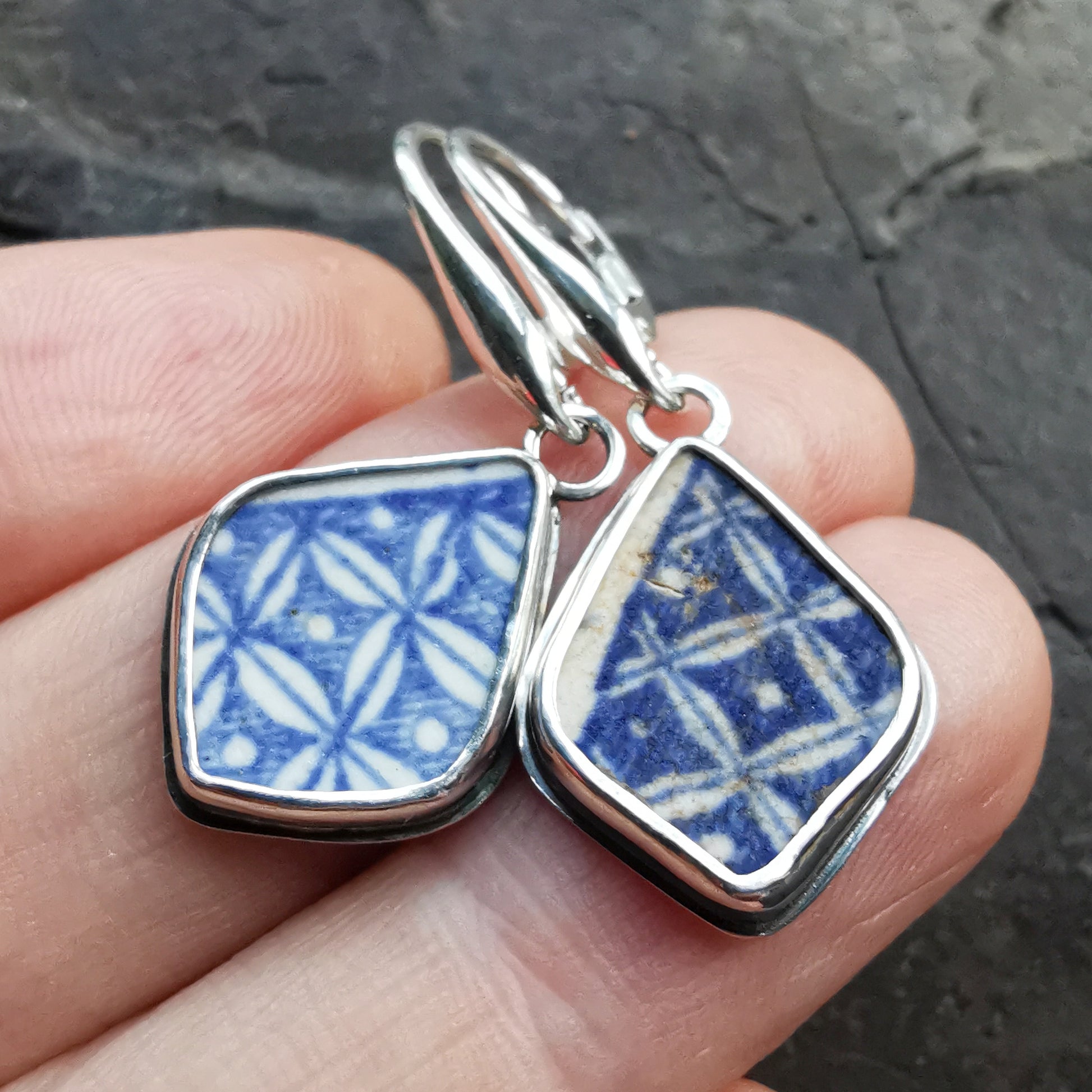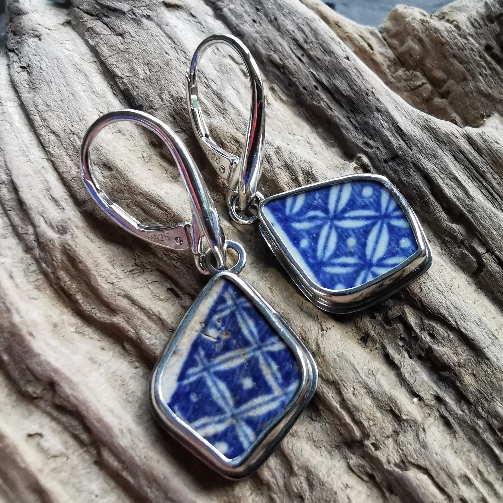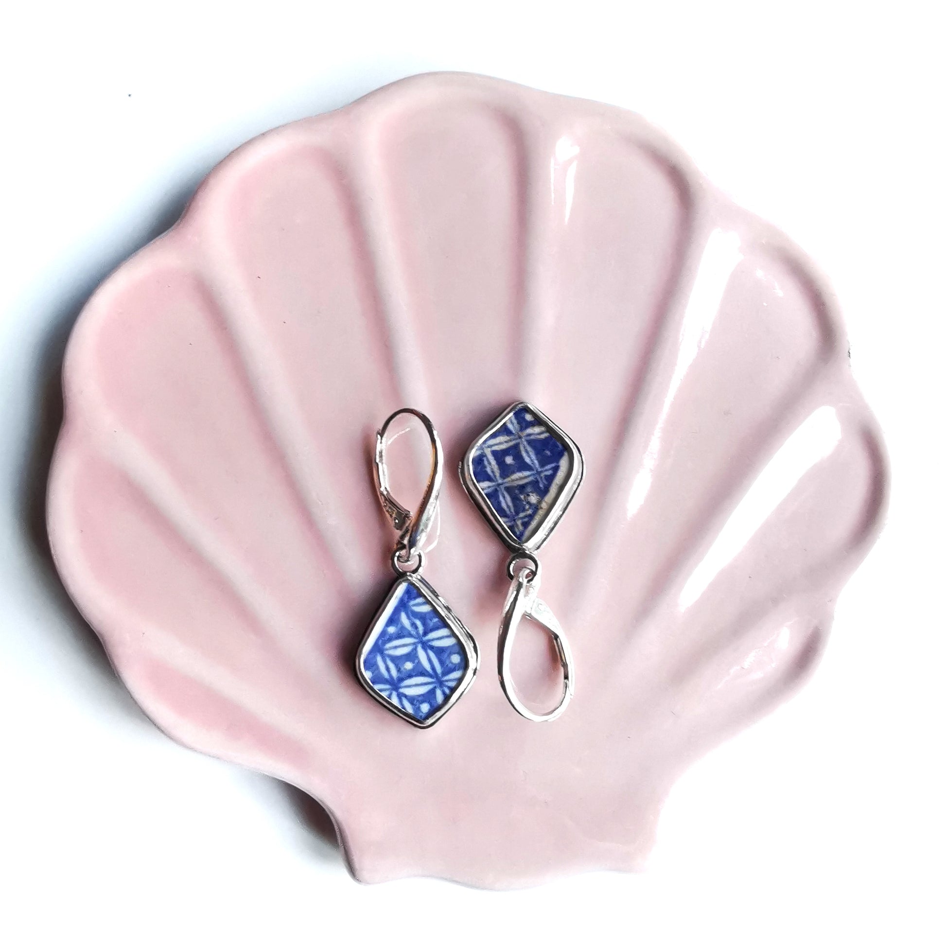 One of a kind earrings composed with Scottish beach blue willow pottery pieces, found in Edinburgh. I've shaped the pieces myself.