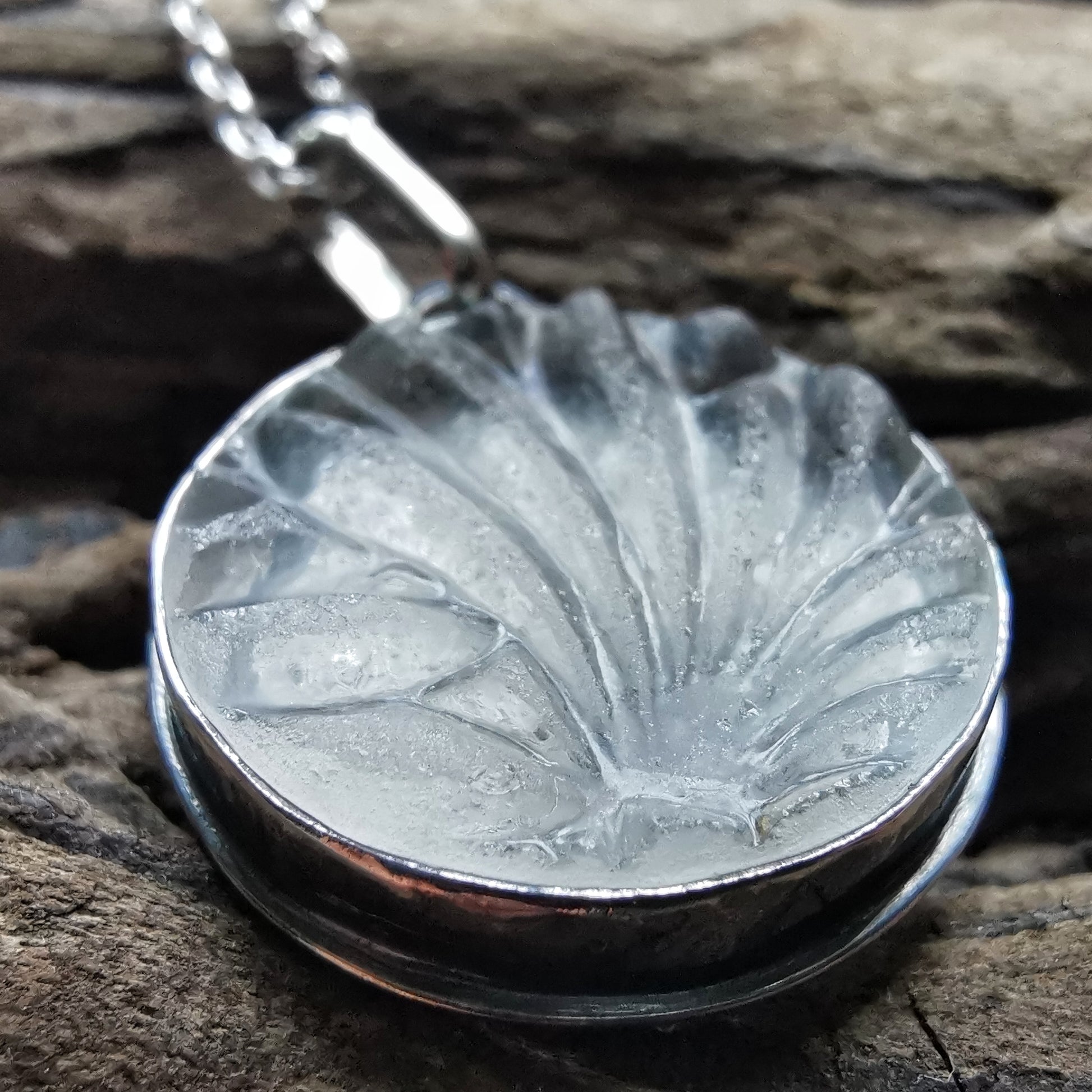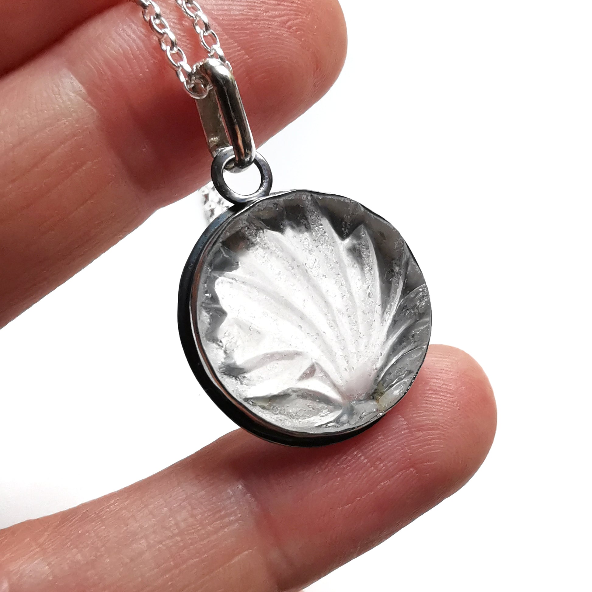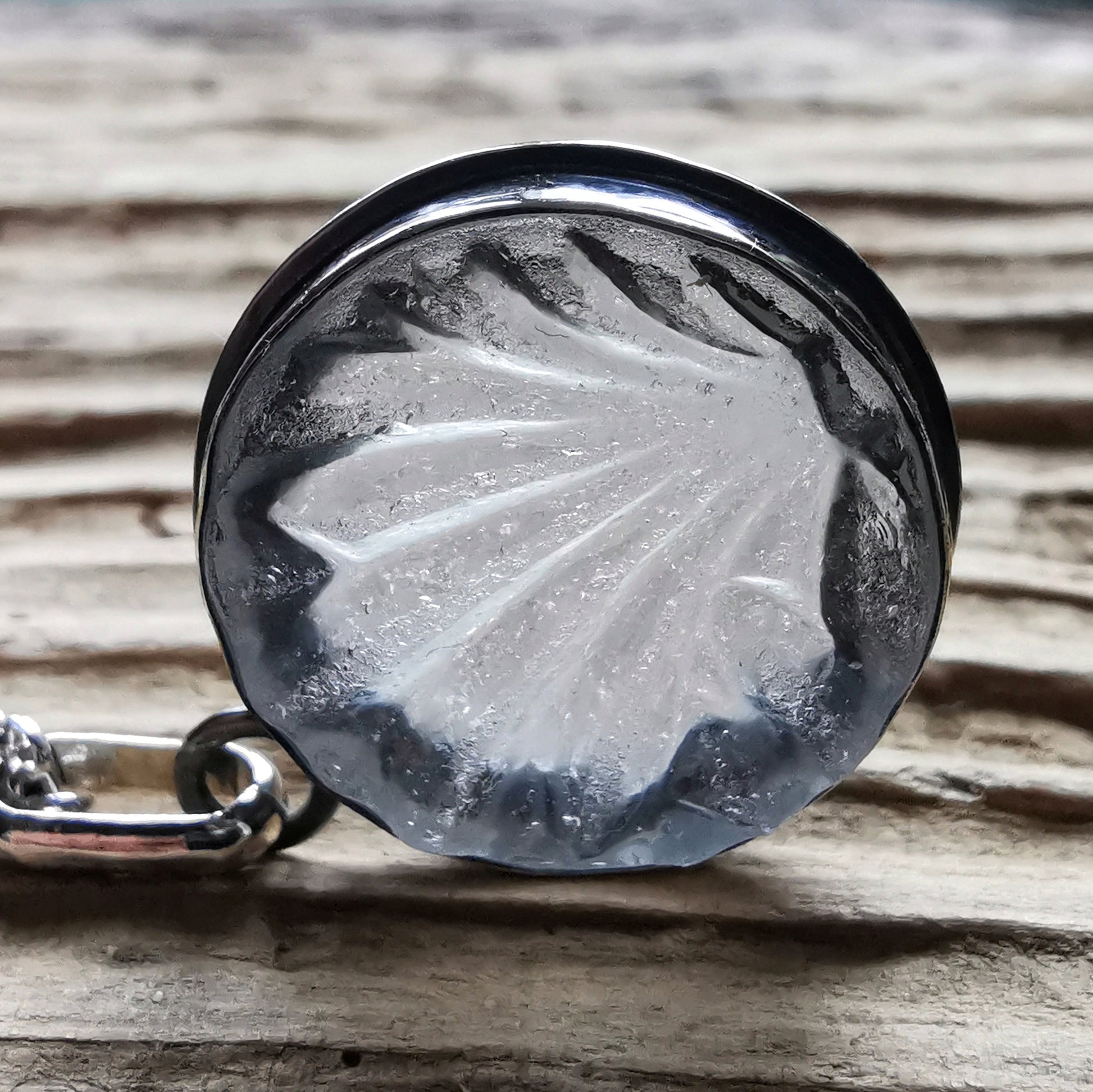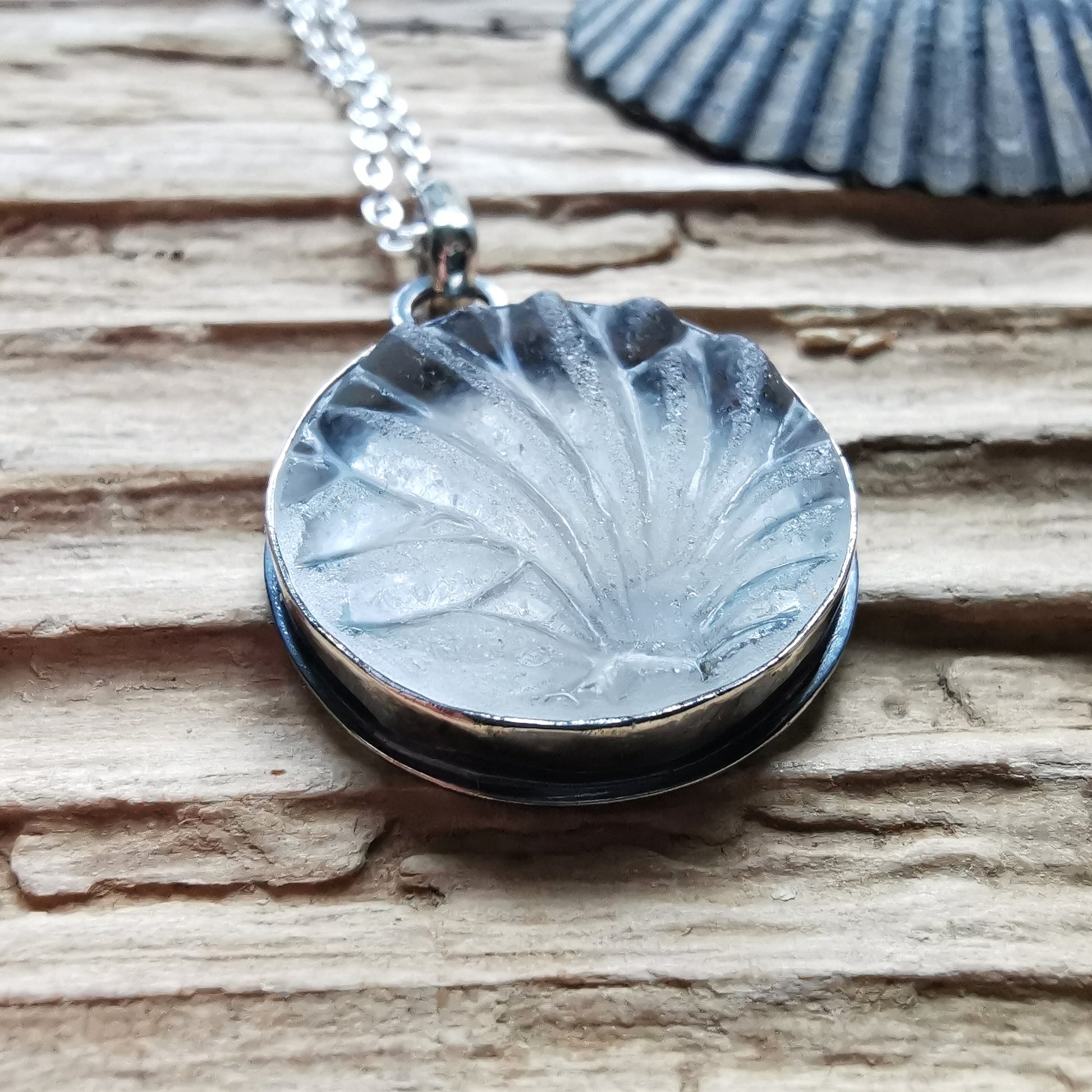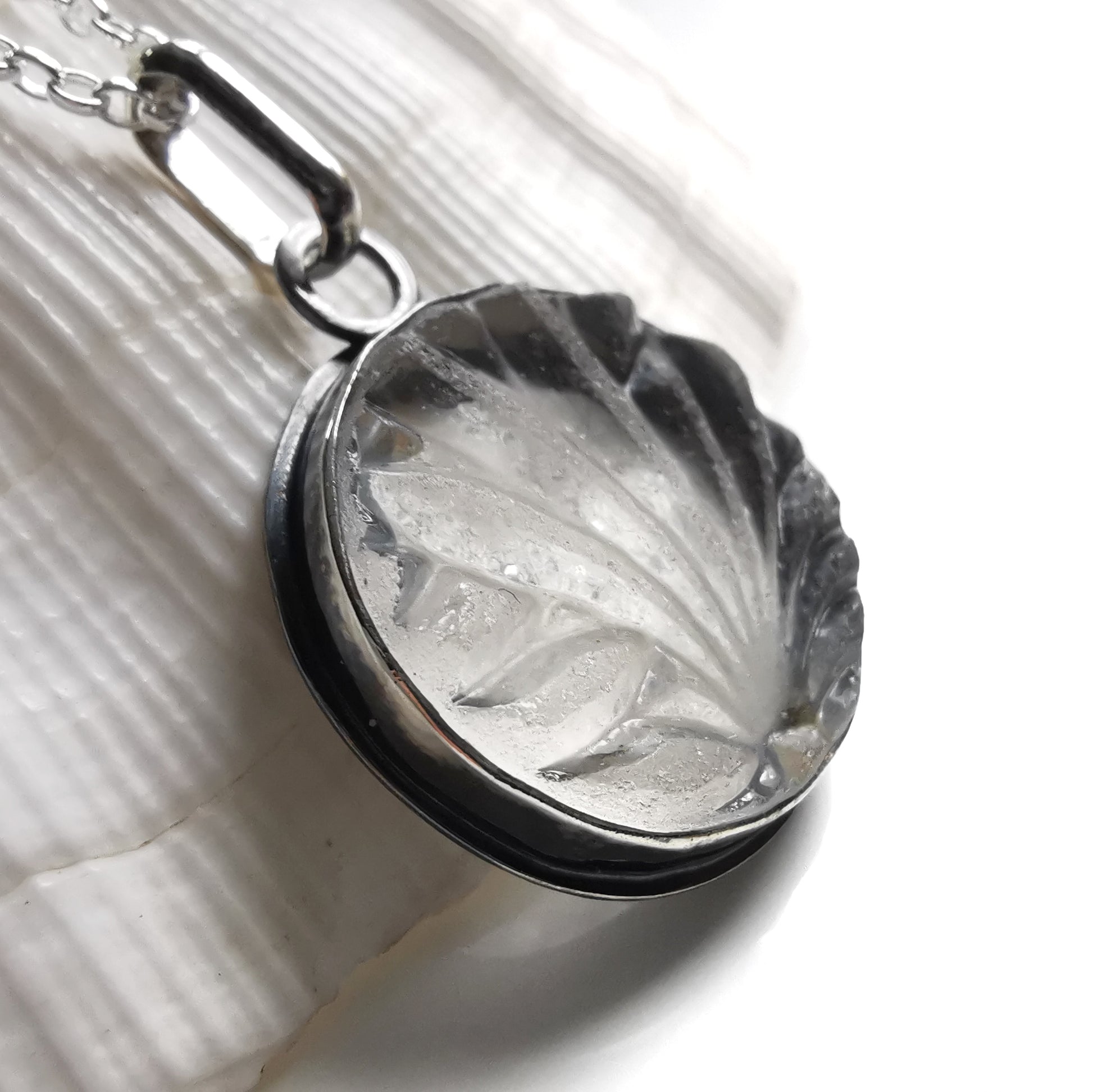 One of a kind pendant composed with genuine frosted clear sea glass. The sea glass is set in backless fine silver bezel, the chain is sterling silver. I've shaped this piece of sea glass, you can see how it looked before on the last photo.