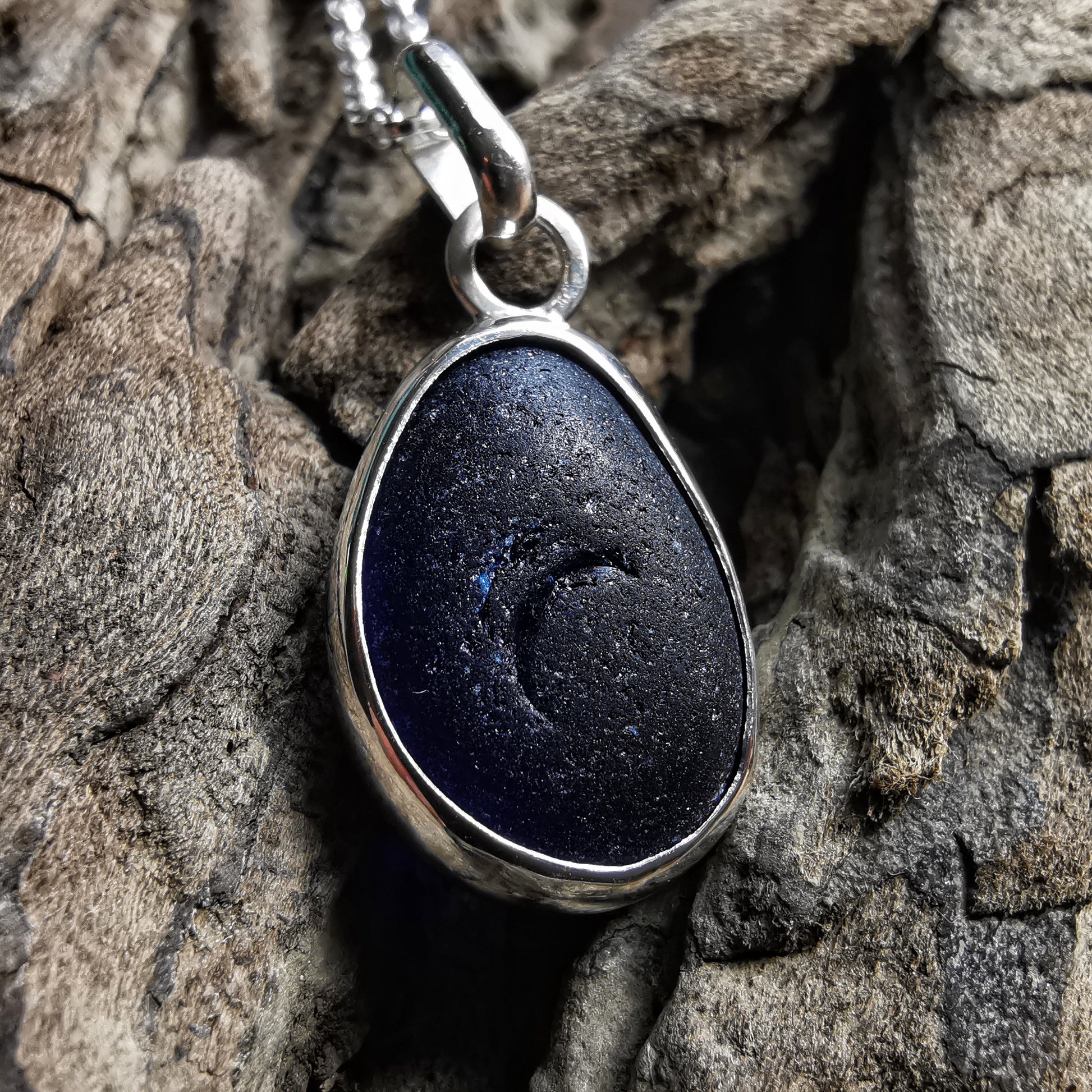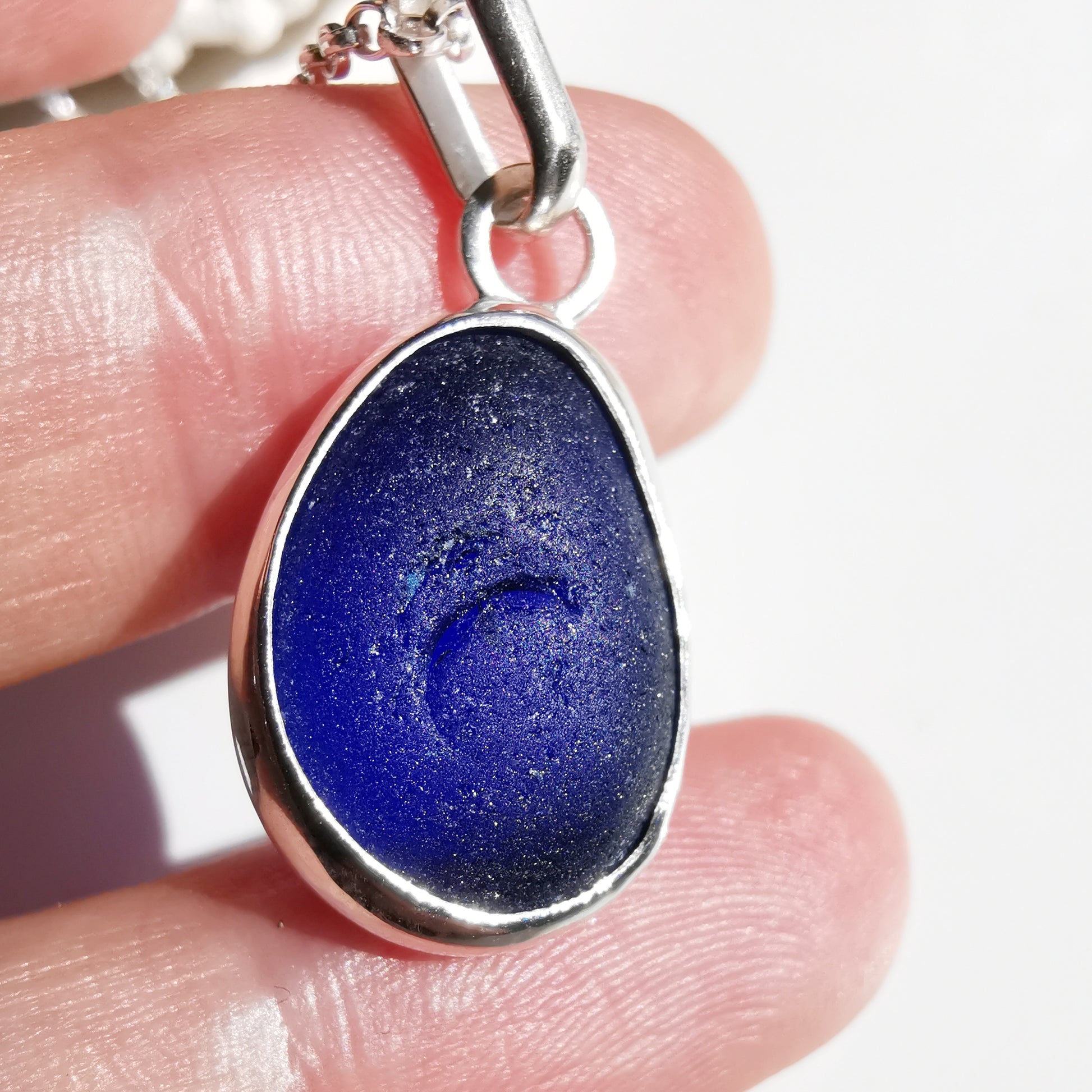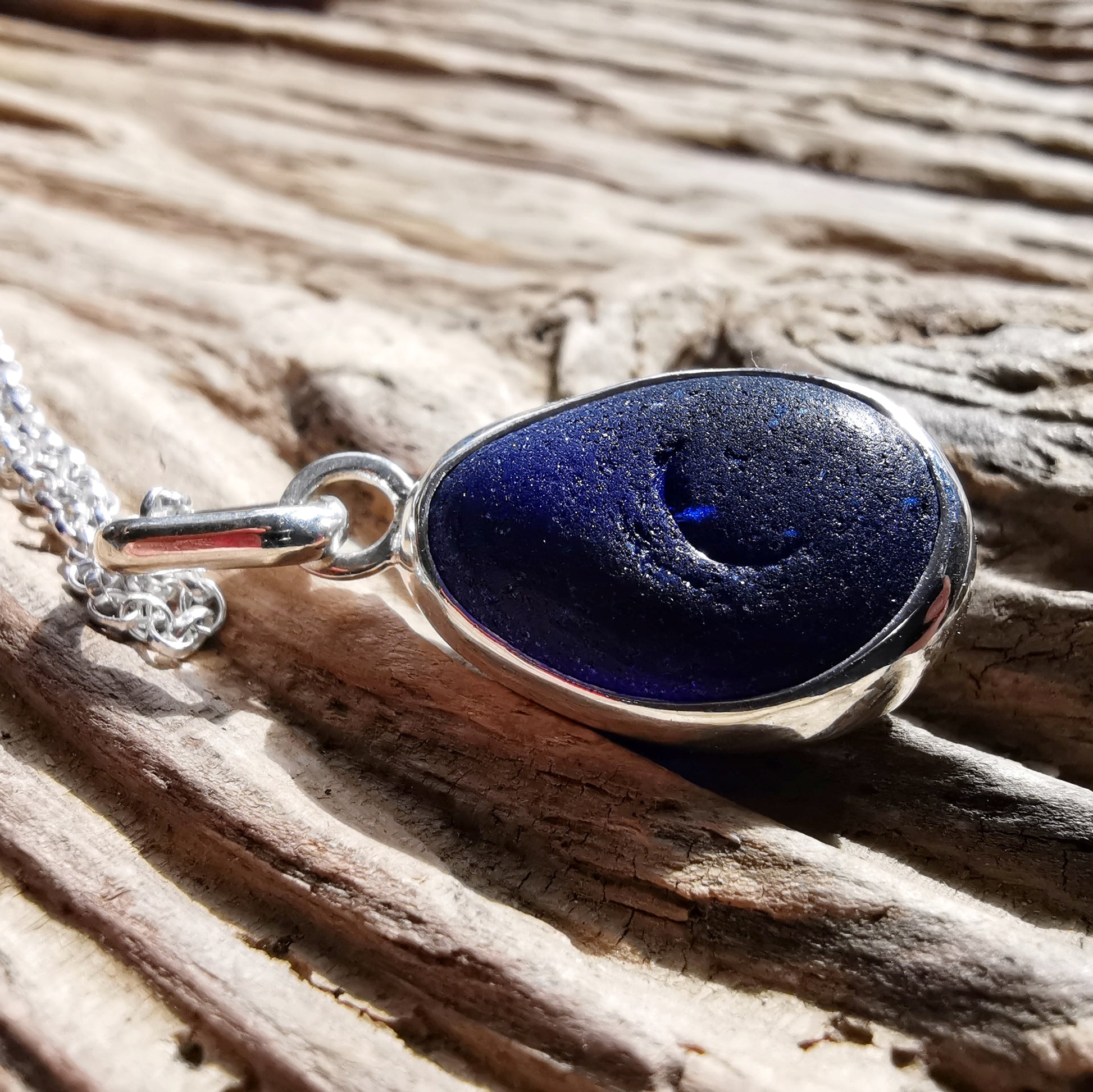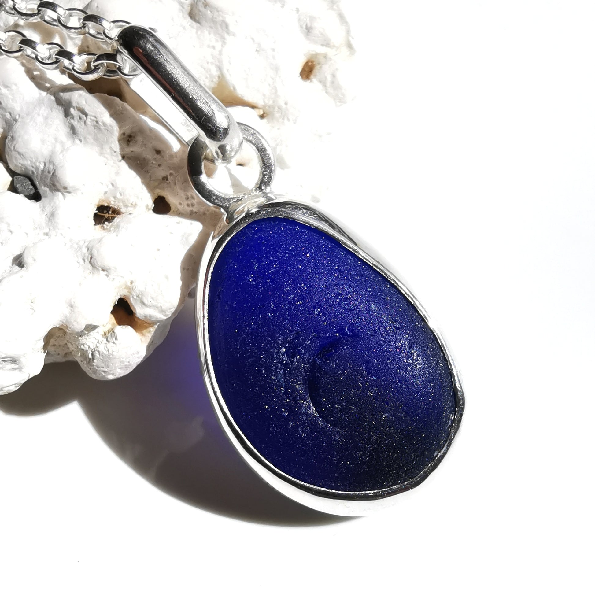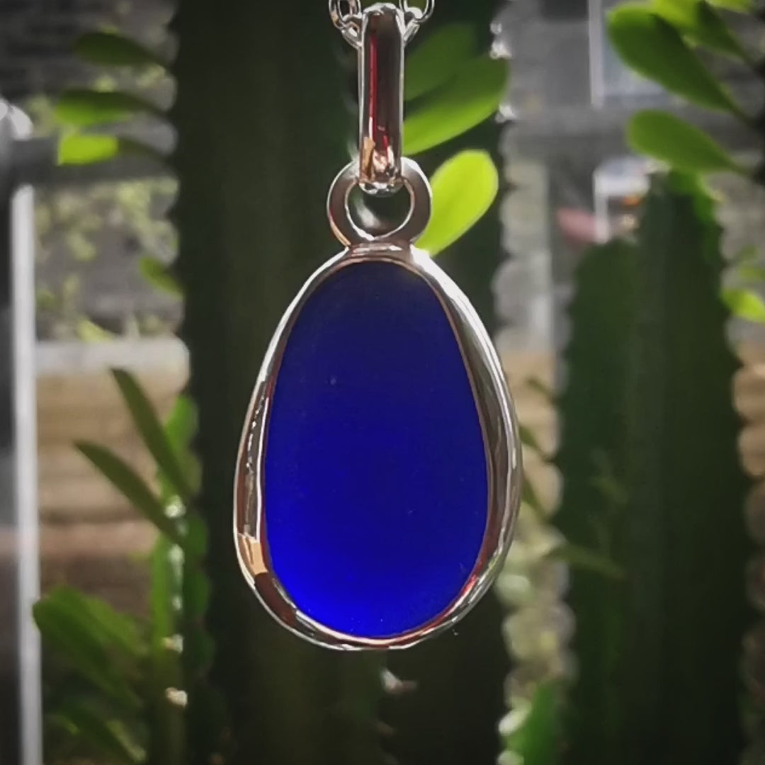 One of a kind pendant composed with genuine frosted cobalt blue sea glass, found by myself on a beach in Seaham. The sea glass is set in backless fine silver bezel, the chain is sterling silver.