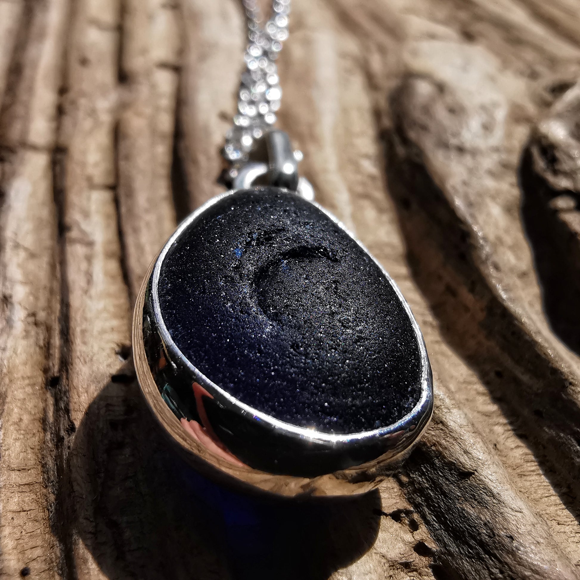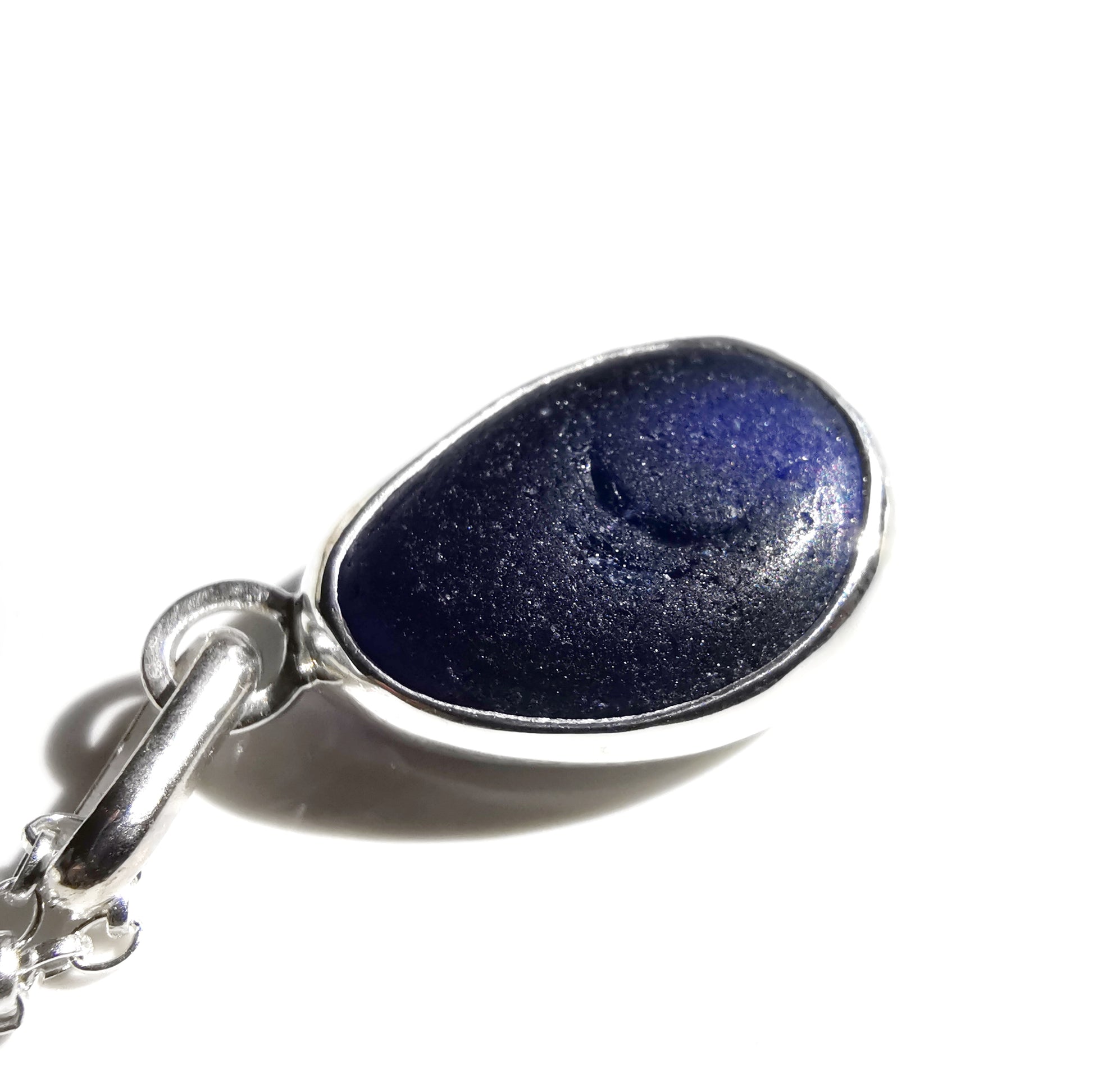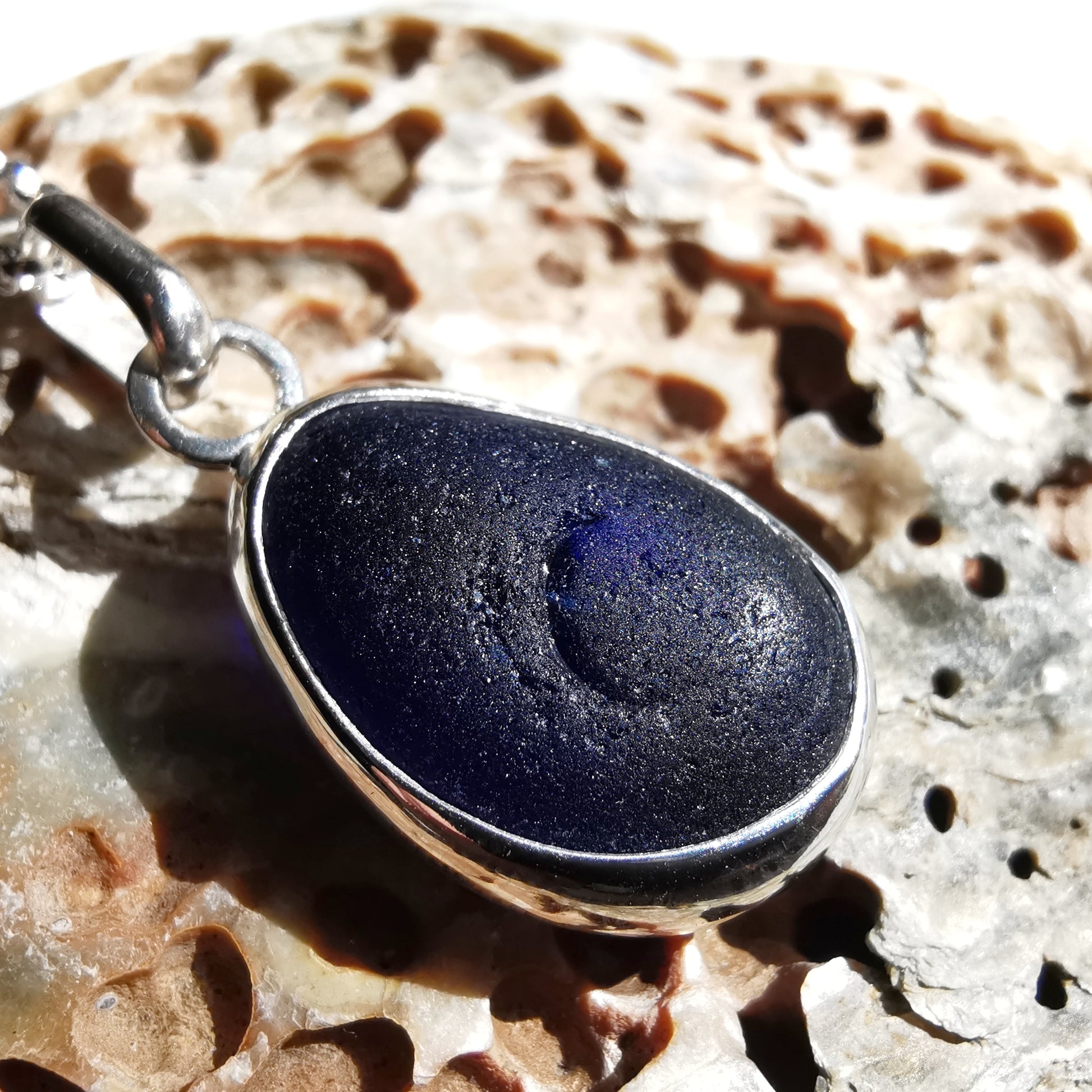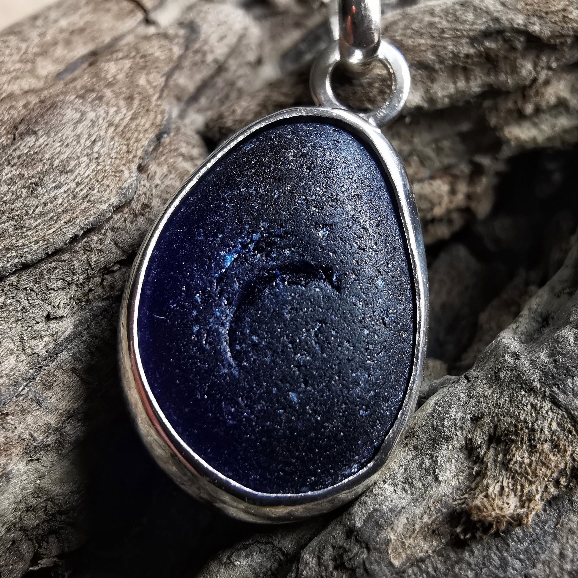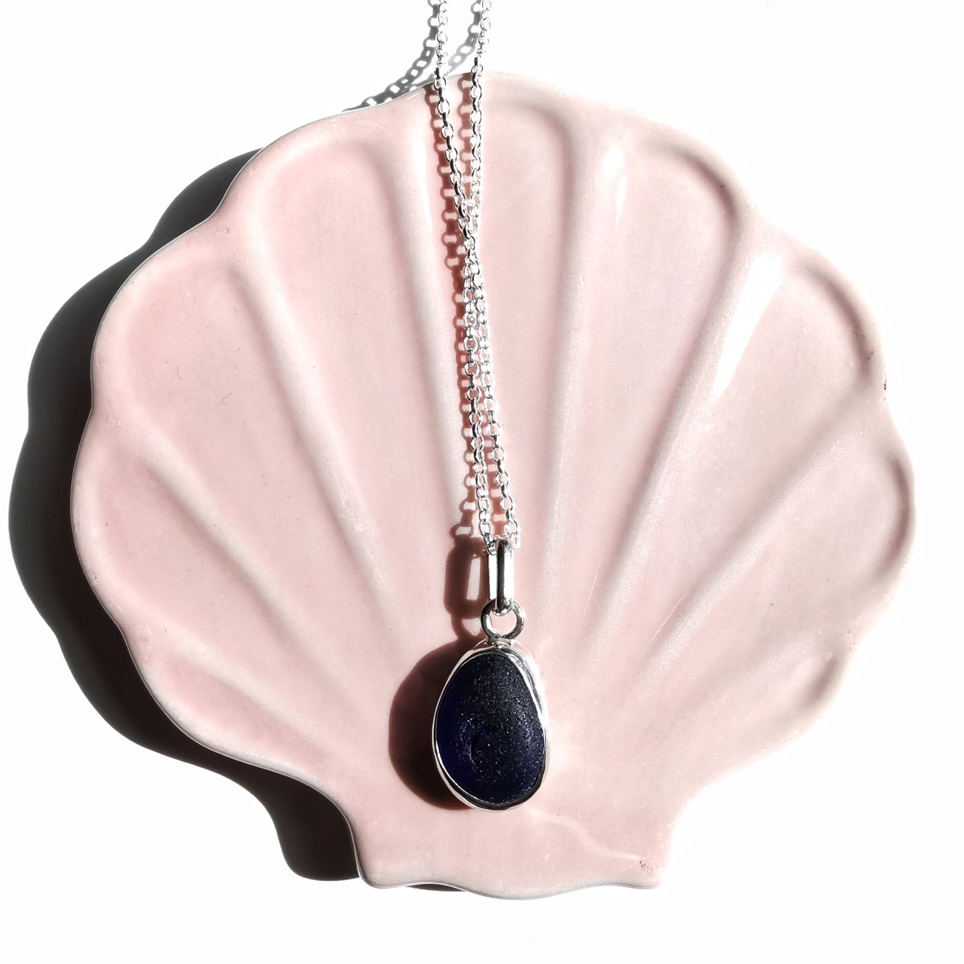 One of a kind pendant composed with genuine frosted cobalt blue sea glass, found by myself on a beach in Seaham. The sea glass is set in backless fine silver bezel, the chain is sterling silver.