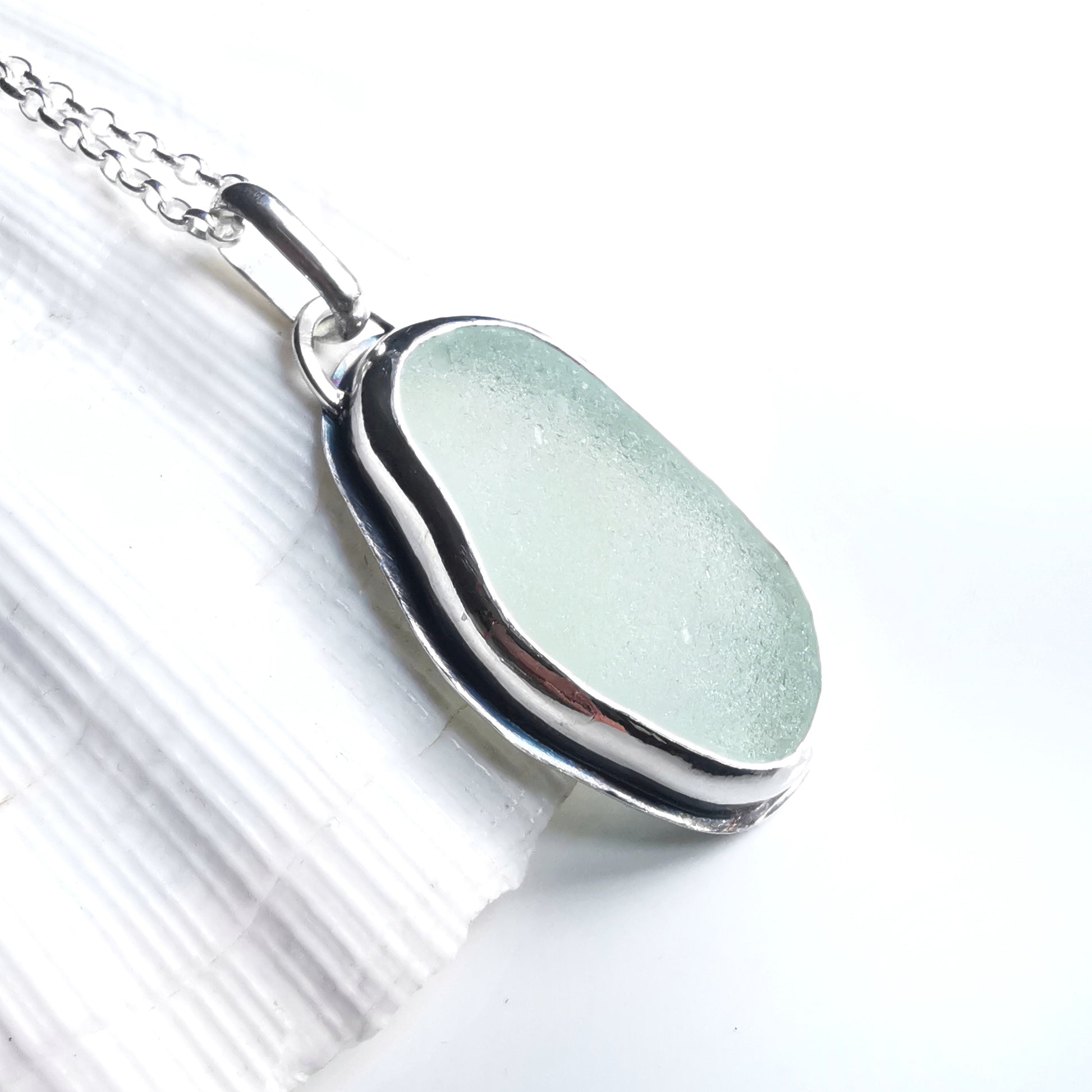One of a kind pendant composed with customer's genuine frosted seafoam sea glass. The sea glass is set in fine backless silver bezel, the chain is sterling silver.
