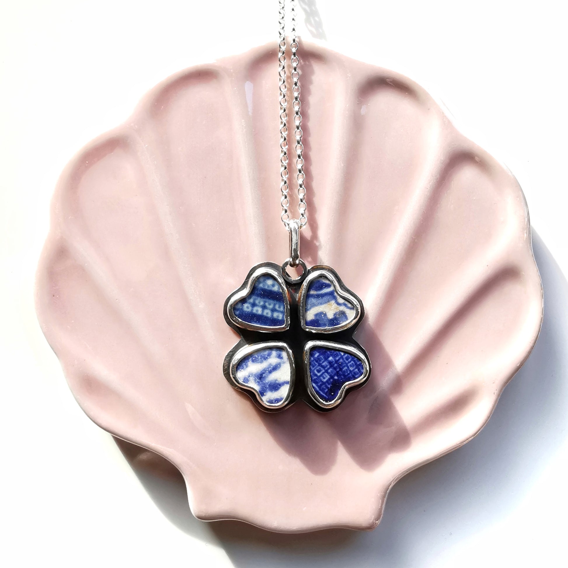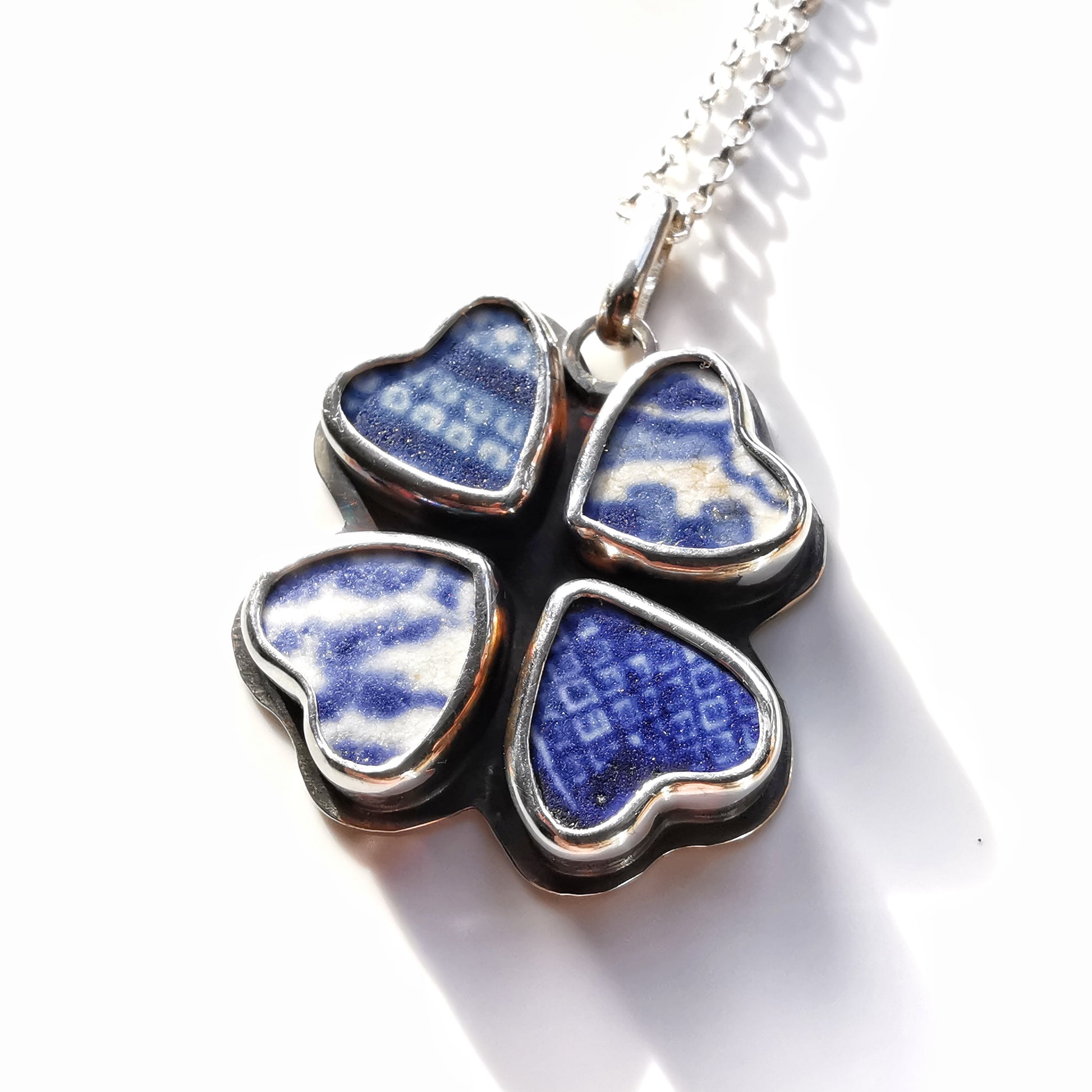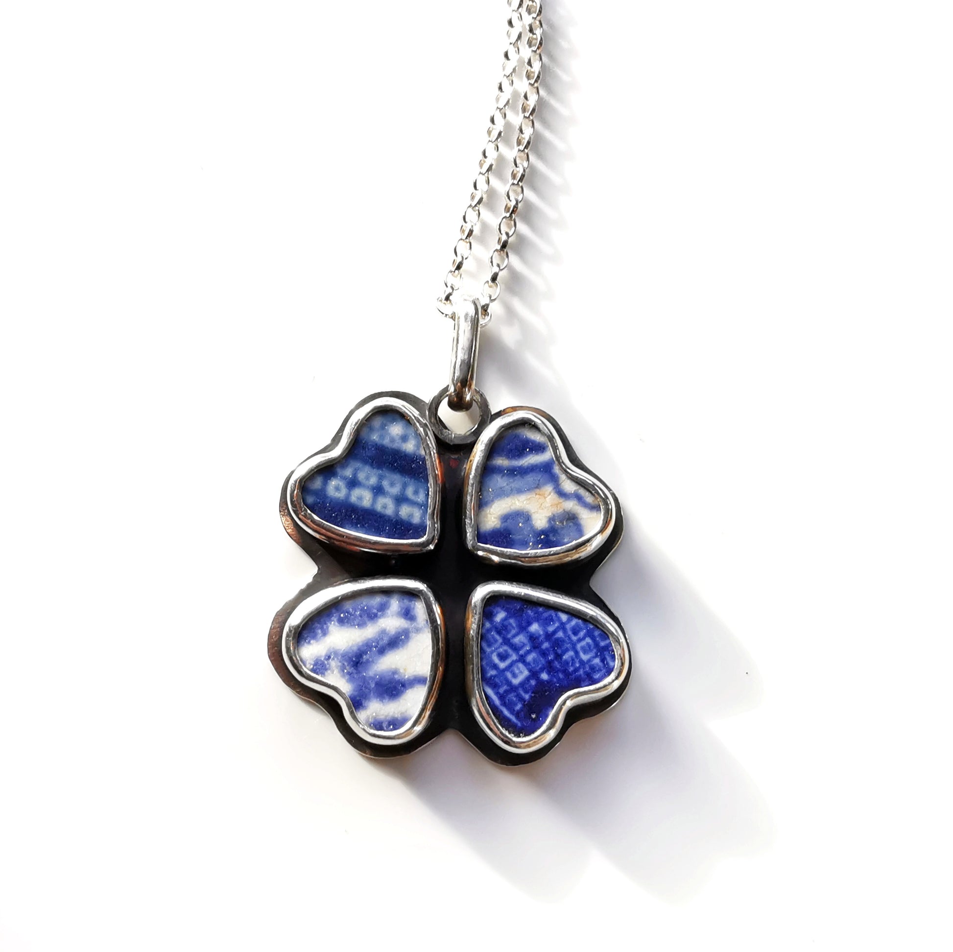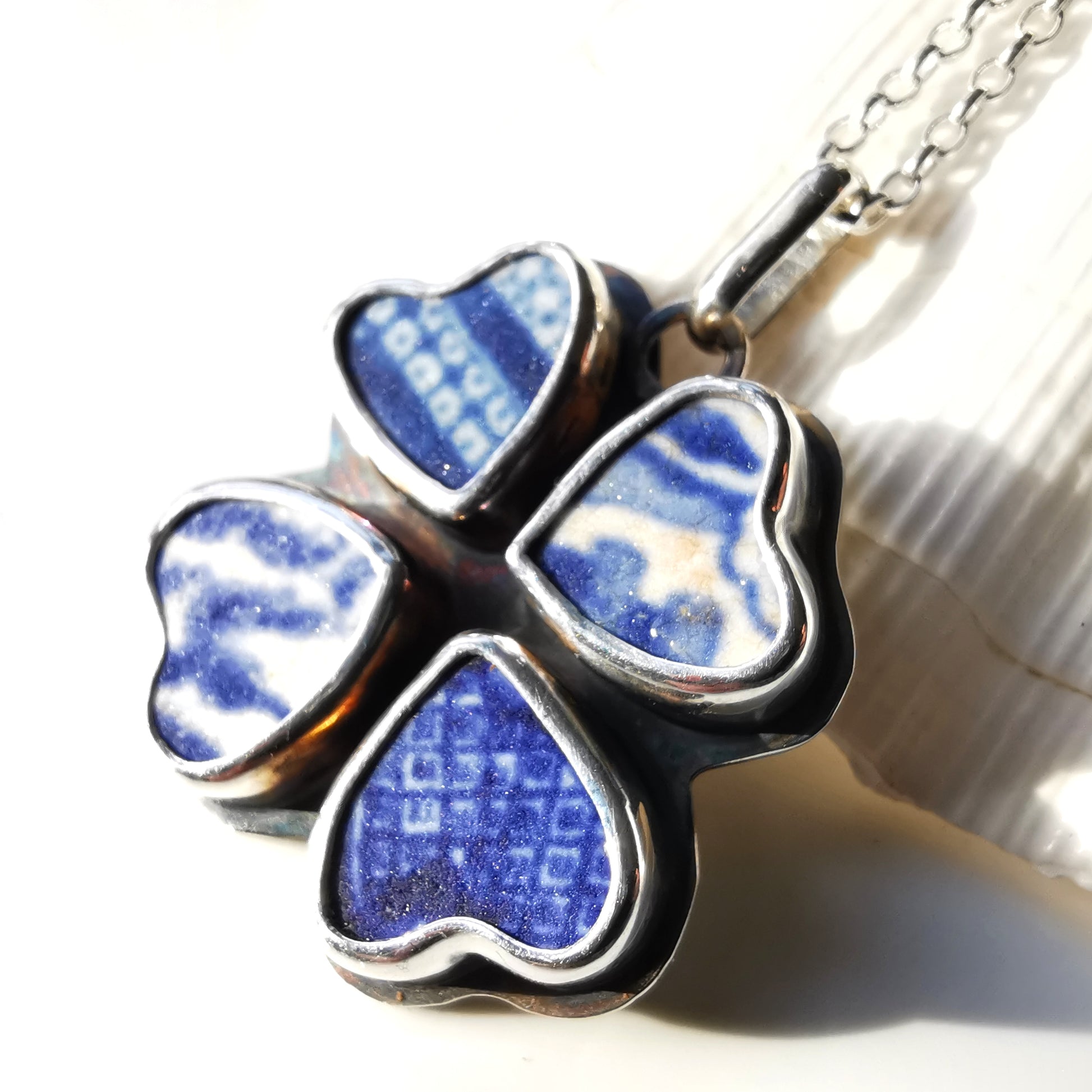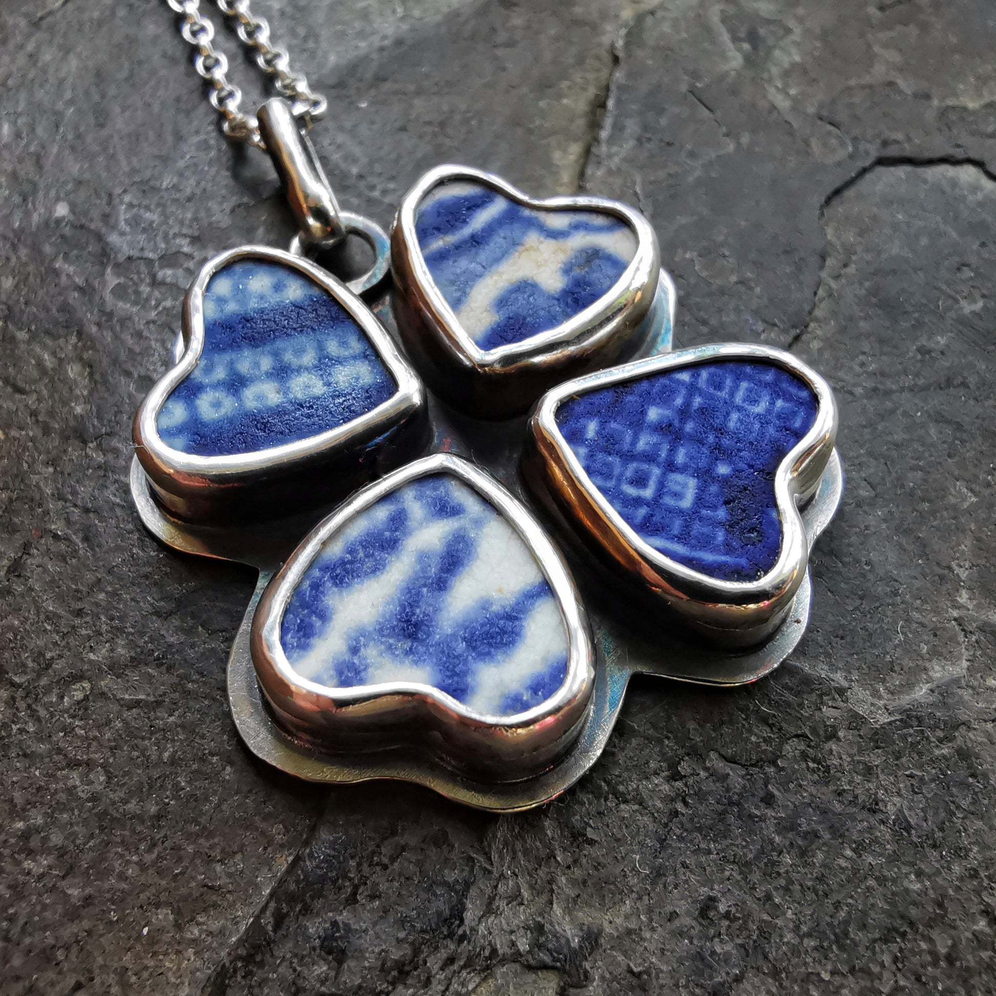 Four leaf clover 'good luck' blue willow sea pottery hearts & sterling silver pendant.