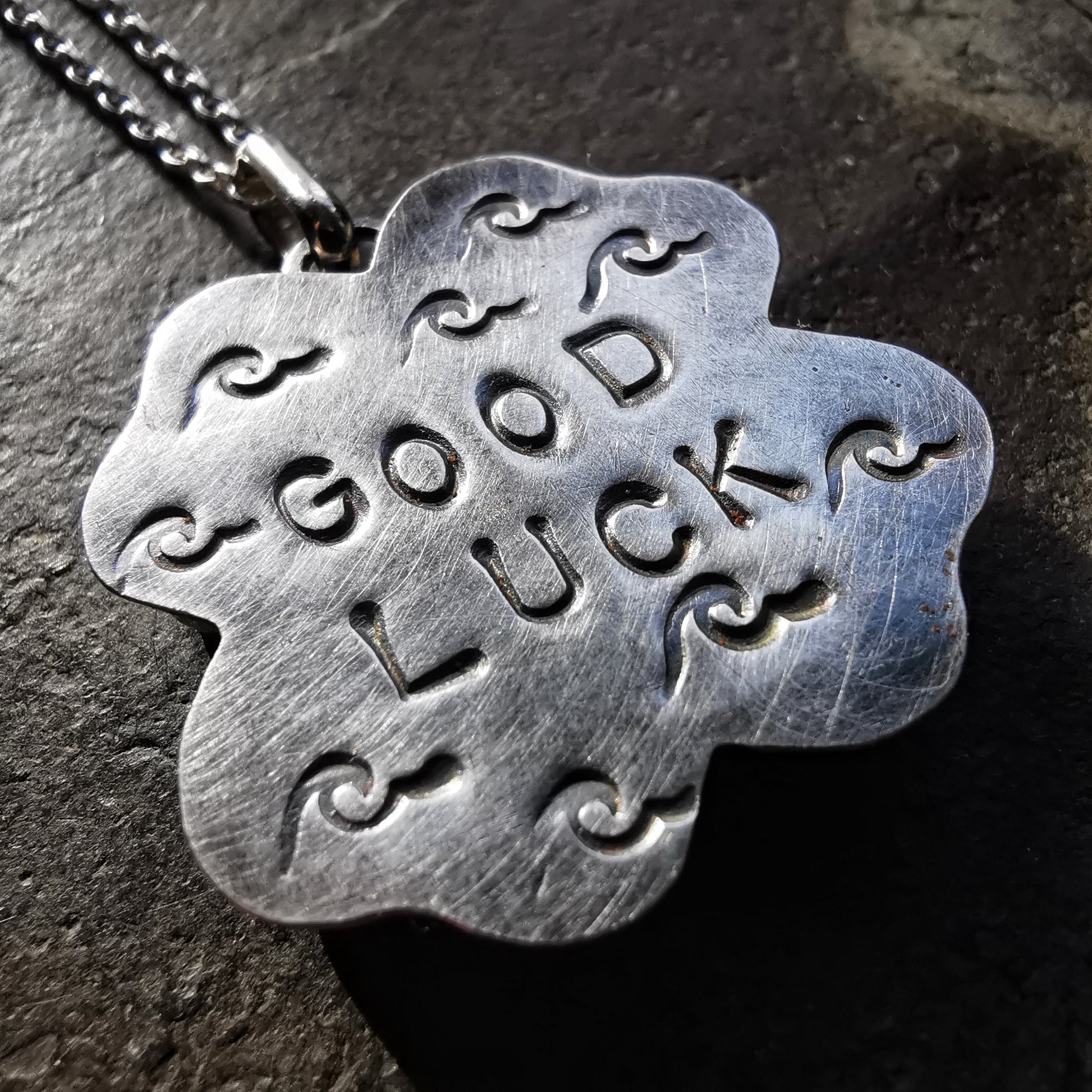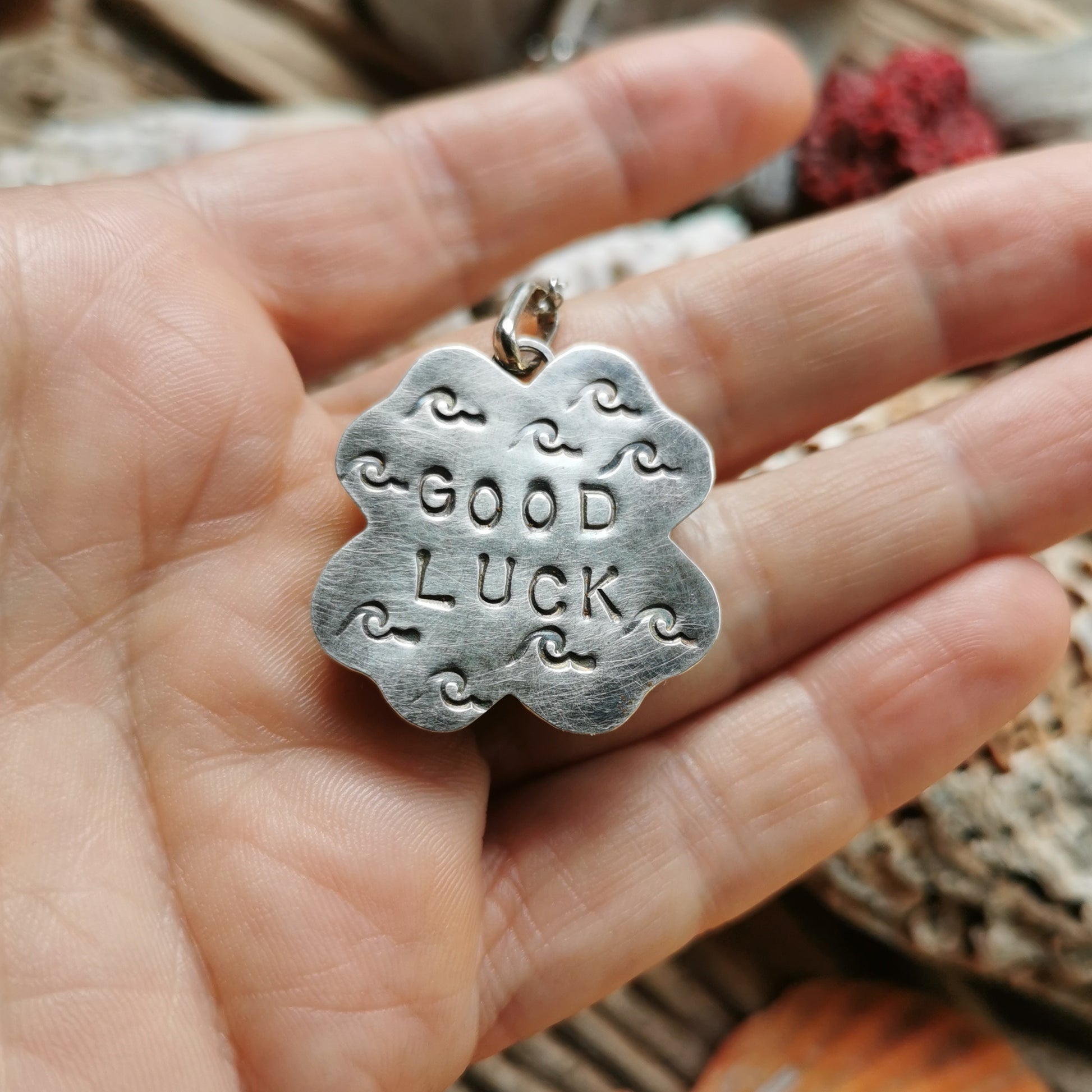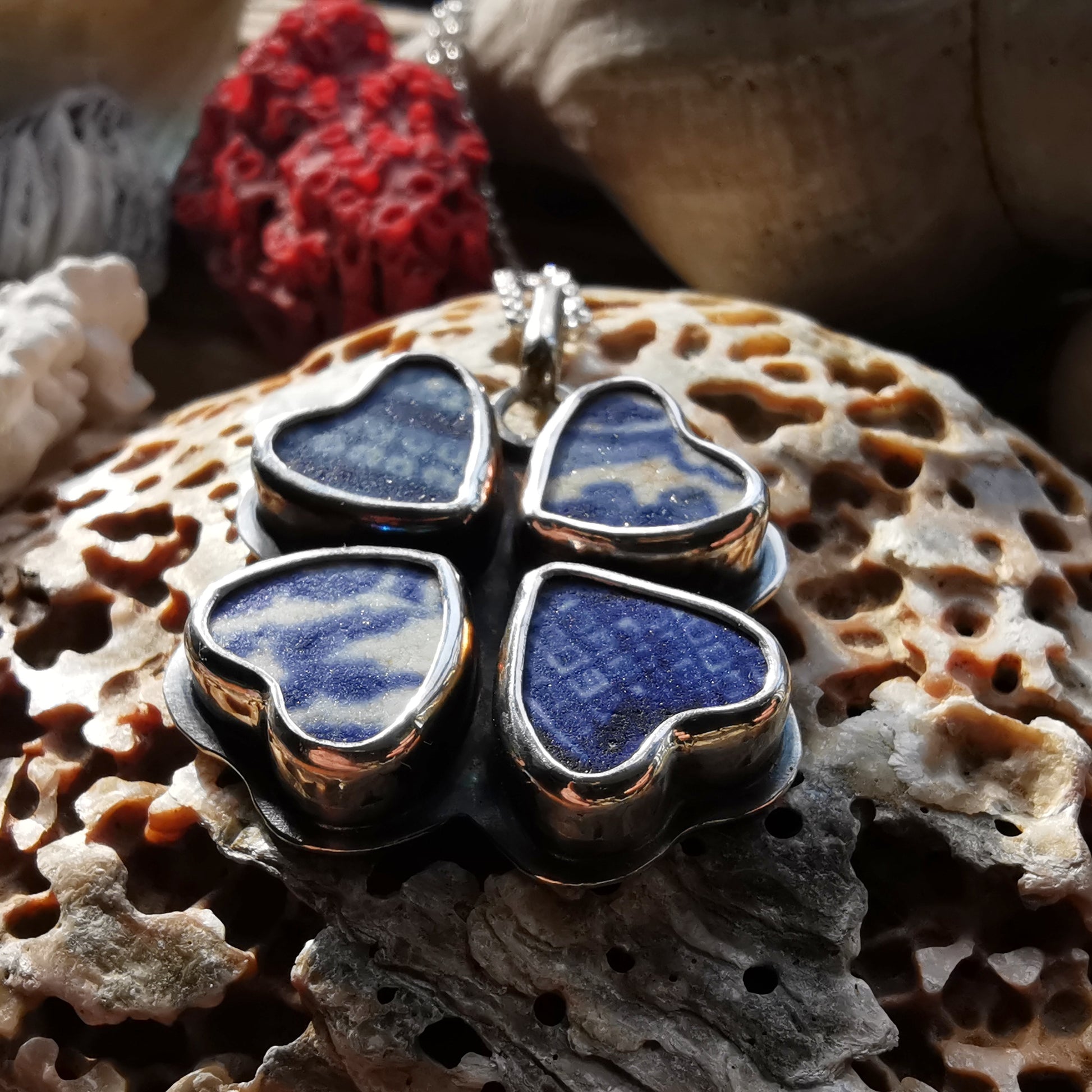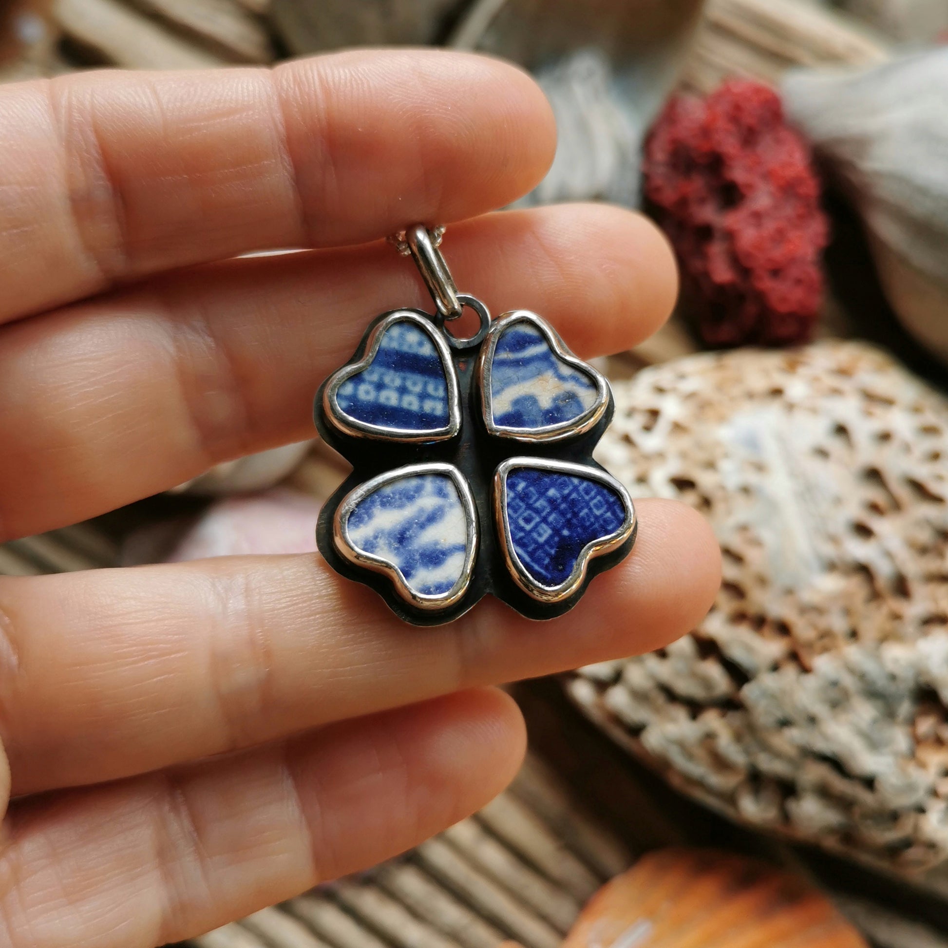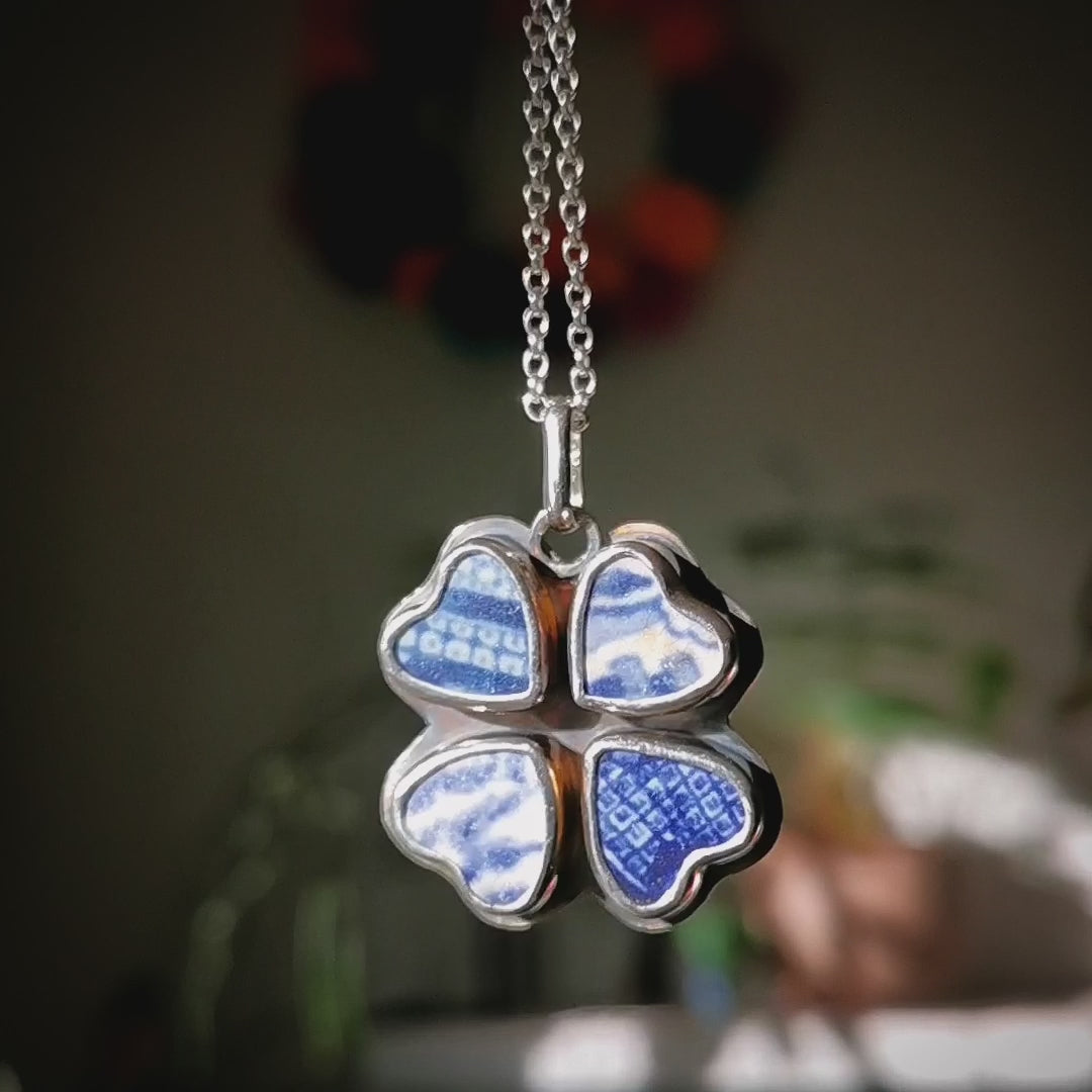 Four leaf clover 'good luck' blue willow sea pottery hearts & sterling silver pendant.