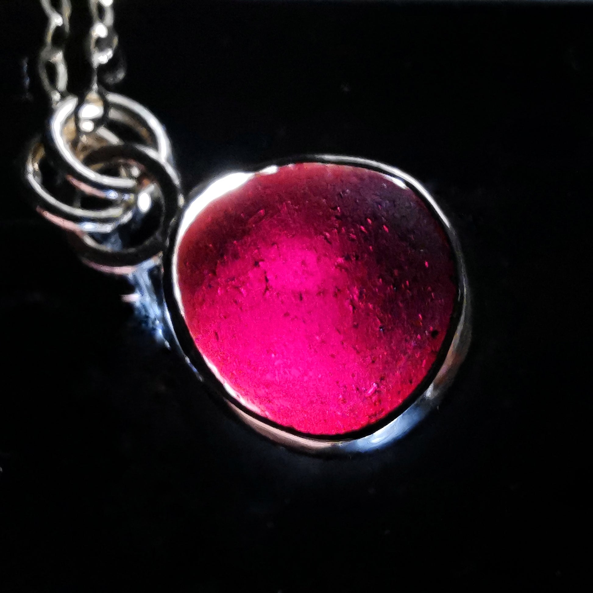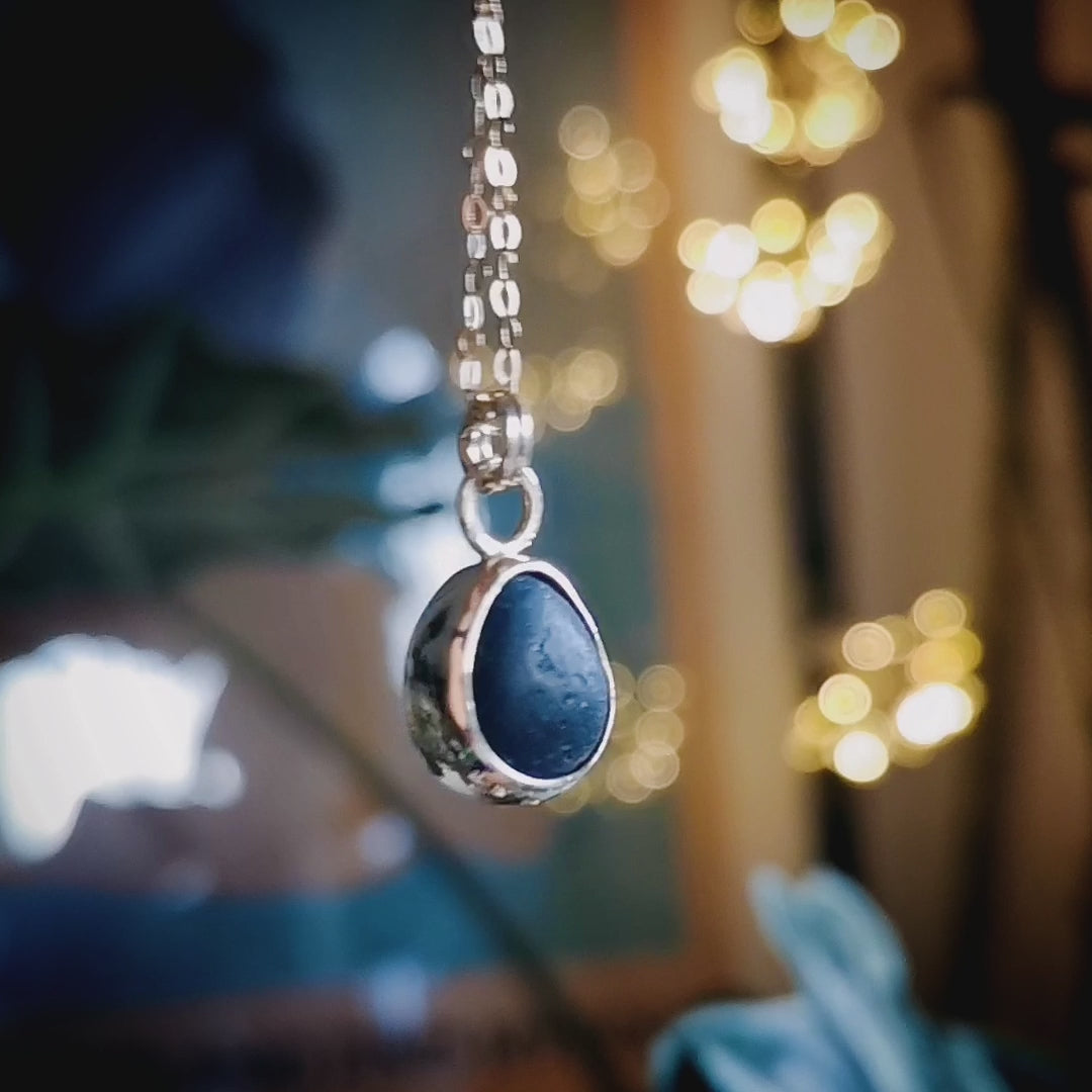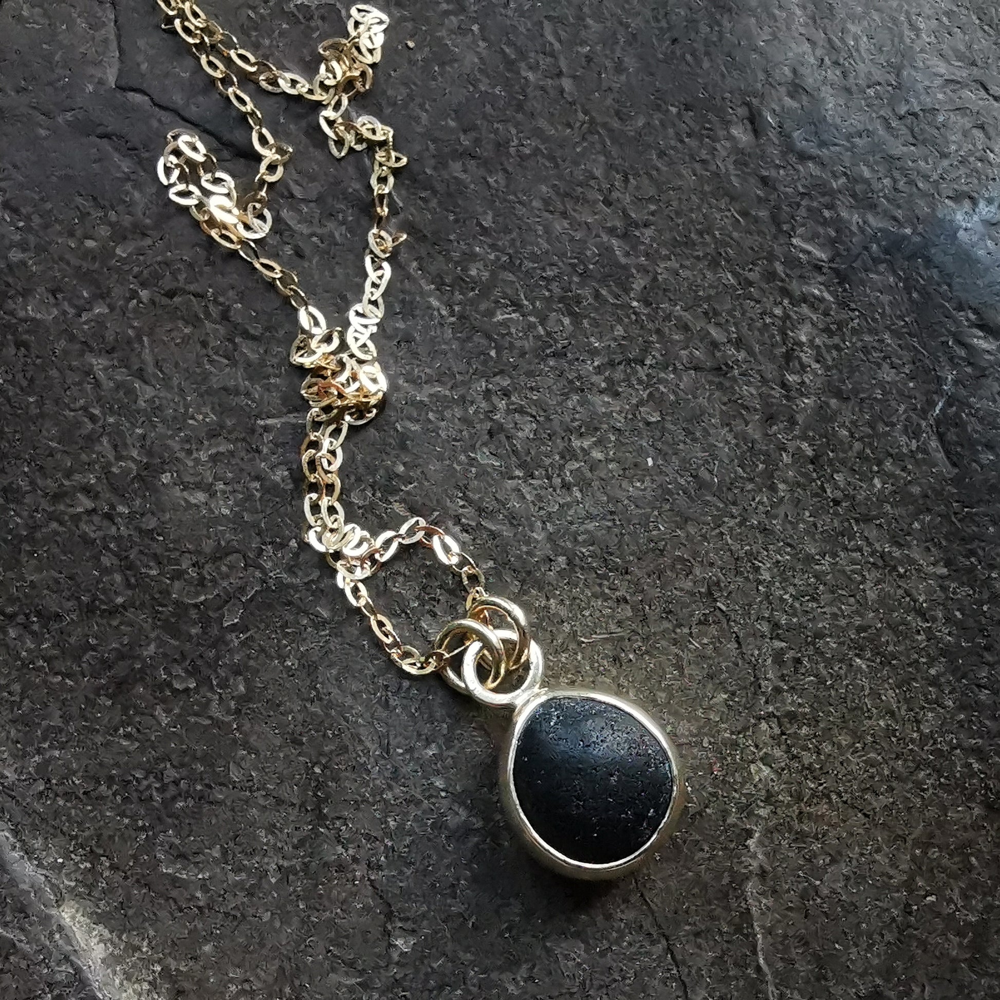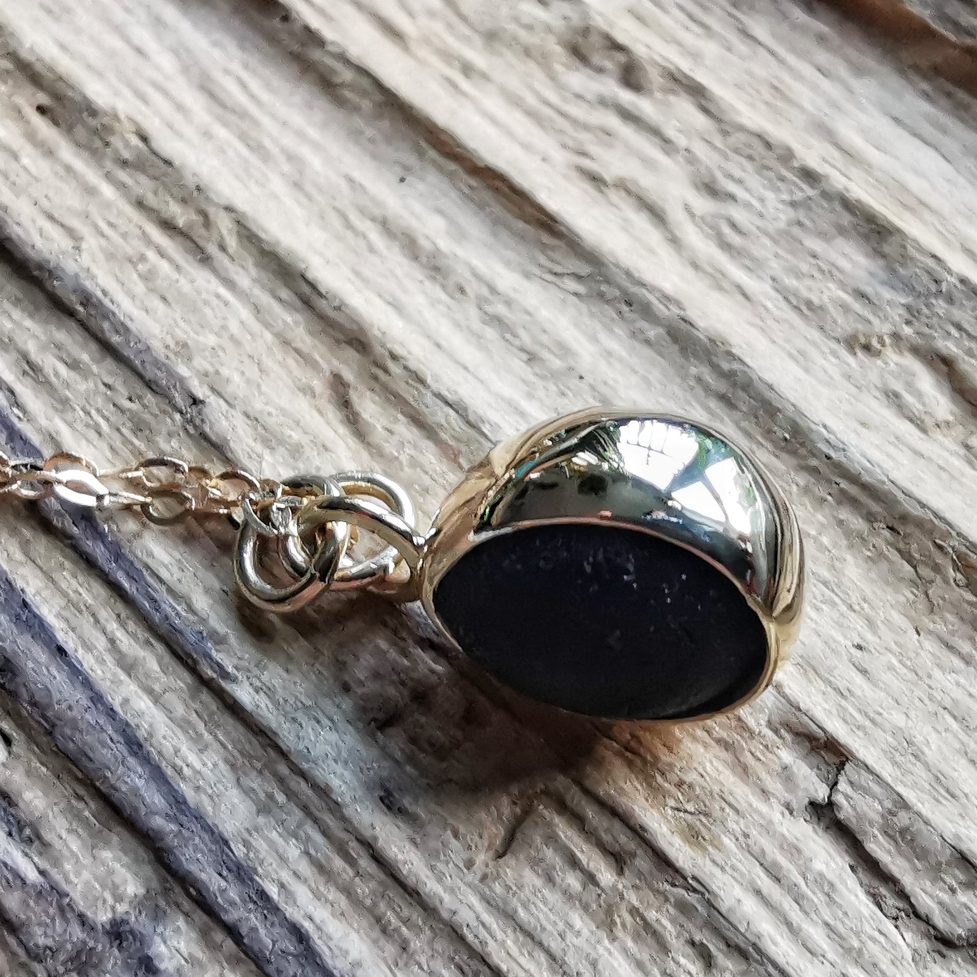 One of a kind pendant composed with genuine frosted black sea glass with a hidden purple grape colour, found by me in Seaham. The sea glass is set in 9 carat gold bezel, the chain is 9 carat gold too.