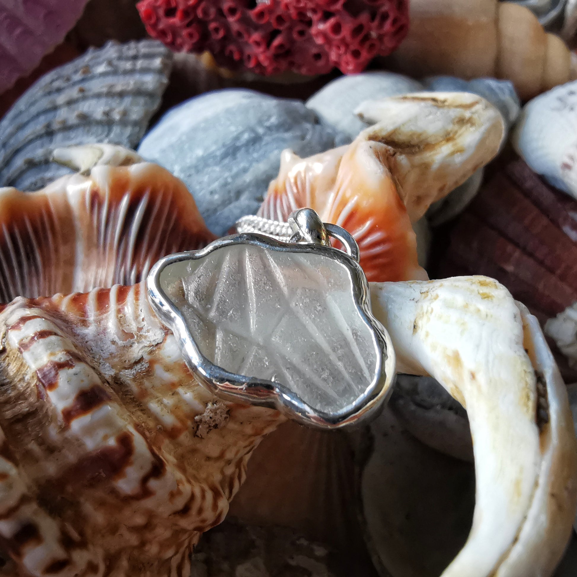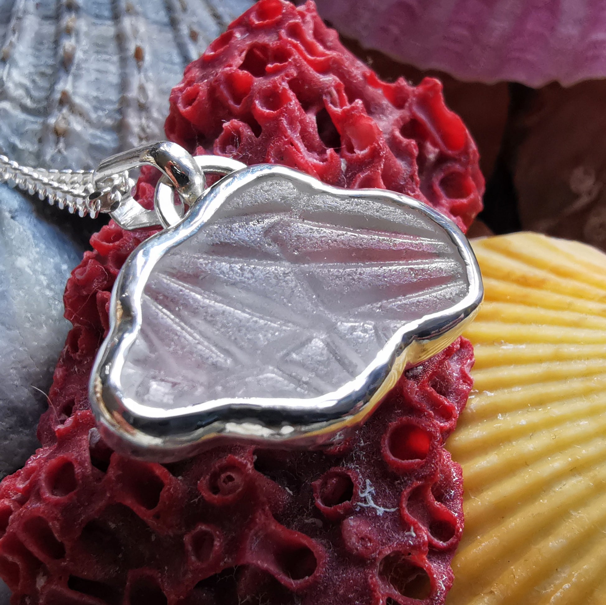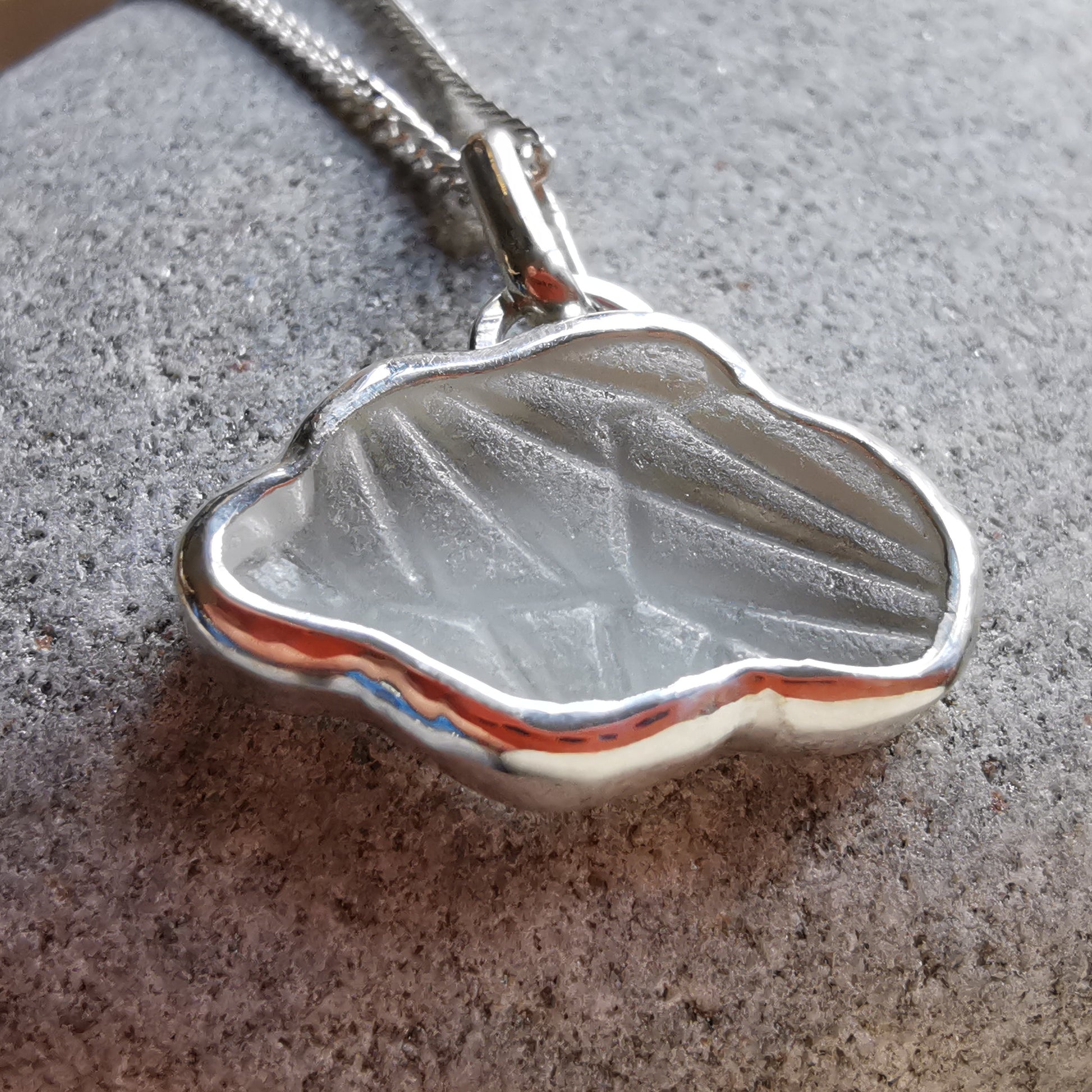 One of a kind pendant composed with genuine clear patterned sea glass found by me in Edinburgh. The sea glass is set in fine backless silver bezel, the chain is sterling silver. I've shaped this piece myself.