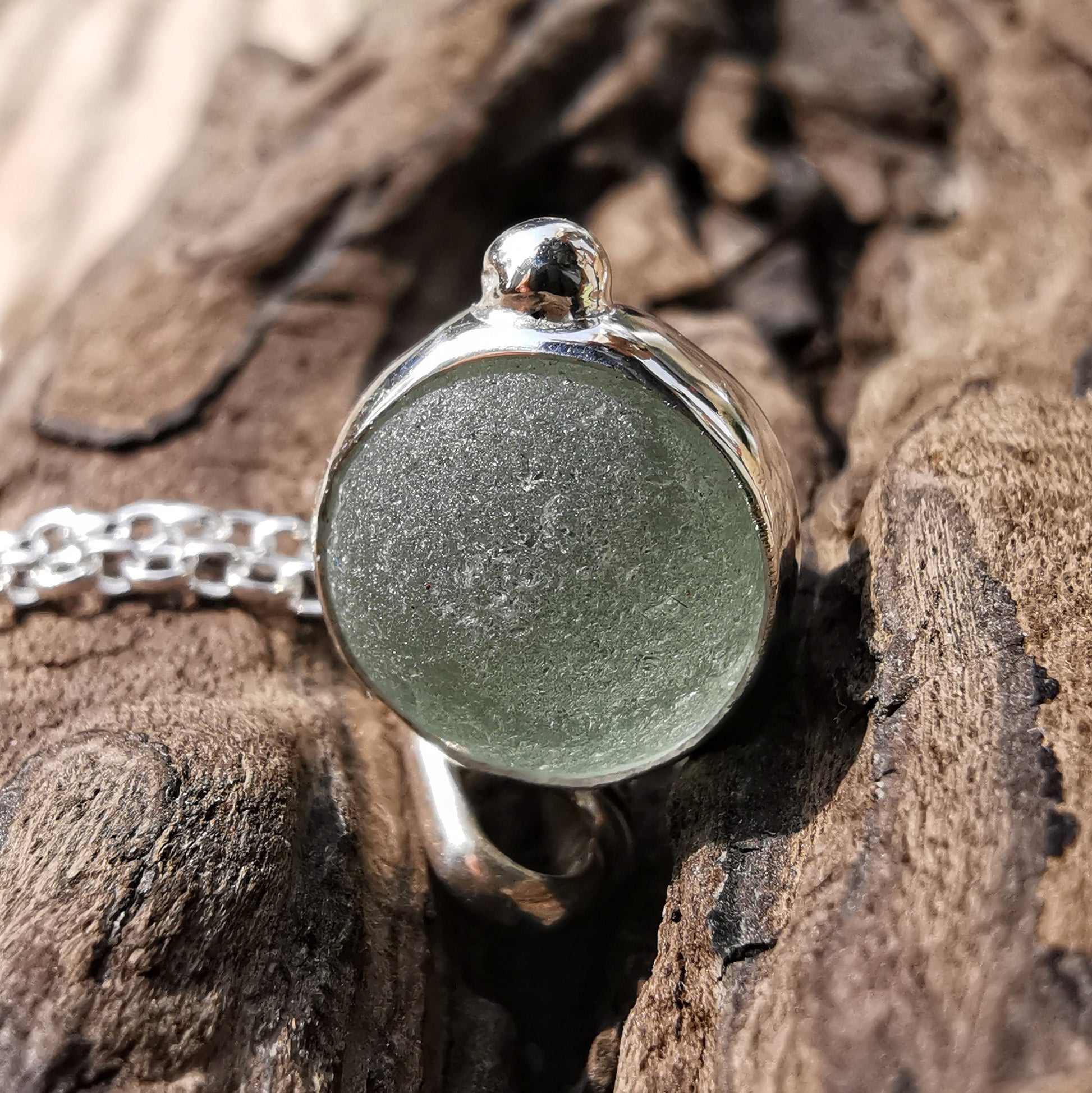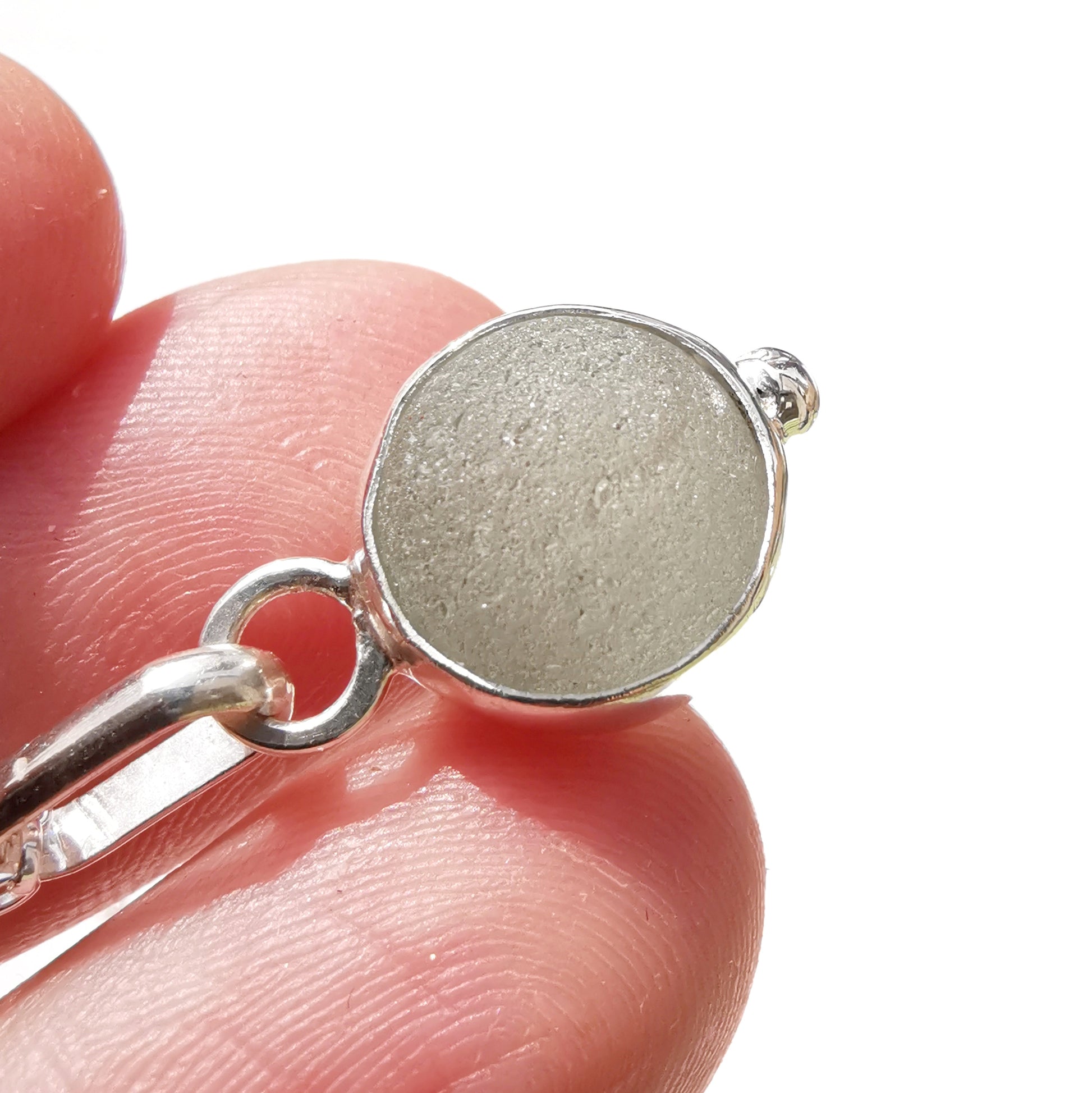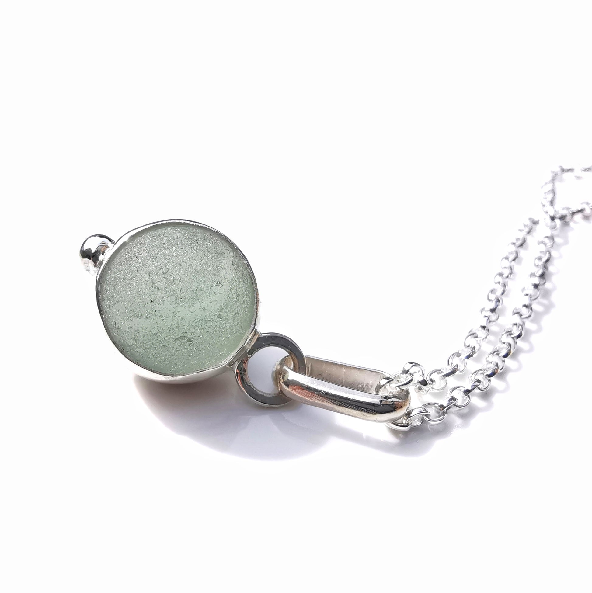 One of a kind pendant composed with genuine frosted tiny Scottish Codd sea glass marble. The marble is set in fine silver bezel, the chain is sterling silver.