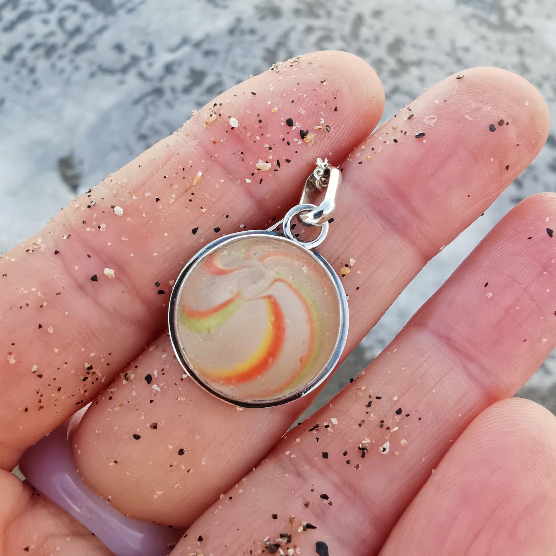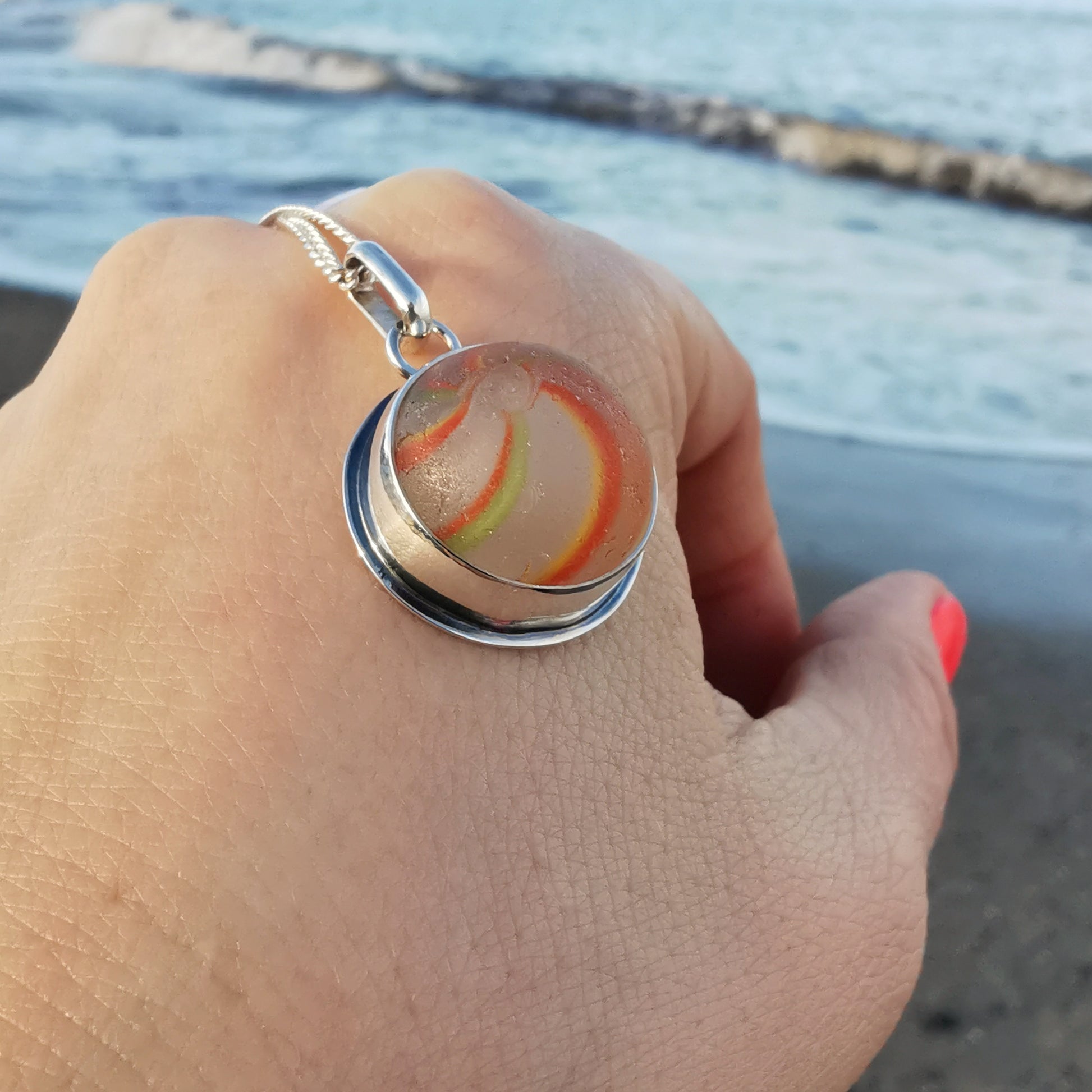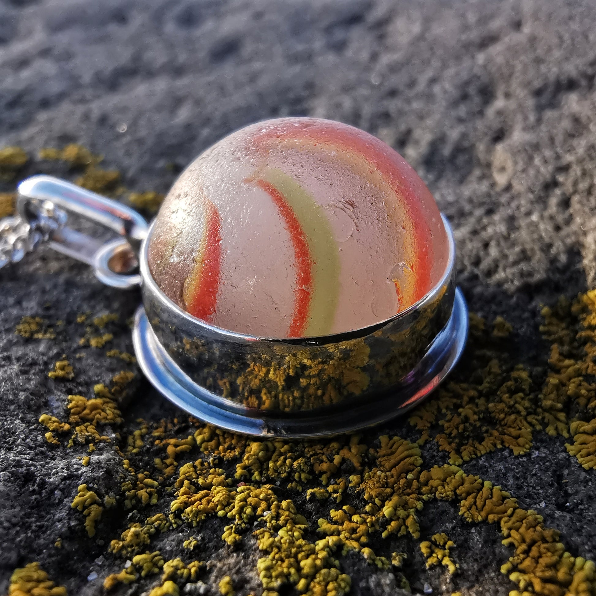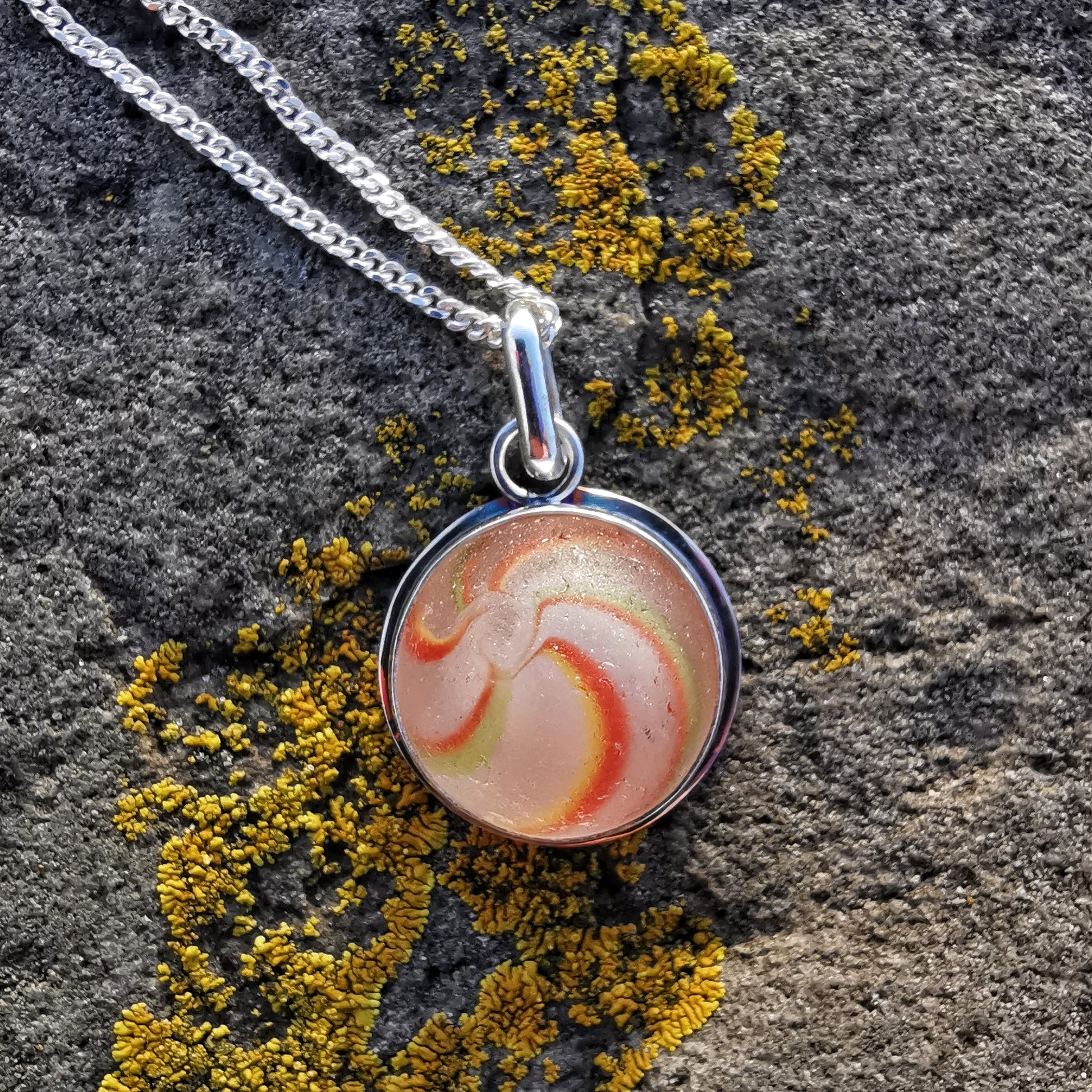 German orange, green, yellow and white sea glass marble & sterling silver pendant.