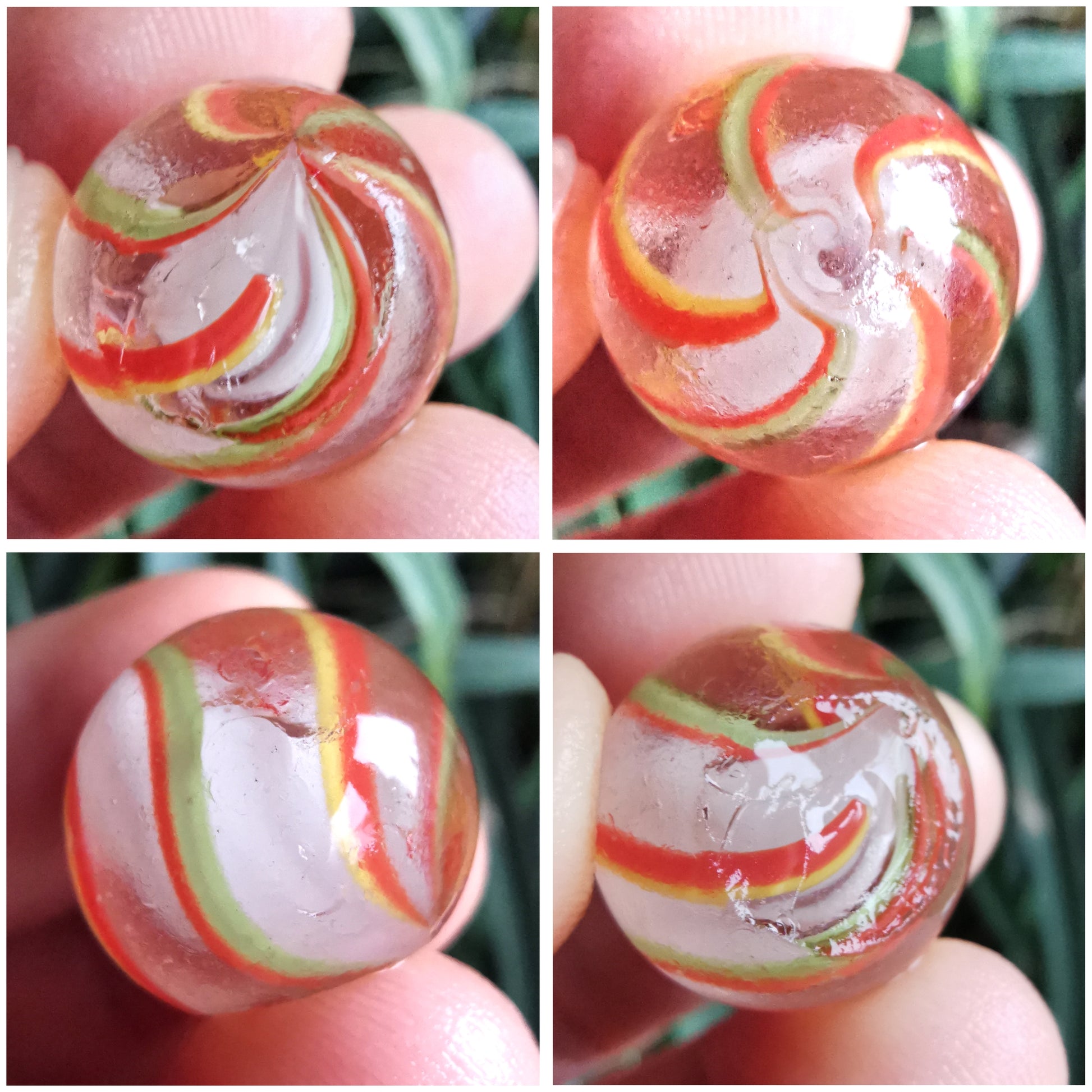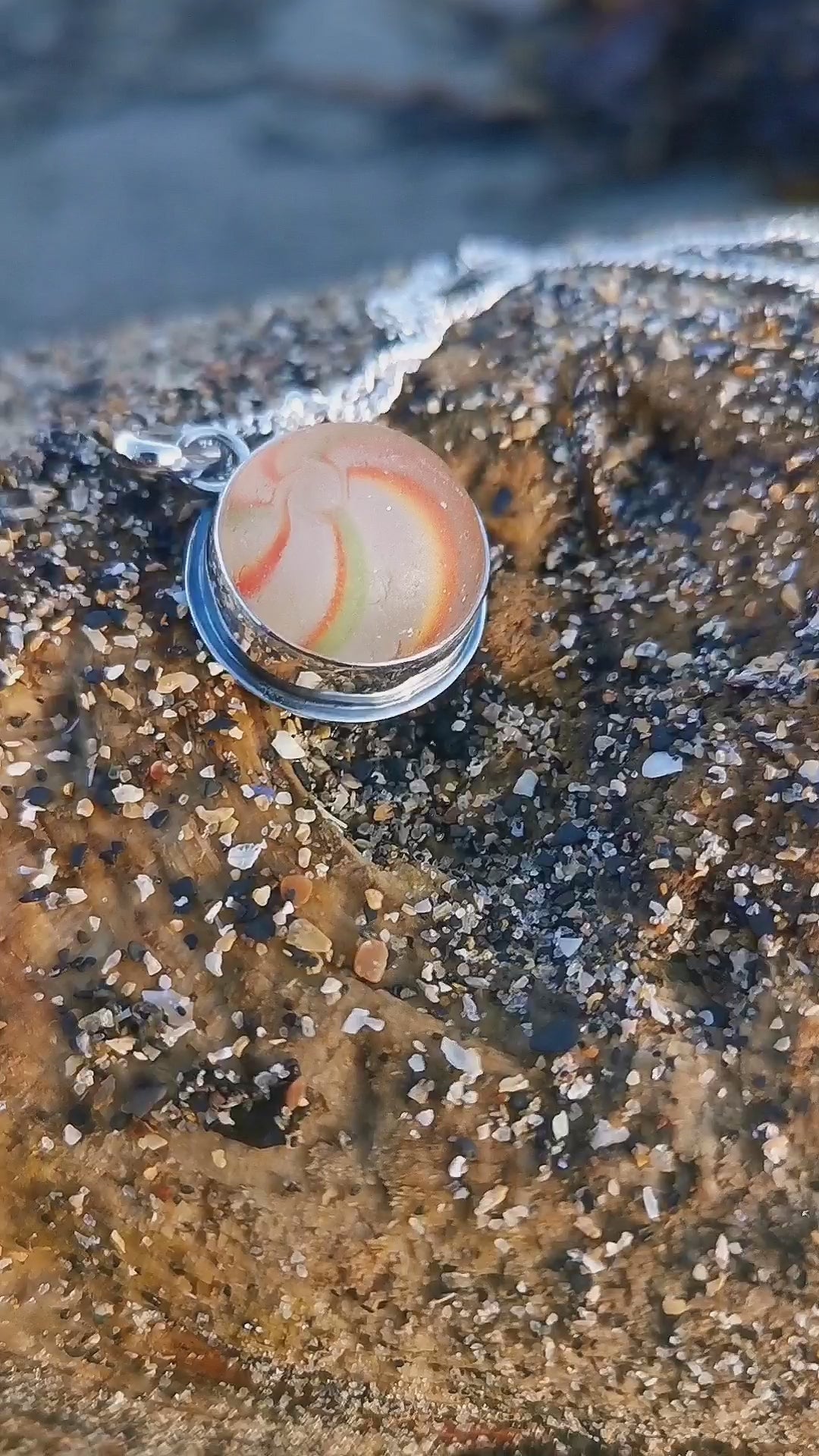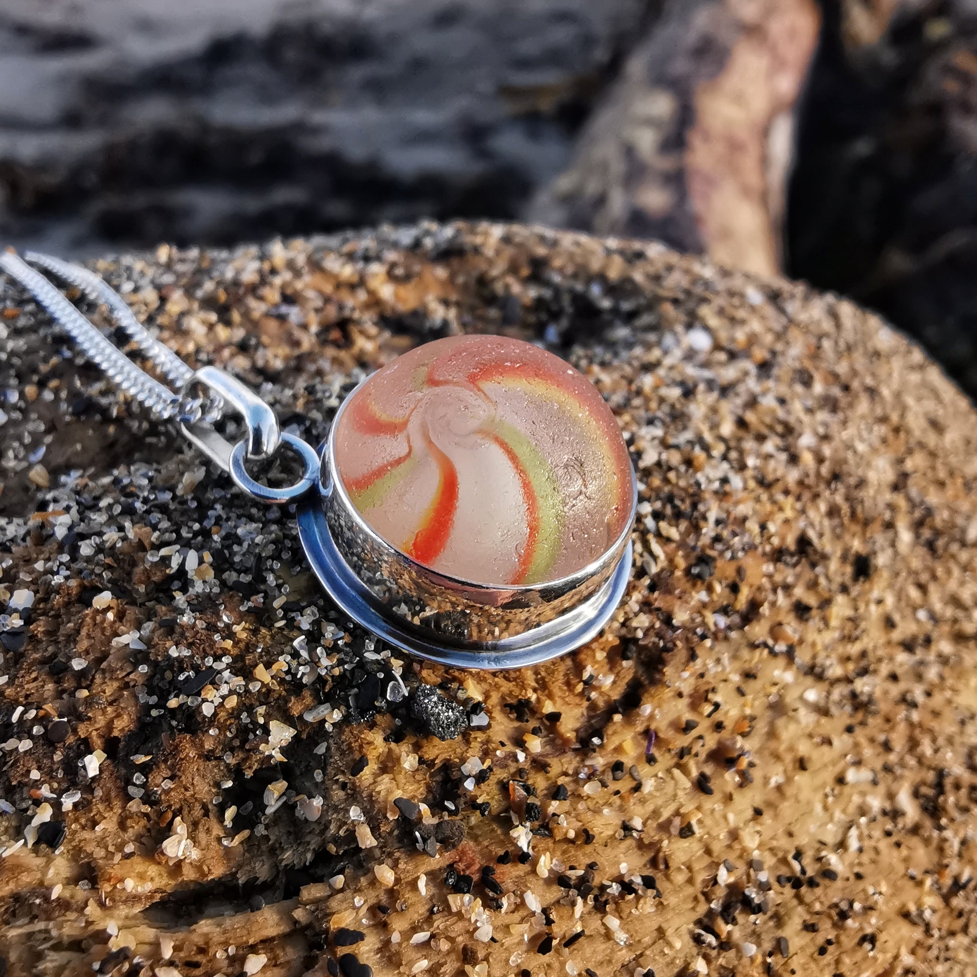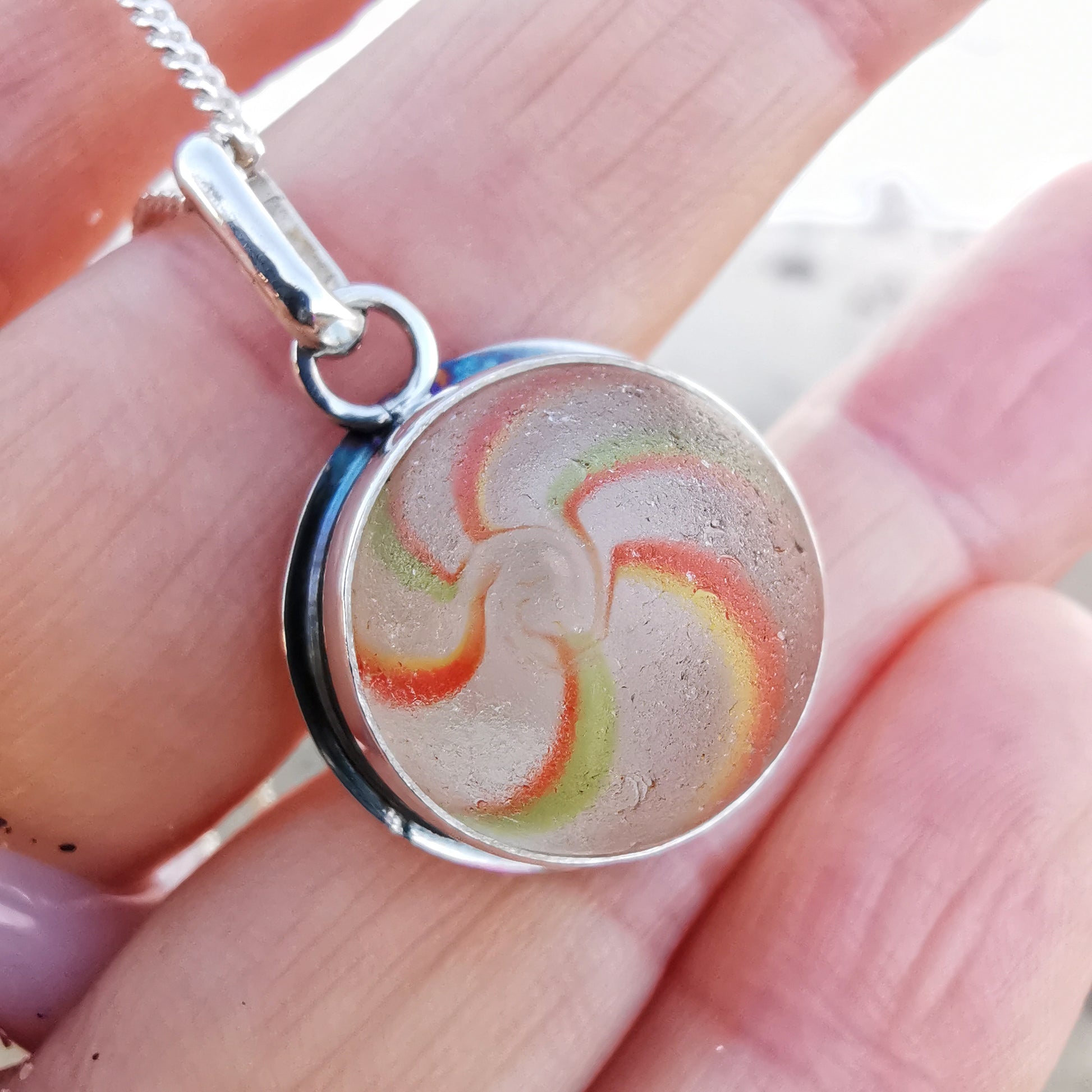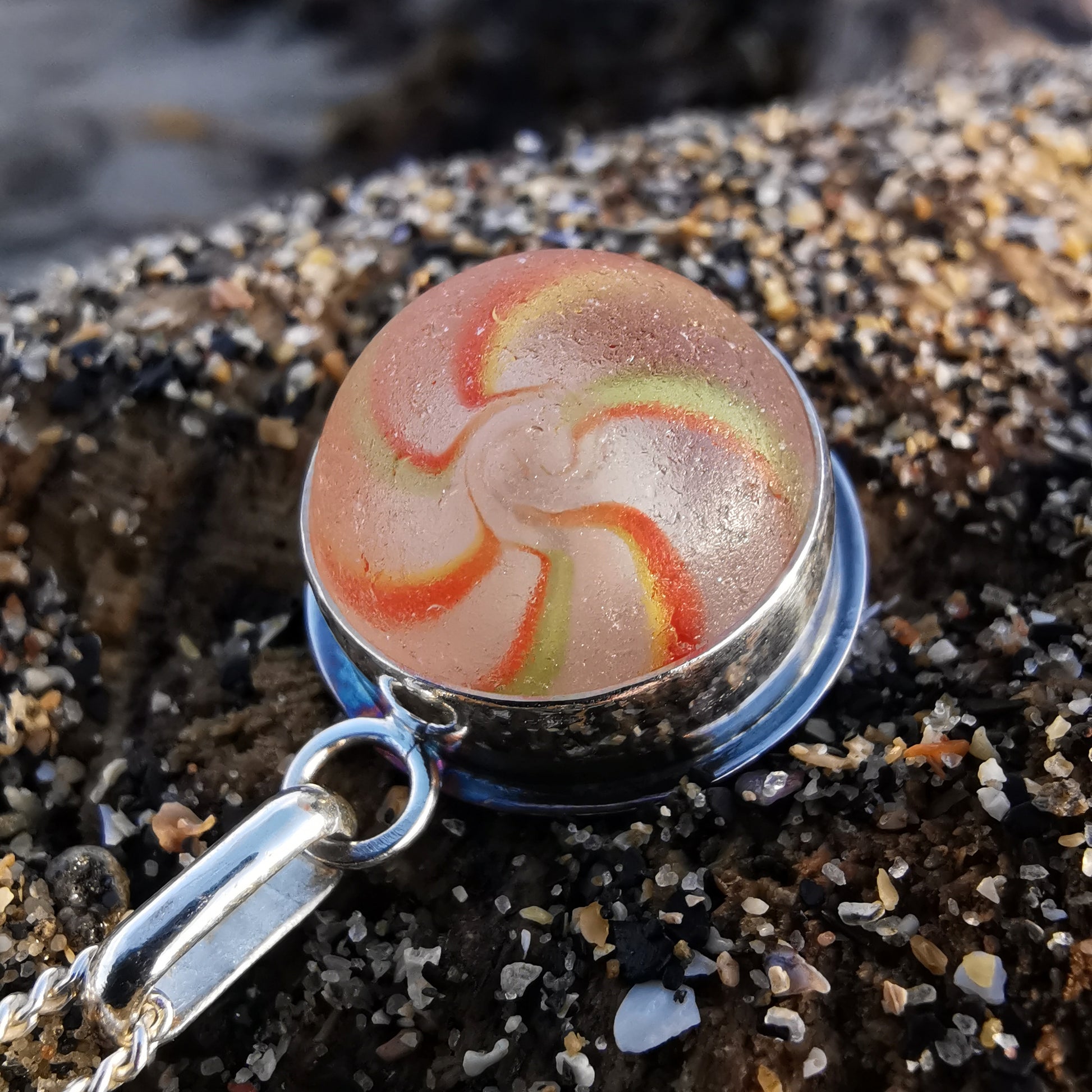 German orange, green, yellow and white sea glass marble & sterling silver pendant.