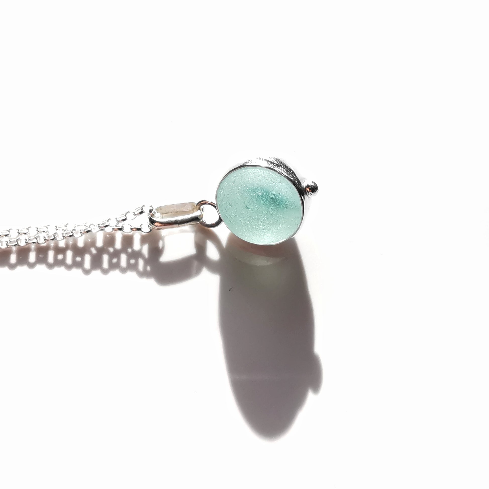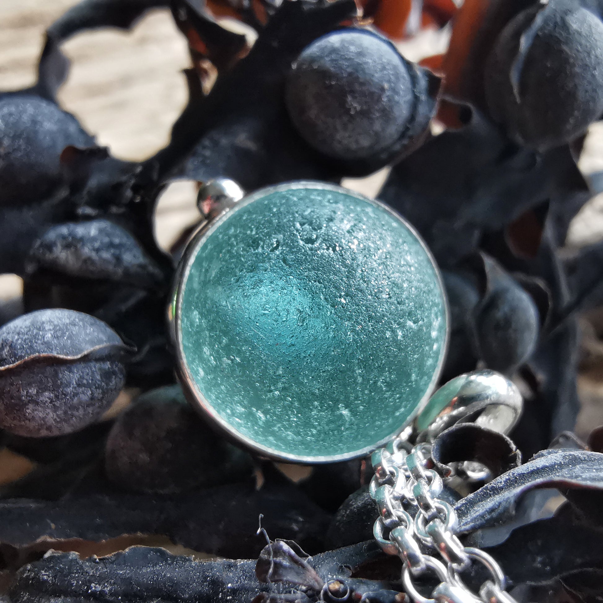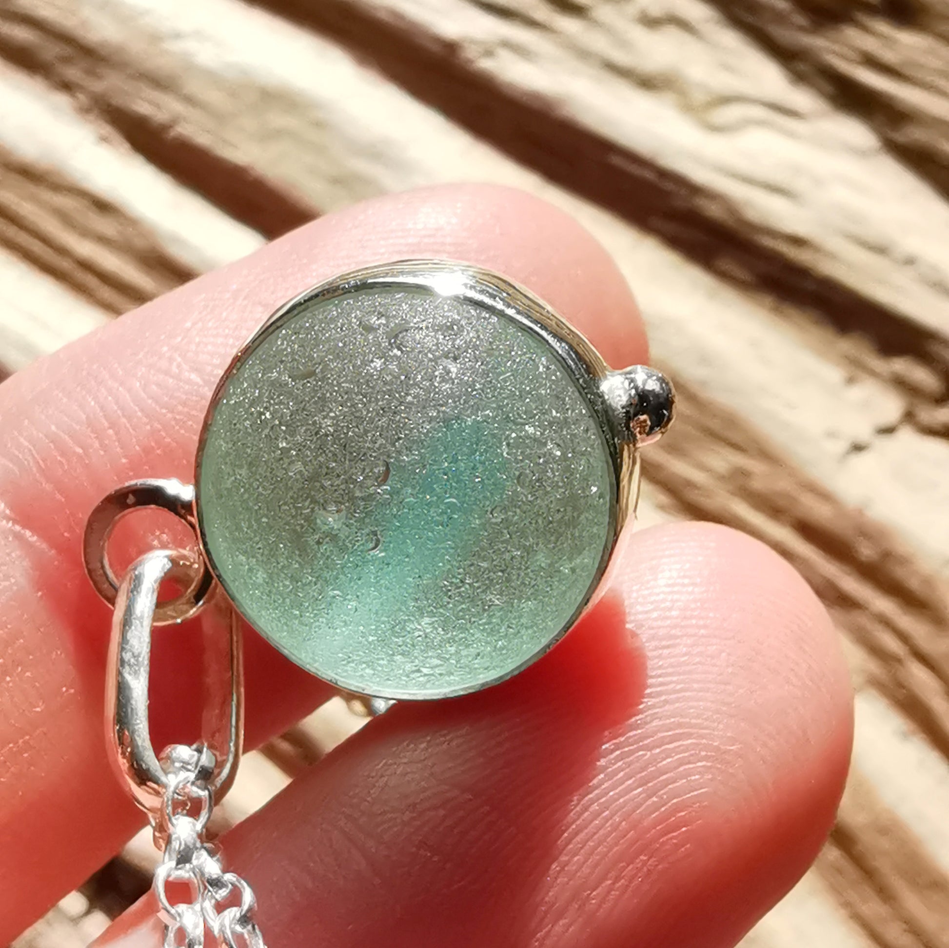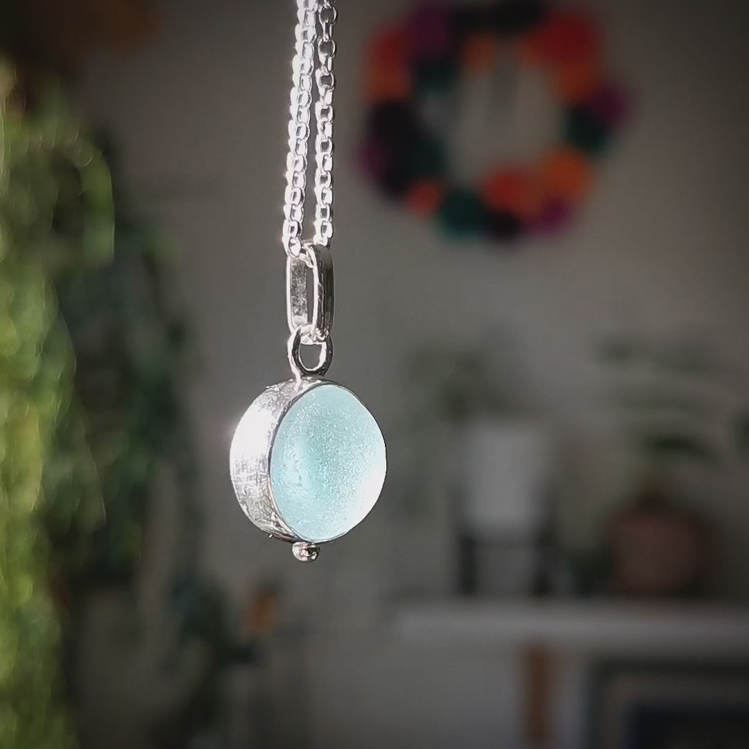 One of a kind pendant composed with genuine frosted blue sea glass marble, found by myself on a beach in Edinburgh. The marble is set in fine silver bezel, the chain is sterling silver. The marble can spin in the bezel, this is normal and it is not a fault, marble is secure and won't fall of the bezel.
