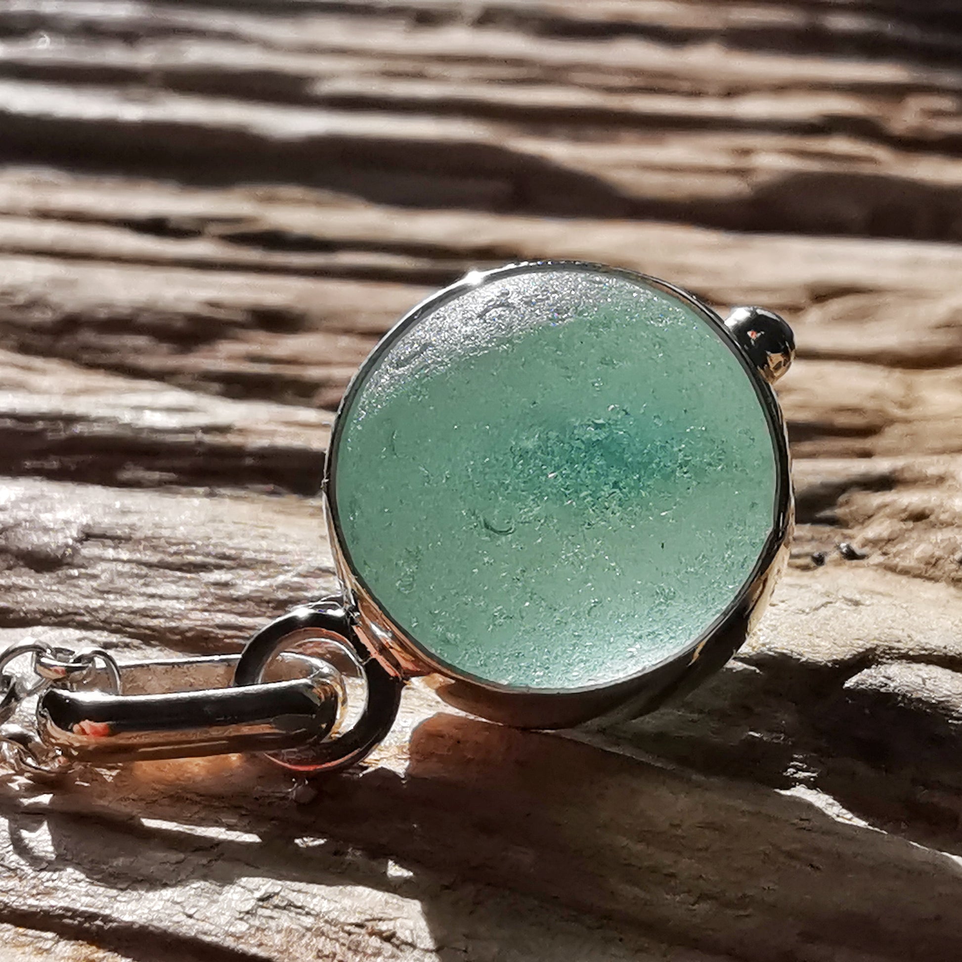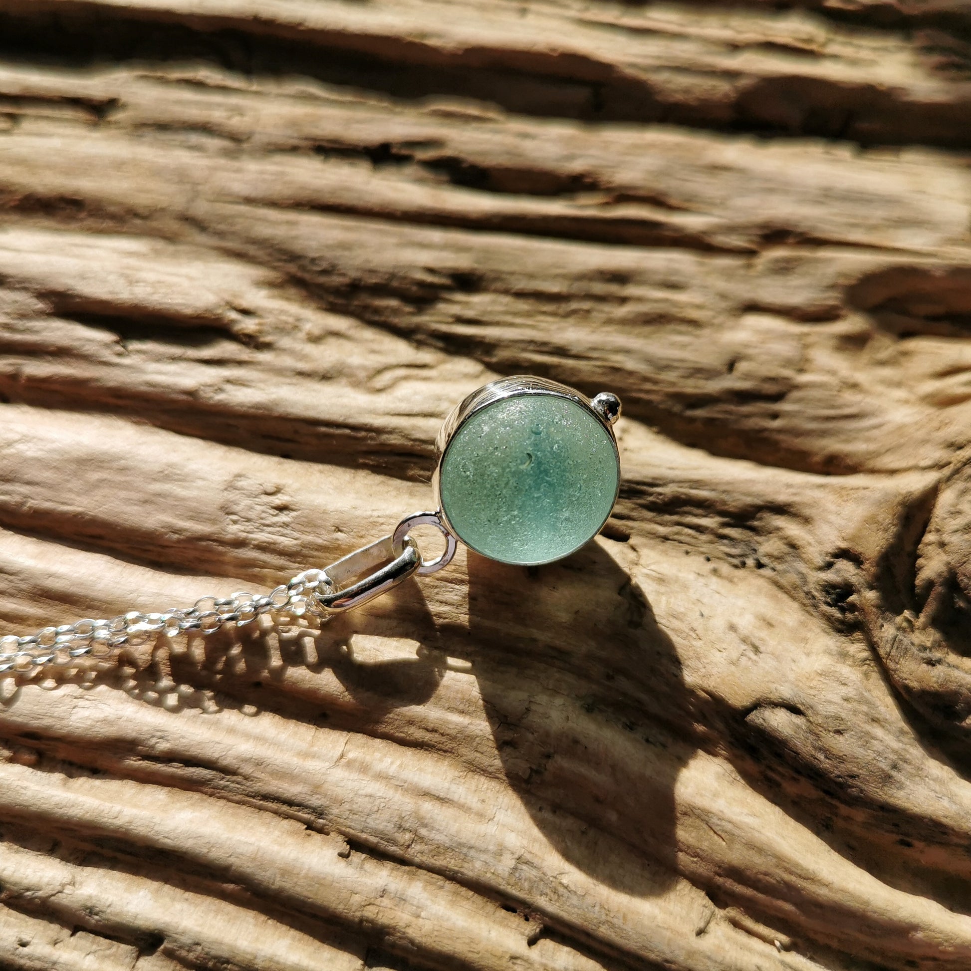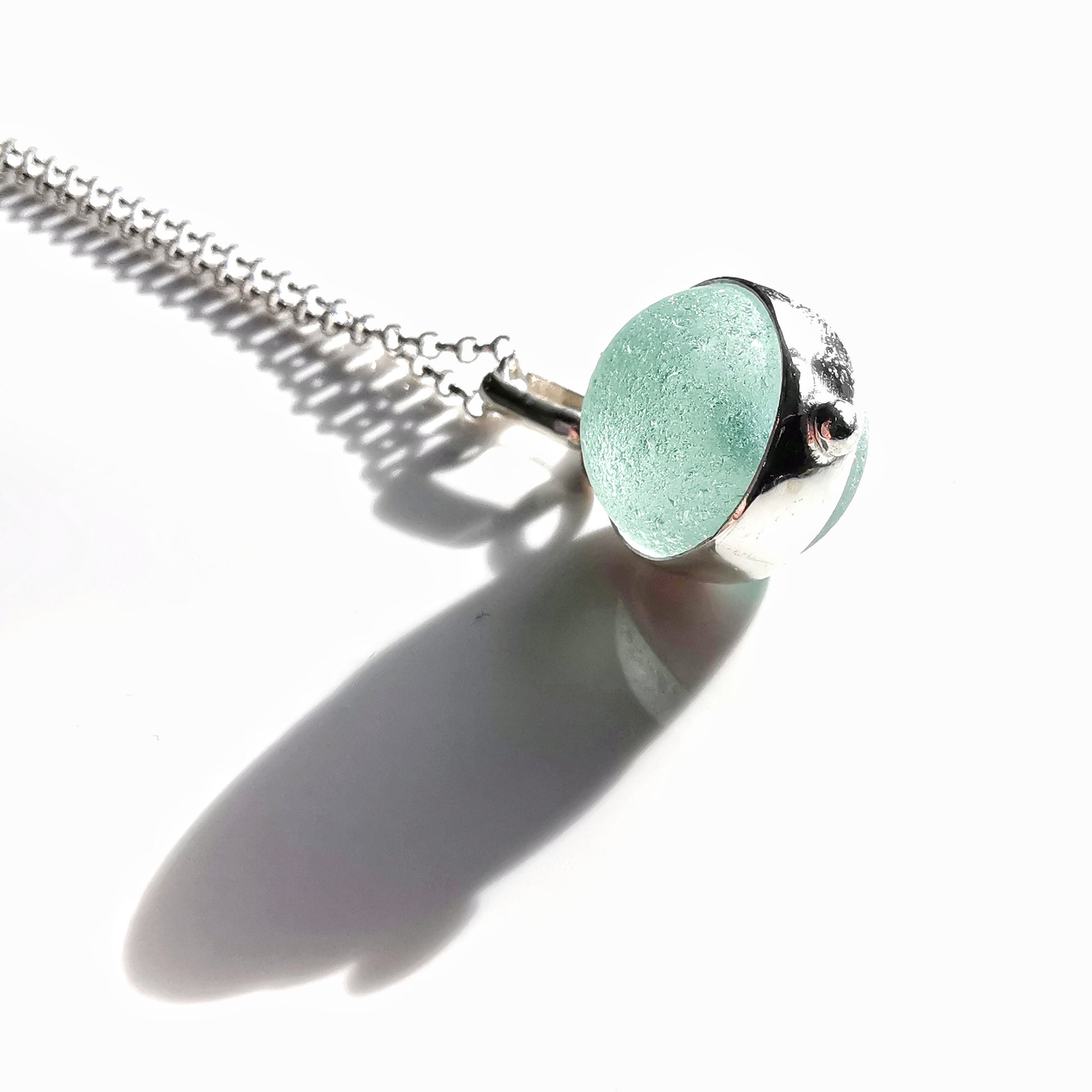 One of a kind pendant composed with genuine frosted blue sea glass marble, found by myself on a beach in Edinburgh. The marble is set in fine silver bezel, the chain is sterling silver. The marble can spin in the bezel, this is normal and it is not a fault, marble is secure and won't fall of the bezel.