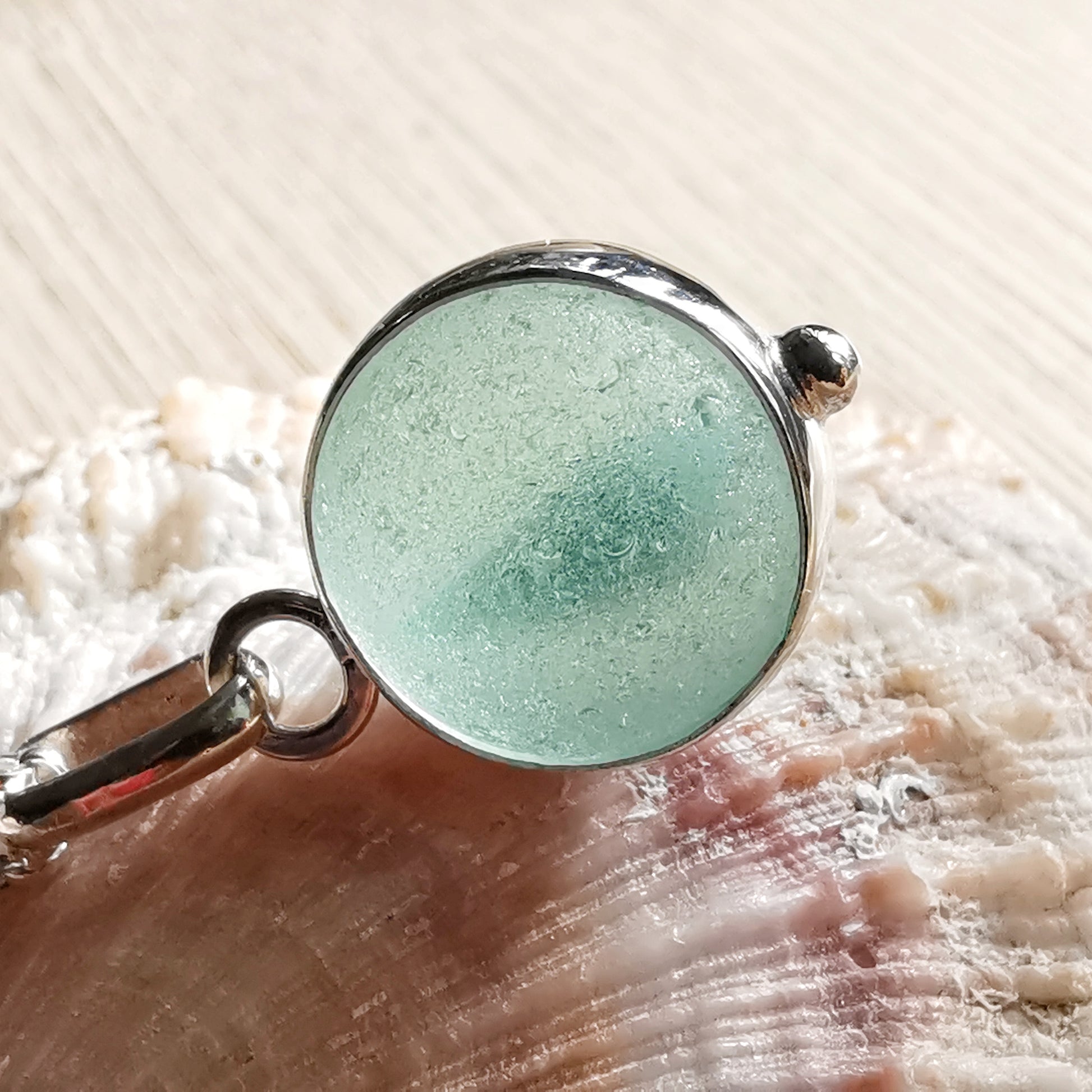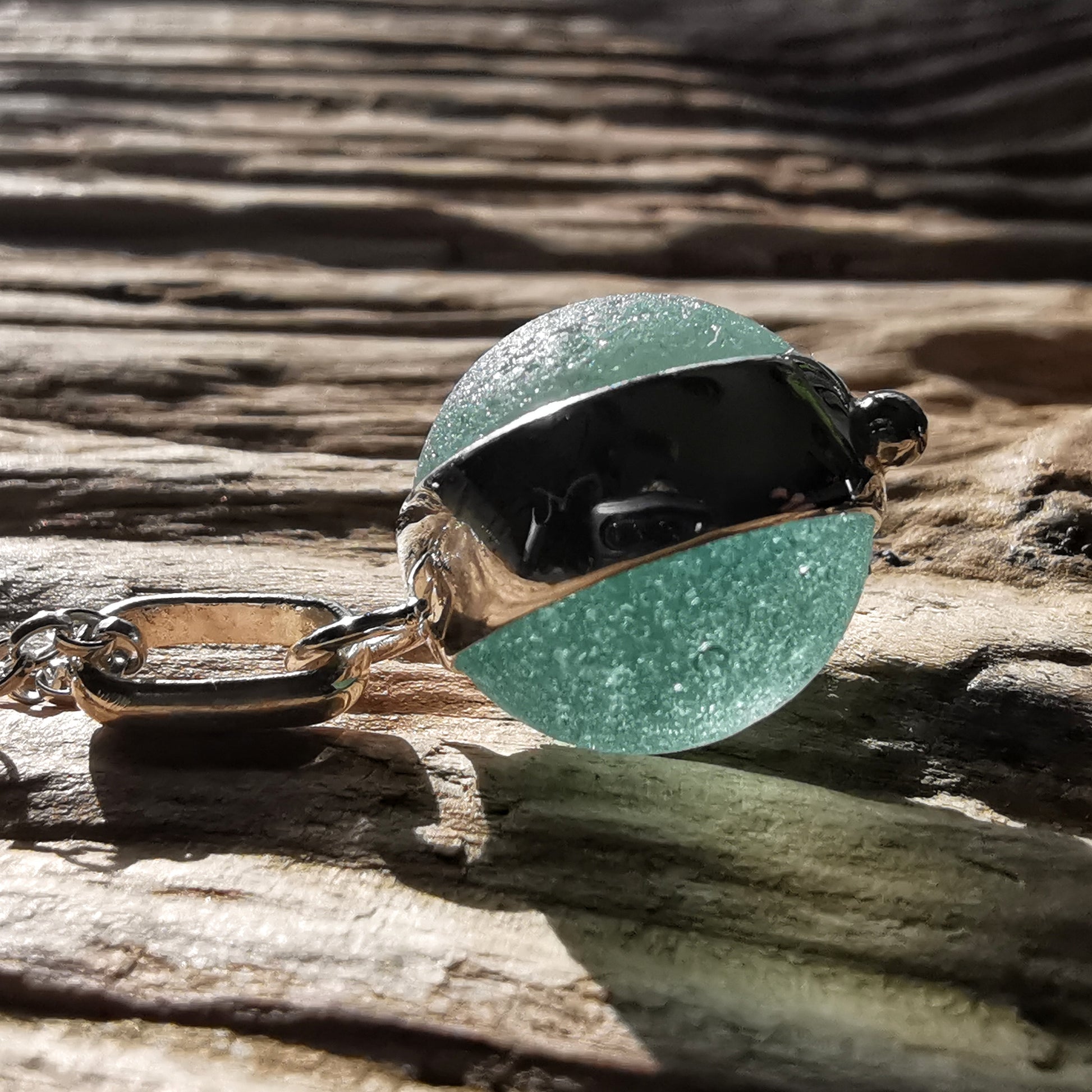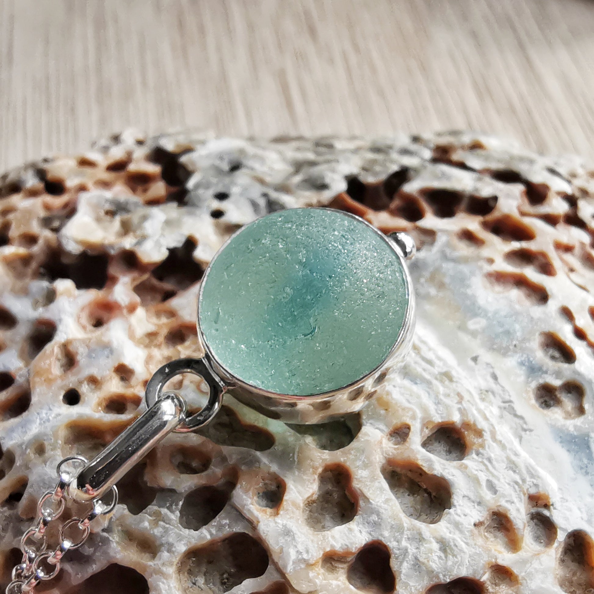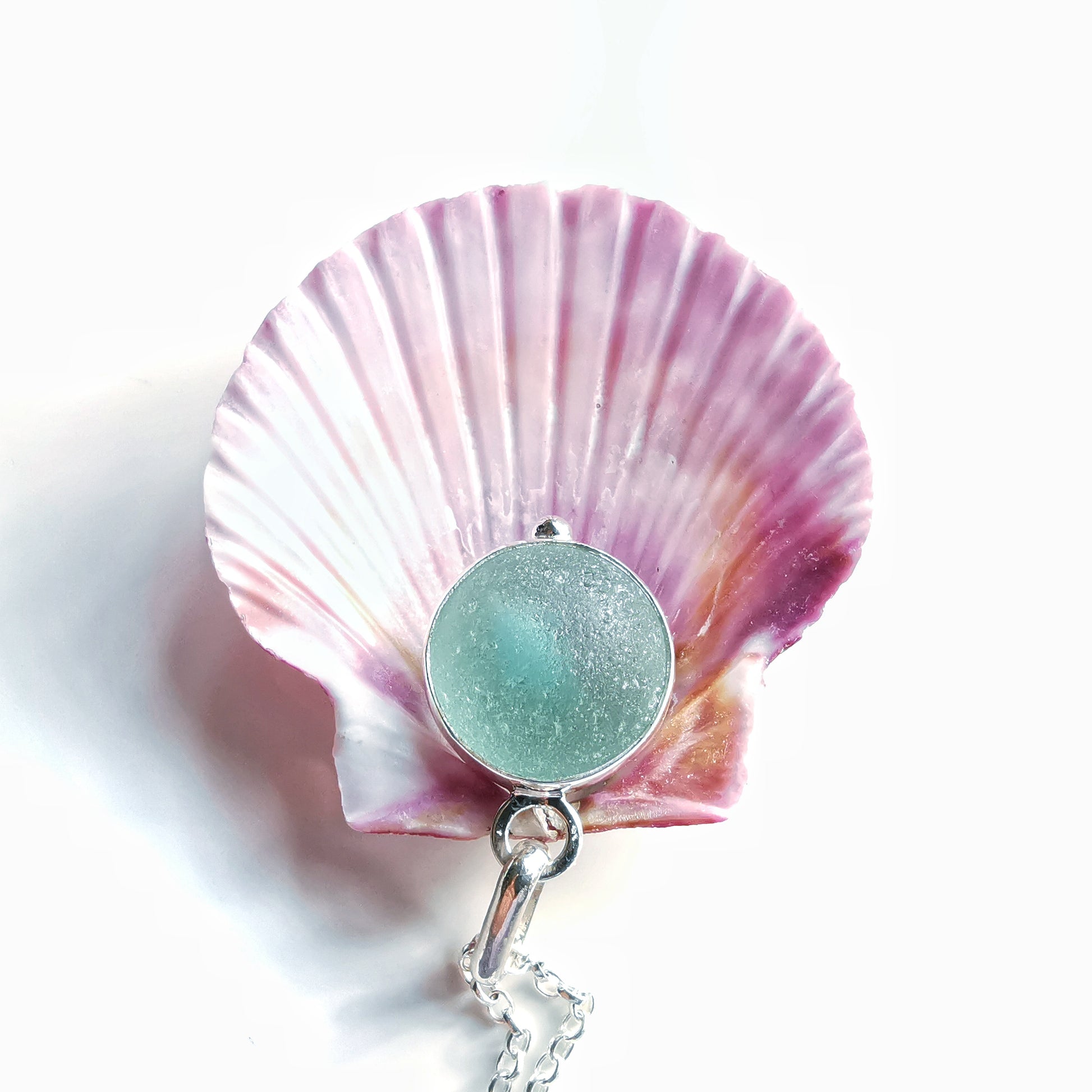 One of a kind pendant composed with genuine frosted blue sea glass marble, found by myself on a beach in Edinburgh. The marble is set in fine silver bezel, the chain is sterling silver. The marble can spin in the bezel, this is normal and it is not a fault, marble is secure and won't fall of the bezel.