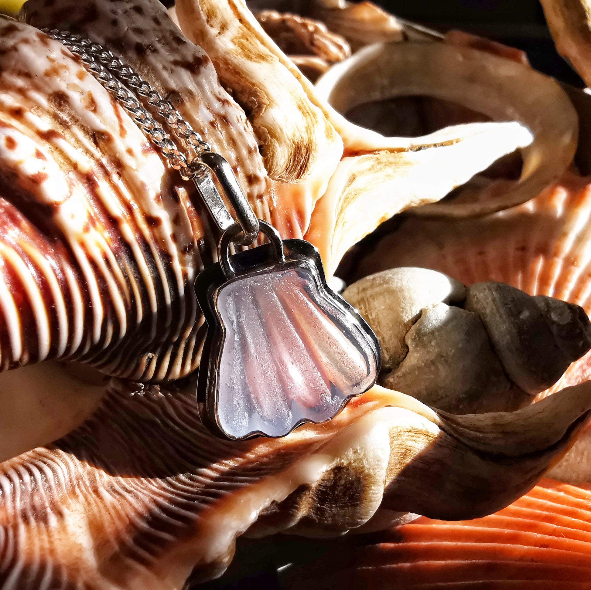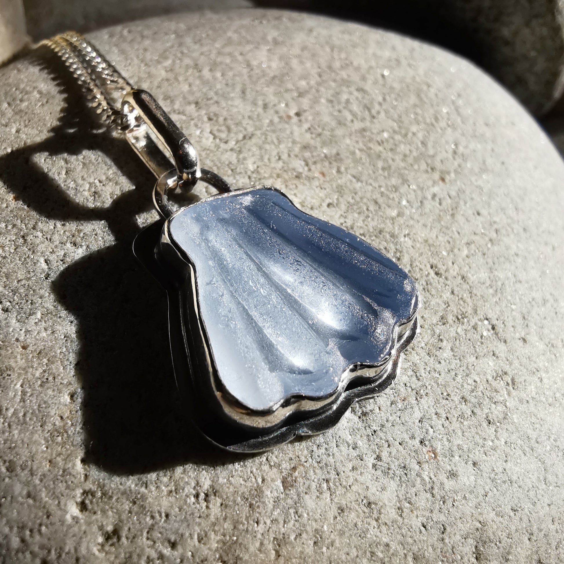 One of a kind pendant composed with light blue sea glass shaped as a scallop shell, from Baltic Sea found in Poland.