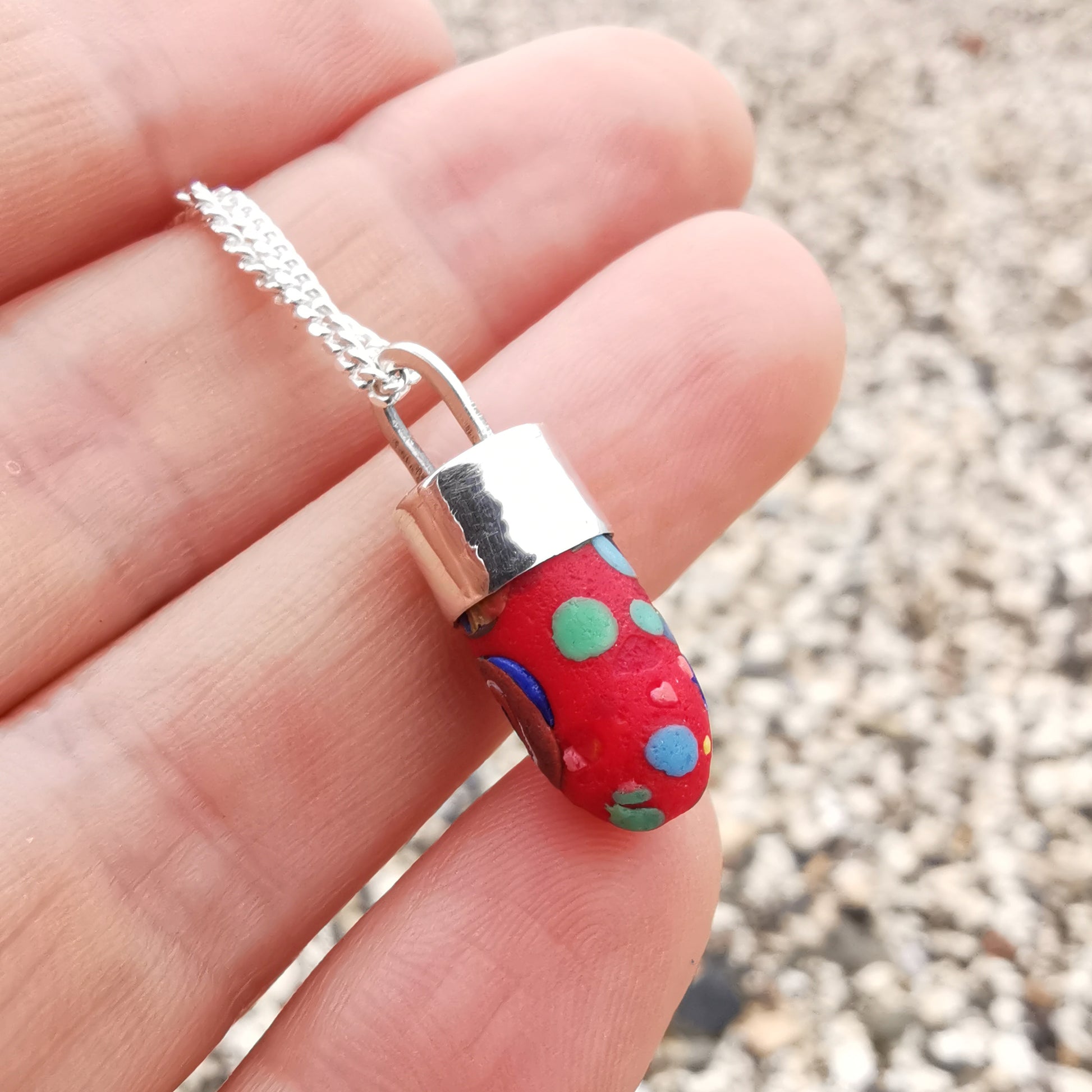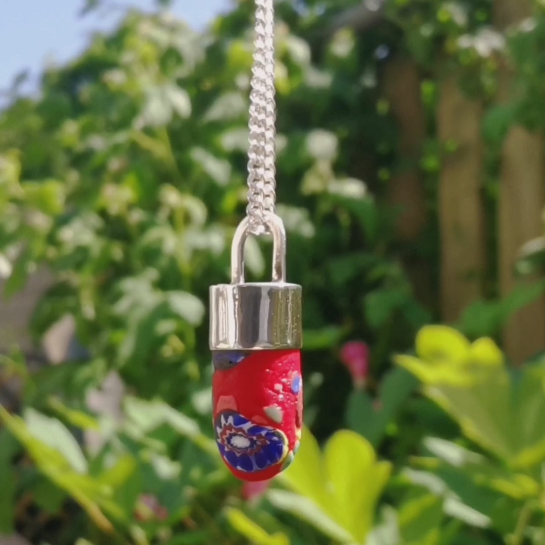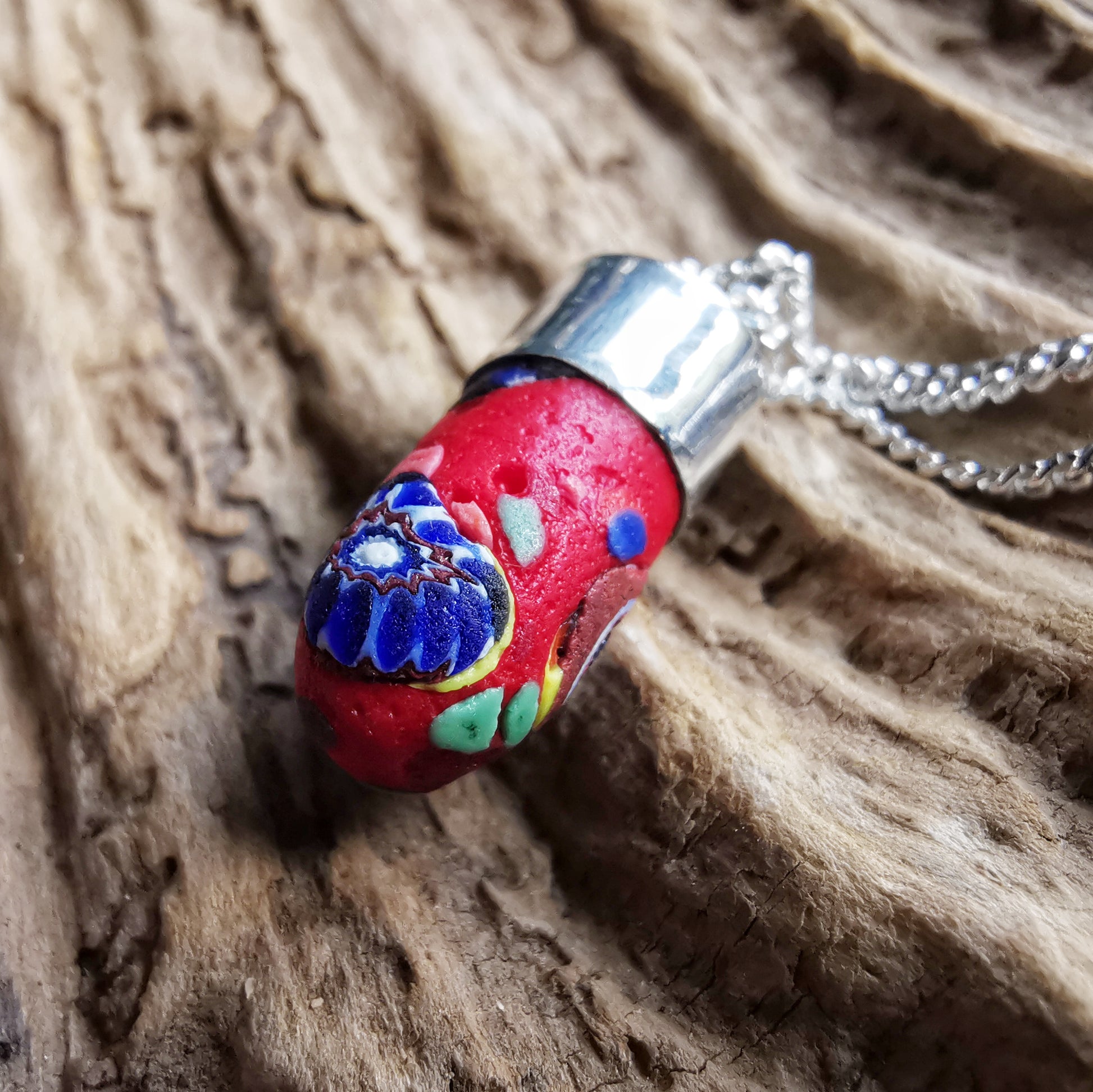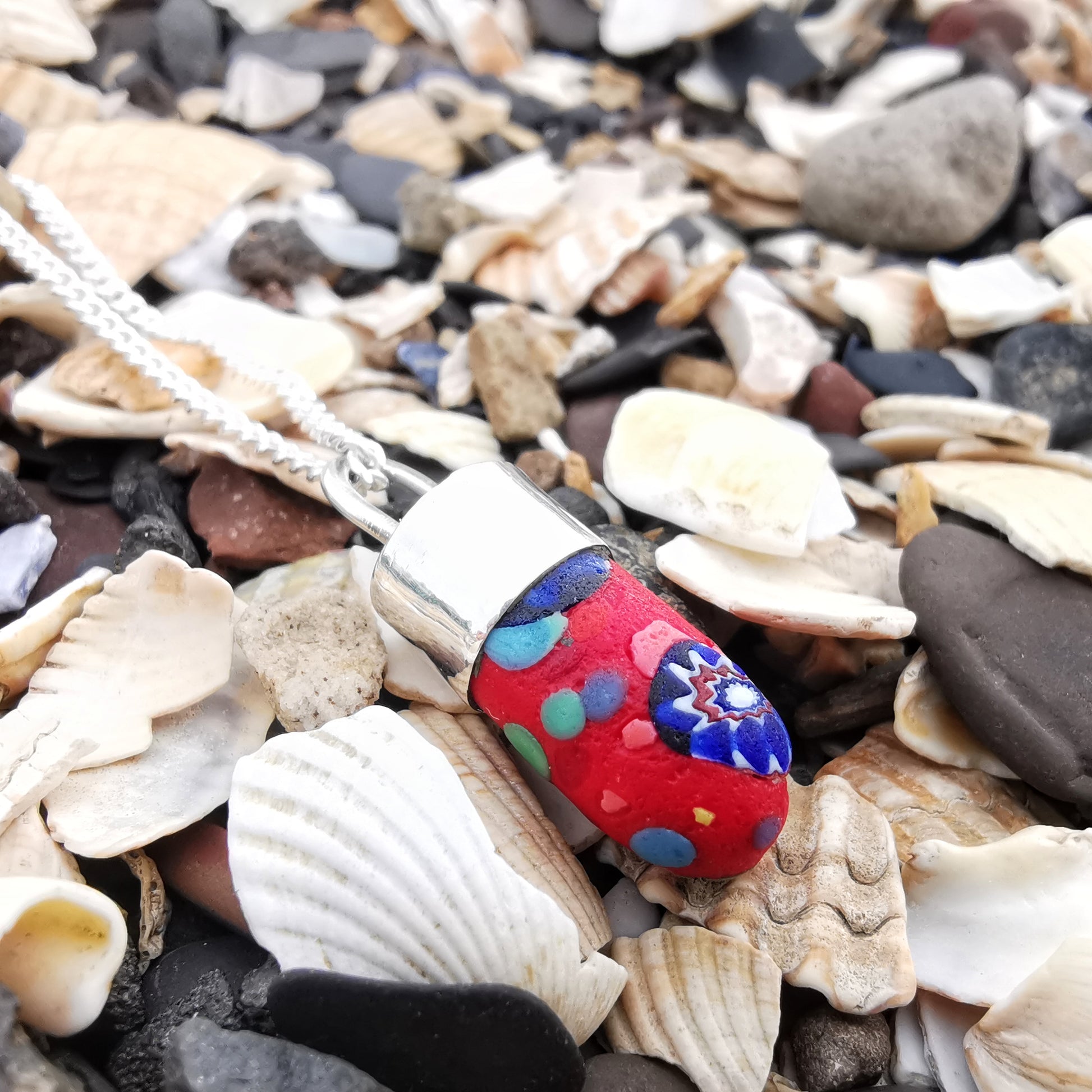 One of a kind pendant composed with genuine frosted Millefiori sea glass hat pin found by me on Edinburgh's beach. The sea glass is set in fine silver bezel, the chain is sterling silver.