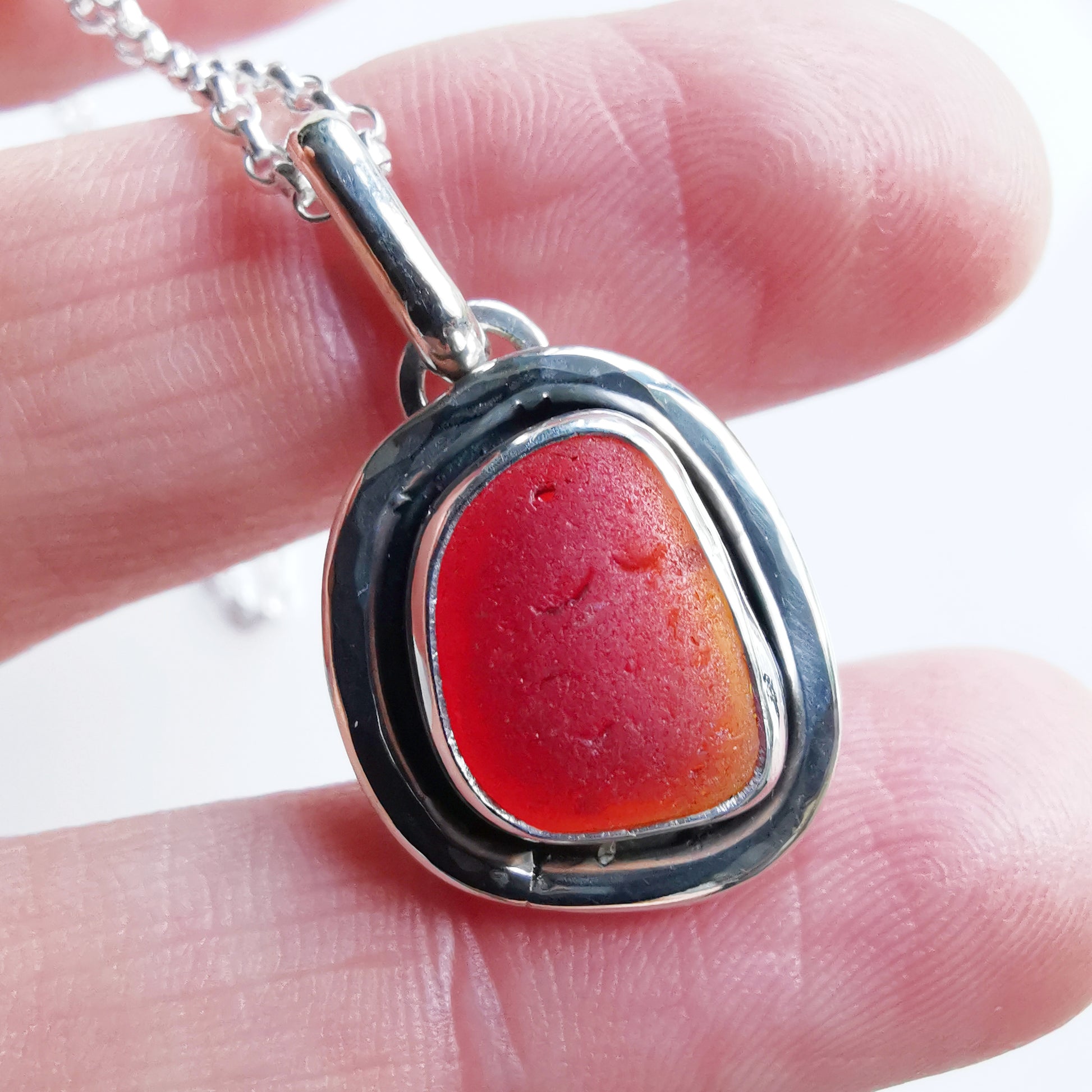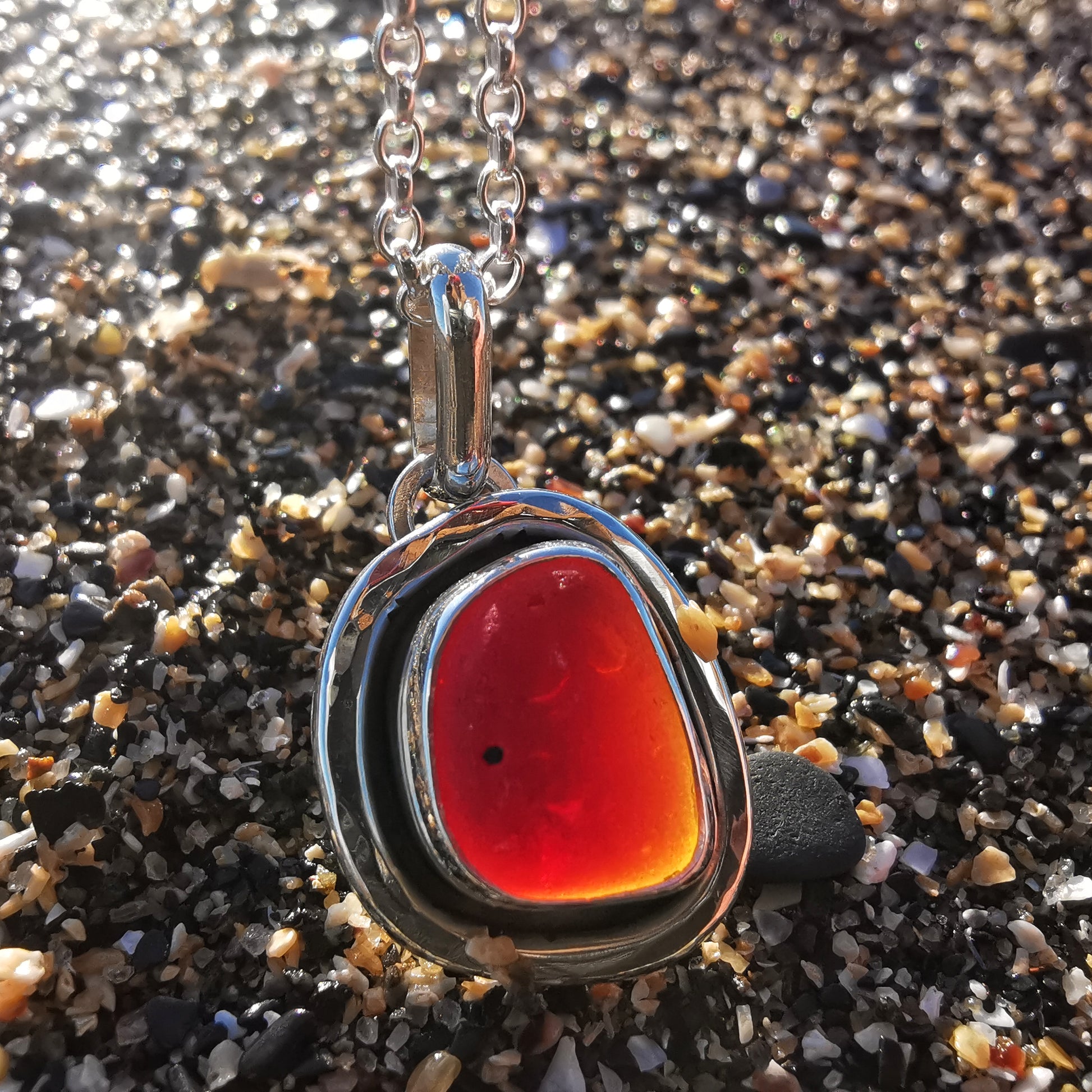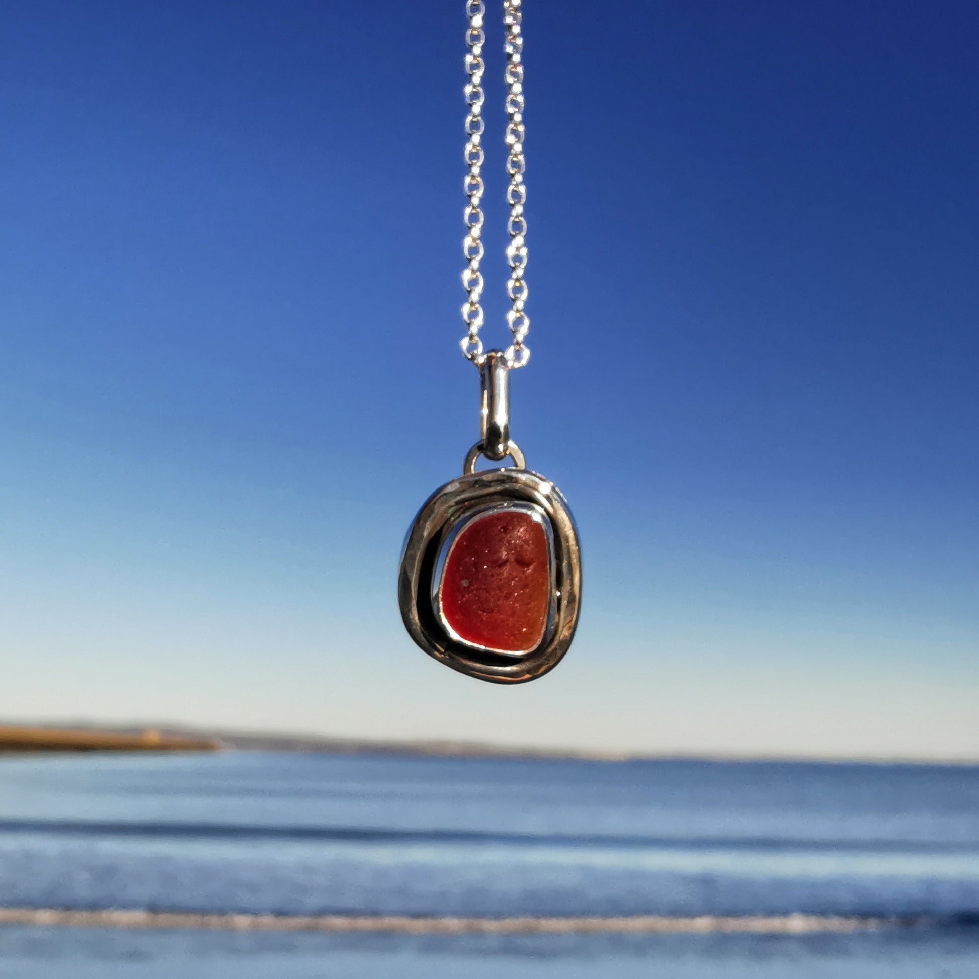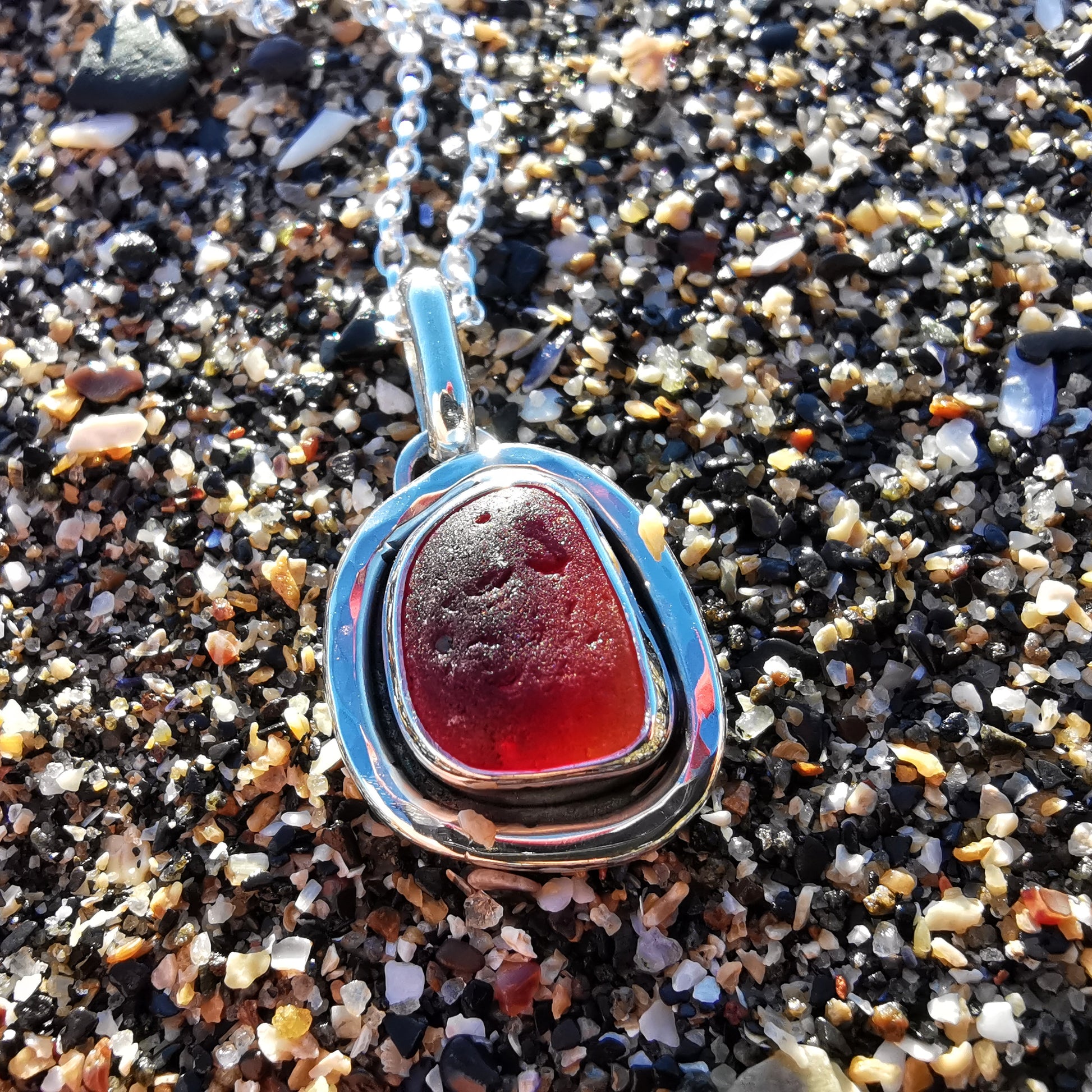 One of a kind pendant composed with genuine red amberina sea glass.The sea glass is set in fine silver backless bezel, the chain is sterling silver.