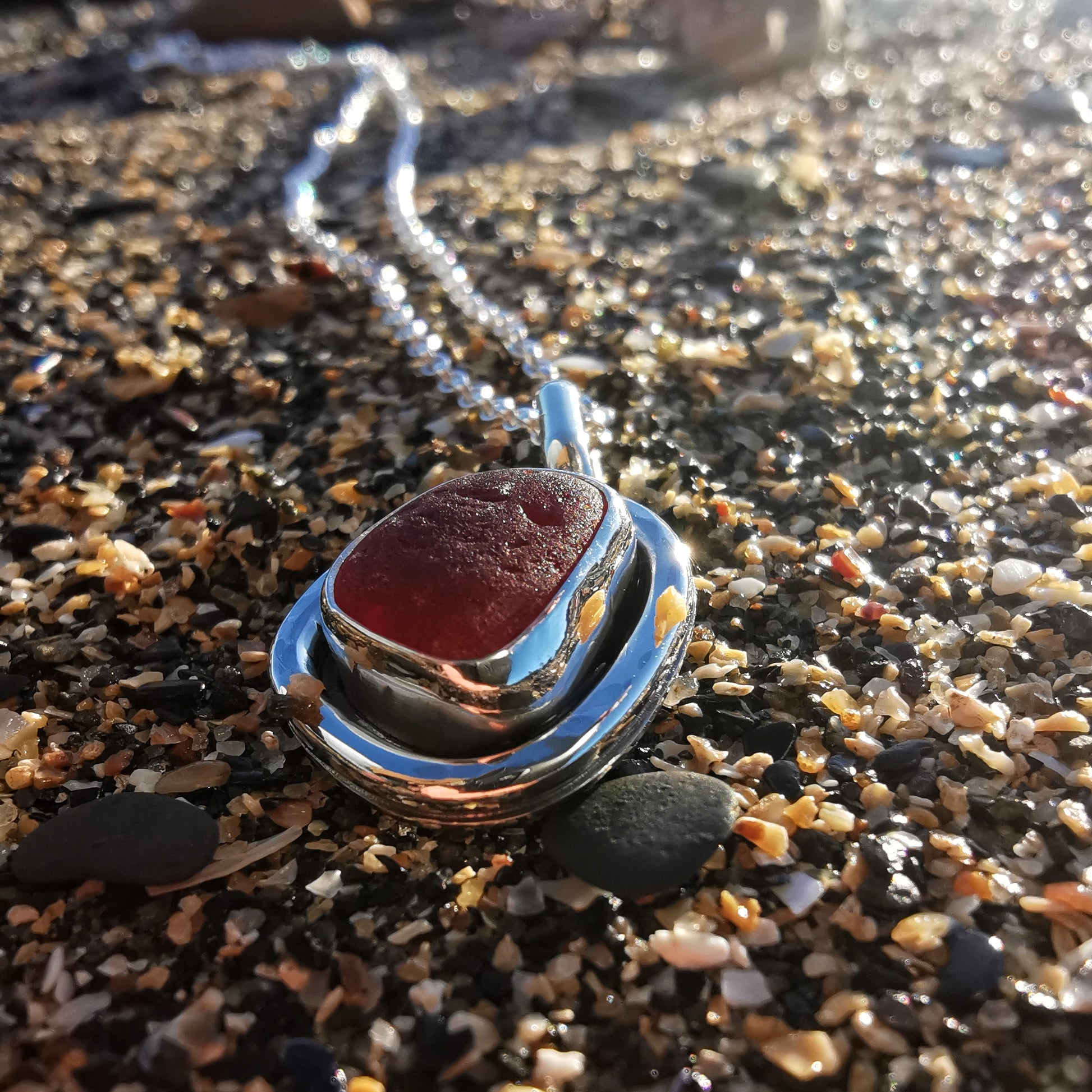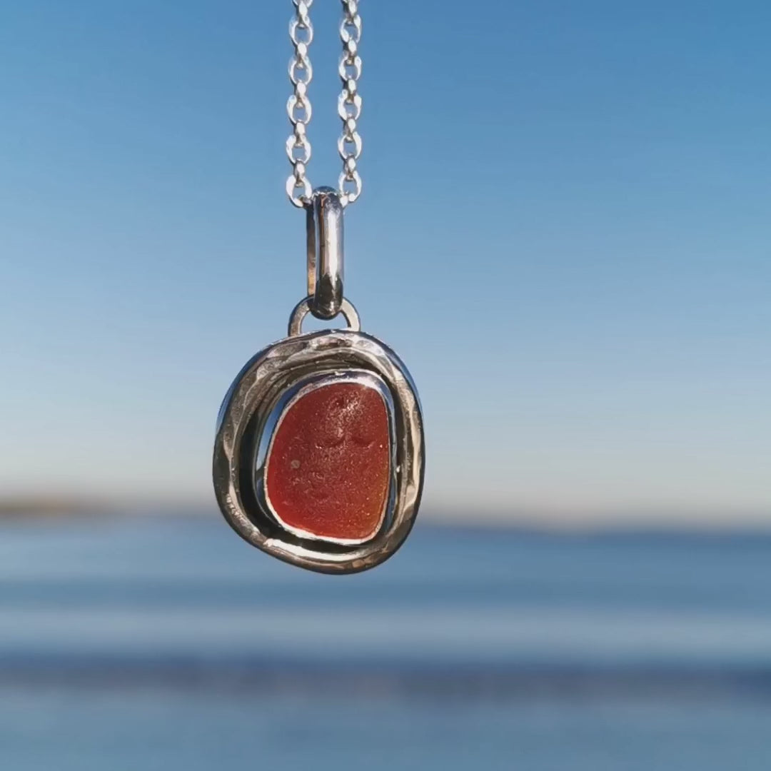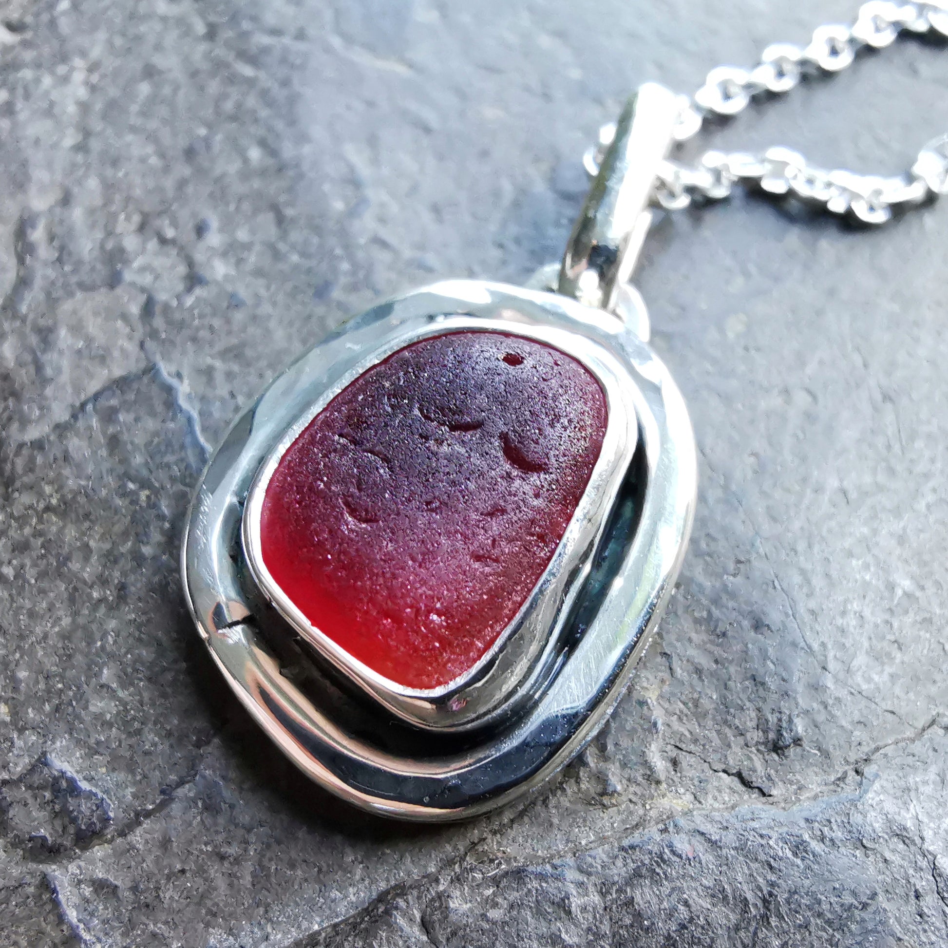 One of a kind pendant composed with genuine red amberina sea glass.The sea glass is set in fine silver backless bezel, the chain is sterling silver.