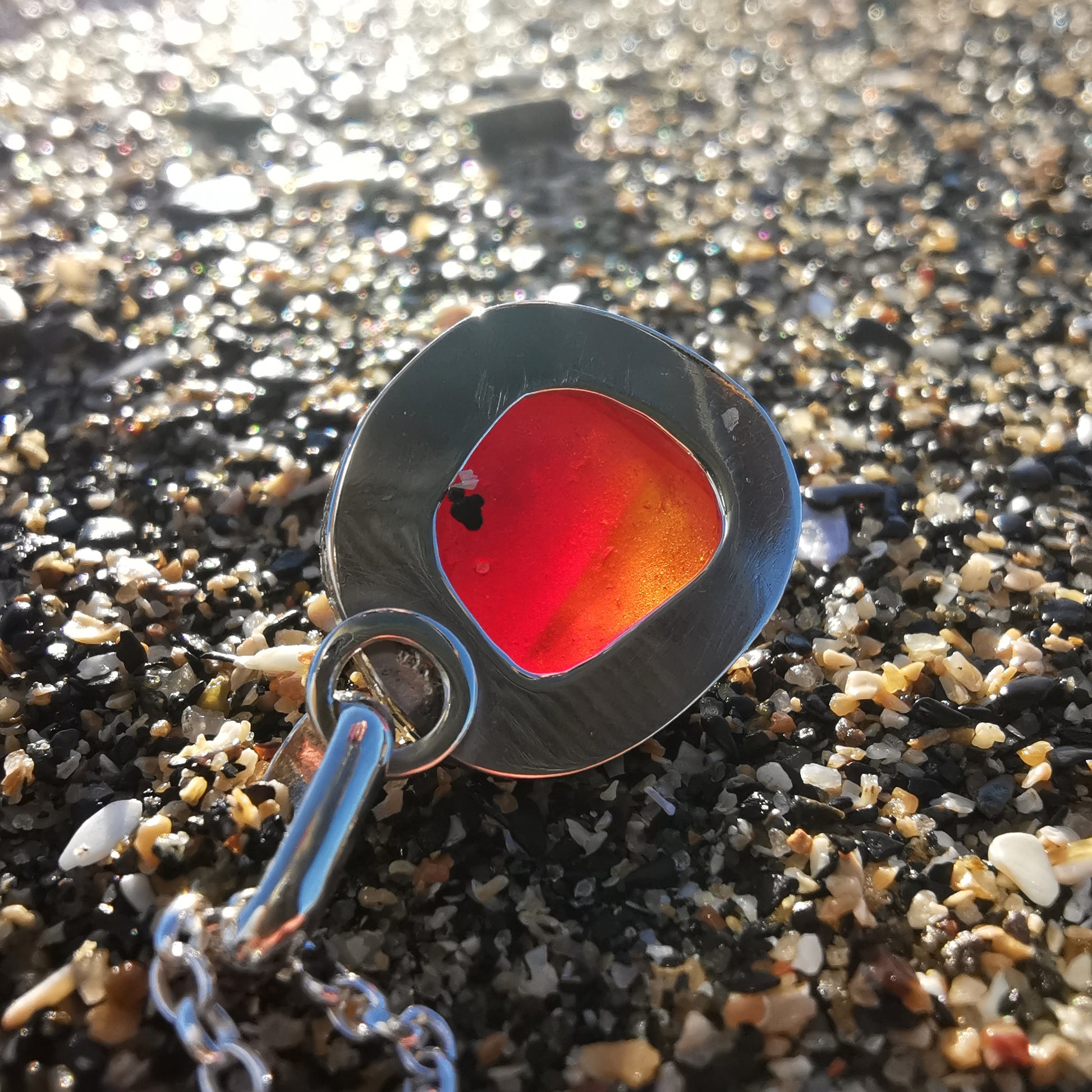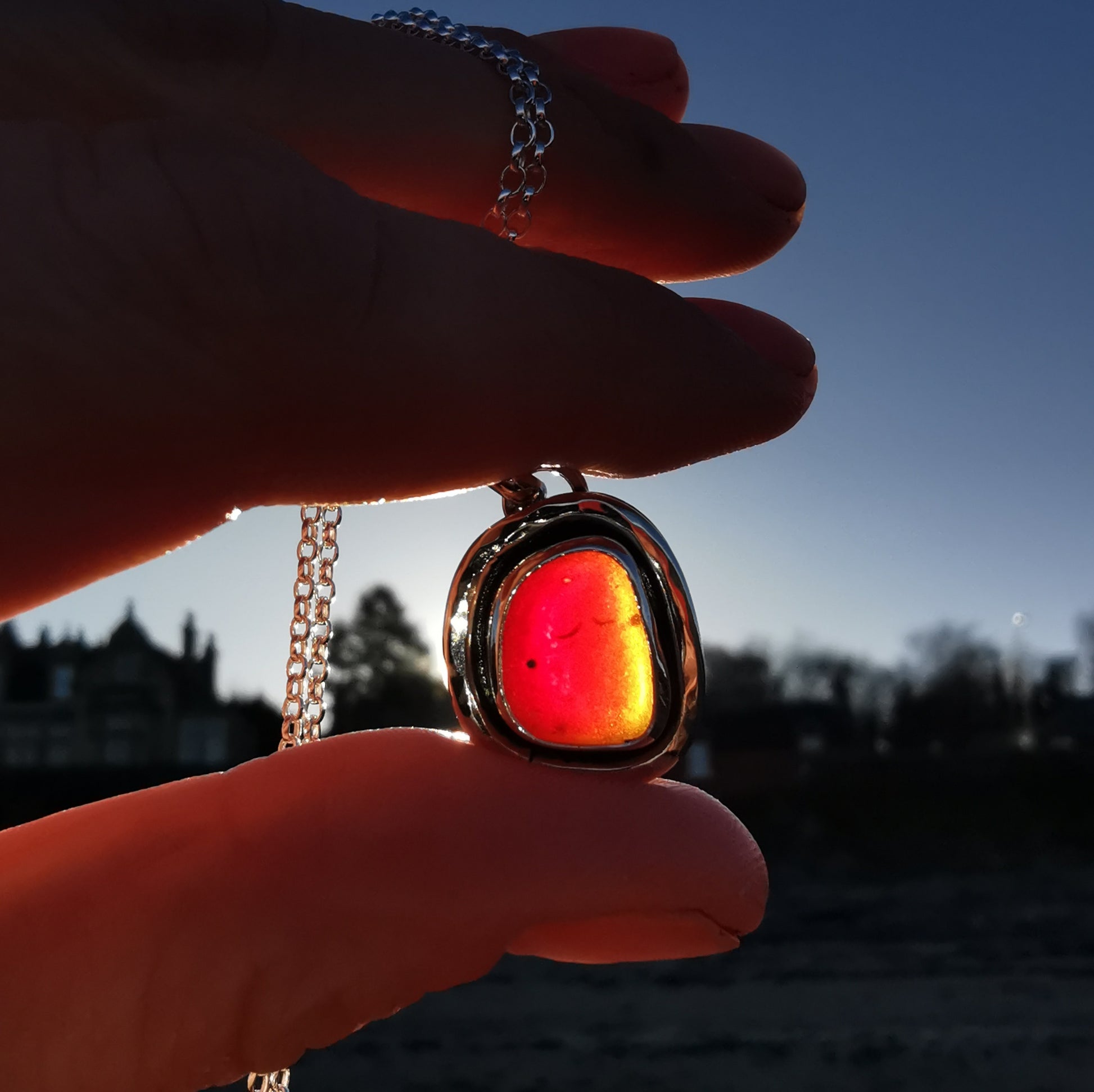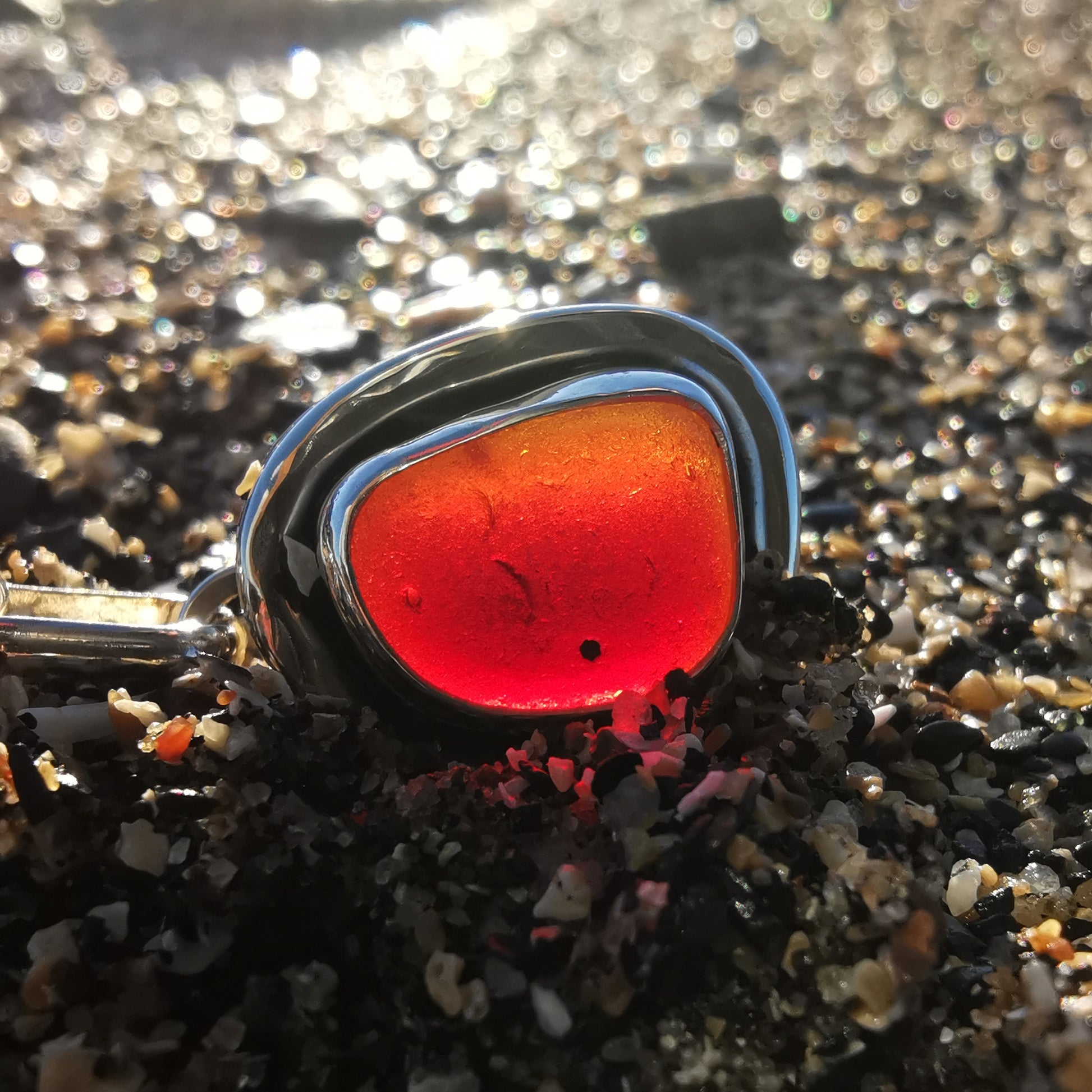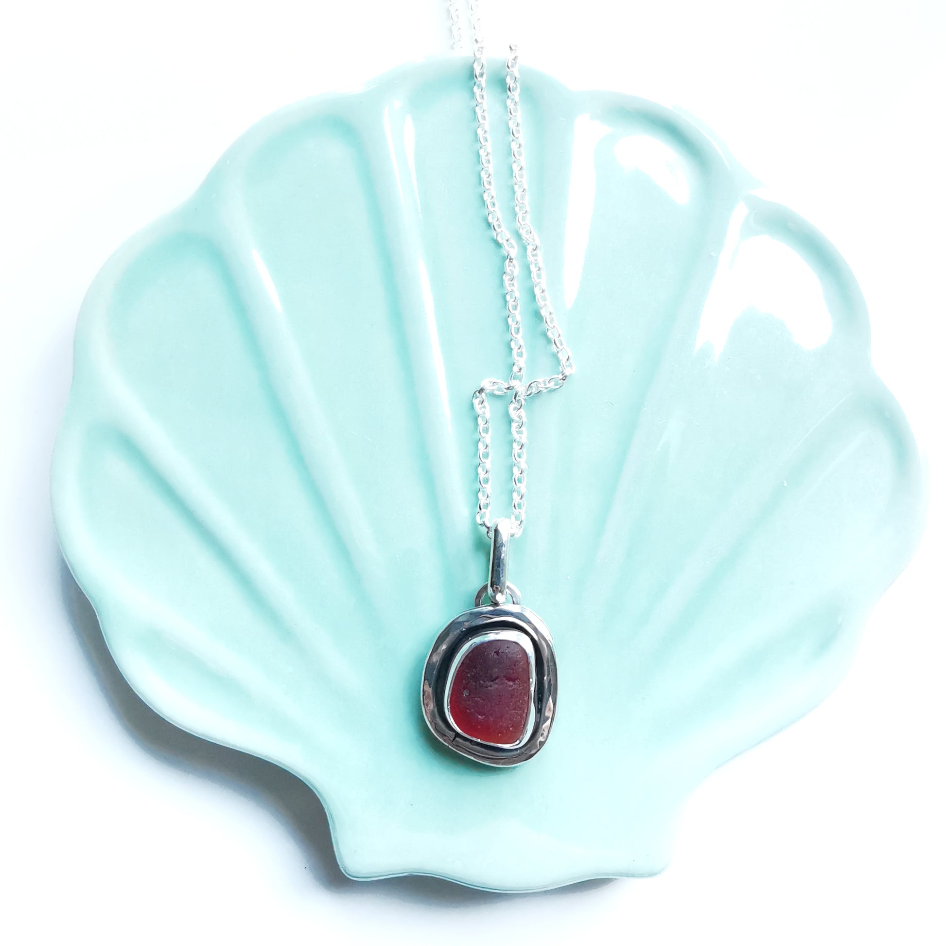 One of a kind pendant composed with genuine red amberina sea glass.The sea glass is set in fine silver backless bezel, the chain is sterling silver.