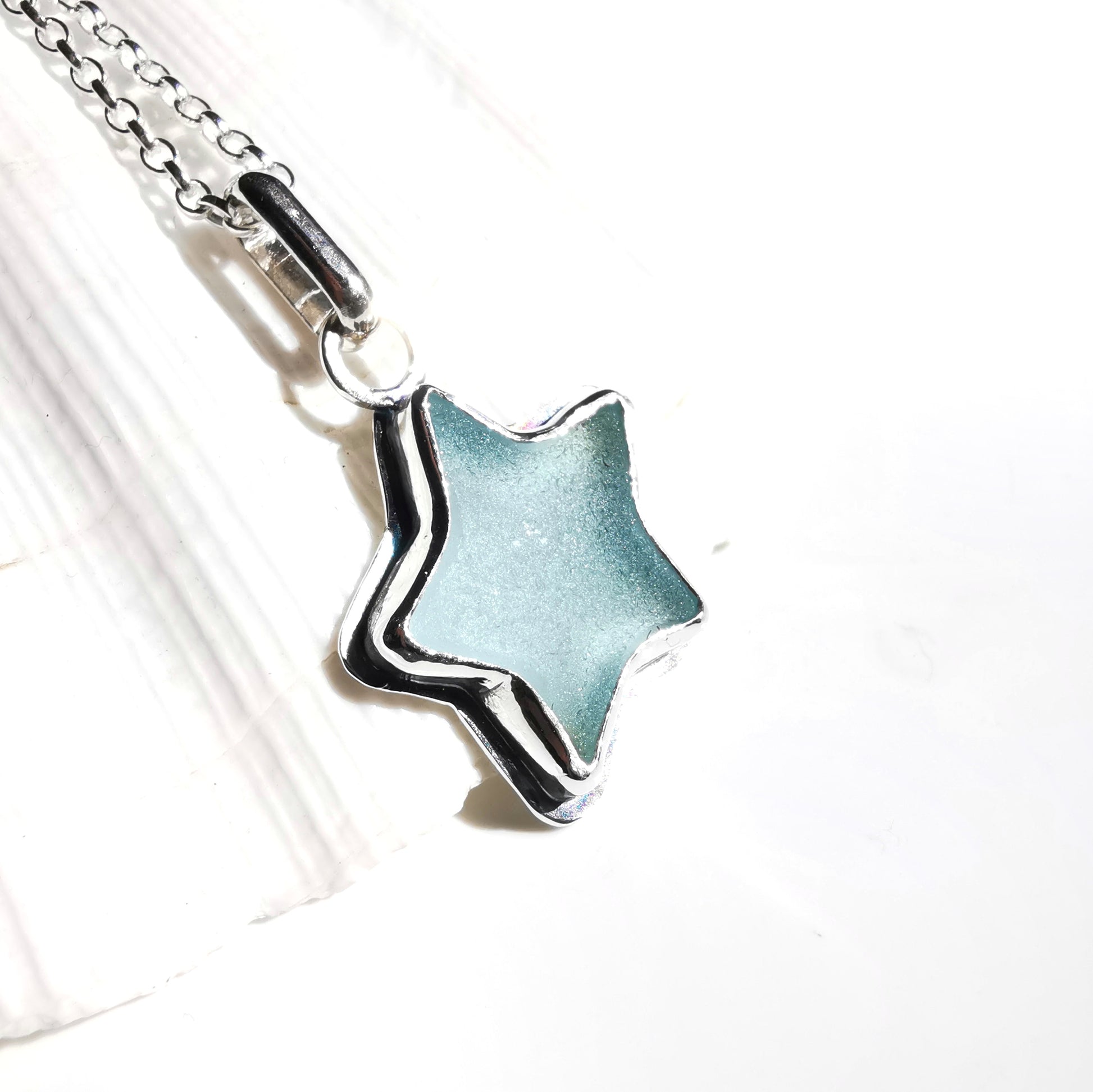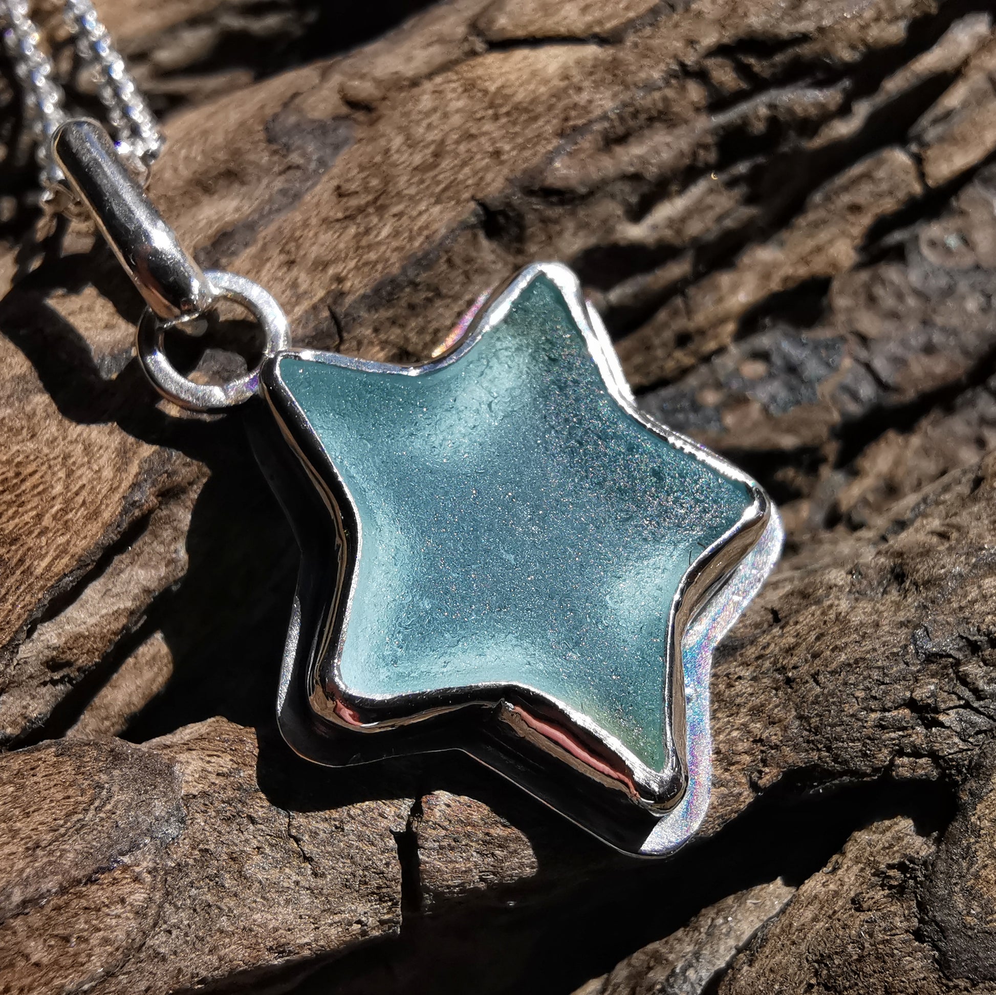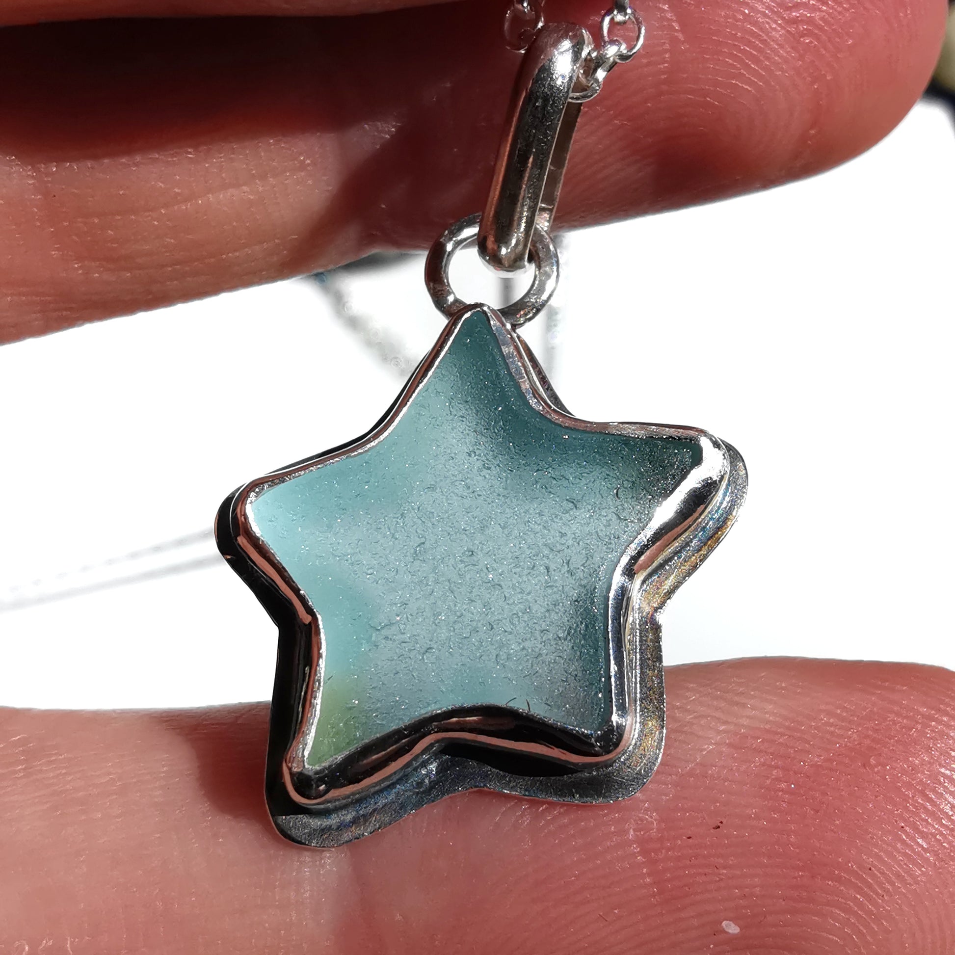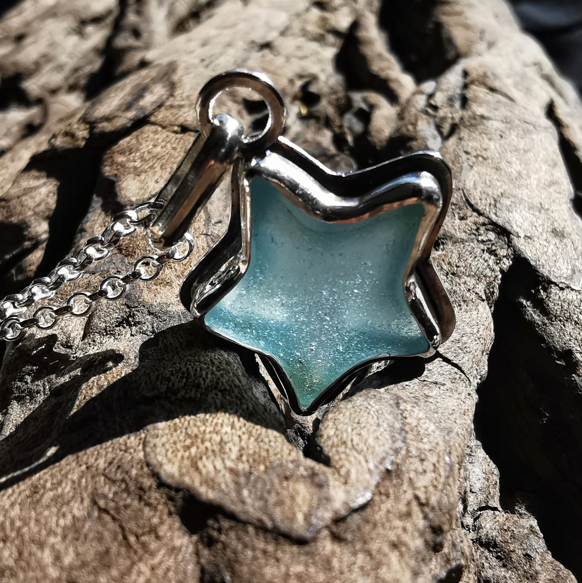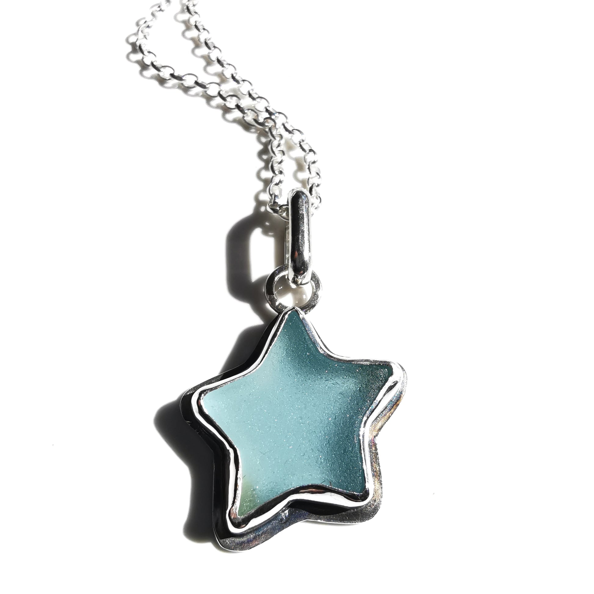 Reserved for Lesley. Scottish blue sea glass star & sterling silver pendant.
