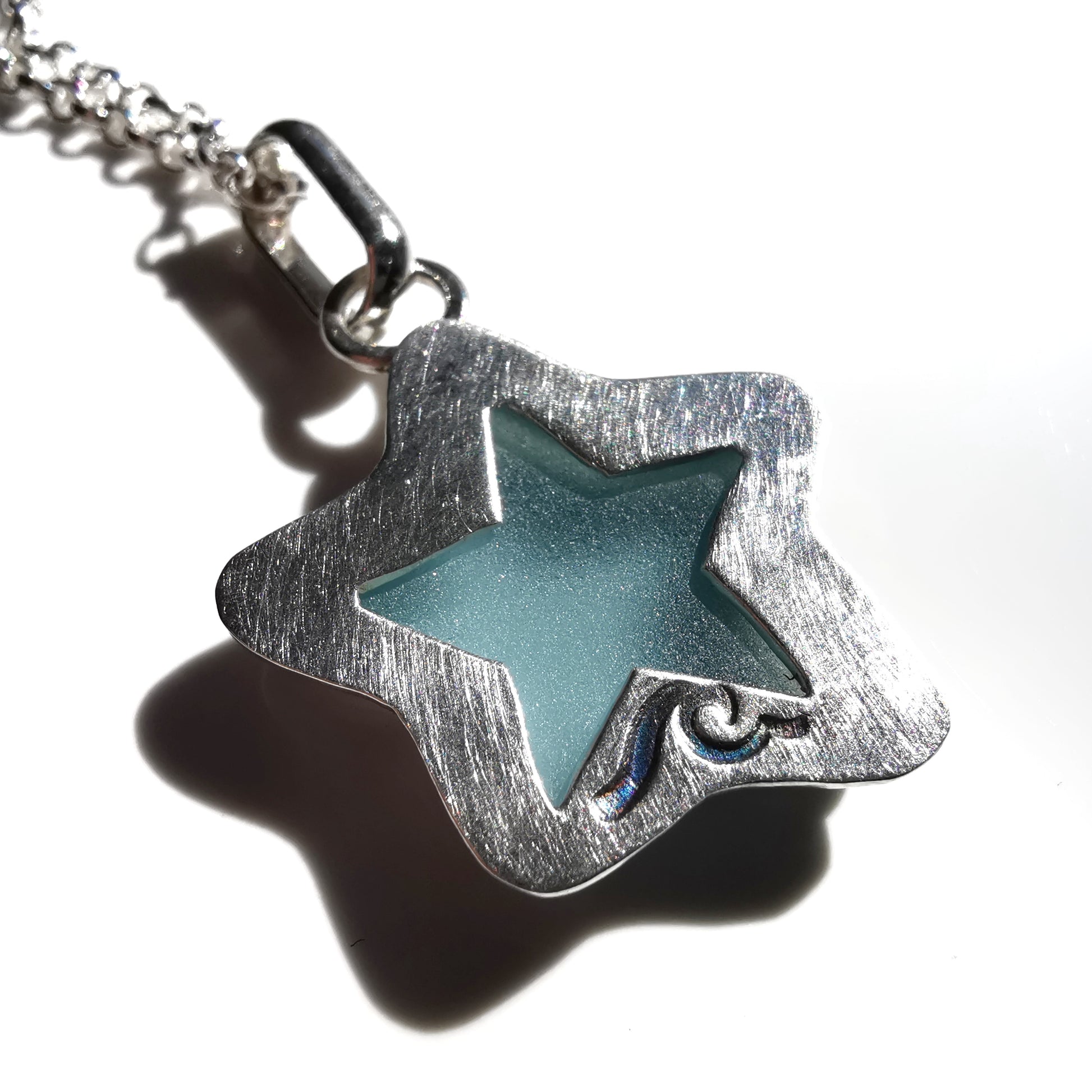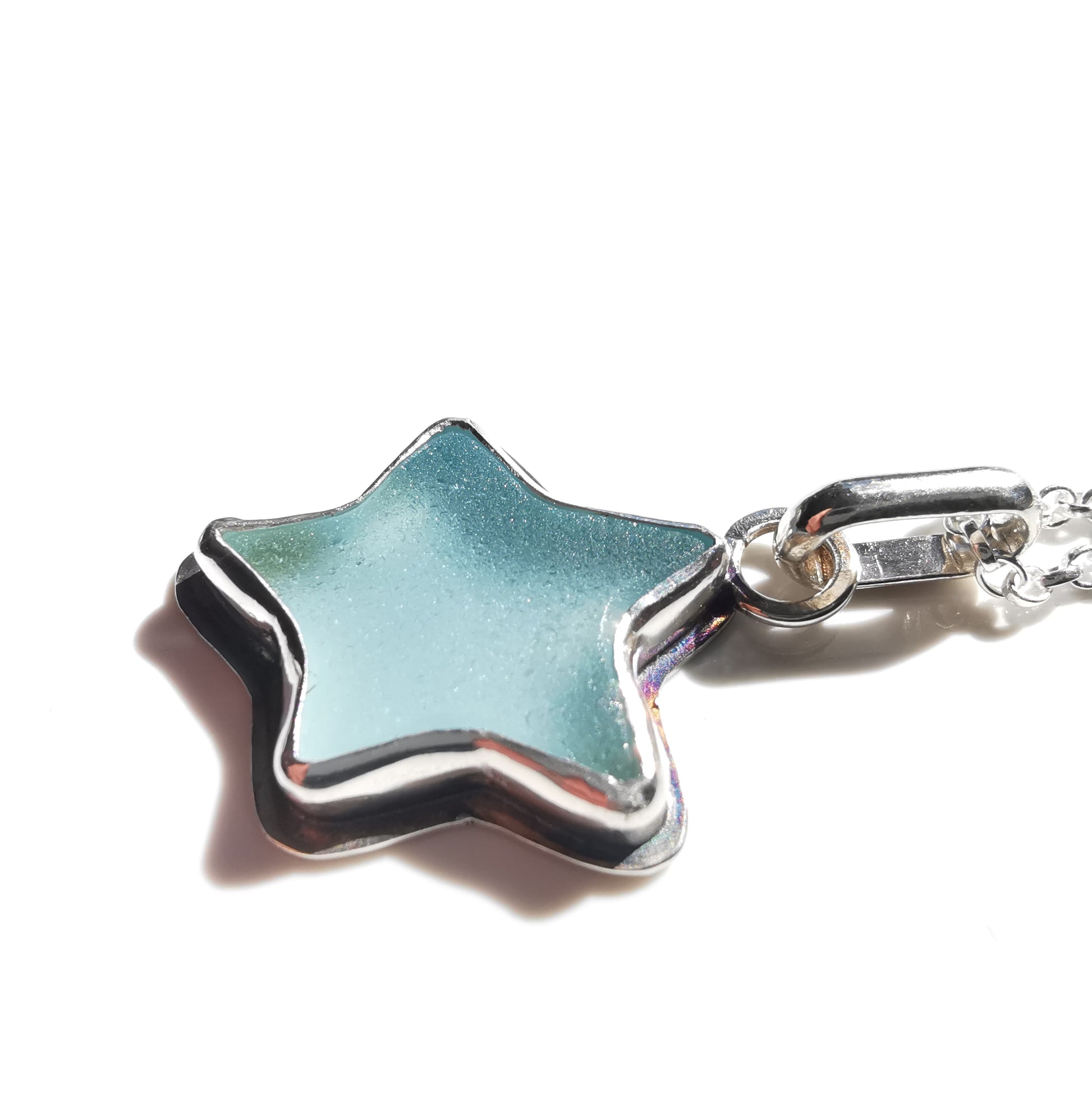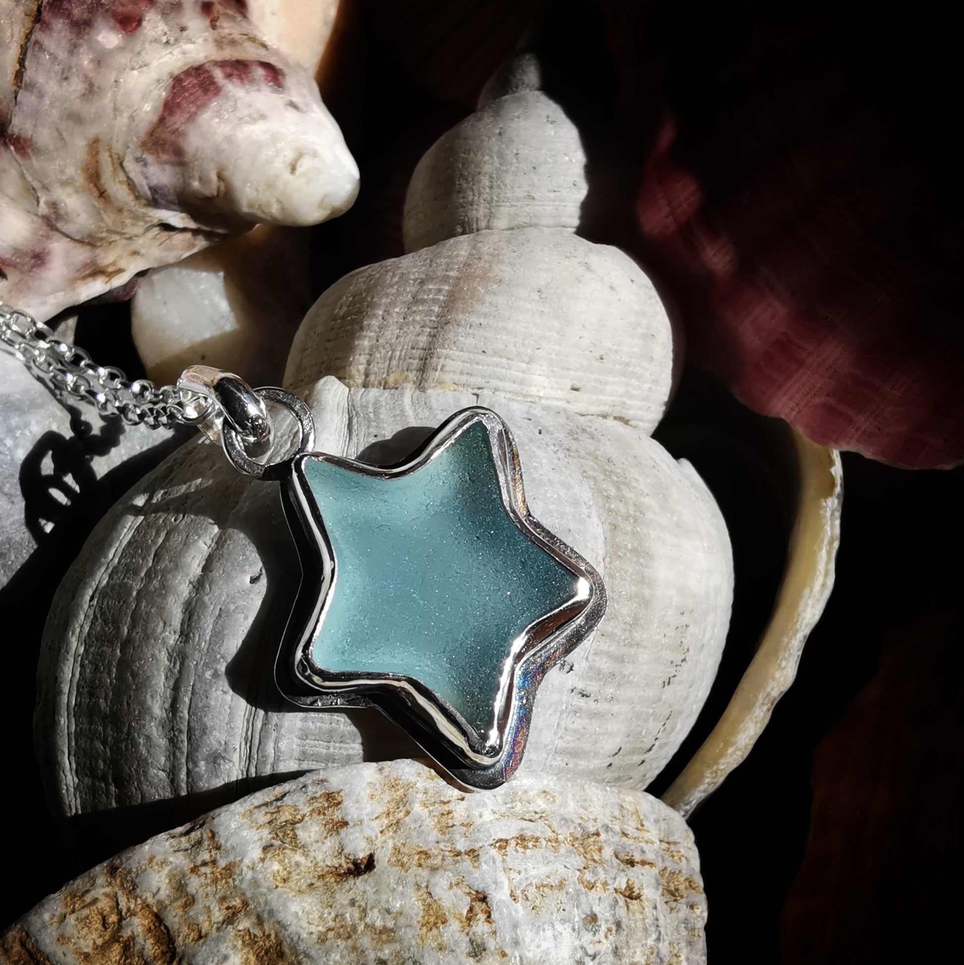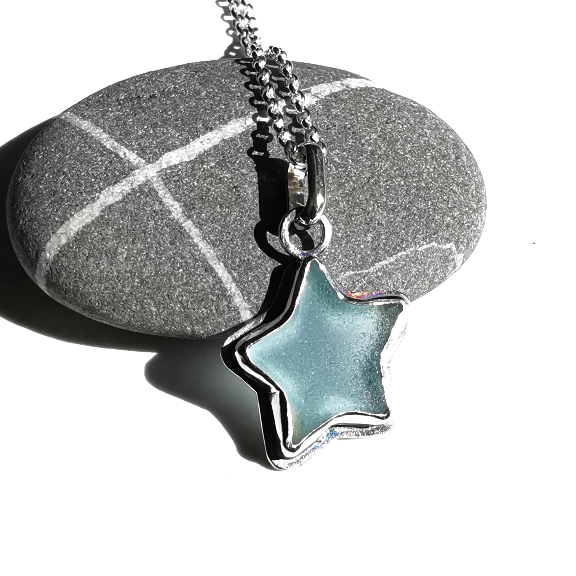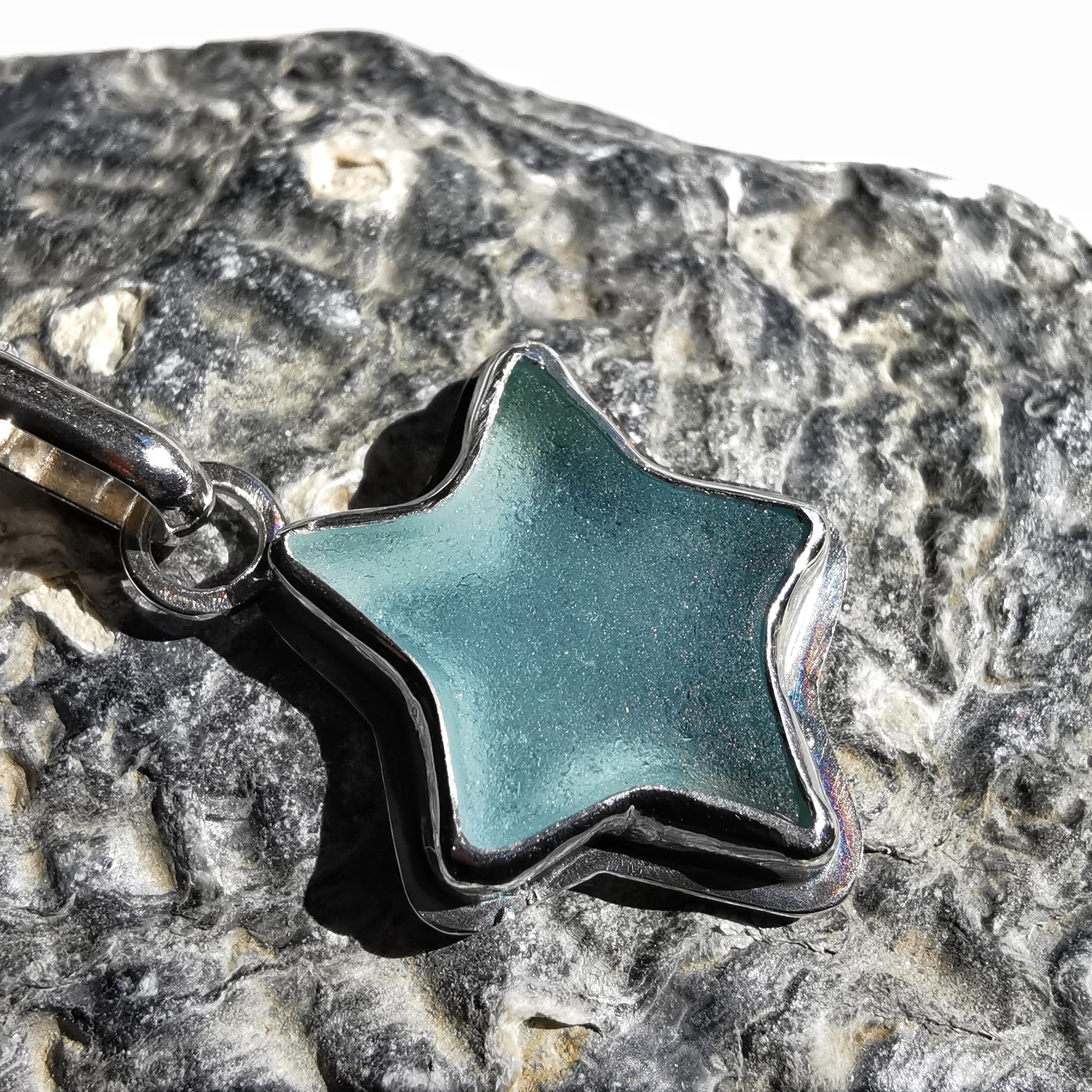 Reserved for Lesley. Scottish blue sea glass star & sterling silver pendant.