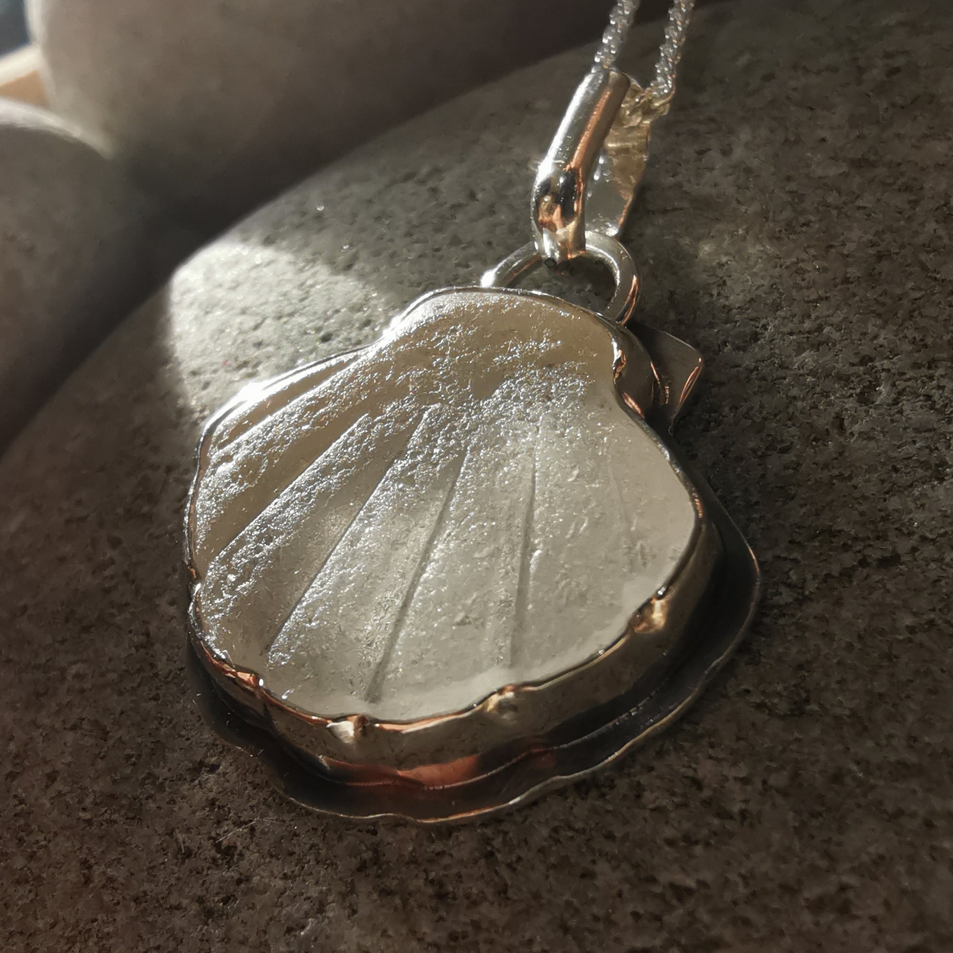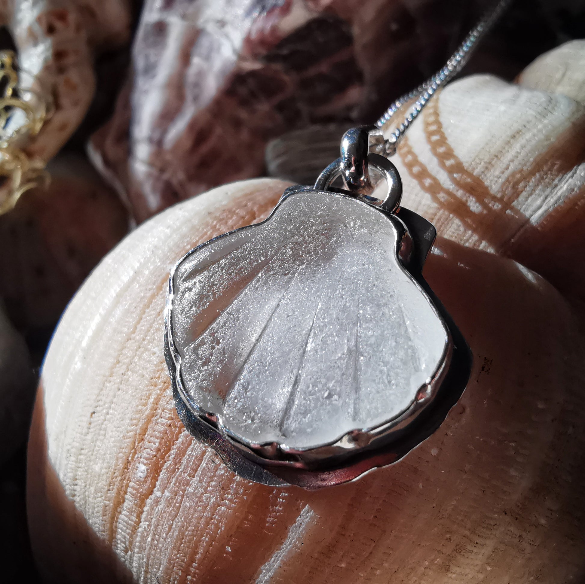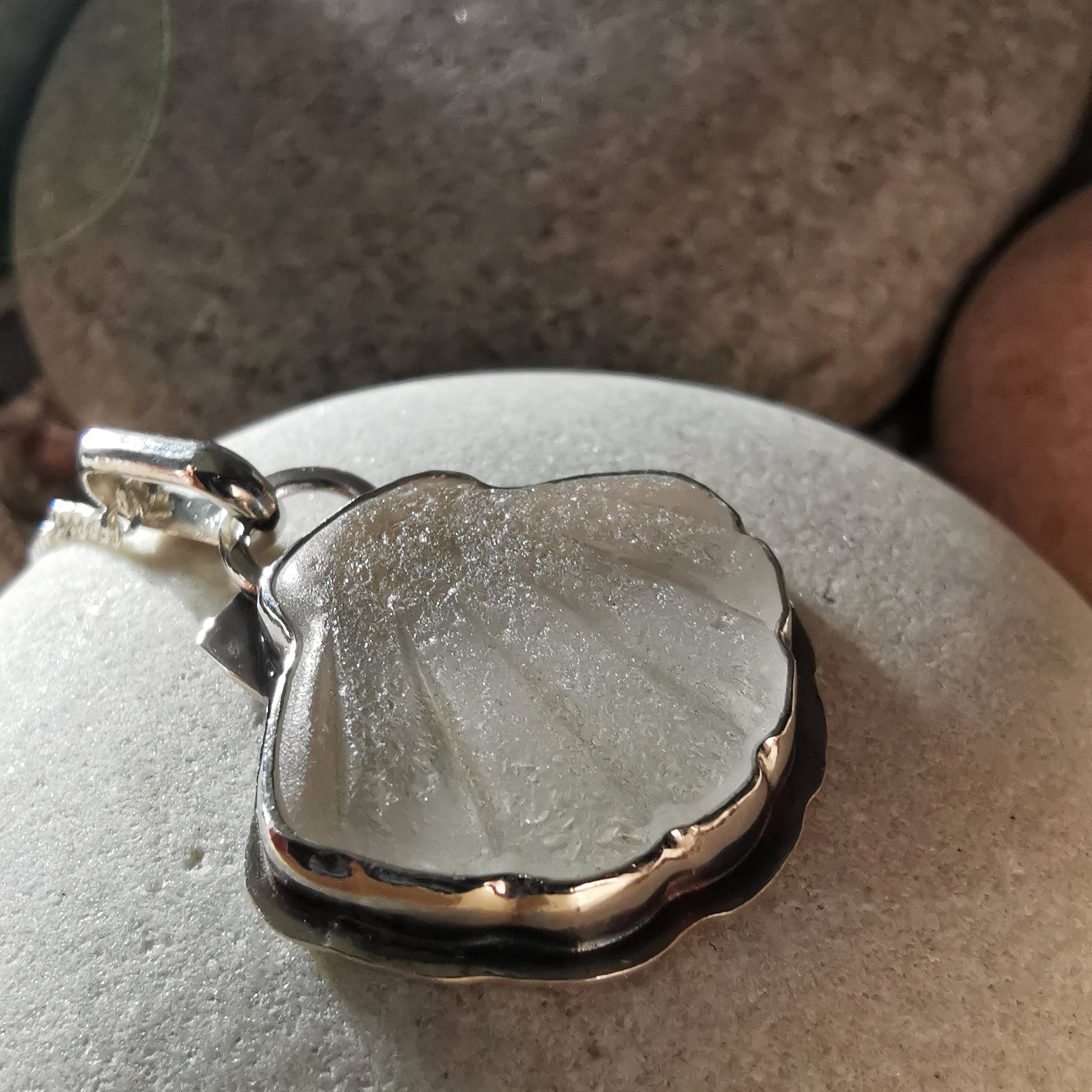 One of a kind pendant composed with clear sea glass shaped as a scallop shell, found by me in Edinburgh.