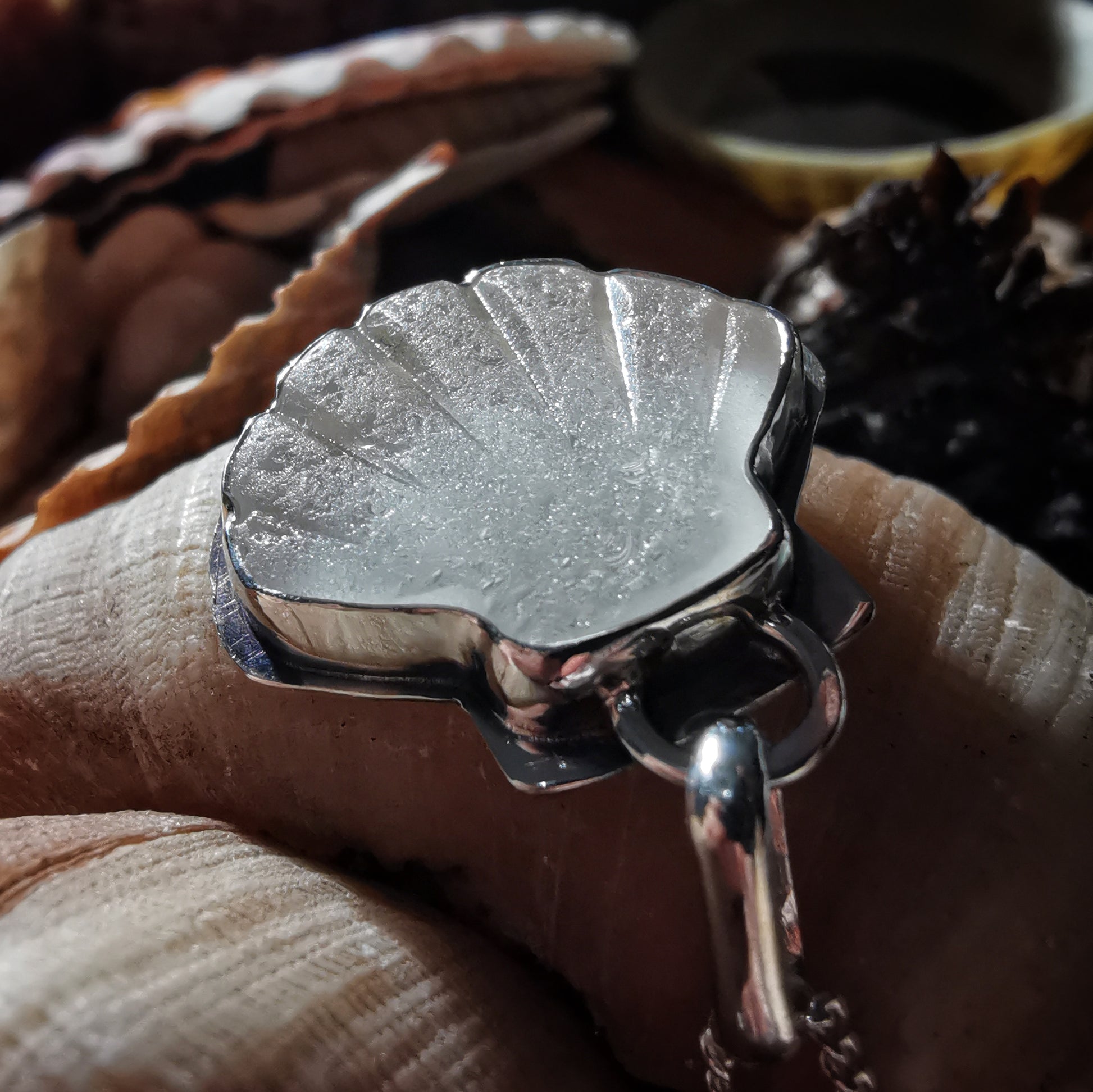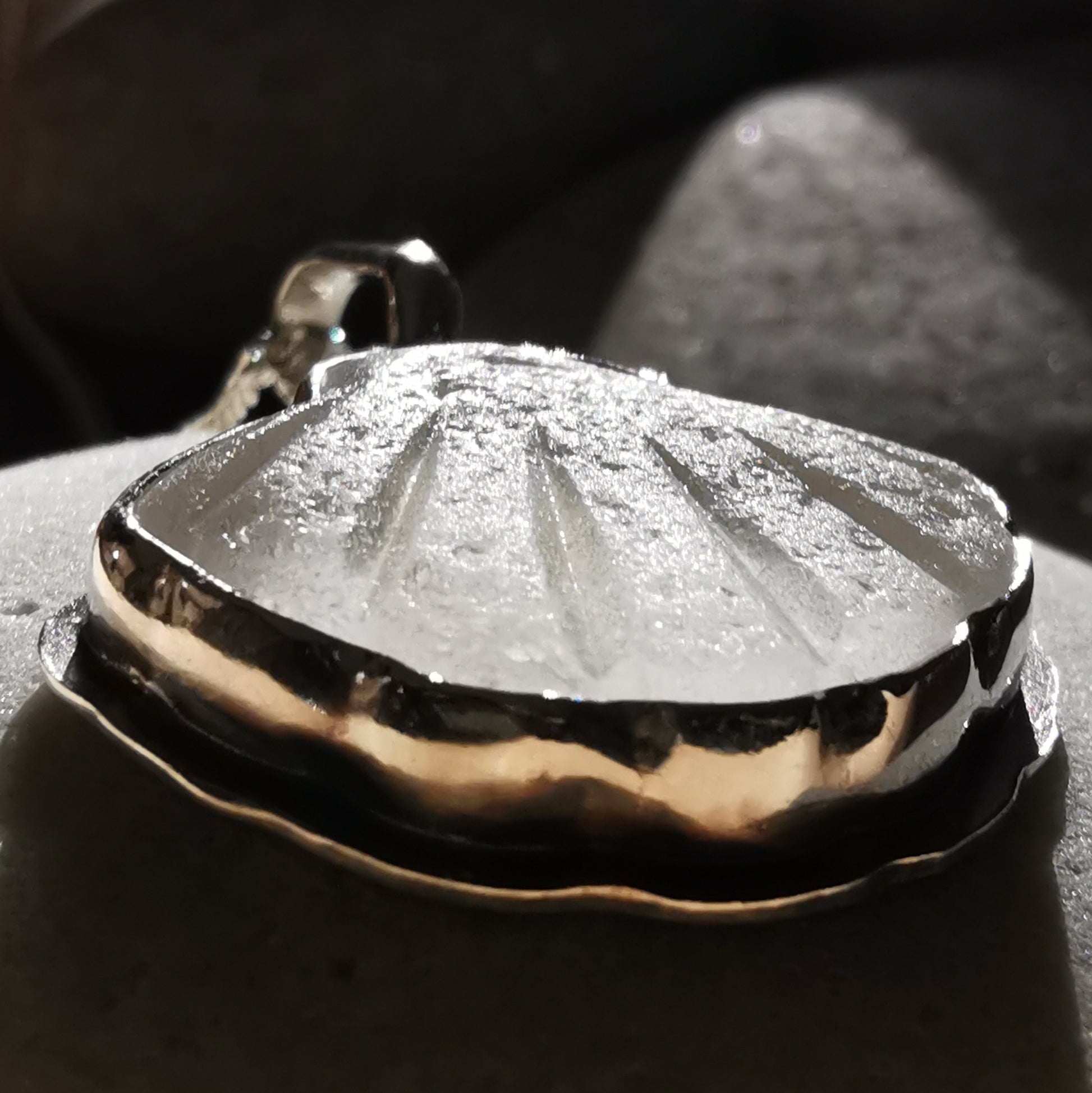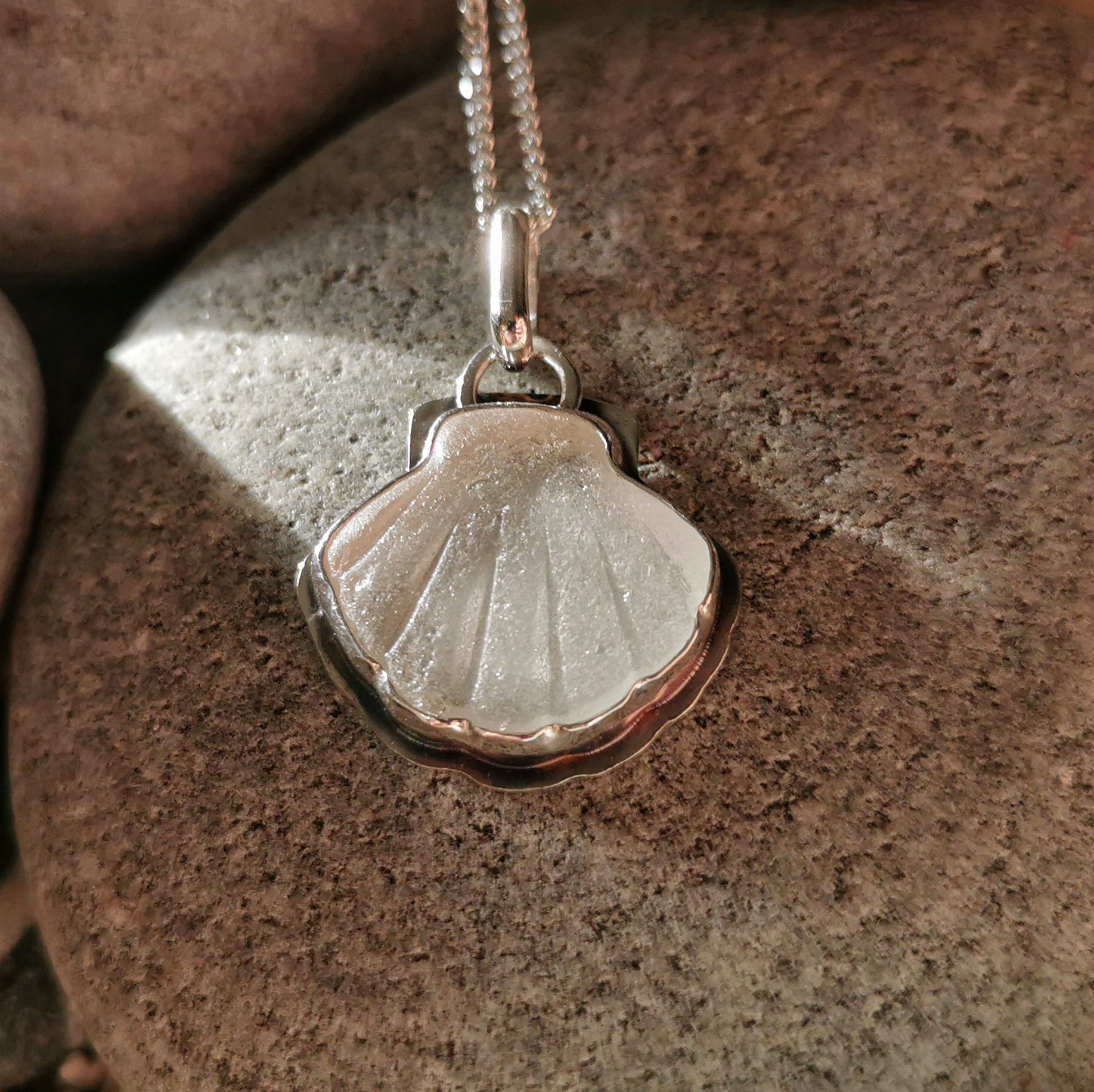 One of a kind pendant composed with clear sea glass shaped as a scallop shell, found by me in Edinburgh.