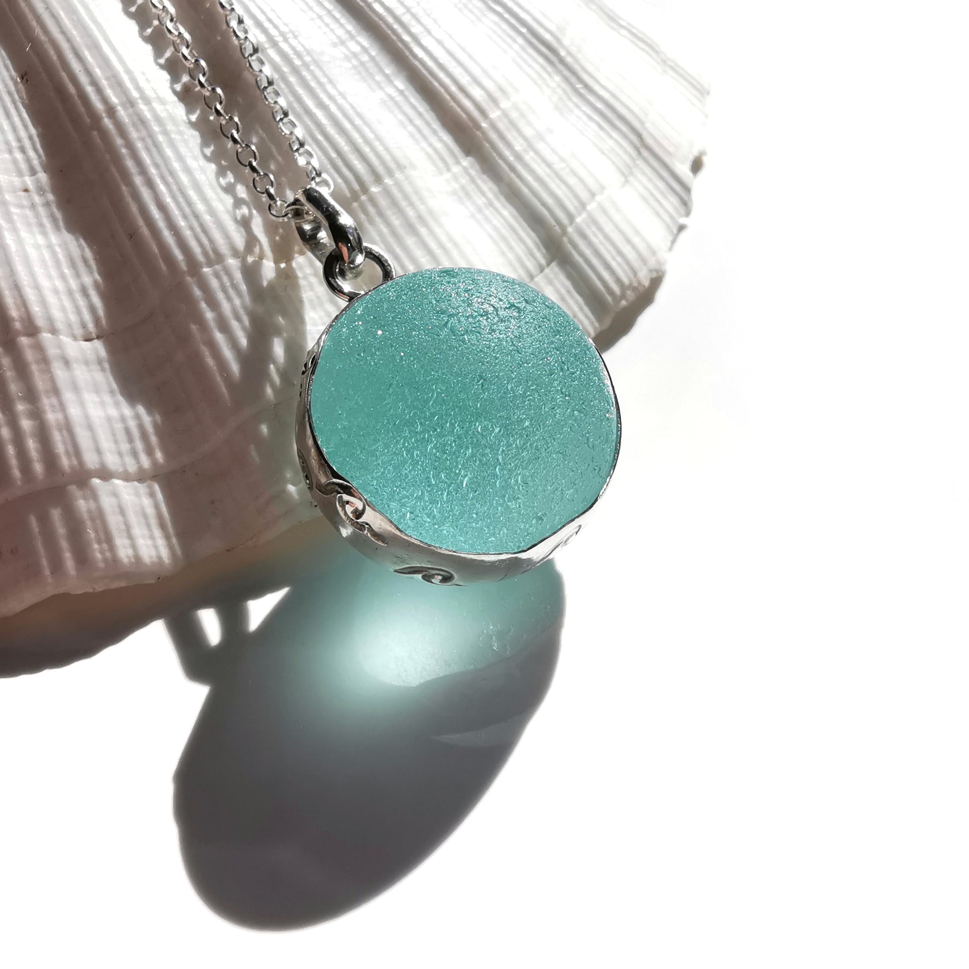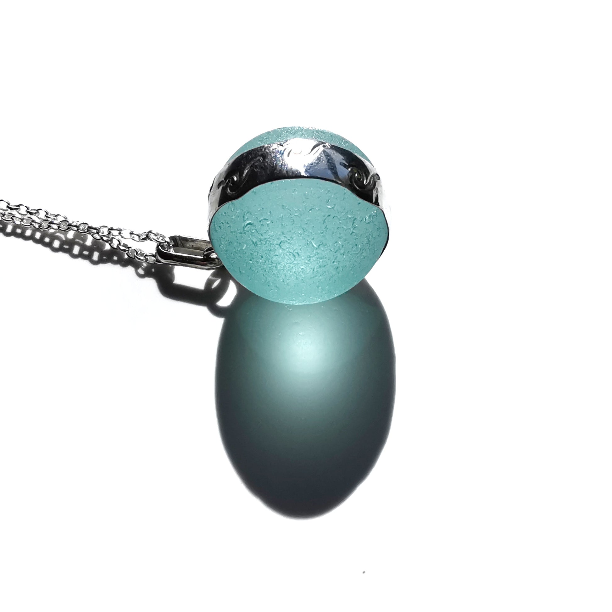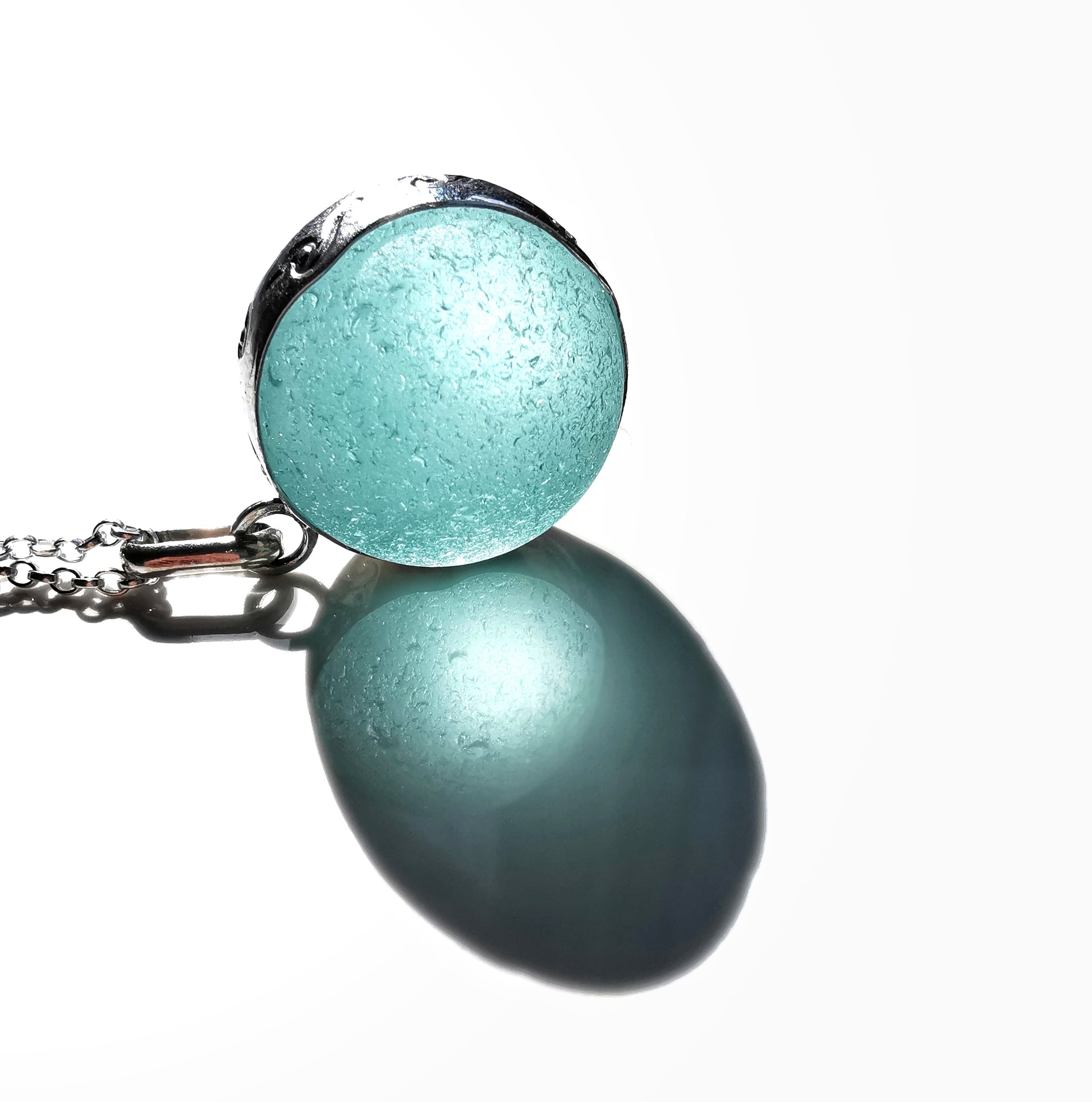 One of a kind pendant composed with genuine frosted Codd sea glass marble, found by myself on a beach in Edinburgh. The marble is set in fine silver bezel, the chain is sterling silver. Marble can spin in the bezel, this is normal and it's not a fault.