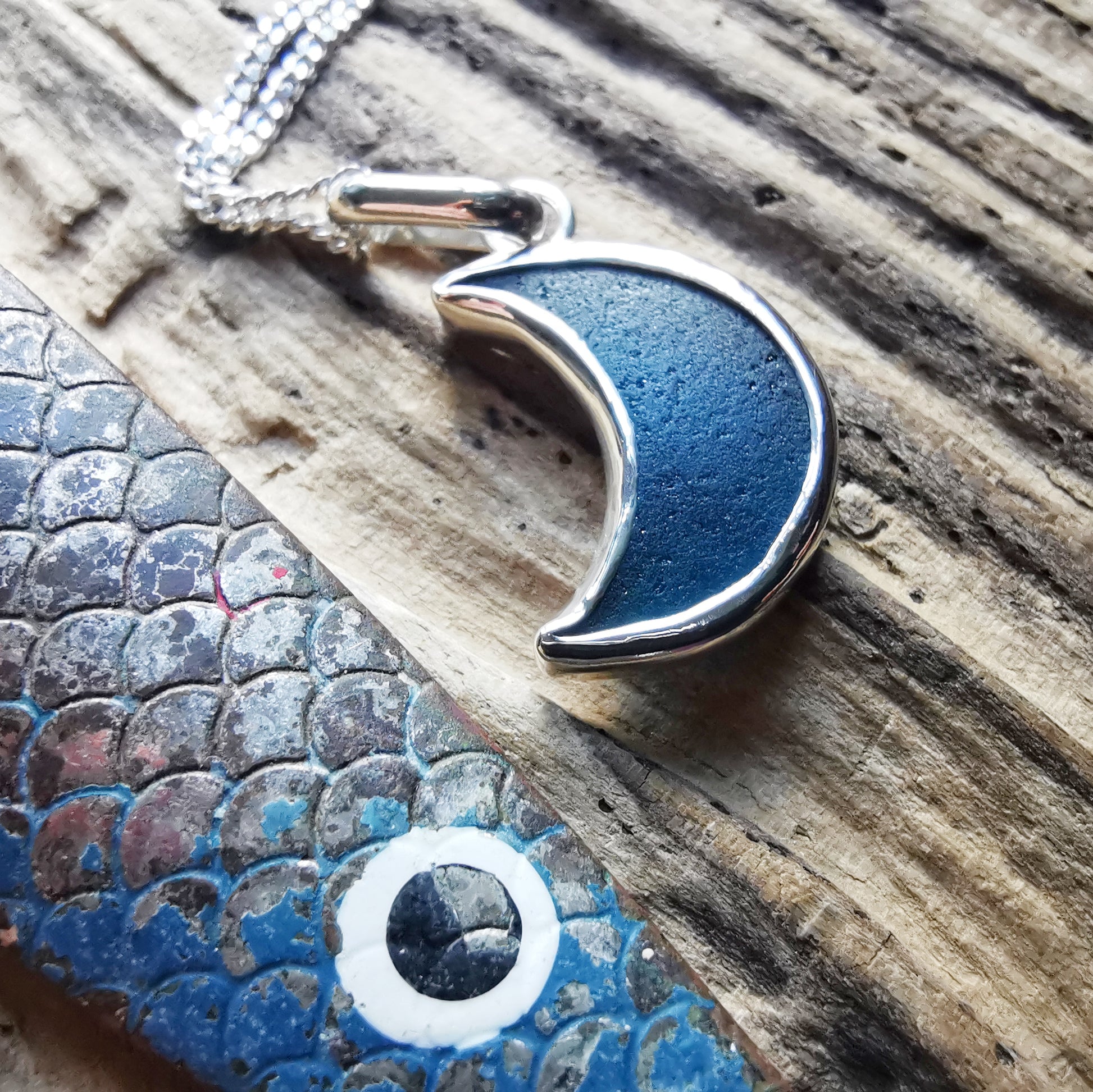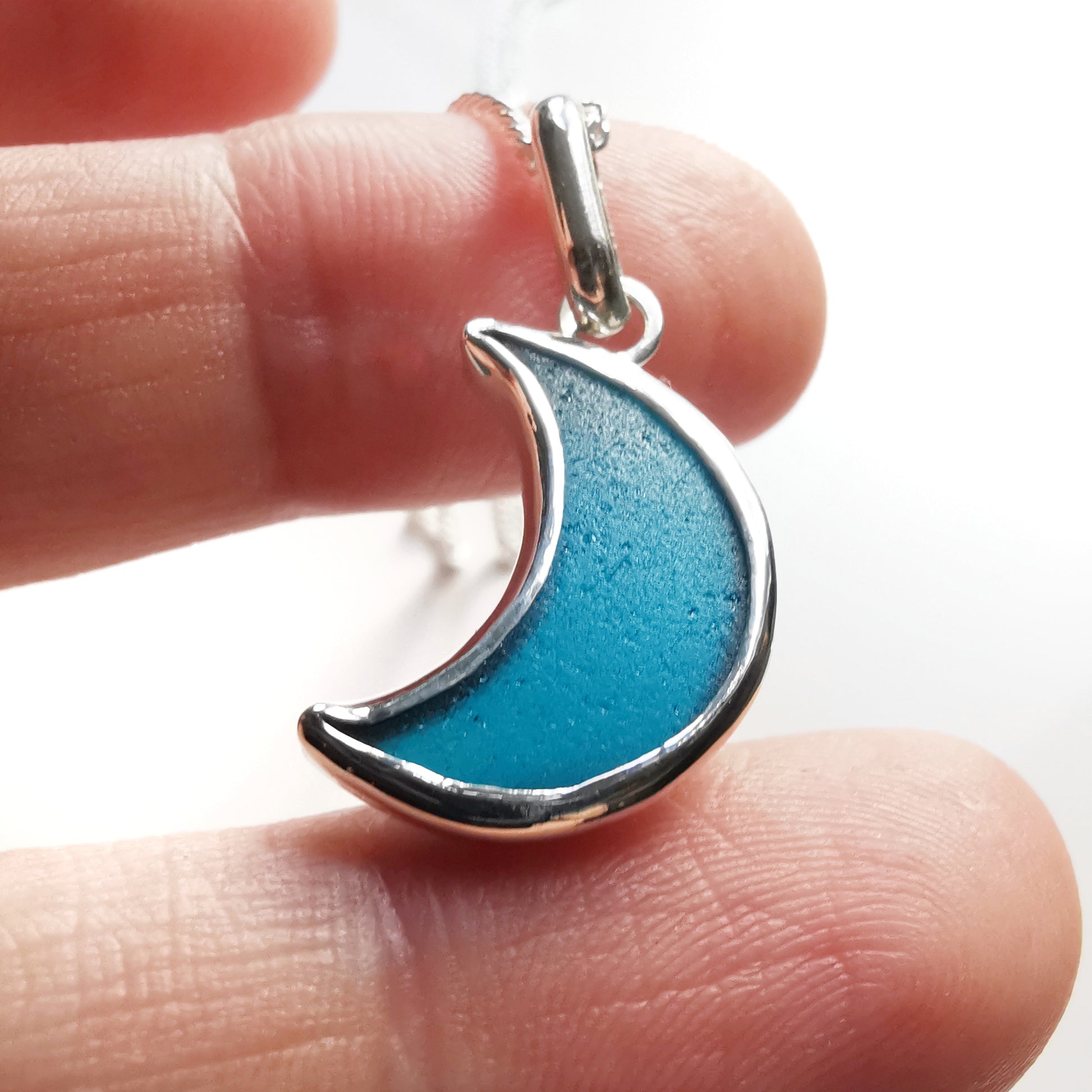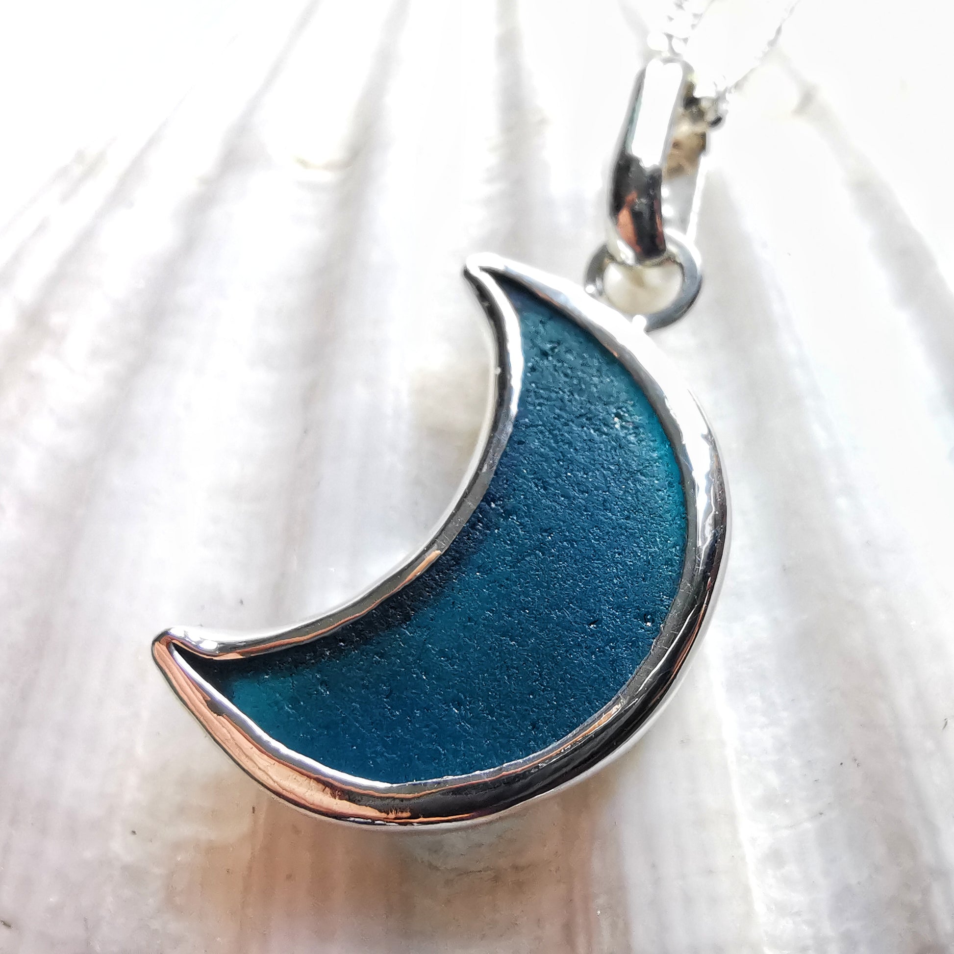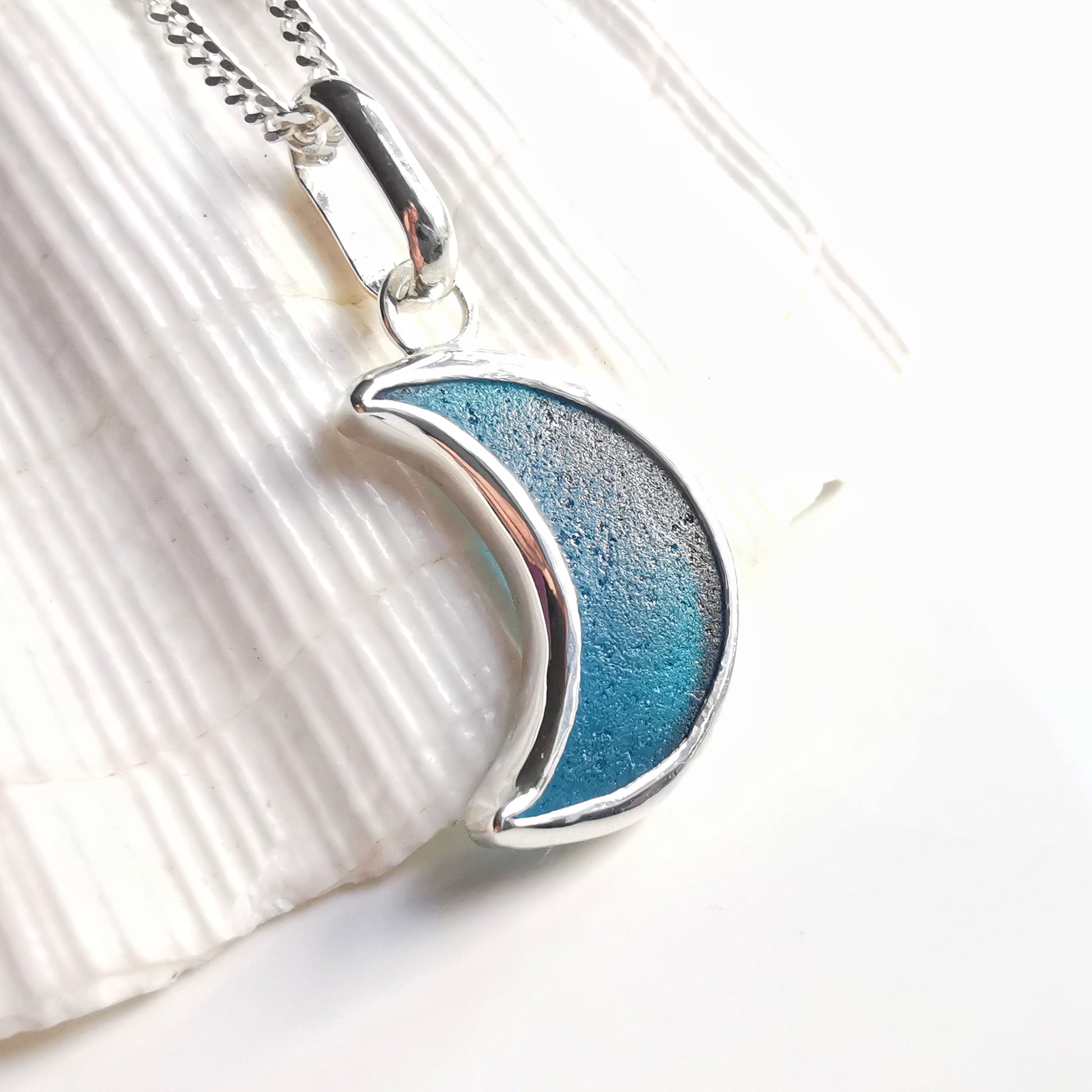 Reserved. Scottish teal blue crescent moon sea glass & sterling silver pendant.