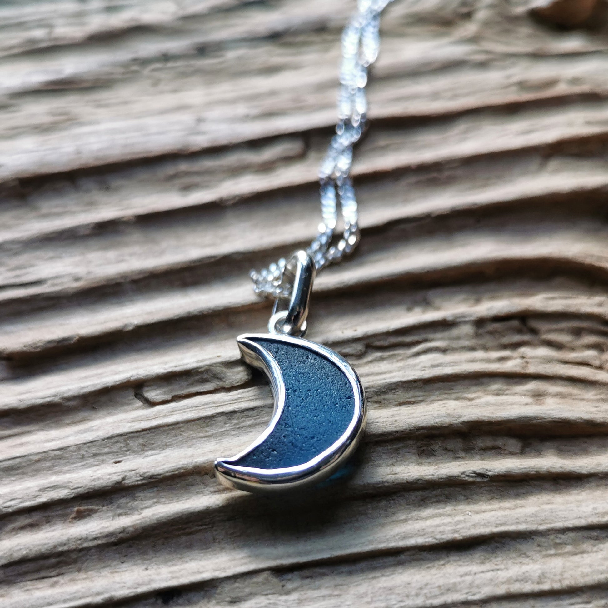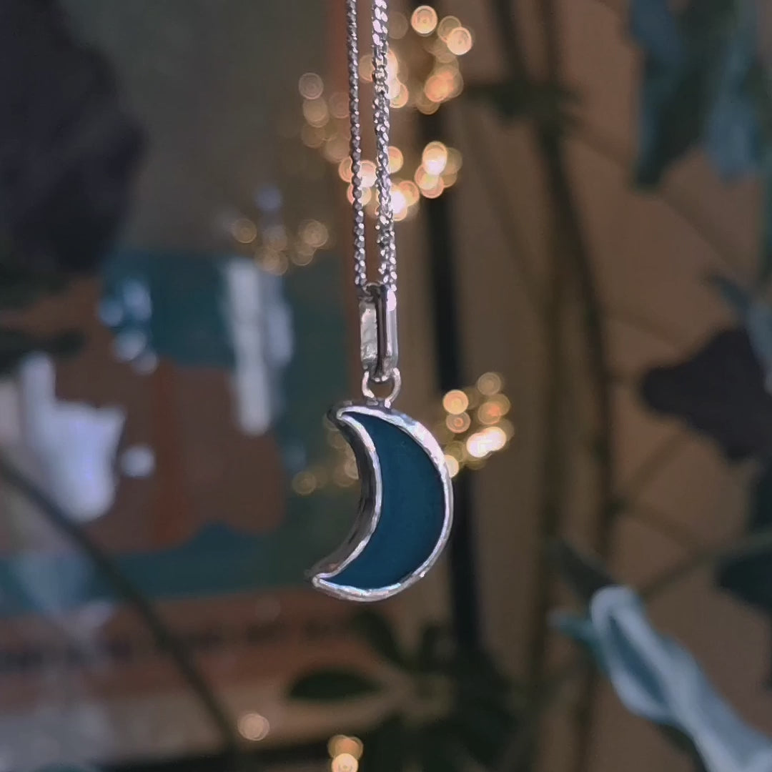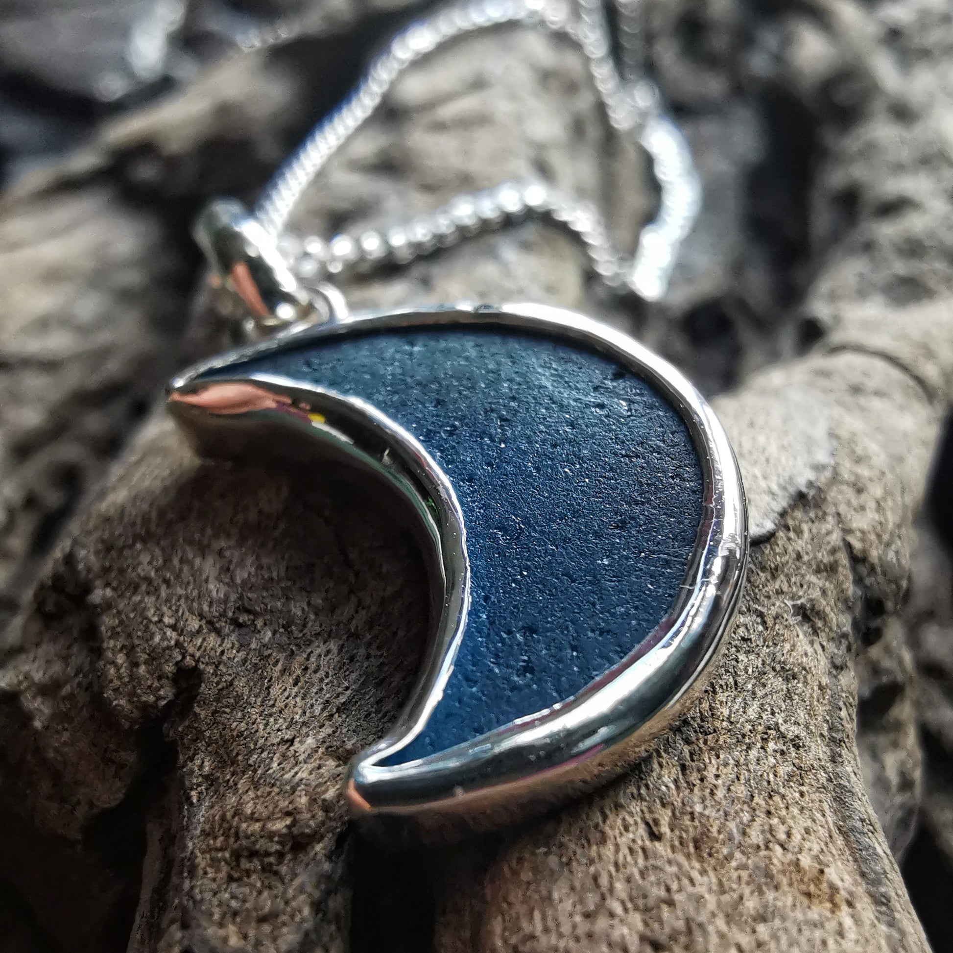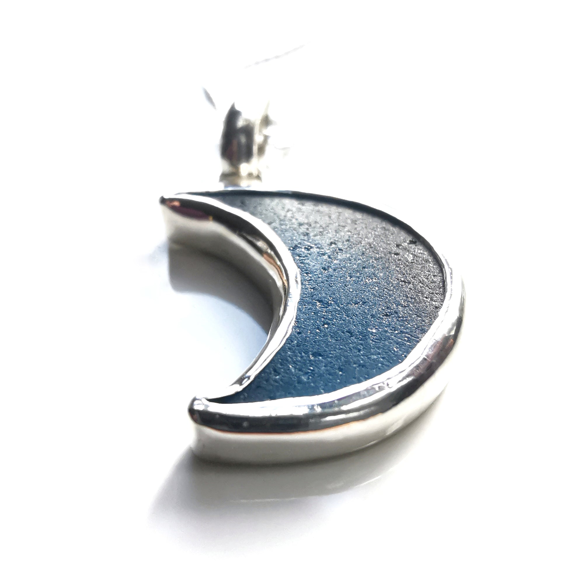 Reserved. Scottish teal blue crescent moon sea glass & sterling silver pendant.