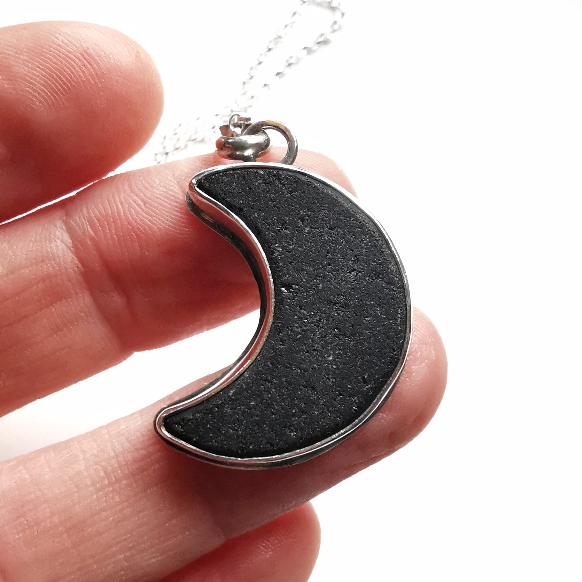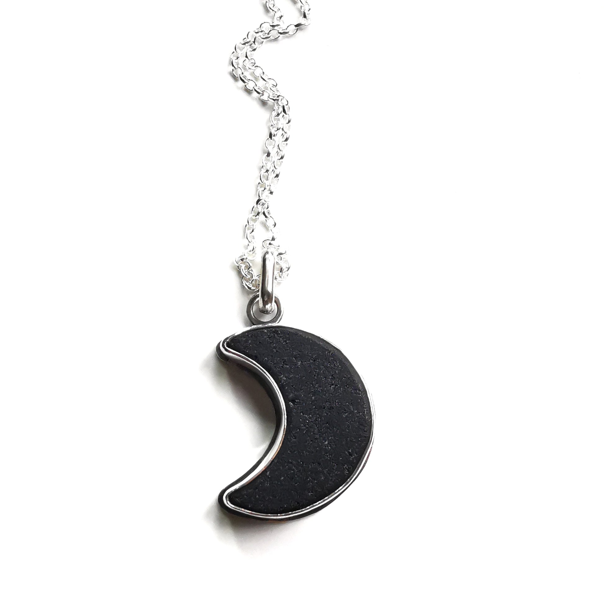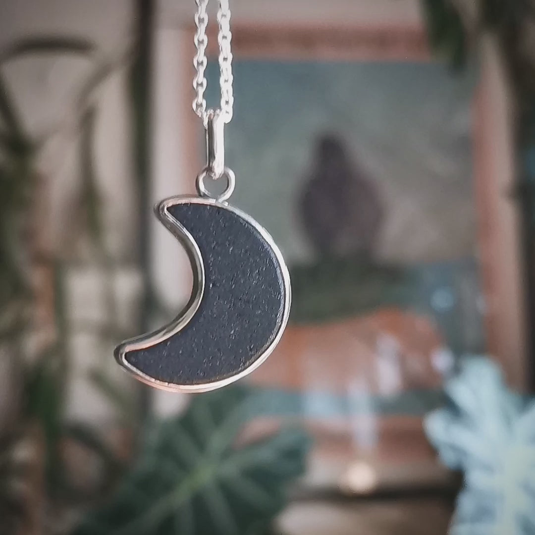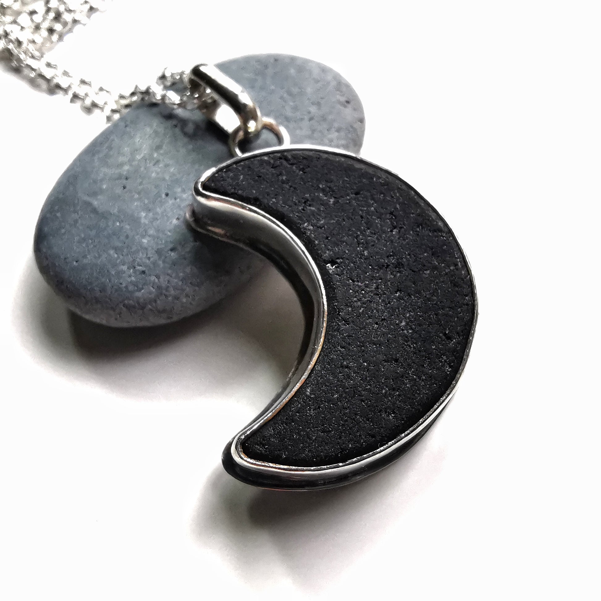 Scottish black crescent moon sea glass & sterling silver pendant.