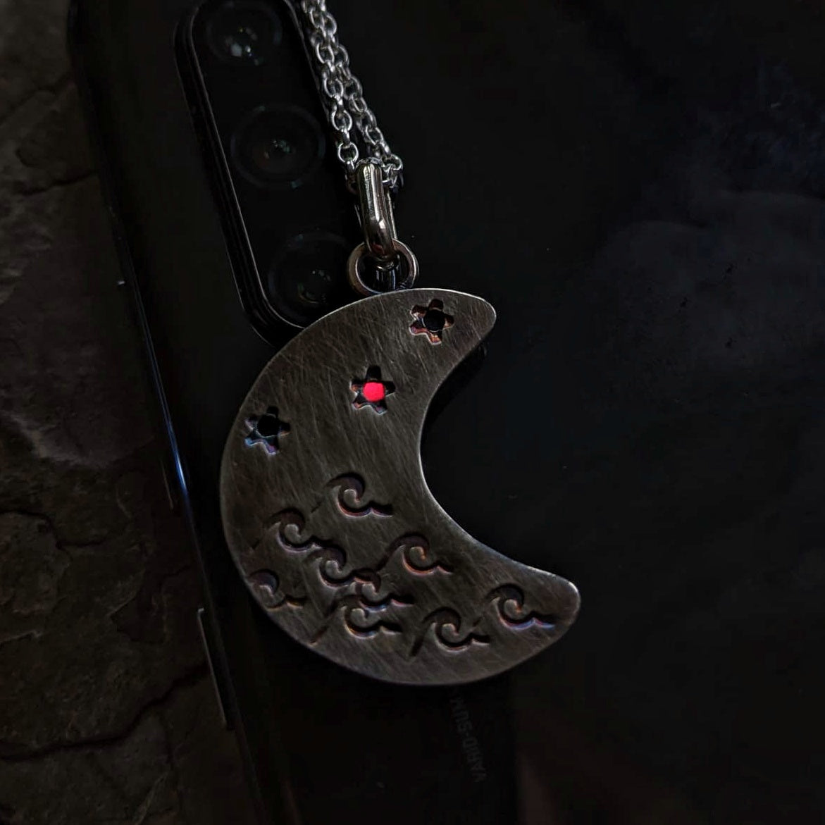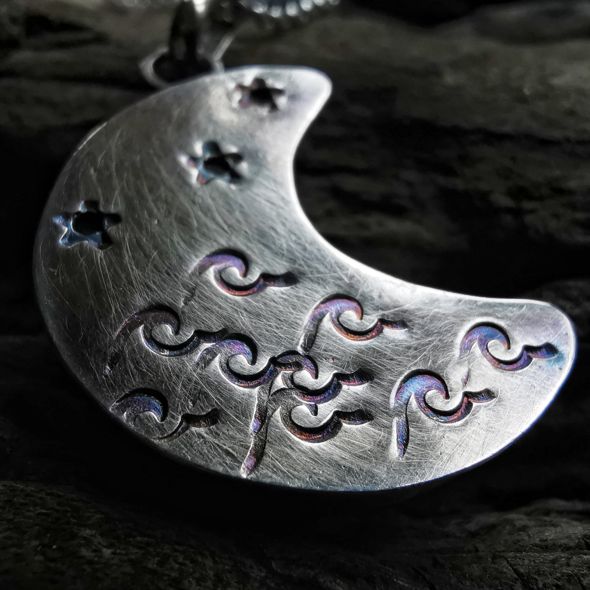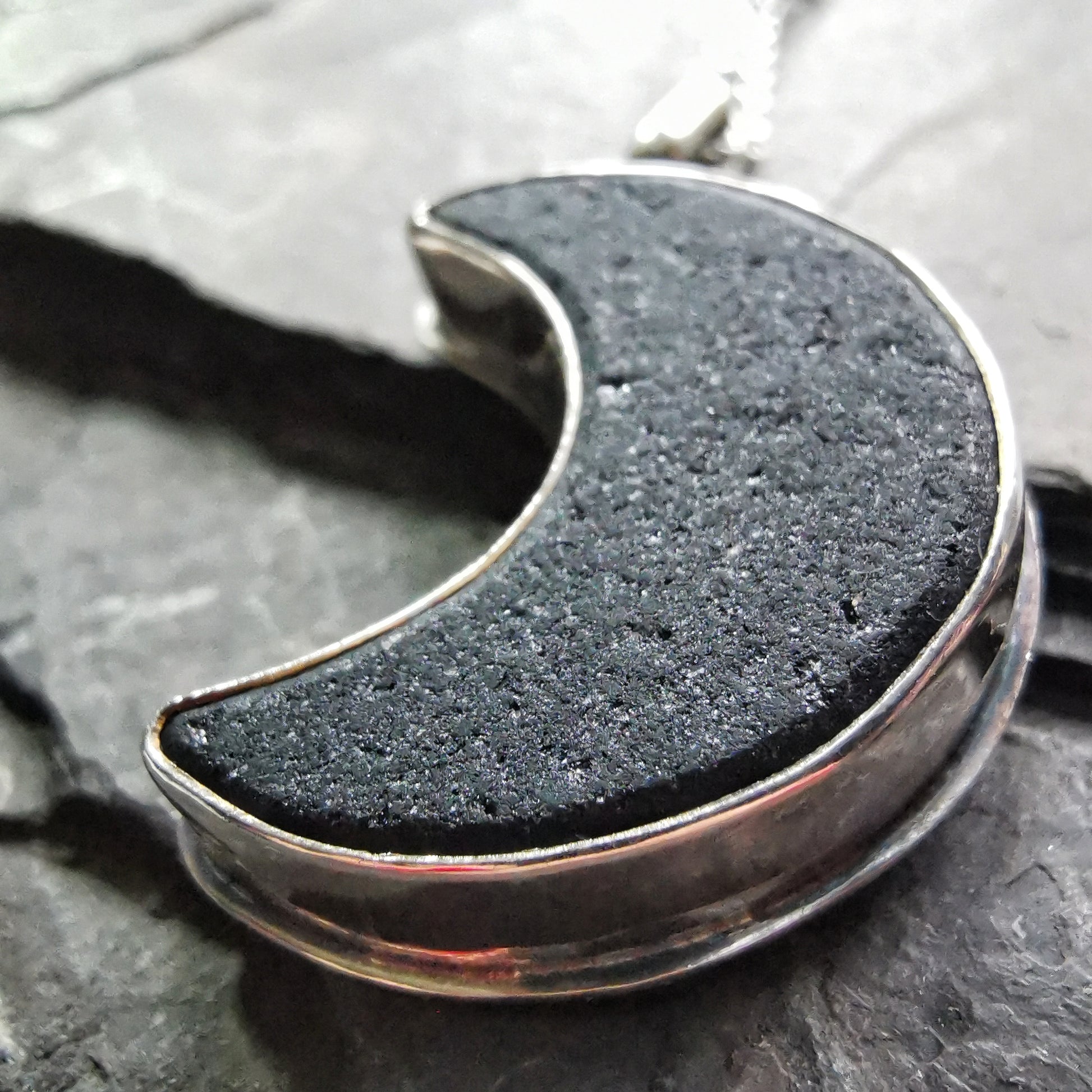 Scottish black crescent moon sea glass & sterling silver pendant.