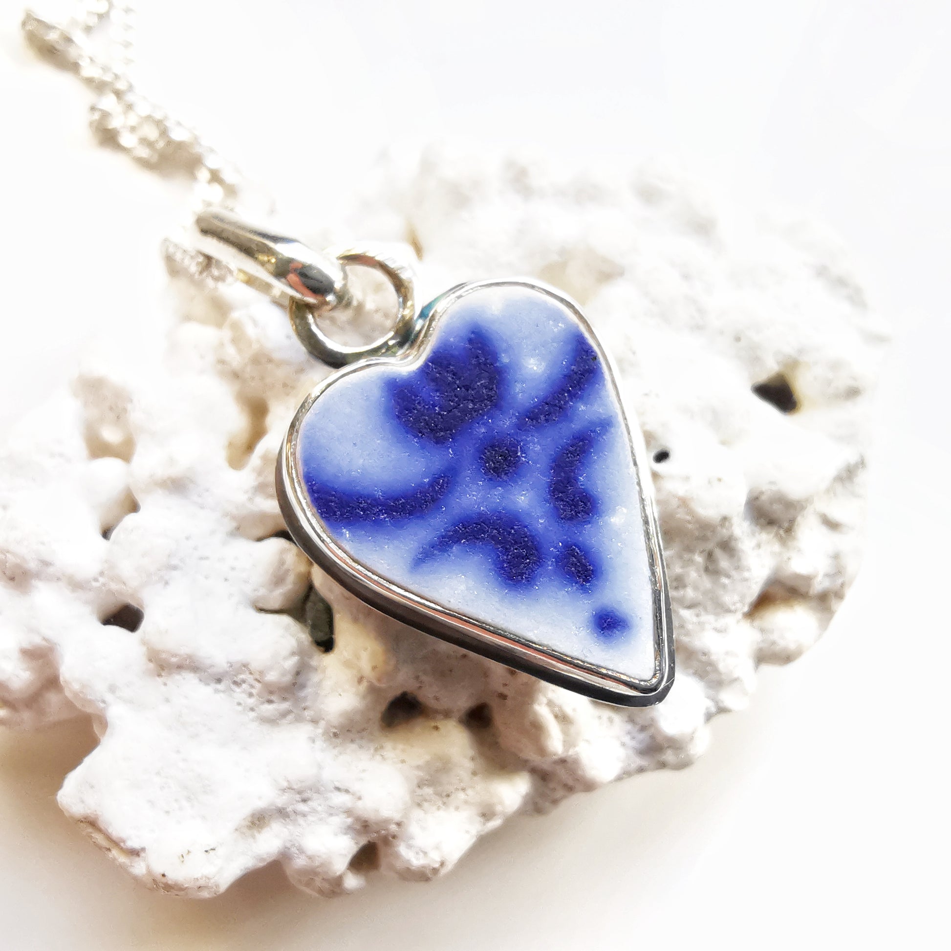 Scottish blue and white sea pottery heart & sterling silver pendant.