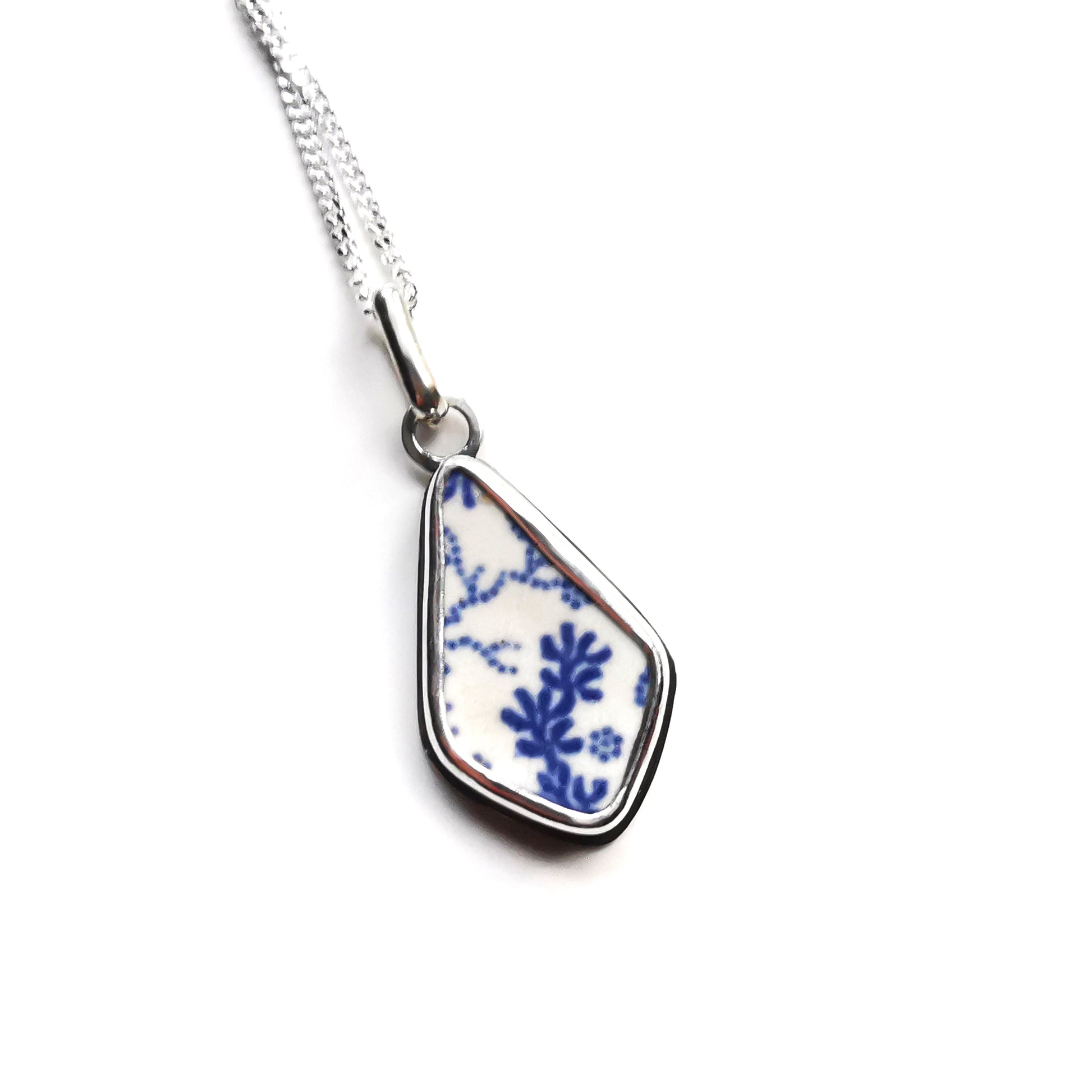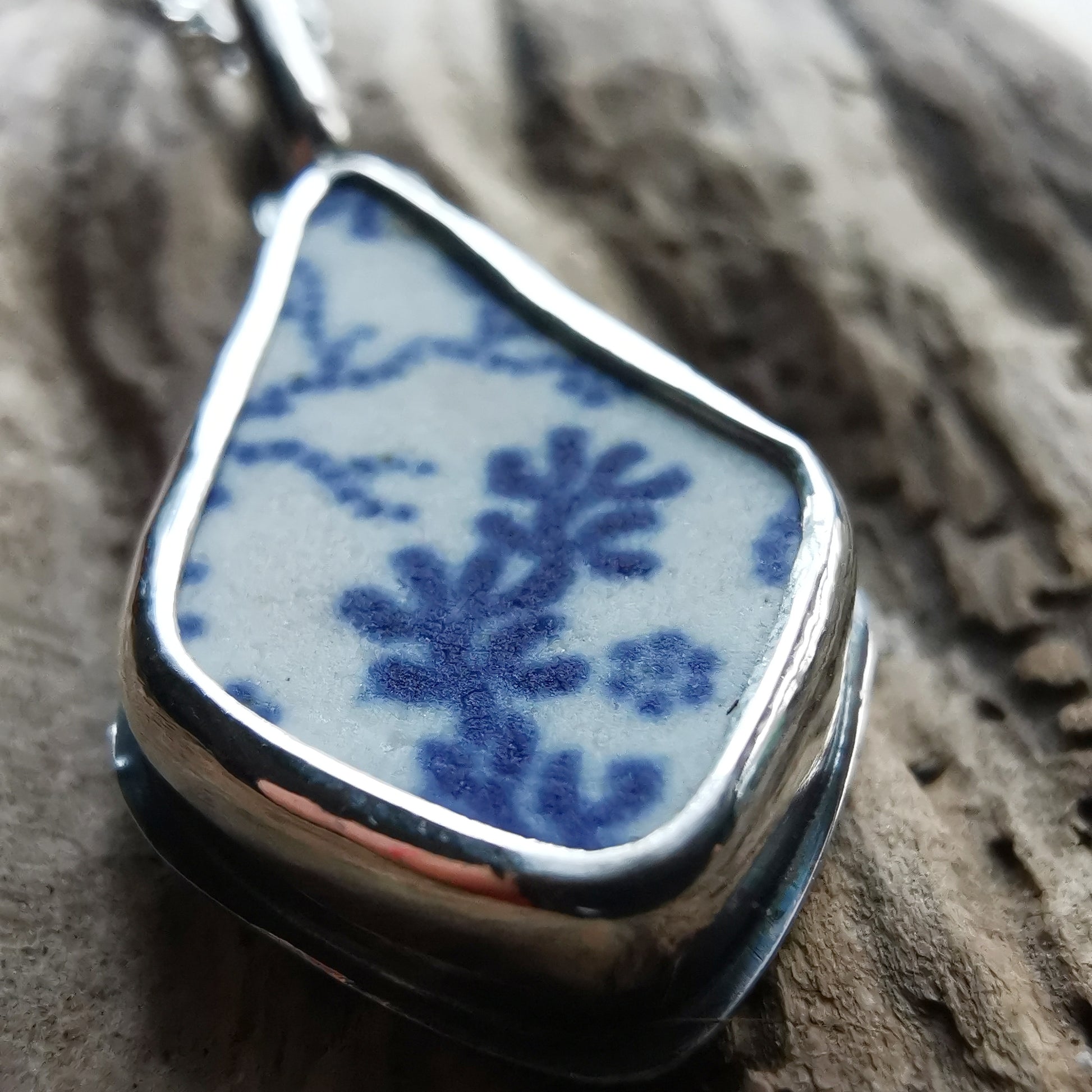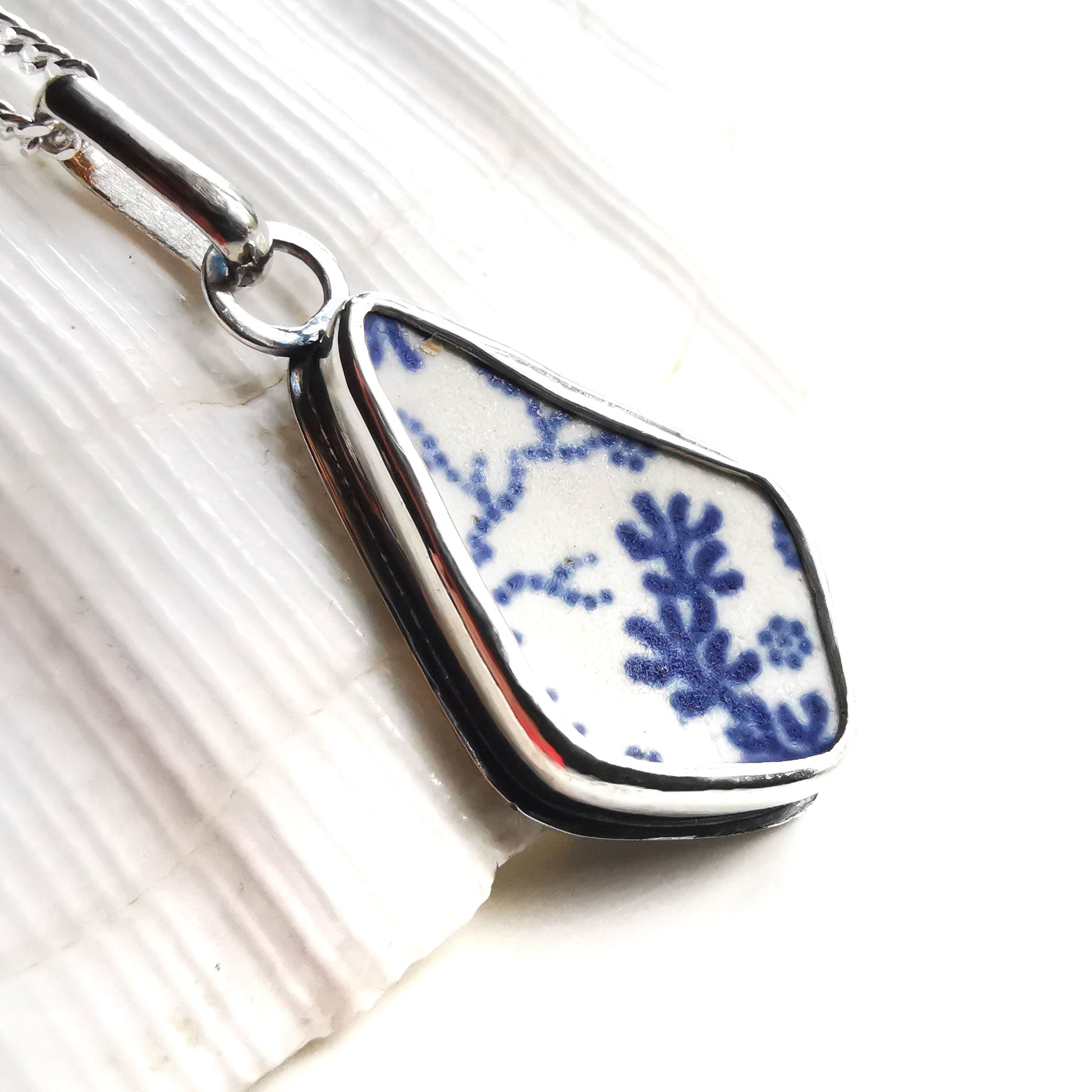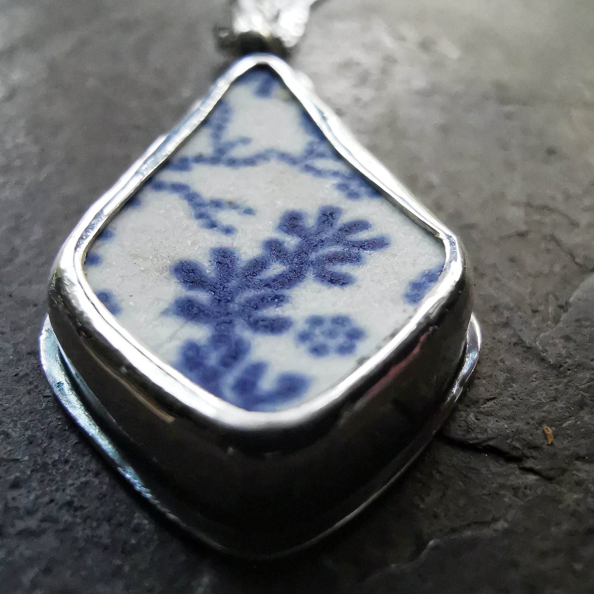Scottish blue and white seaweed pattern sea pottery & sterling silver pendant.