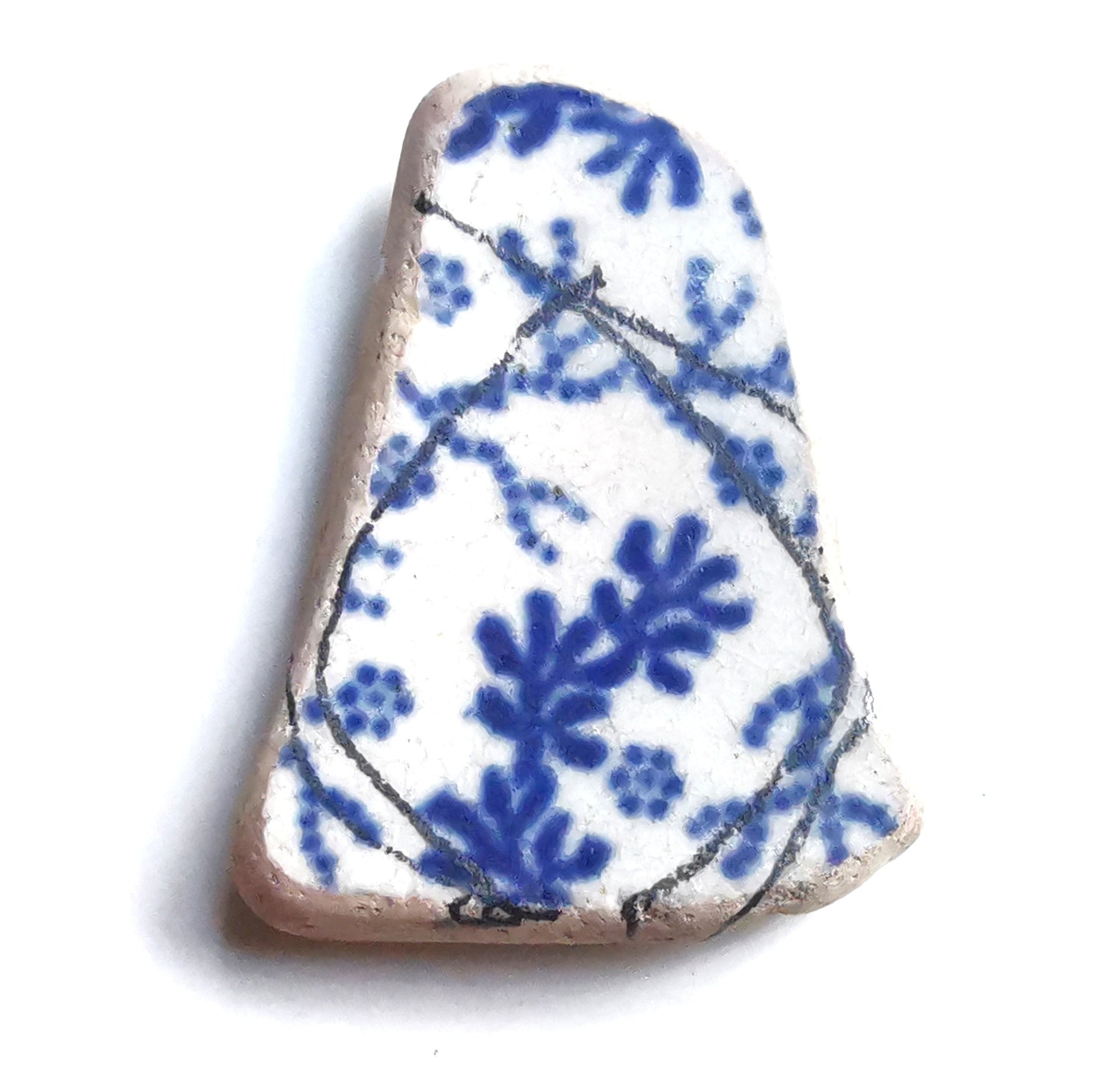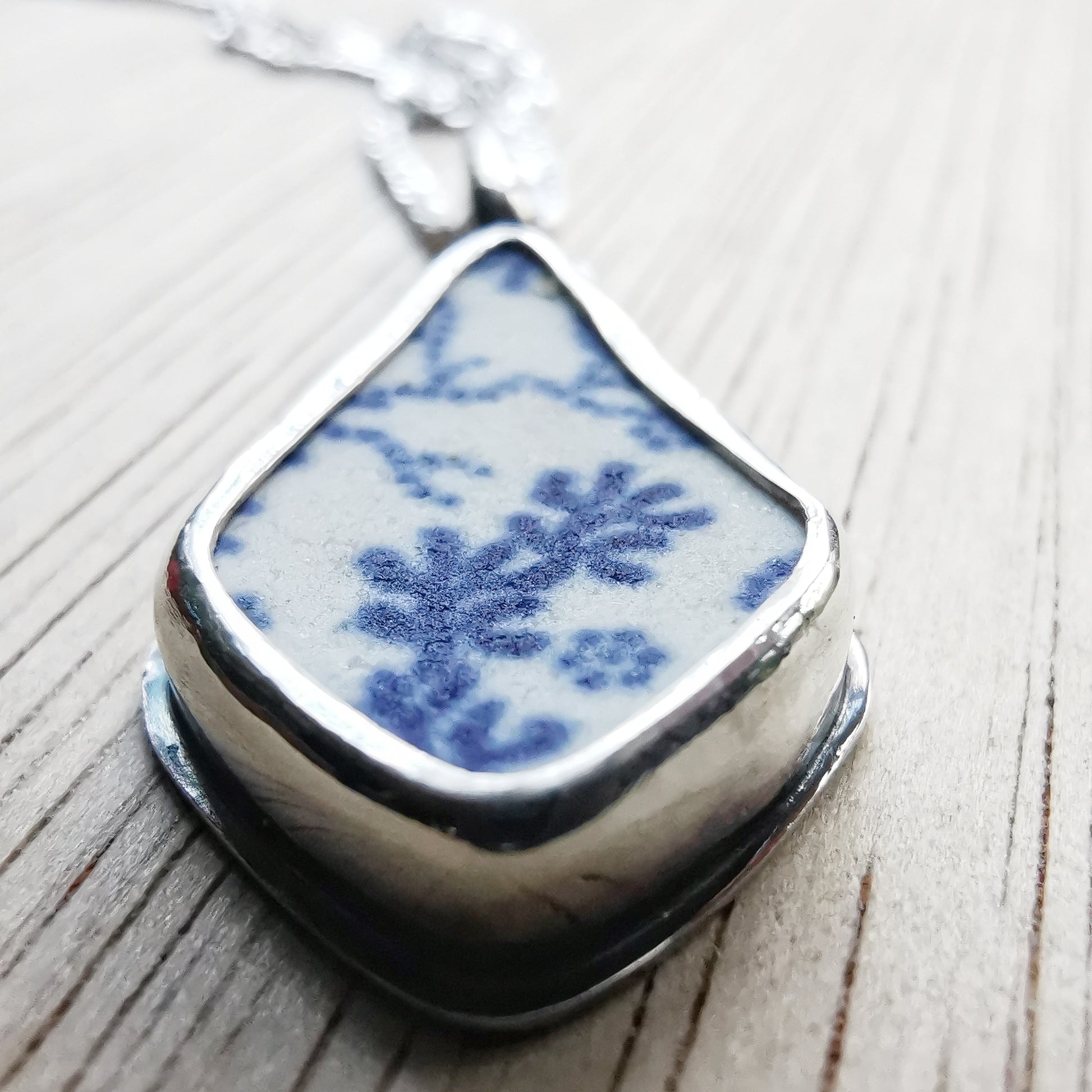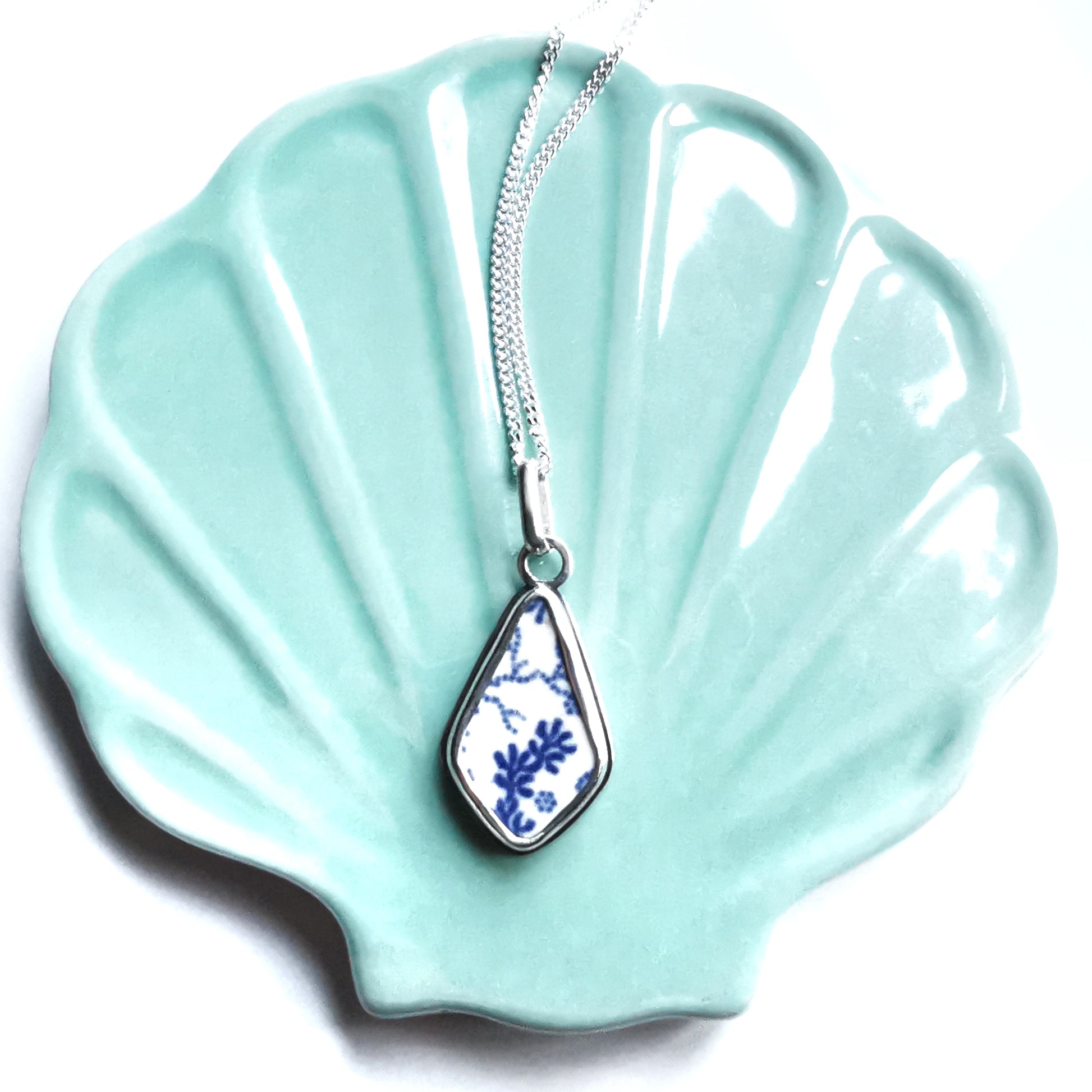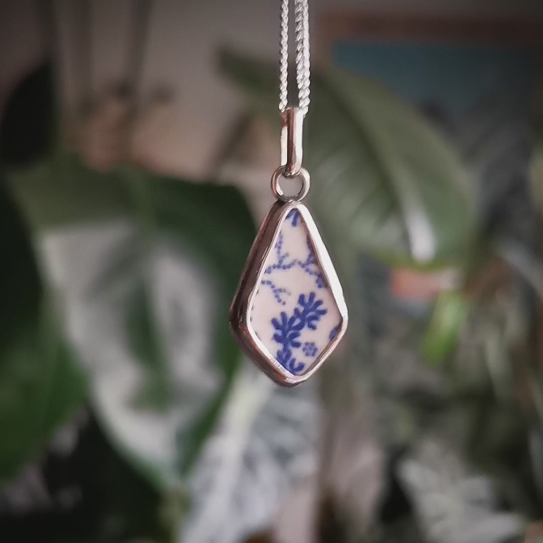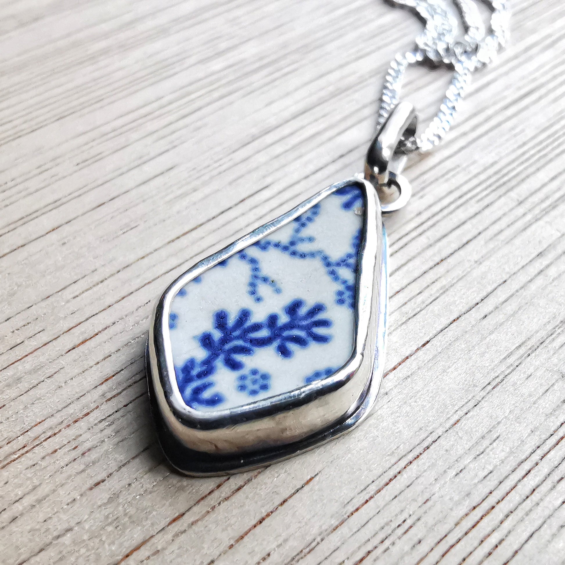 Scottish blue and white seaweed pattern sea pottery & sterling silver pendant.
