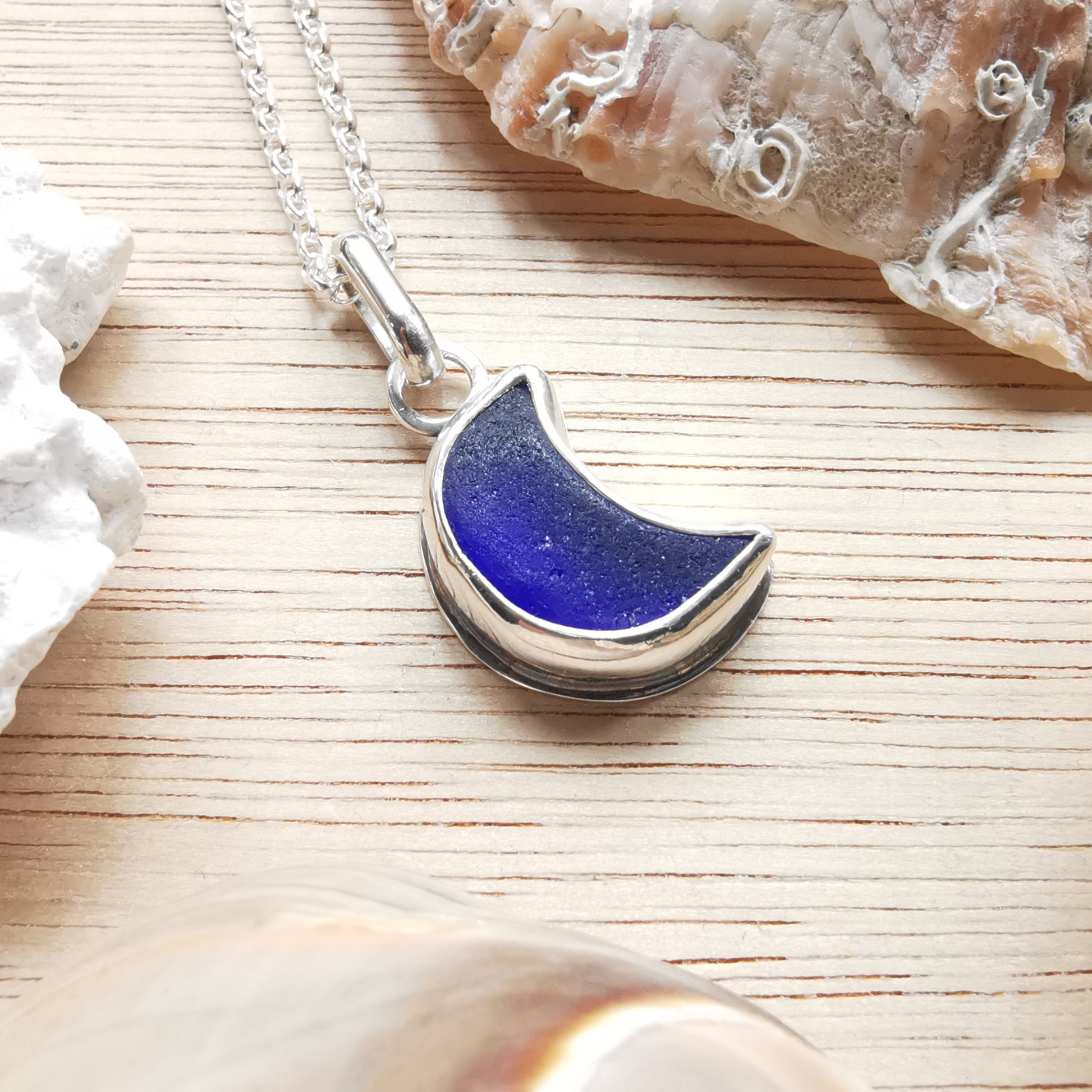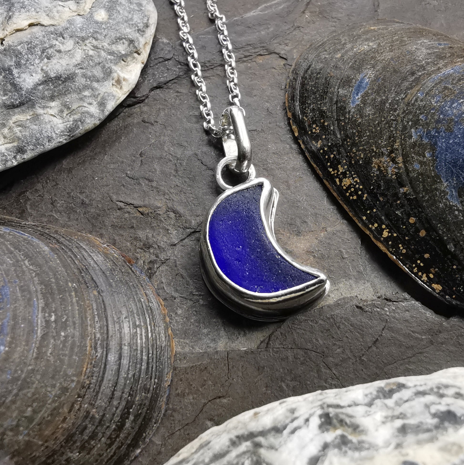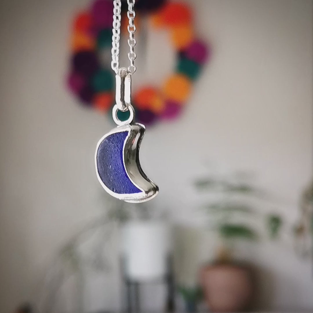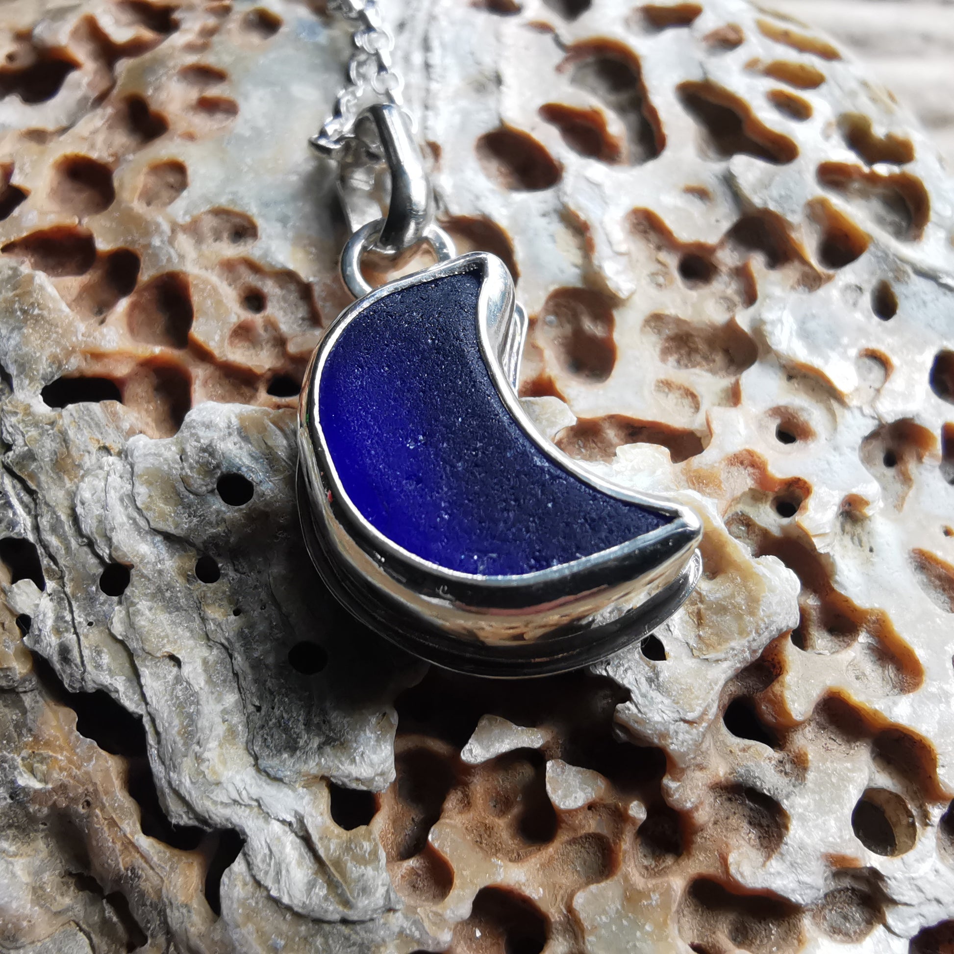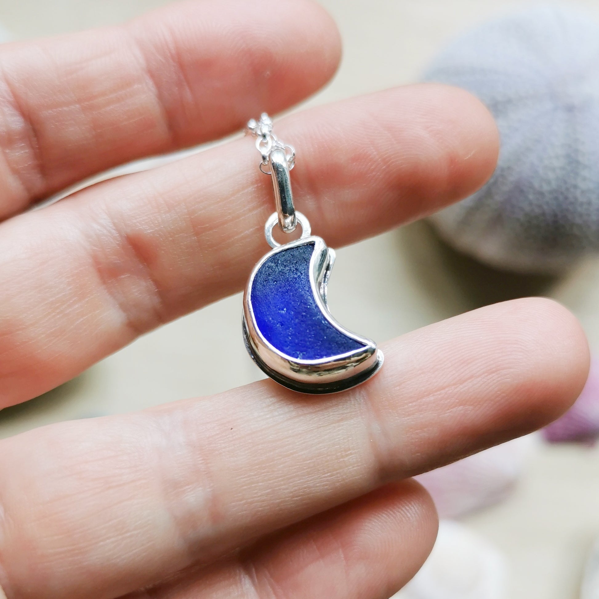 Scottish blue crescent moon sea glass & sterling silver pendant.