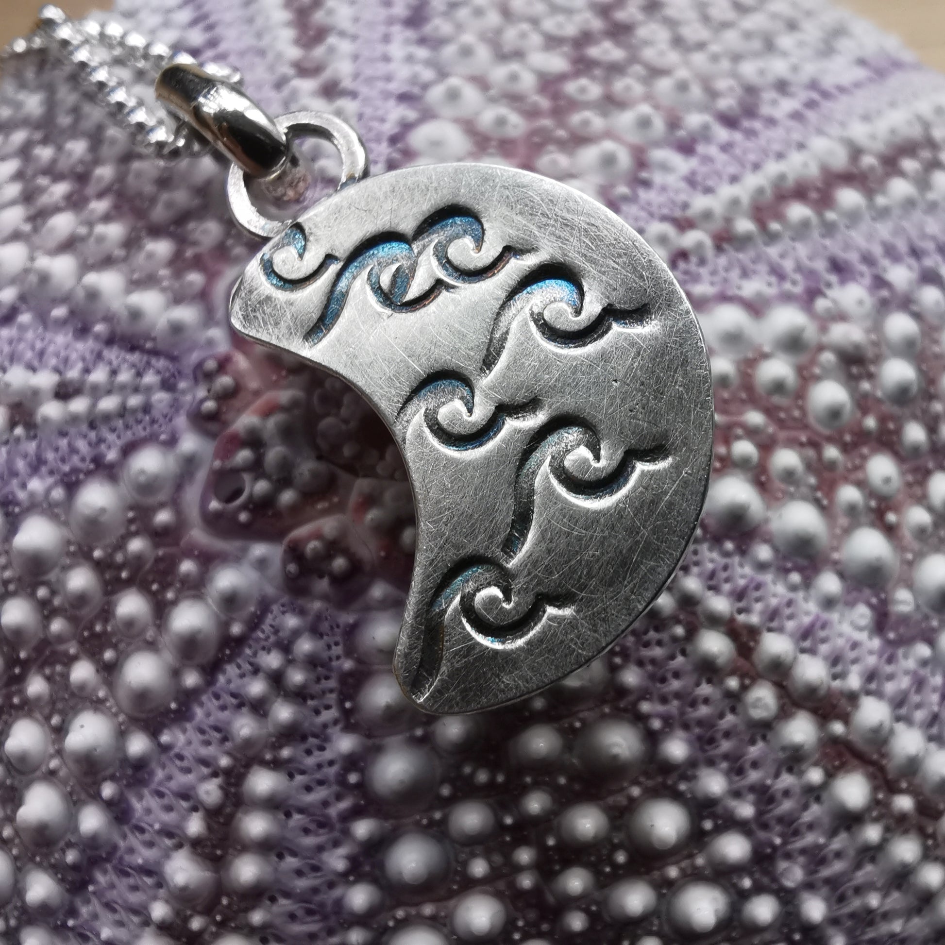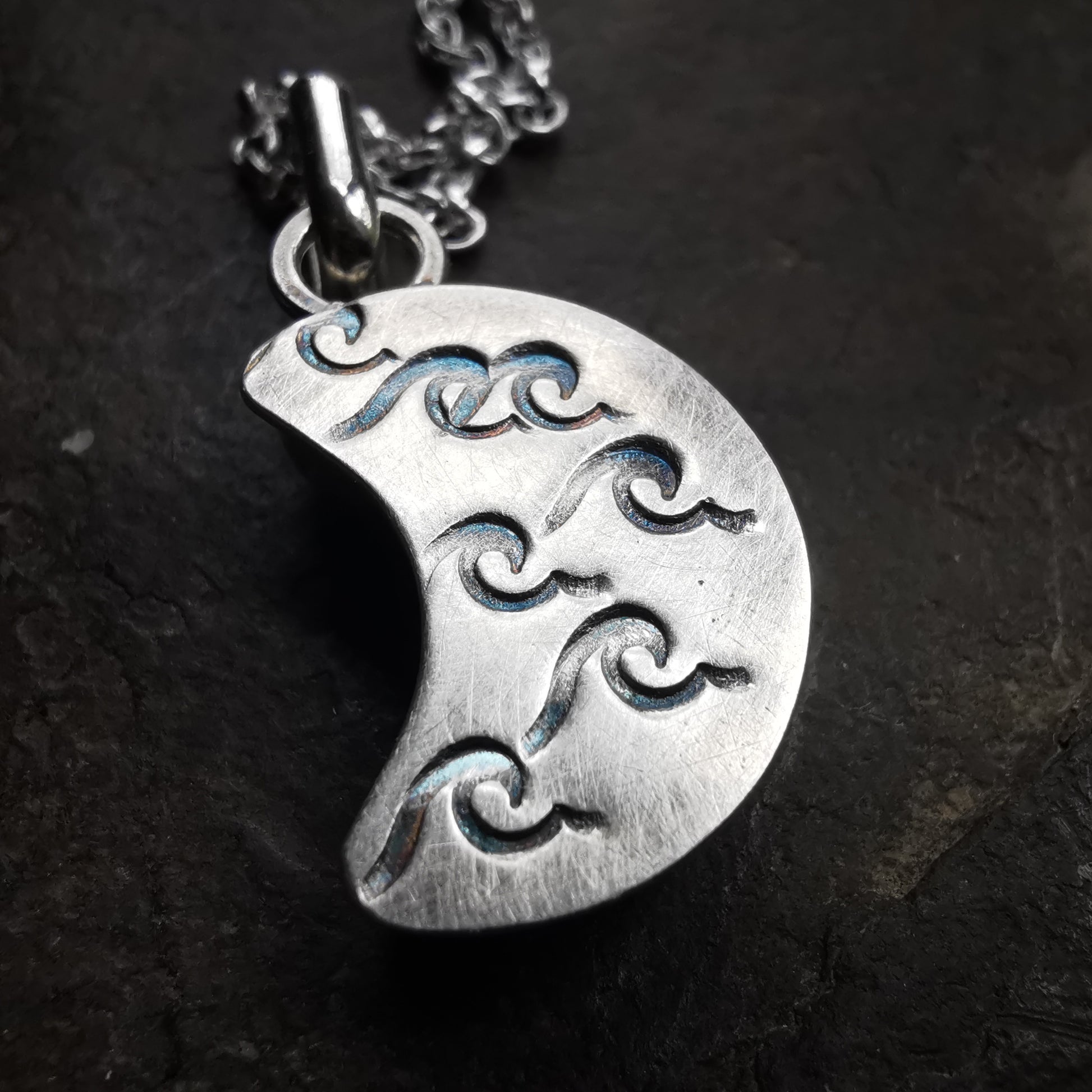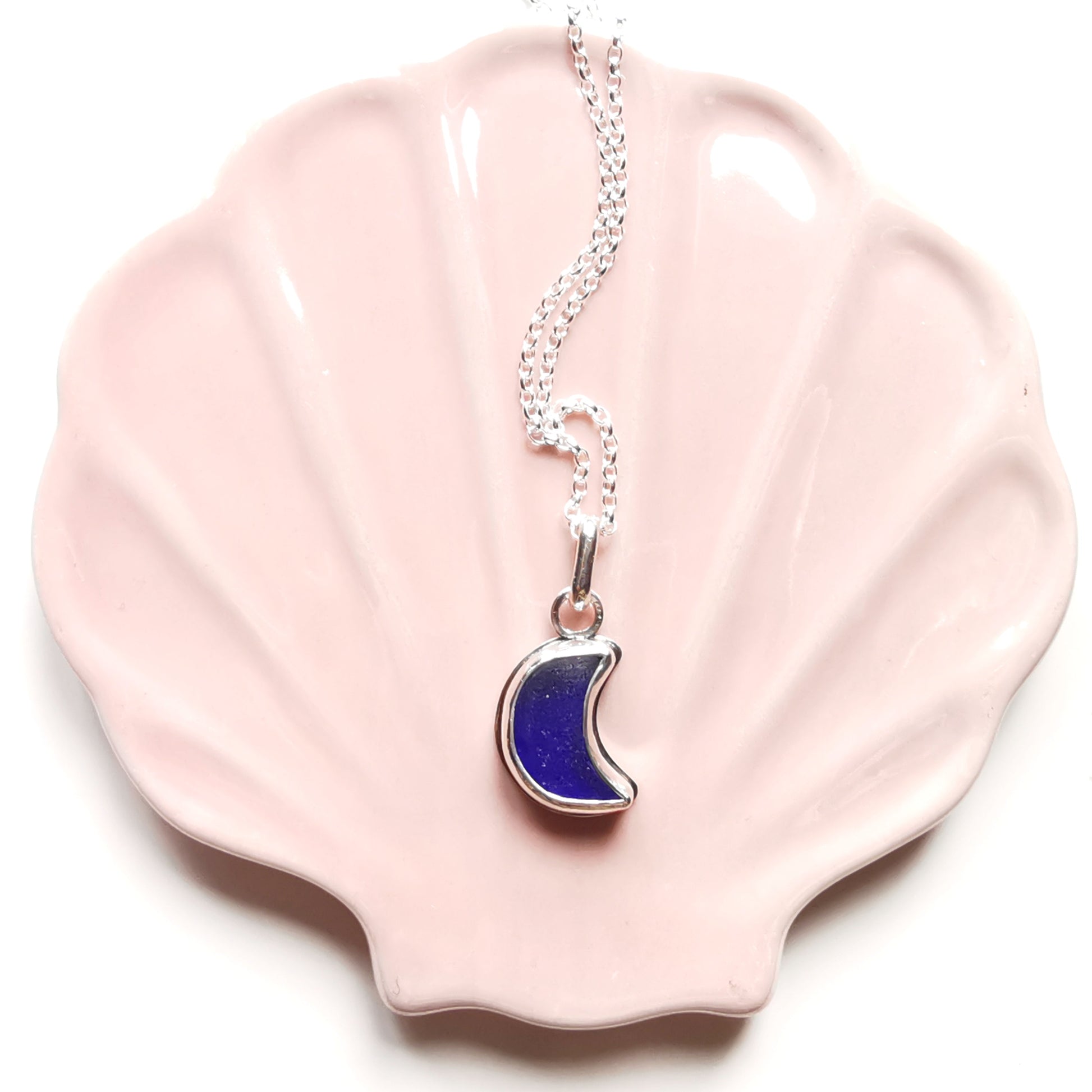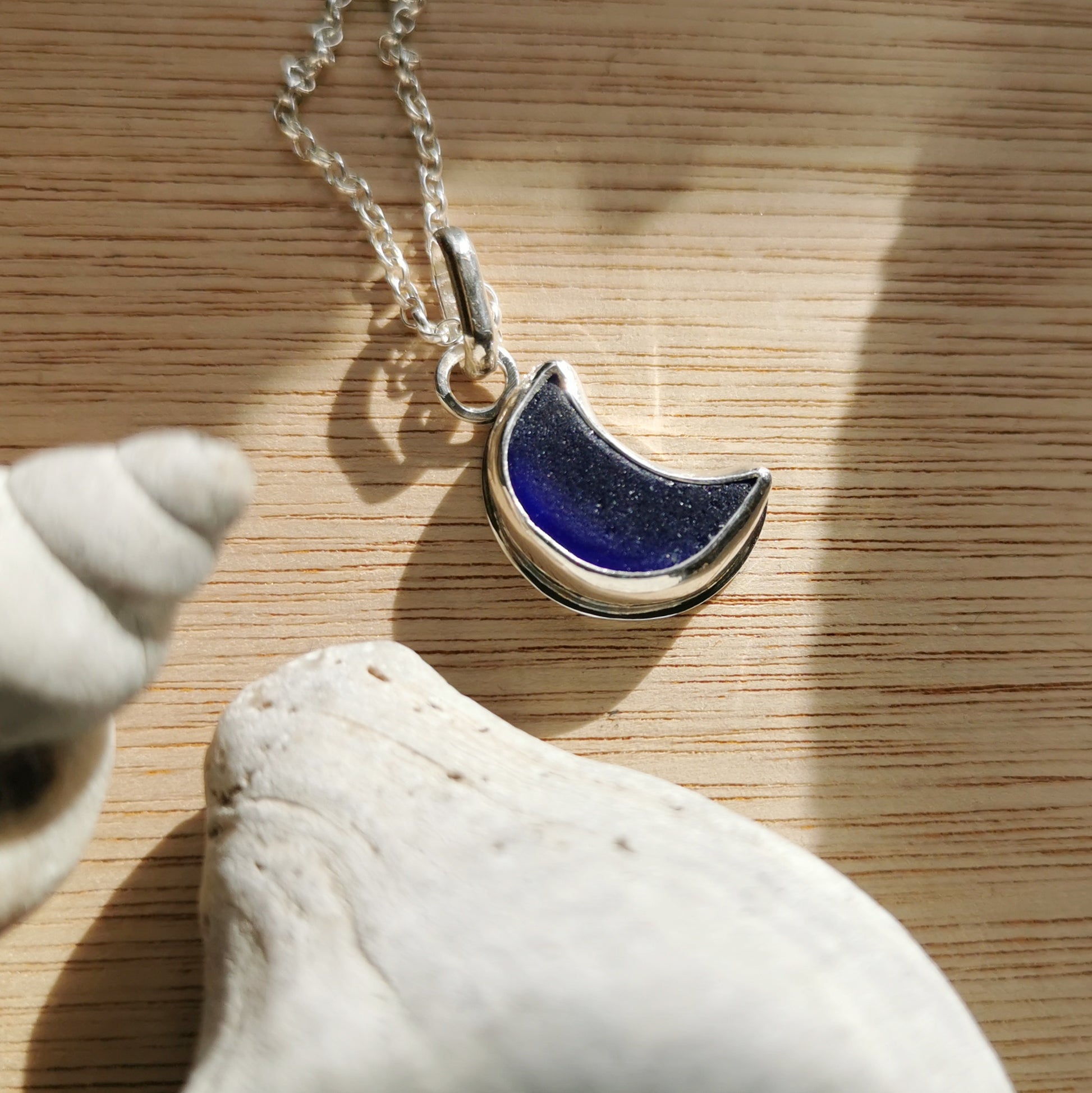 Scottish blue crescent moon sea glass & sterling silver pendant.