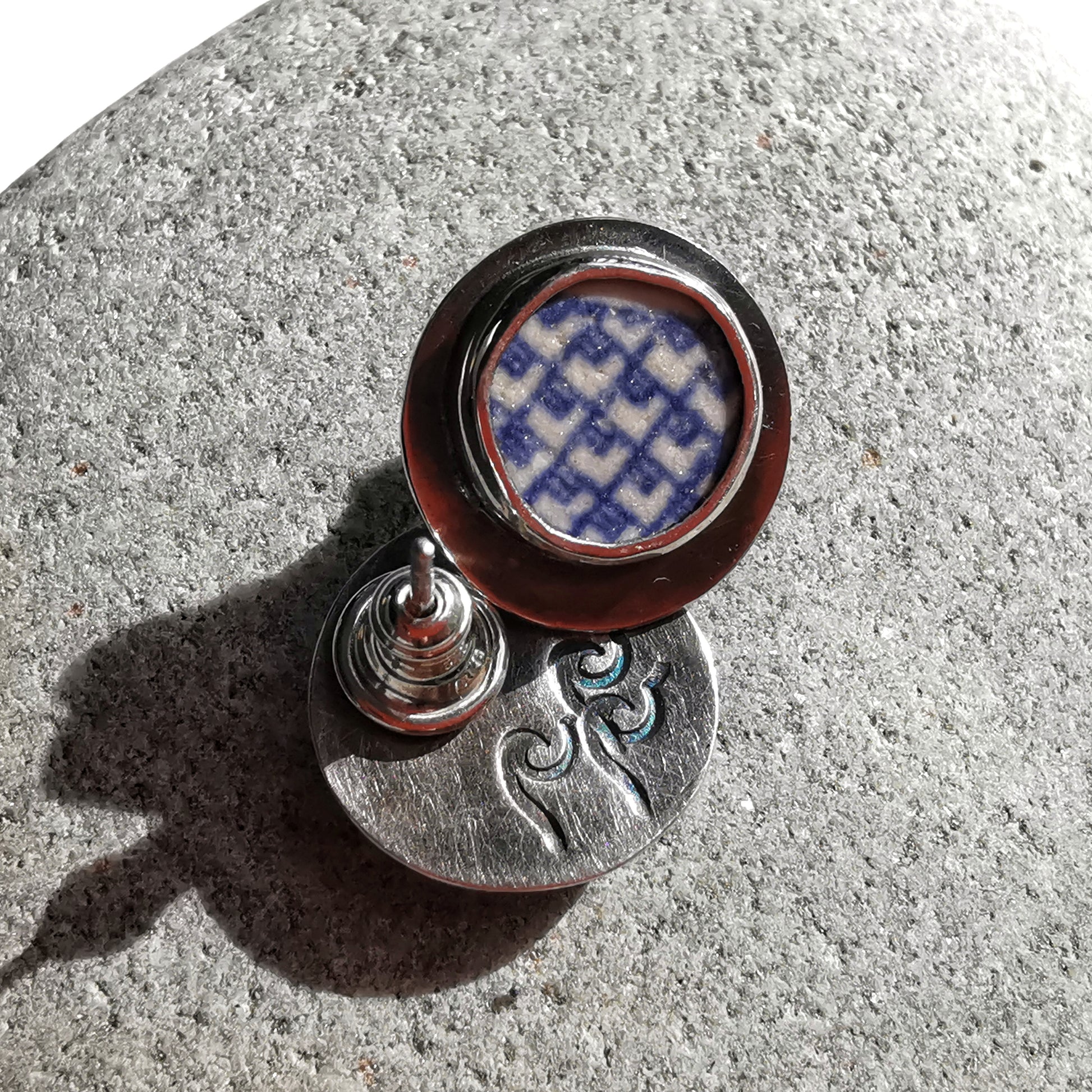 One of a kind stud earrings composed with Scottish blue willow sea pottery, found by me in Edinburgh. I've shaped the pieces myself, you can see how they looked previously on the last photo.