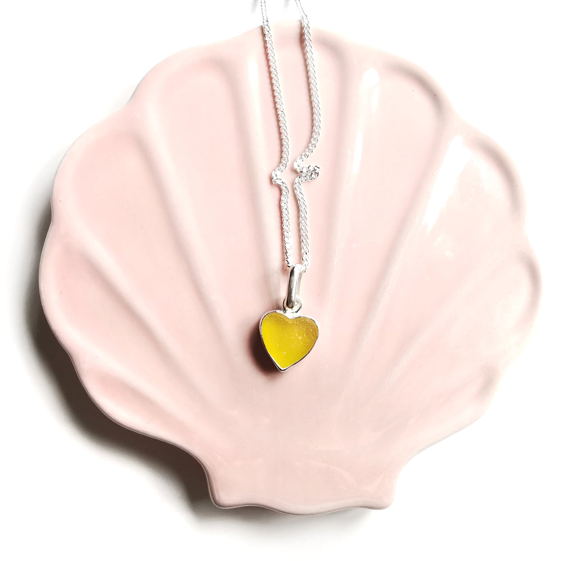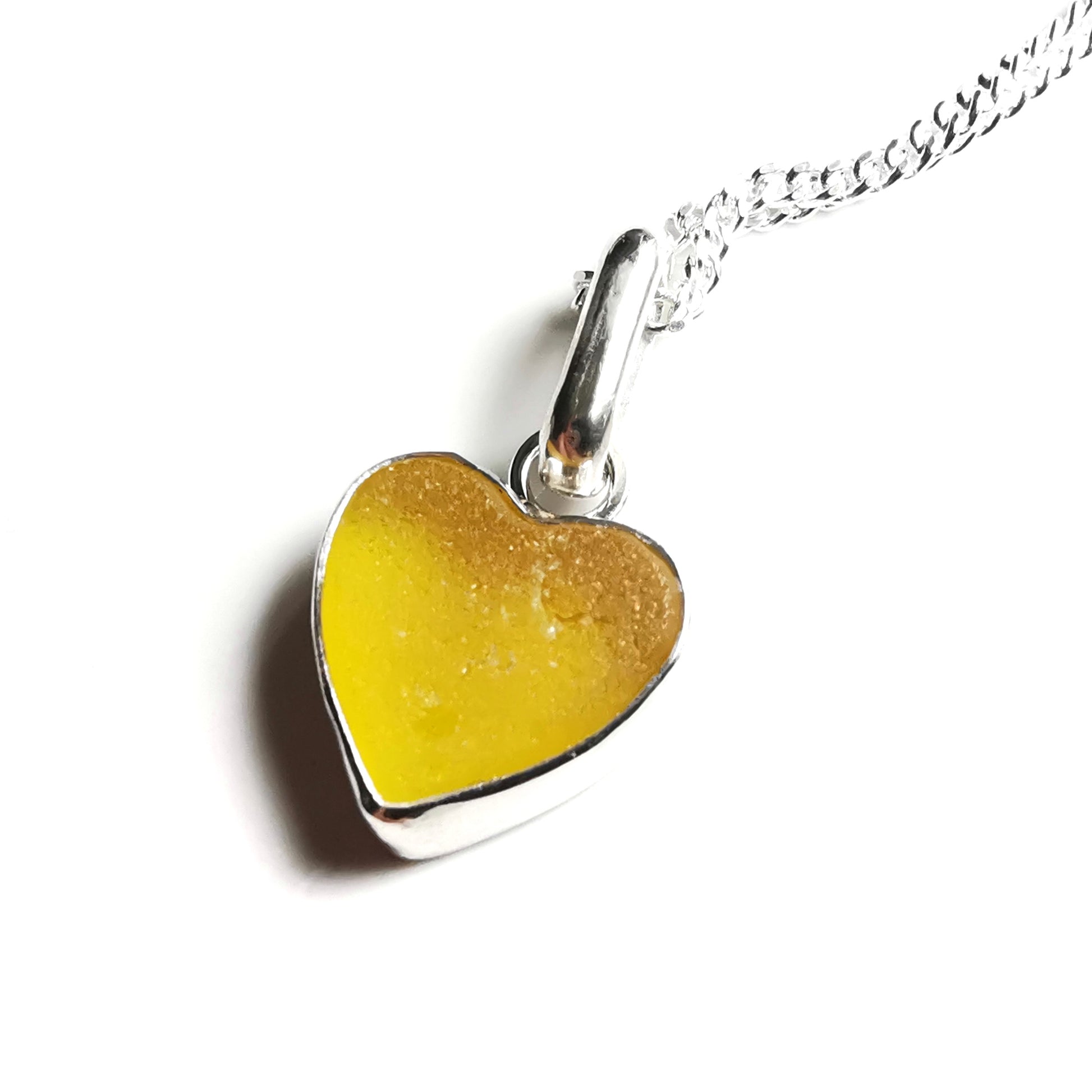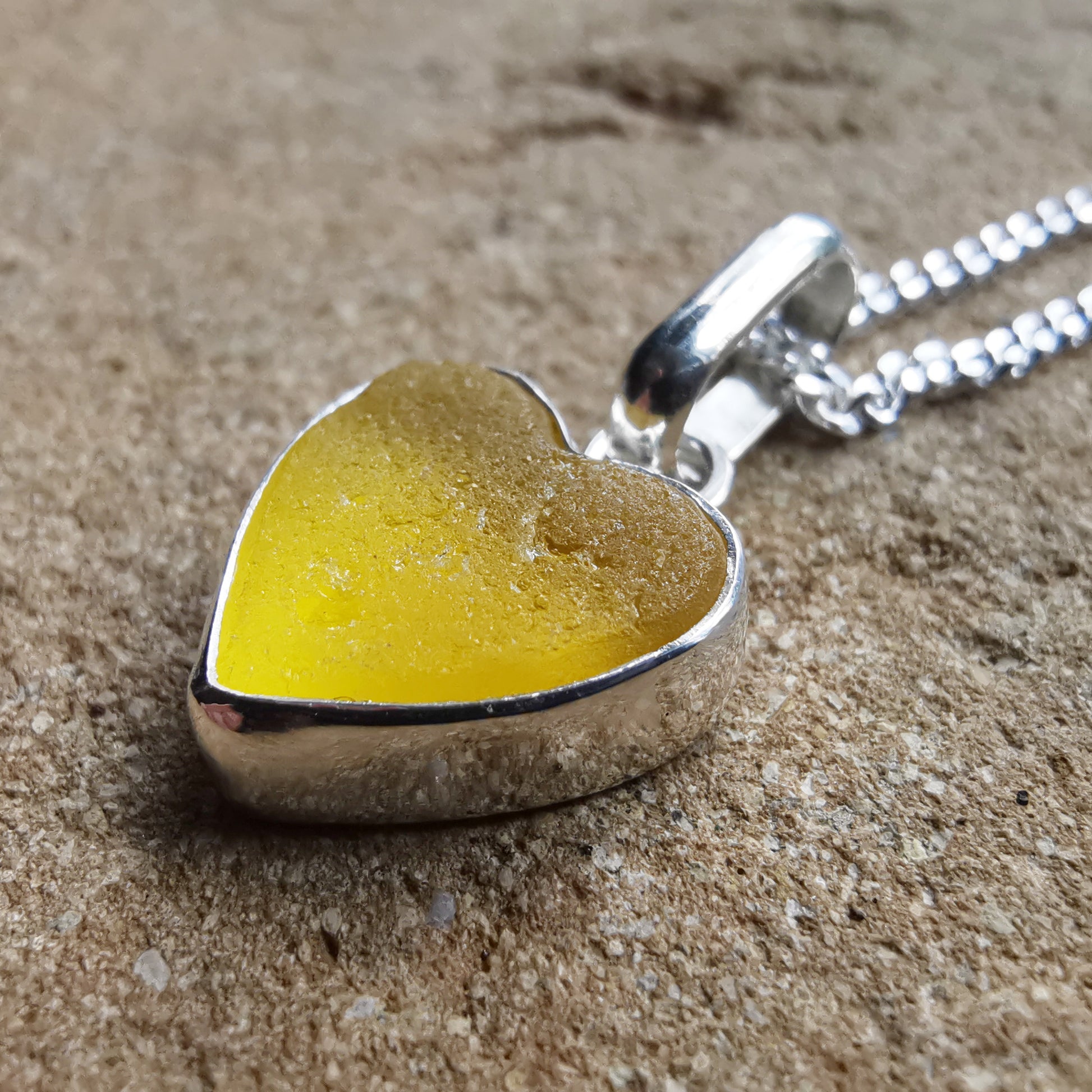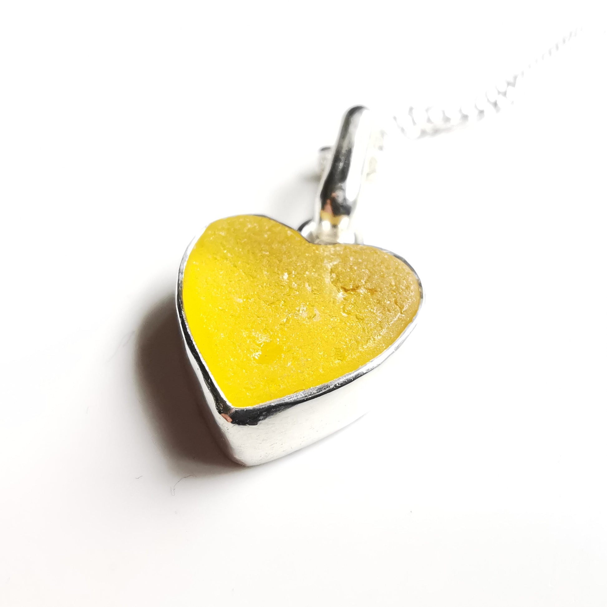 Scottish bright UV yellow sea glass heart & sterling silver pendant.