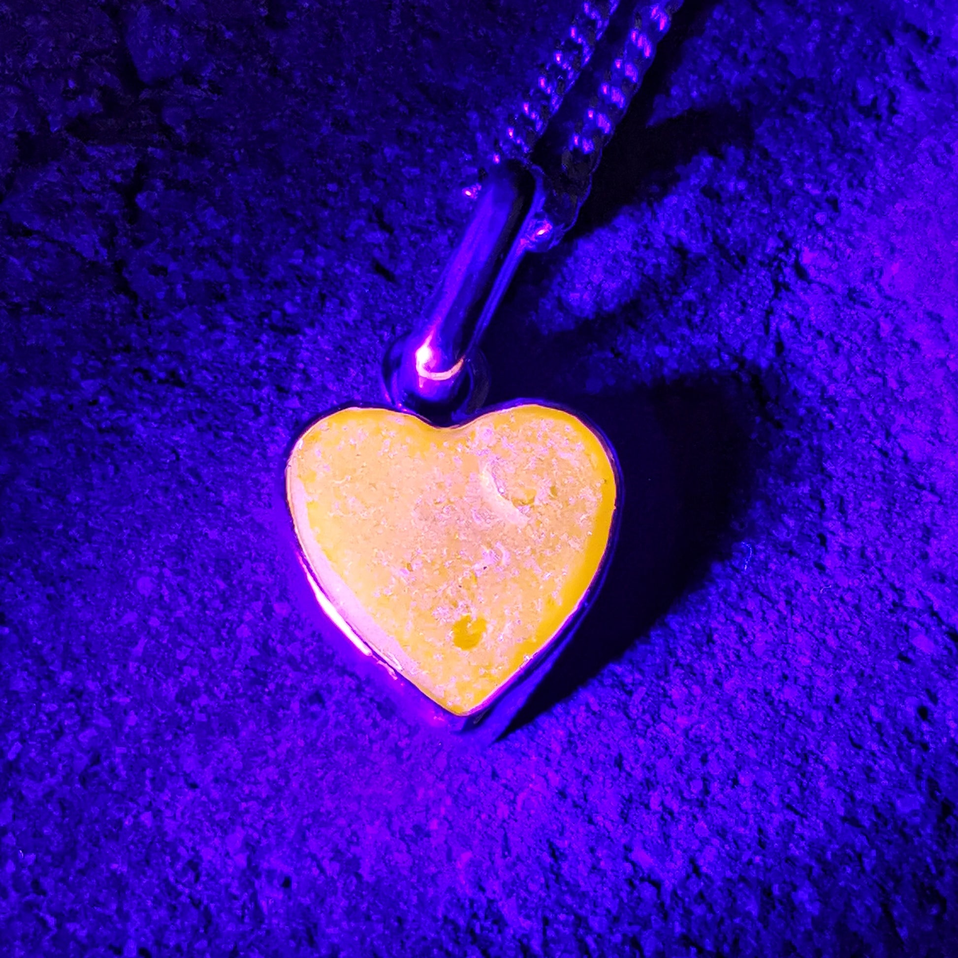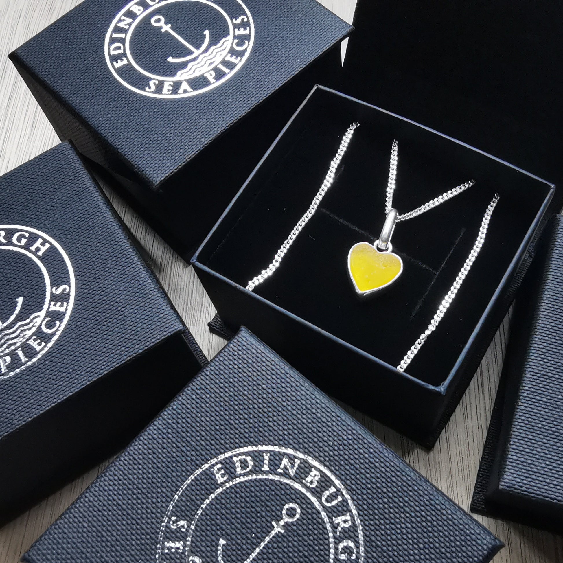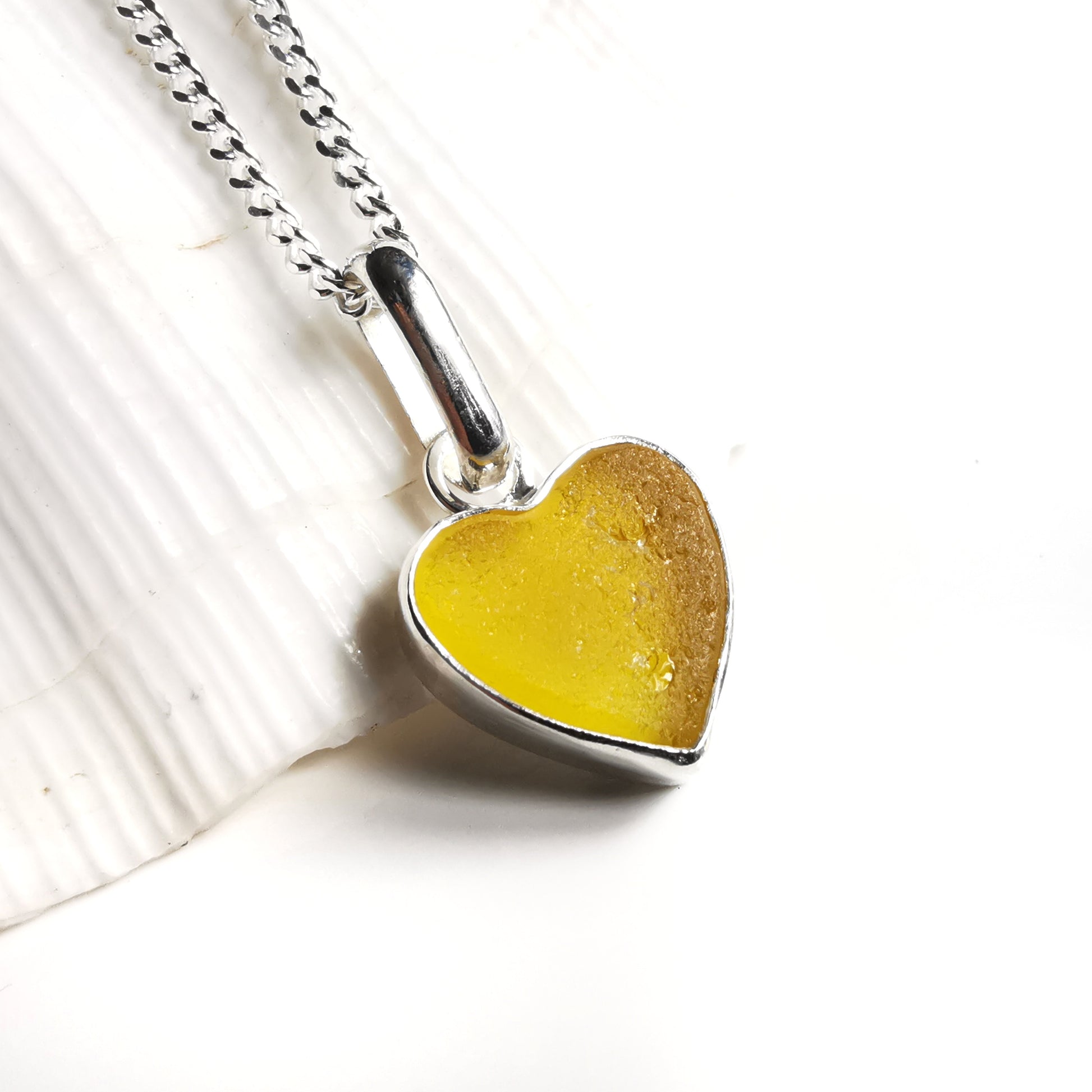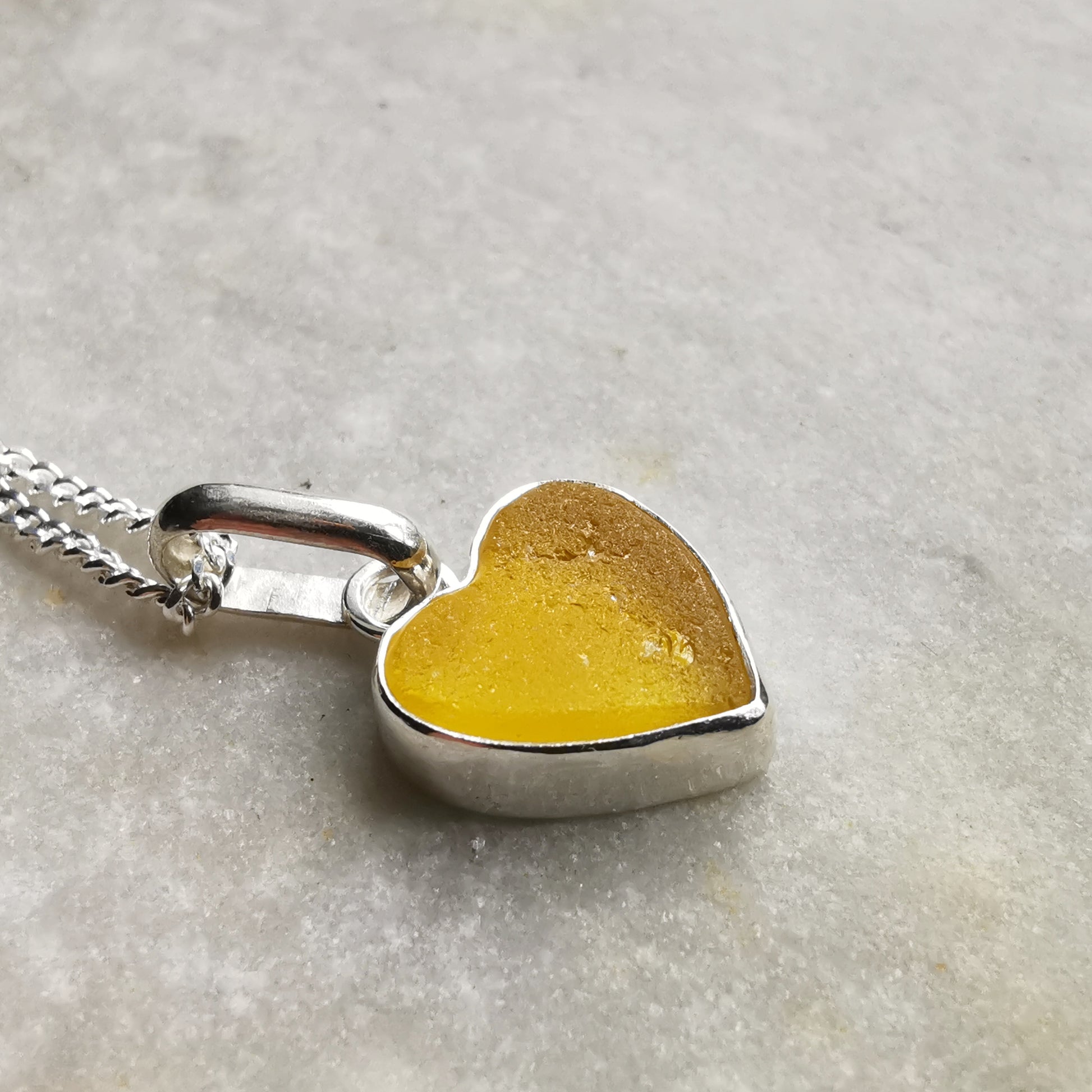 Scottish bright UV yellow sea glass heart & sterling silver pendant.