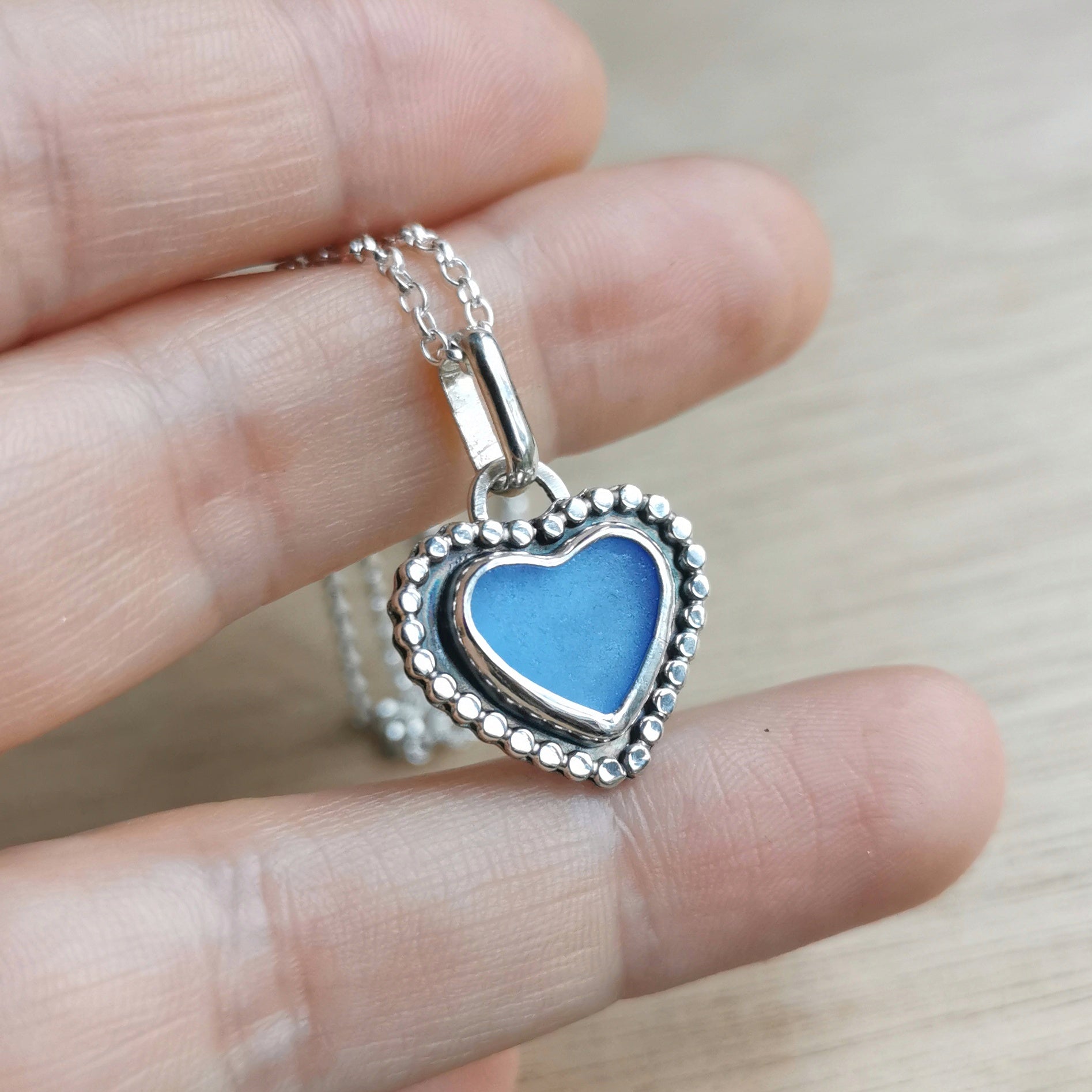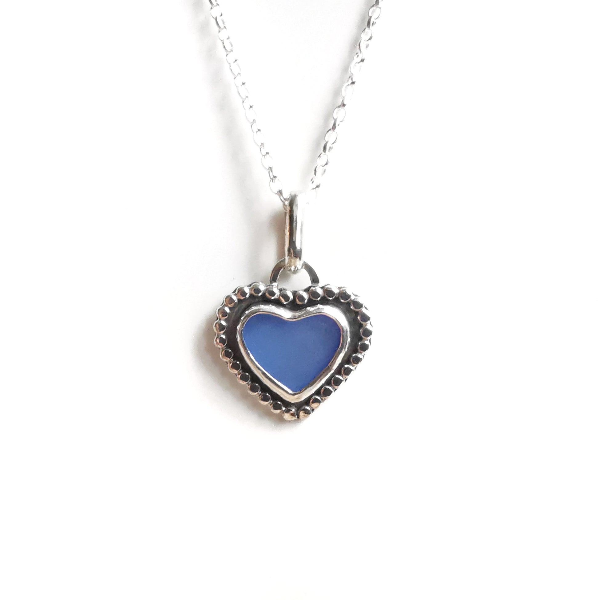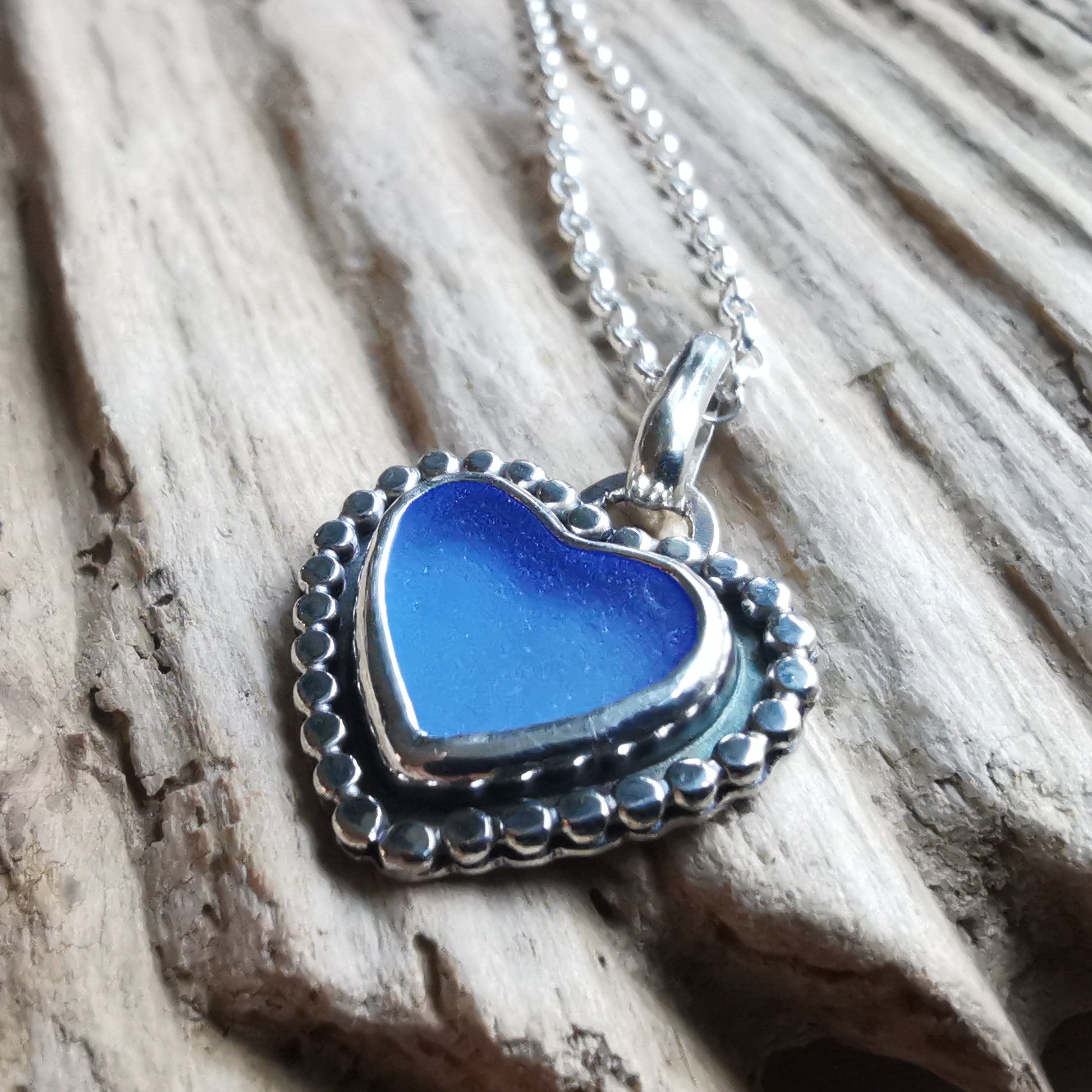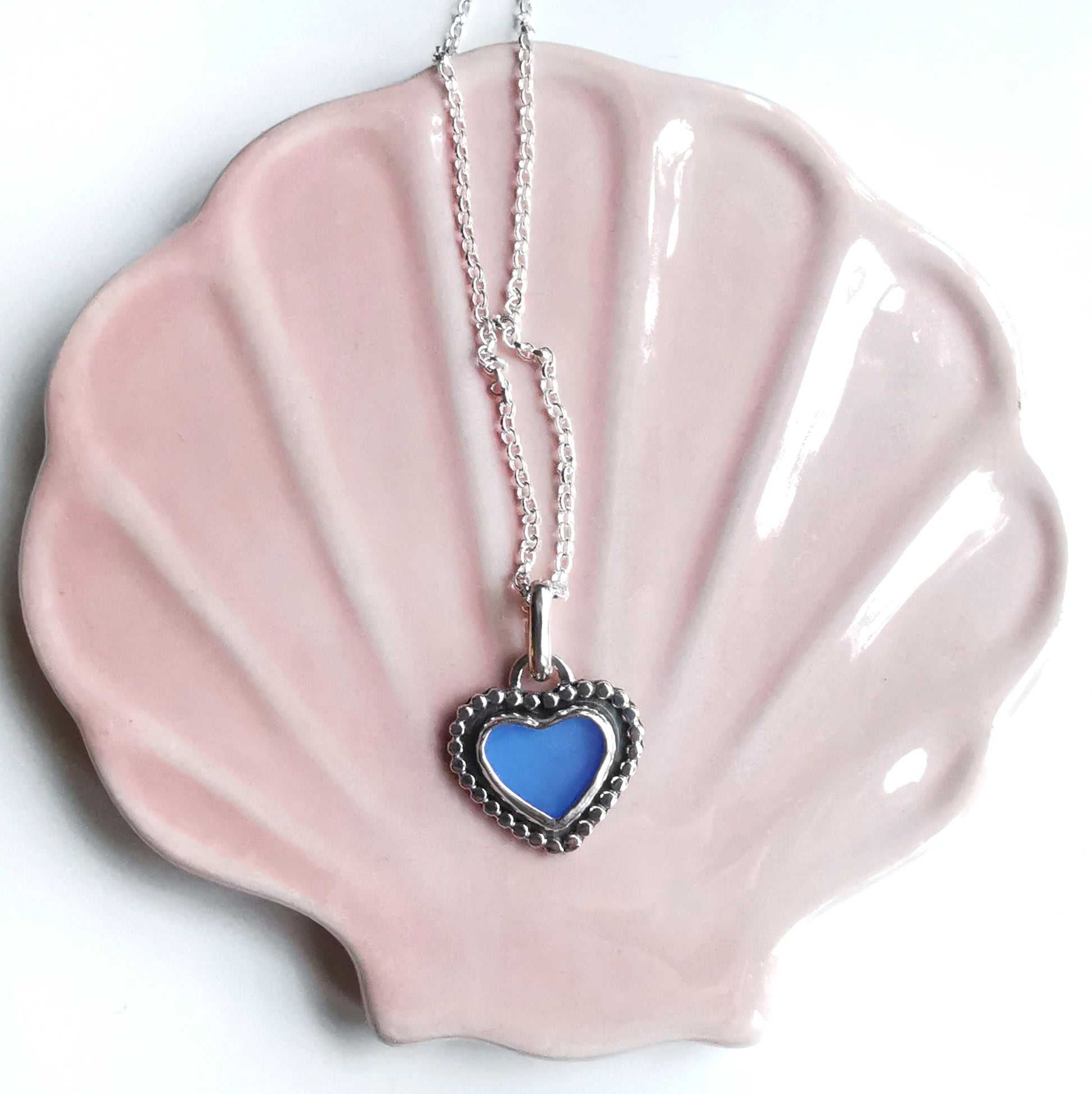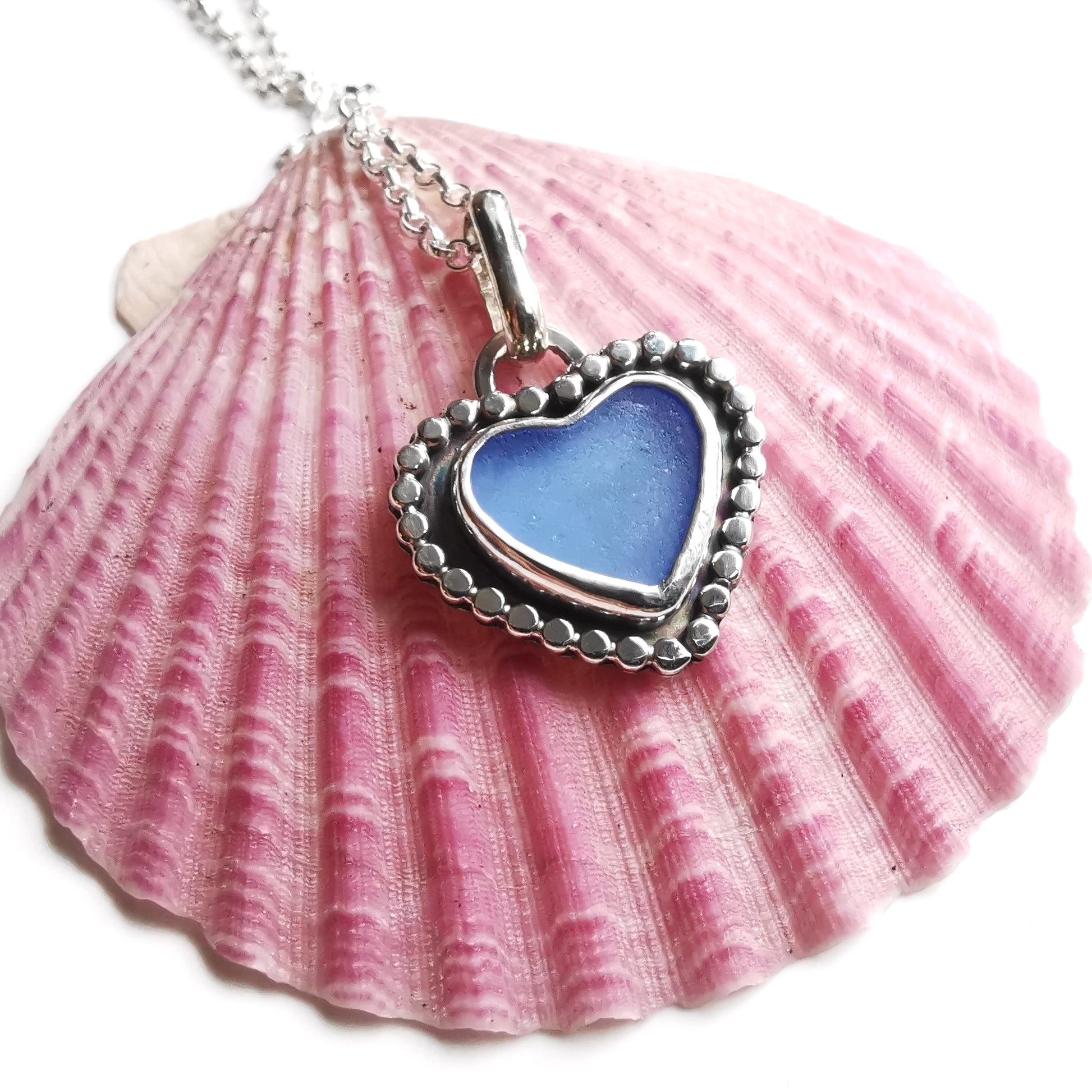Scottish cornflower blue sea glass heart & sterling silver pendant.