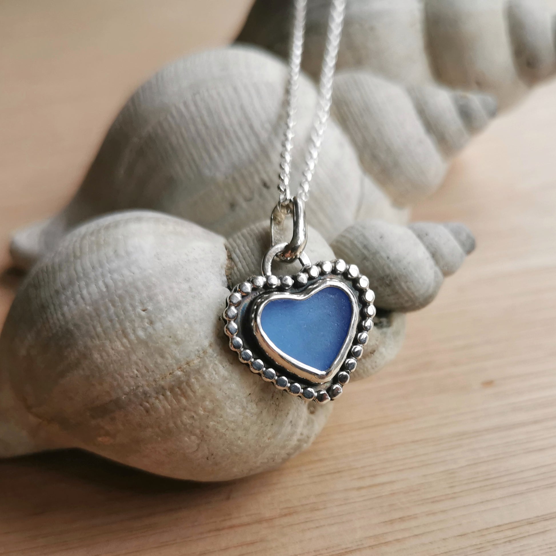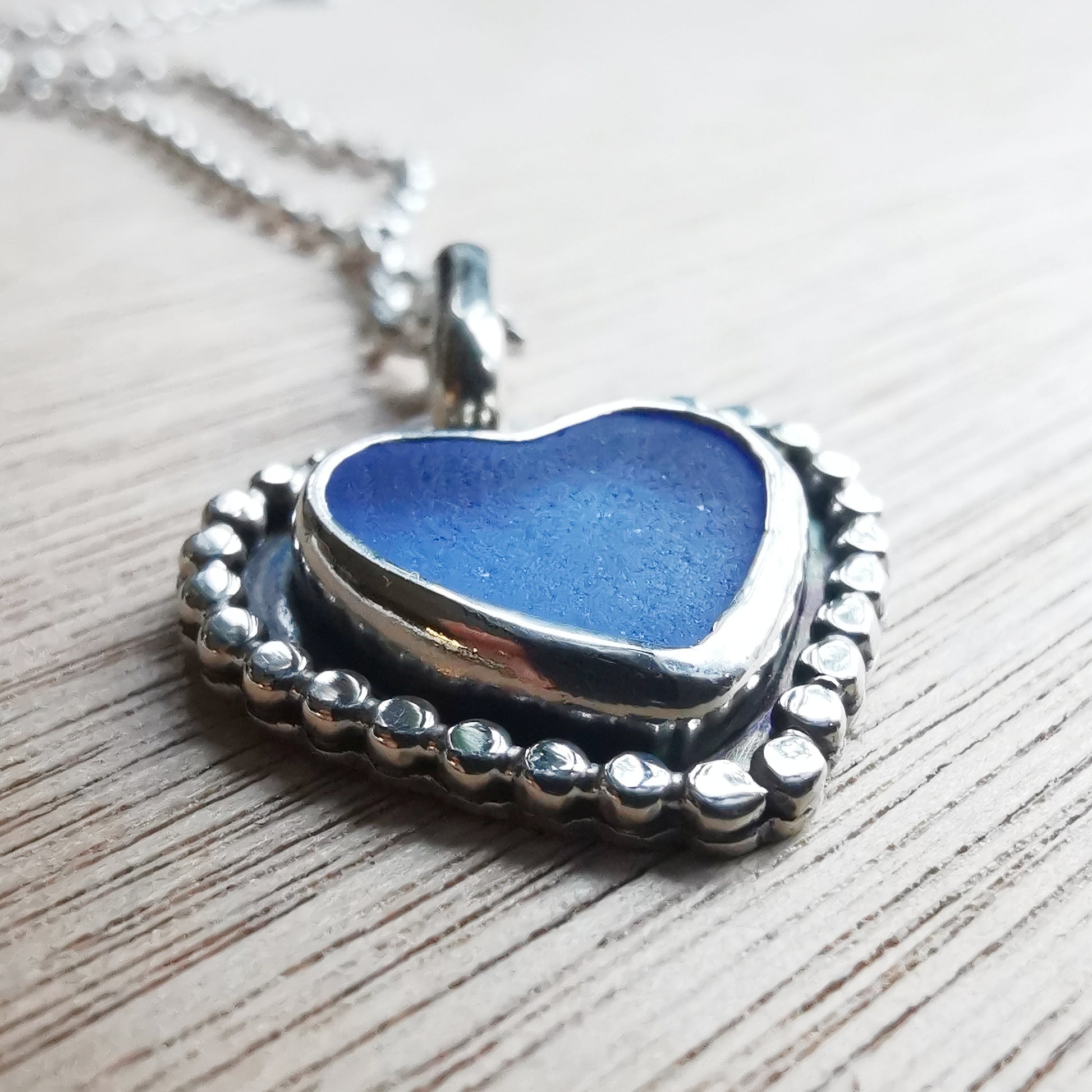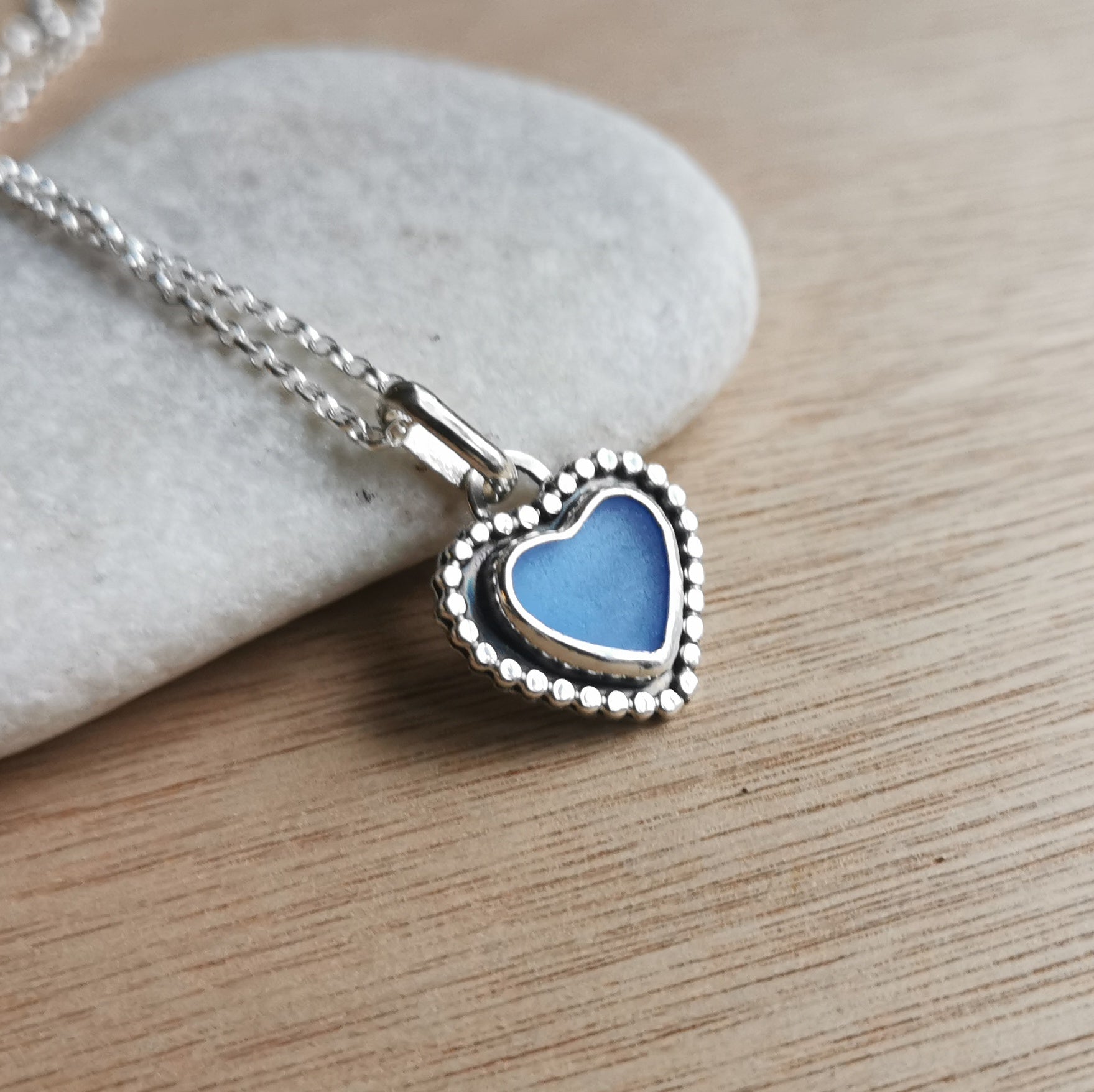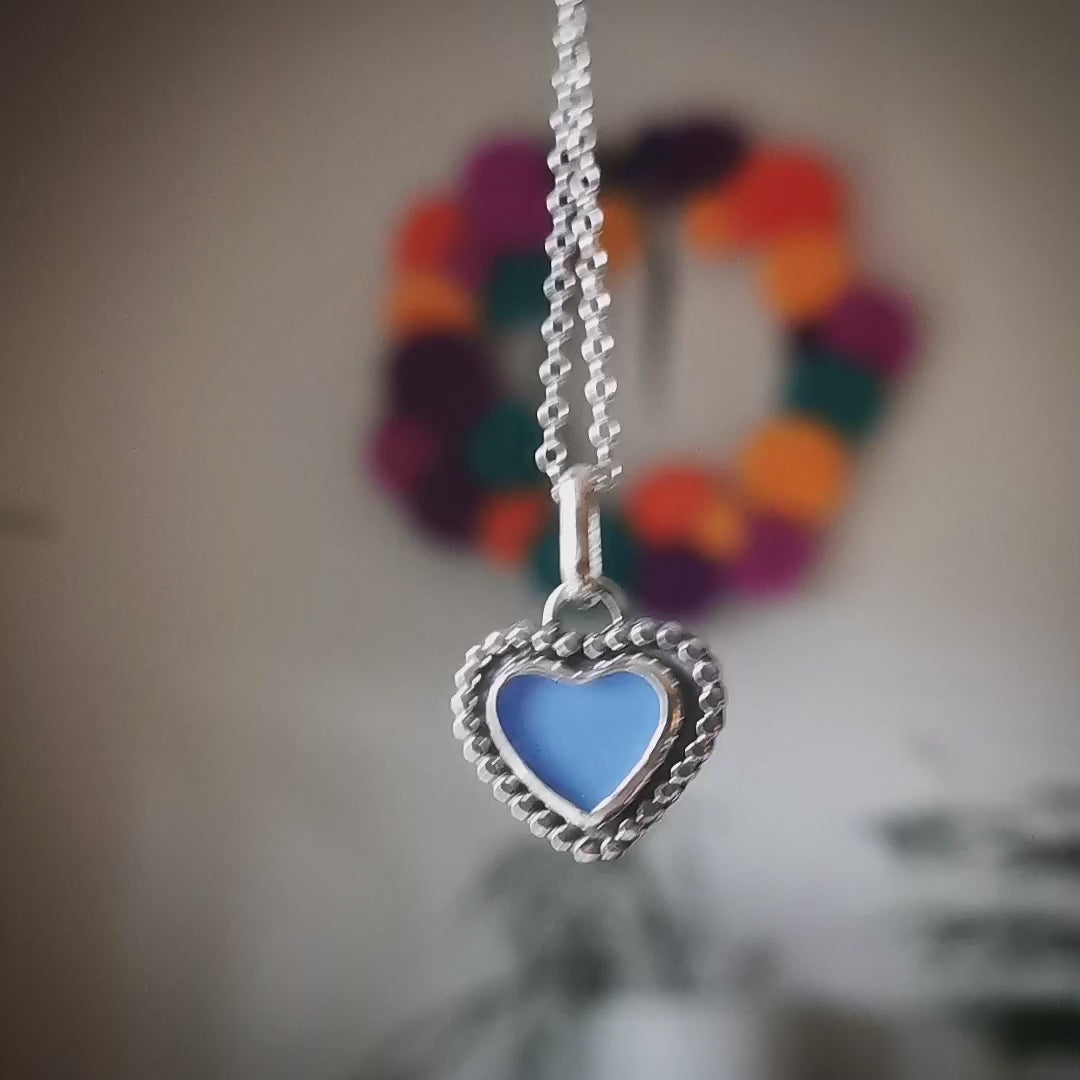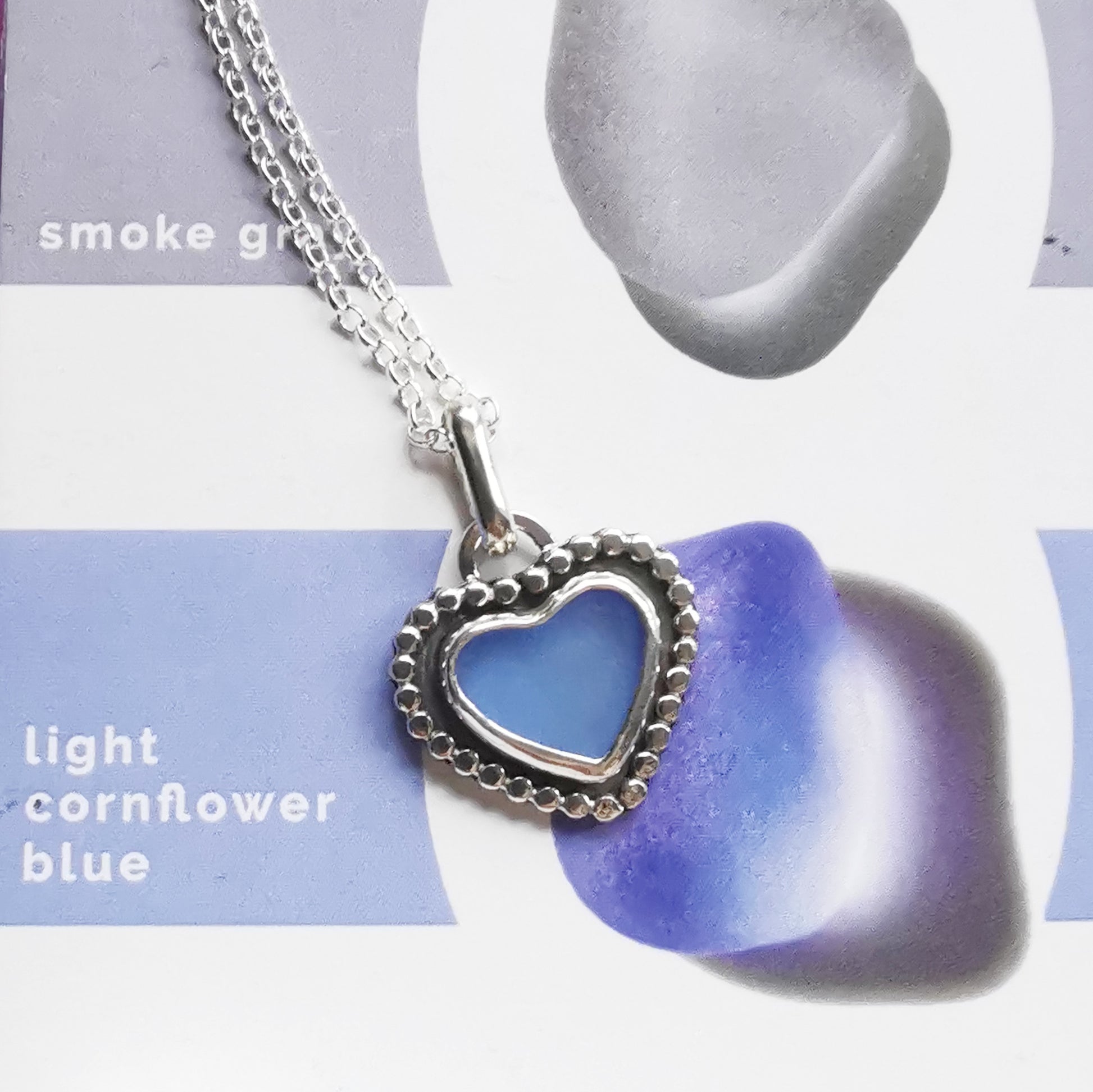 Scottish cornflower blue sea glass heart & sterling silver pendant.