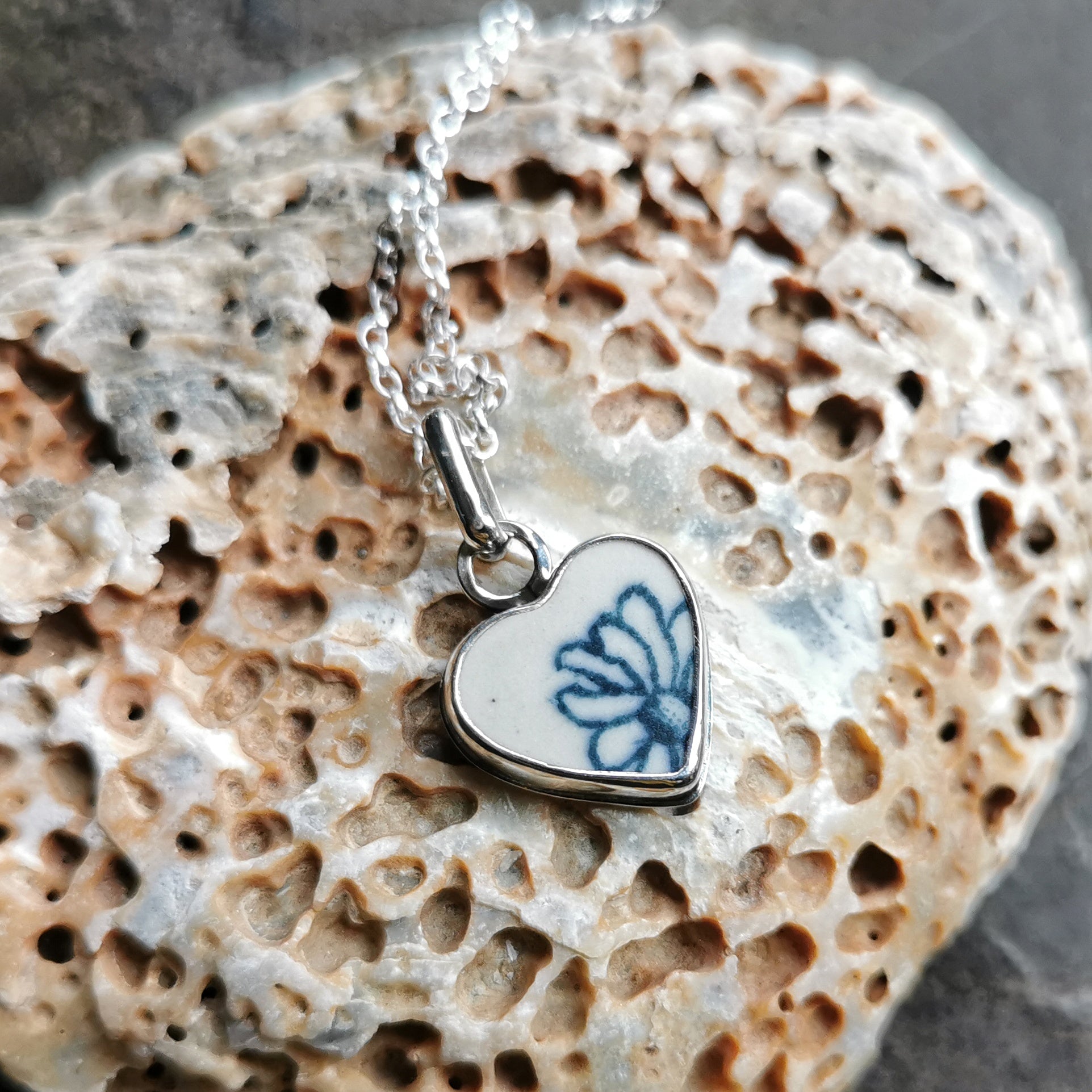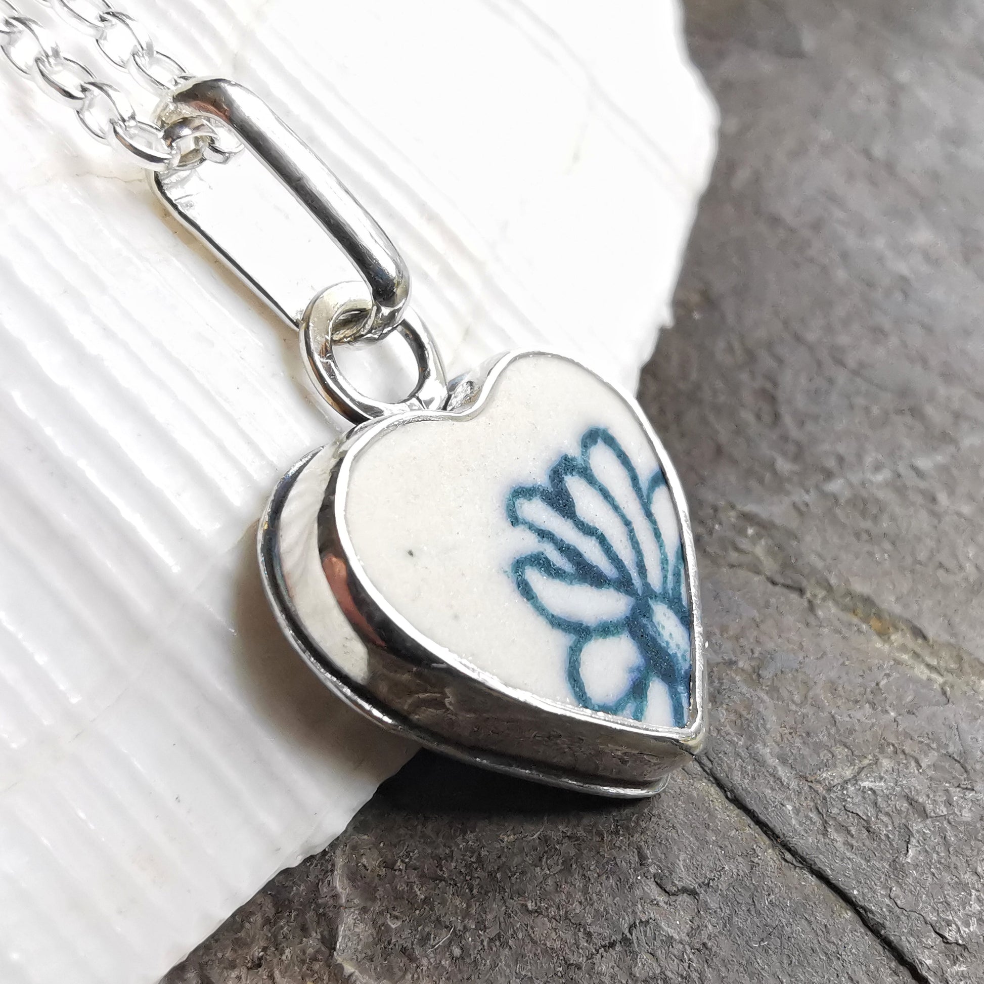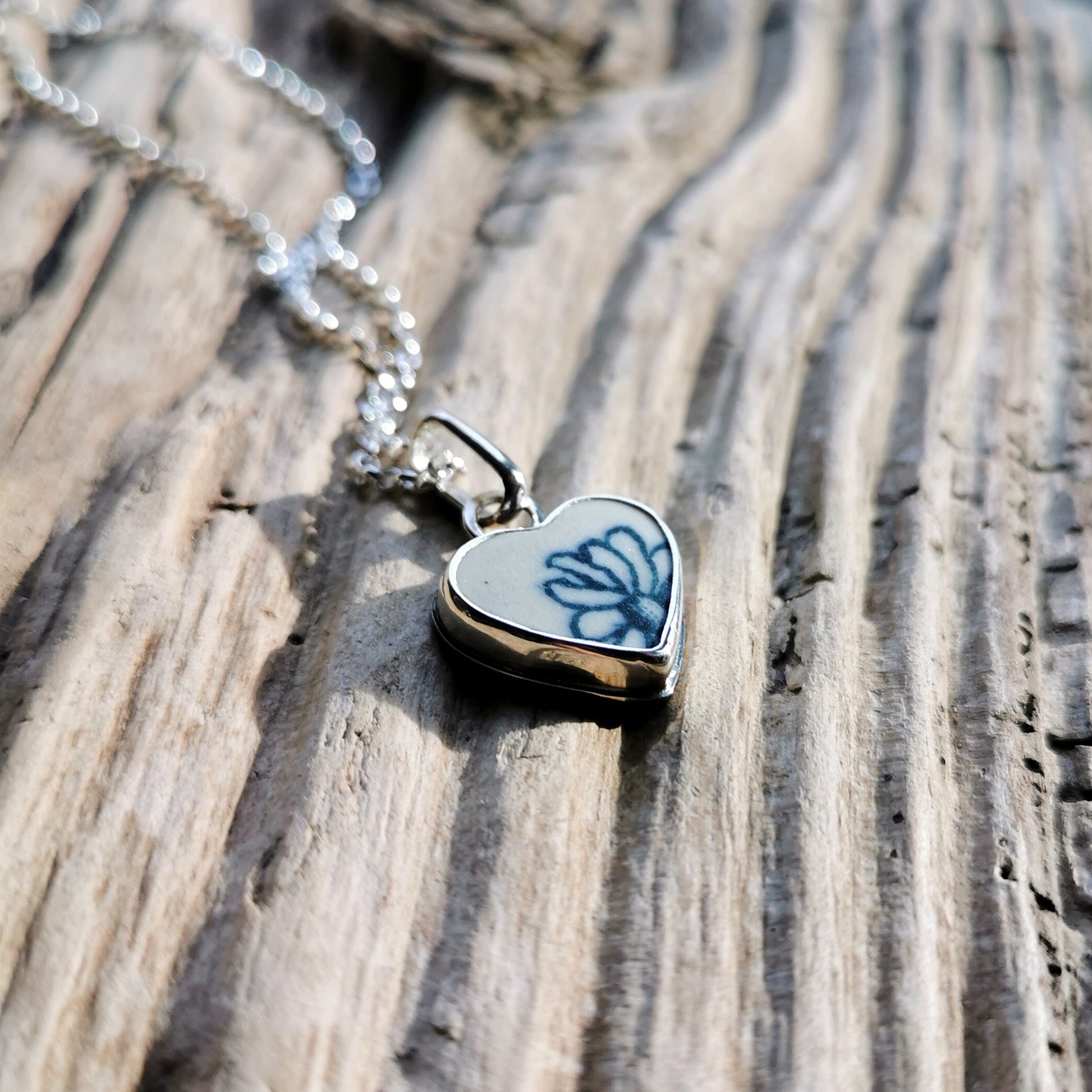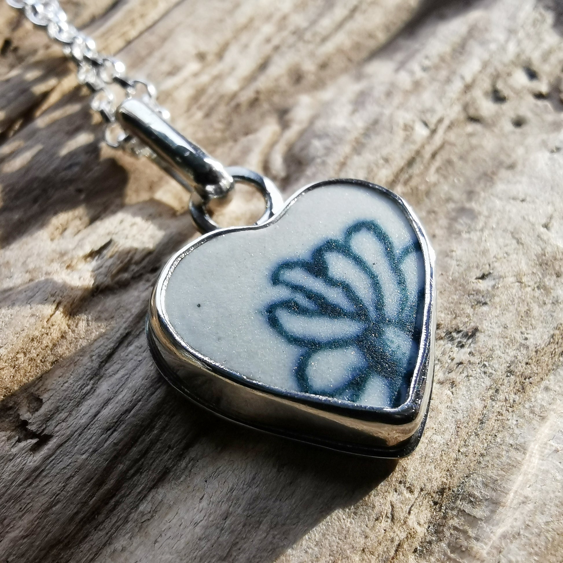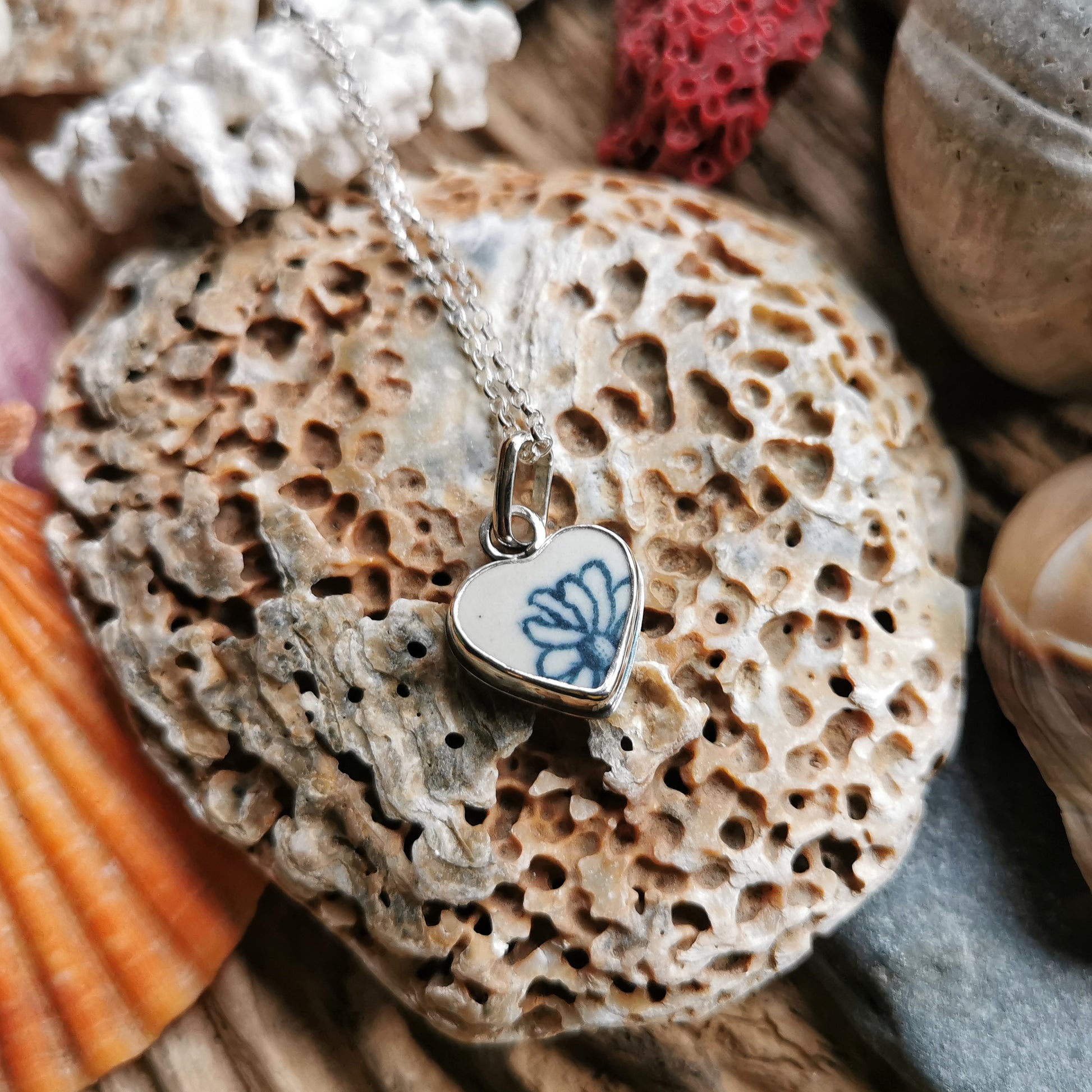 One of a kind pendant composed with genuine Scottish blue and white sea pottery found in Edinburgh. The sea pottery is set in fine silver bezel, the chain is sterling silver. I've shaped this sea glass heart myself.