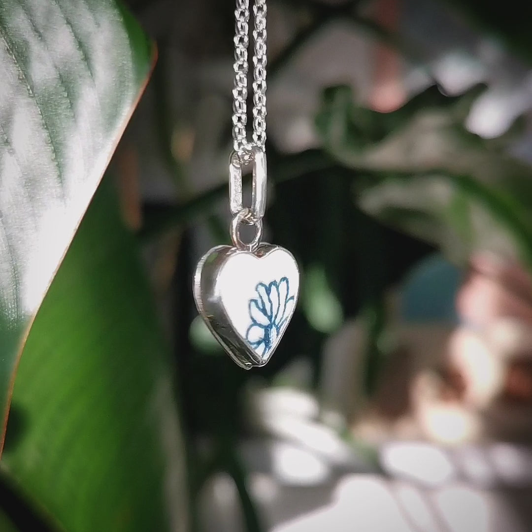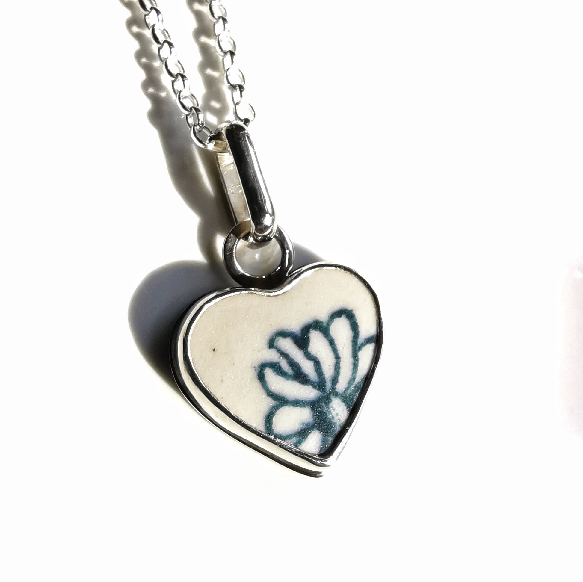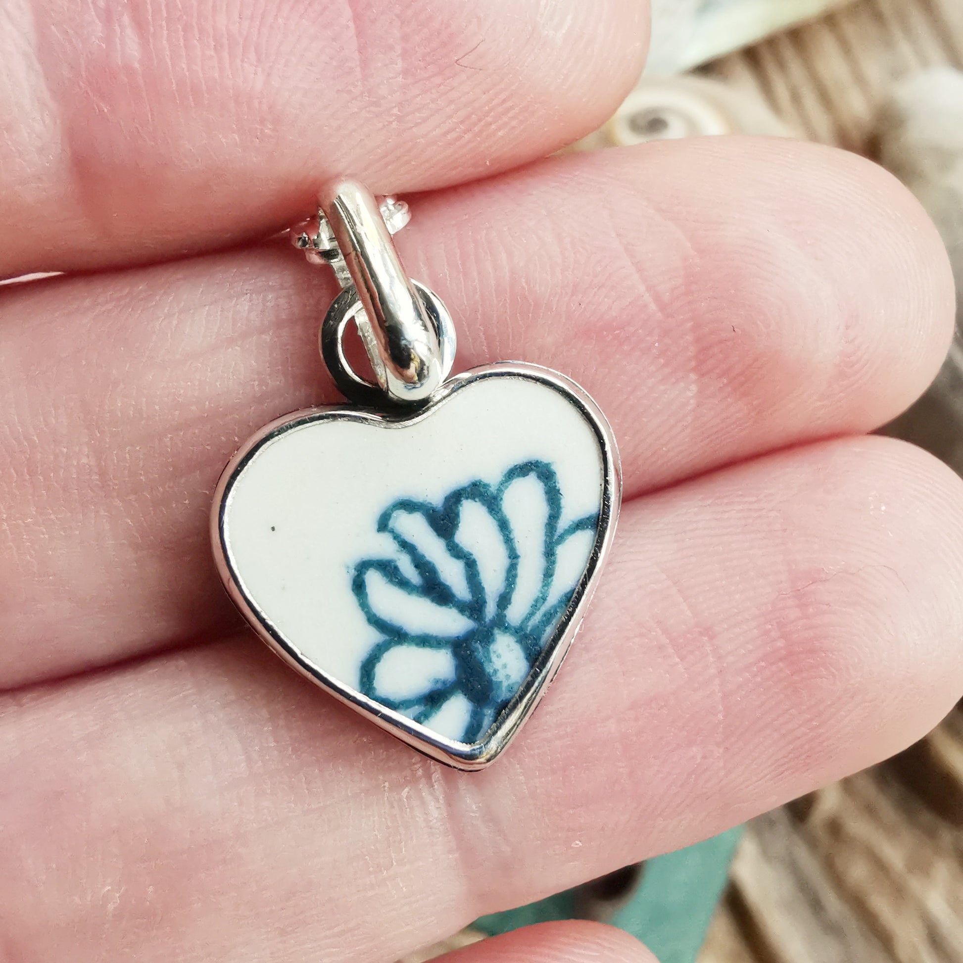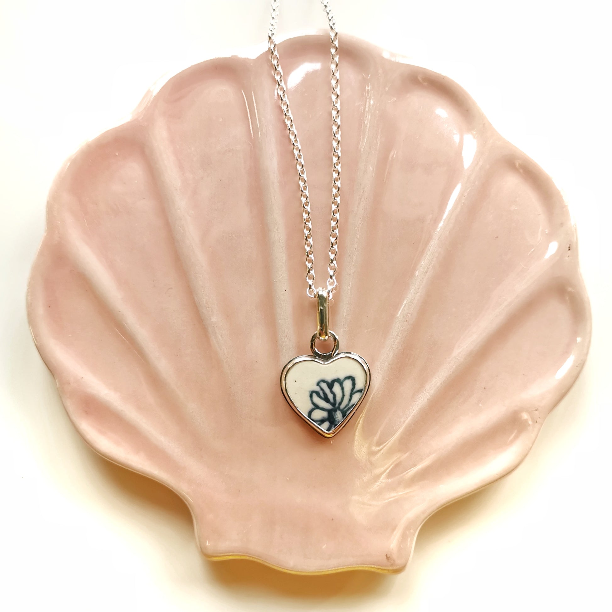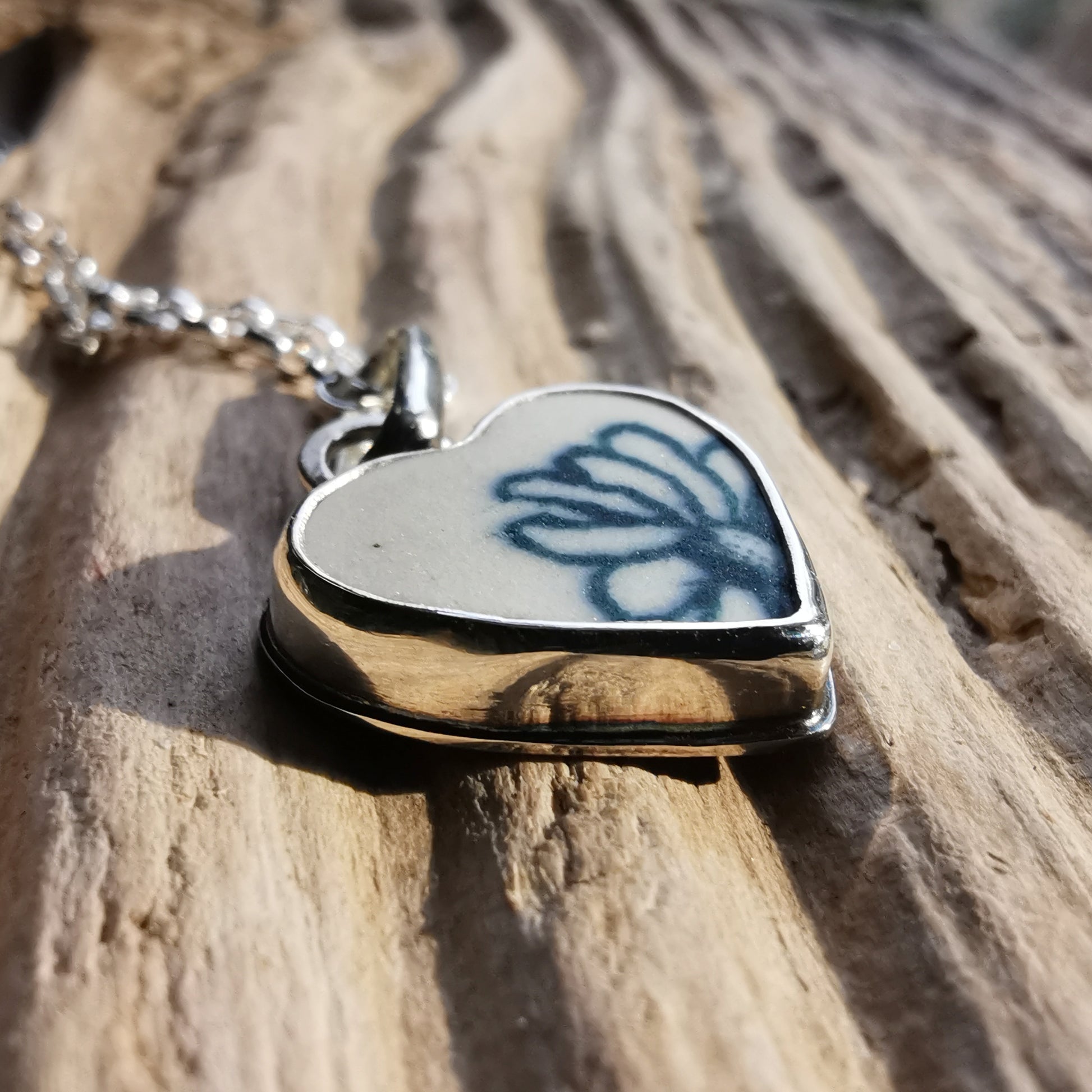One of a kind pendant composed with genuine Scottish blue and white sea pottery found in Edinburgh. The sea pottery is set in fine silver bezel, the chain is sterling silver. I've shaped this sea glass heart myself.