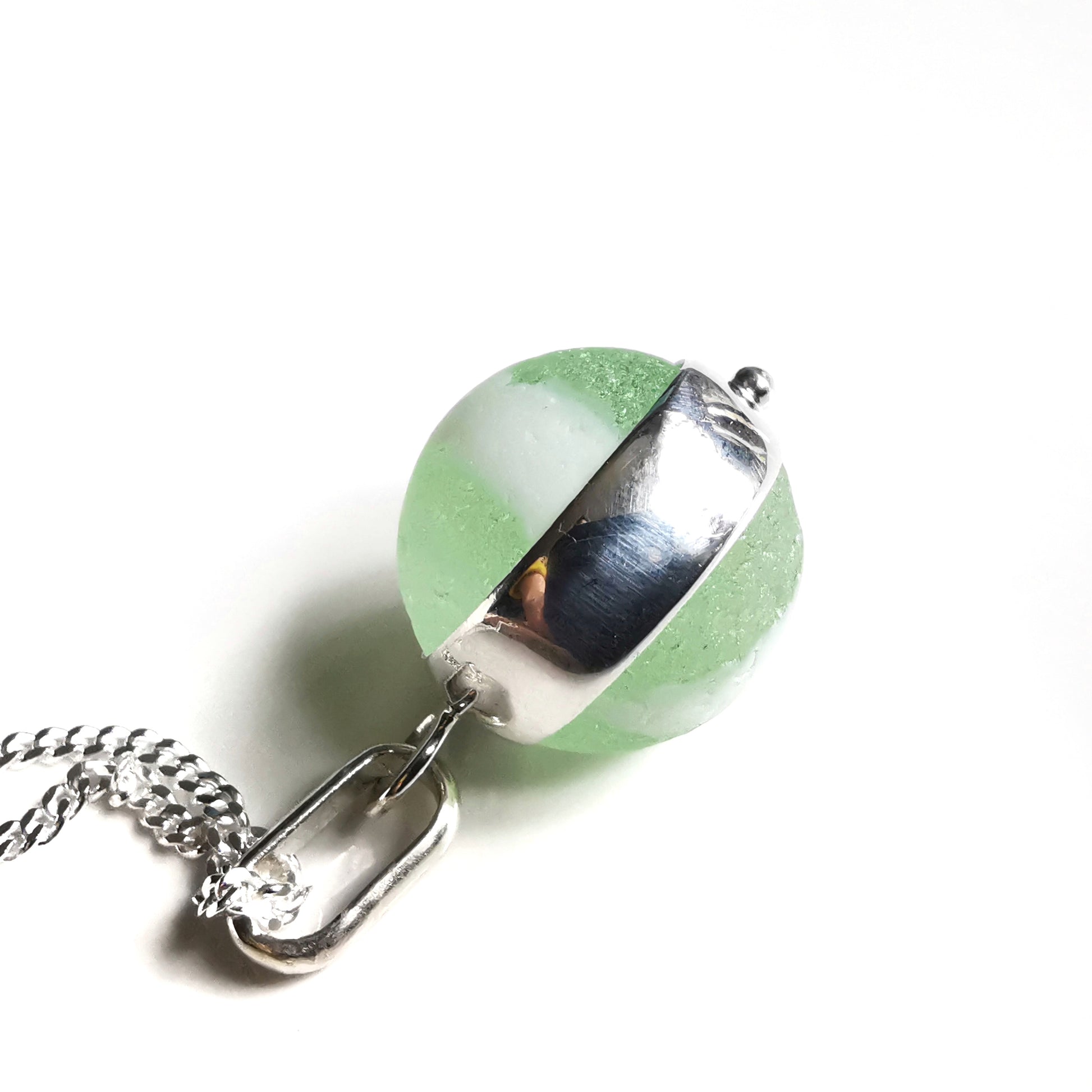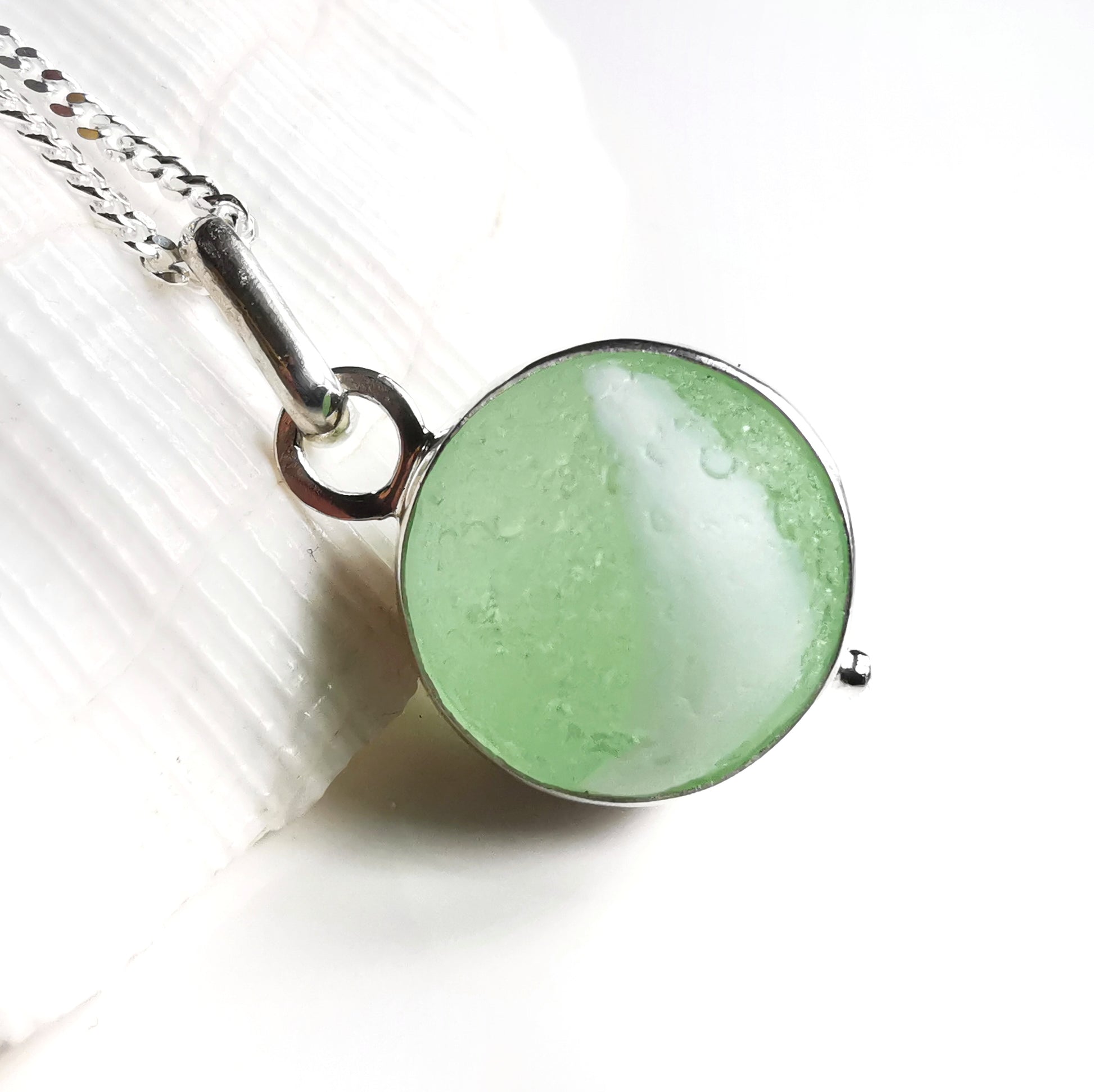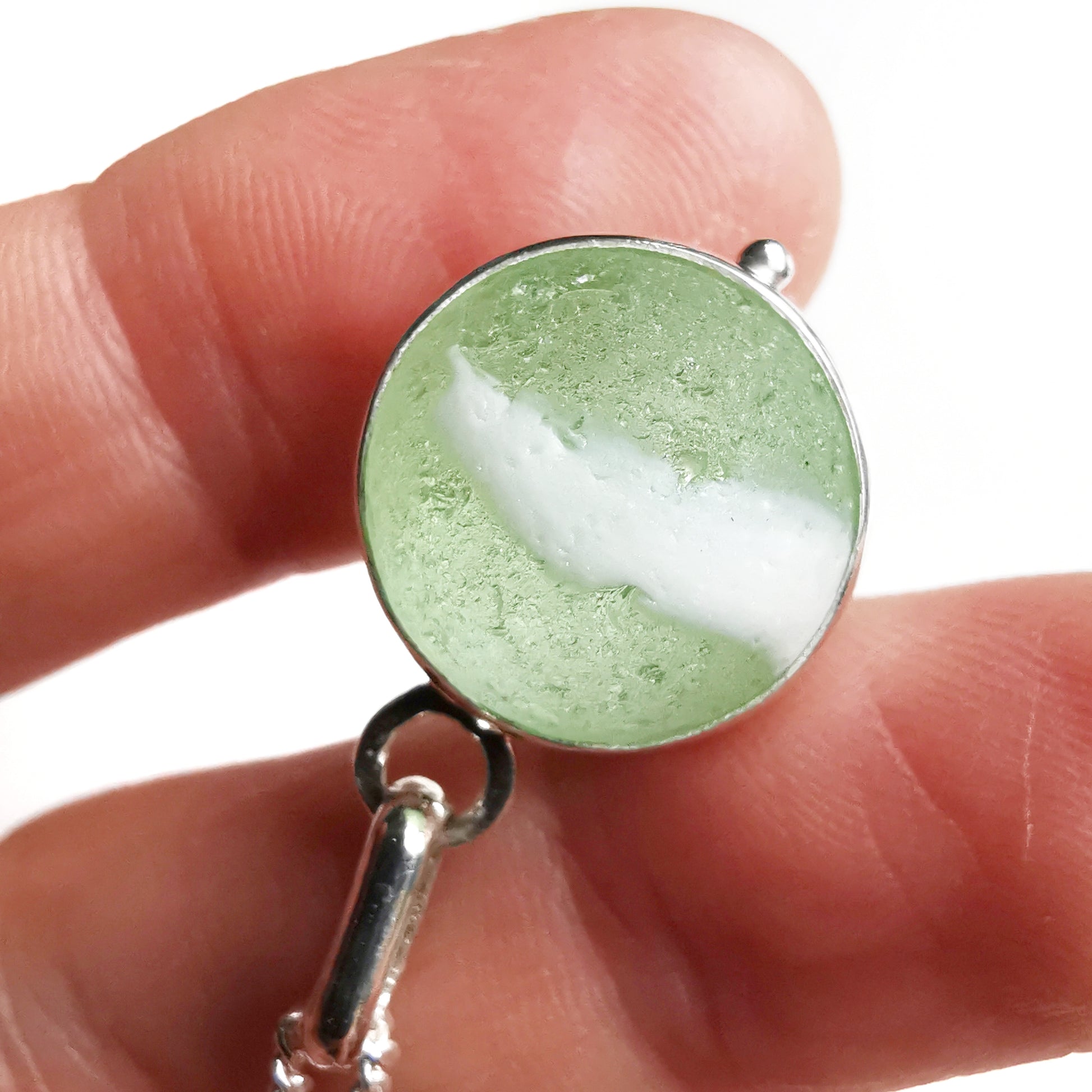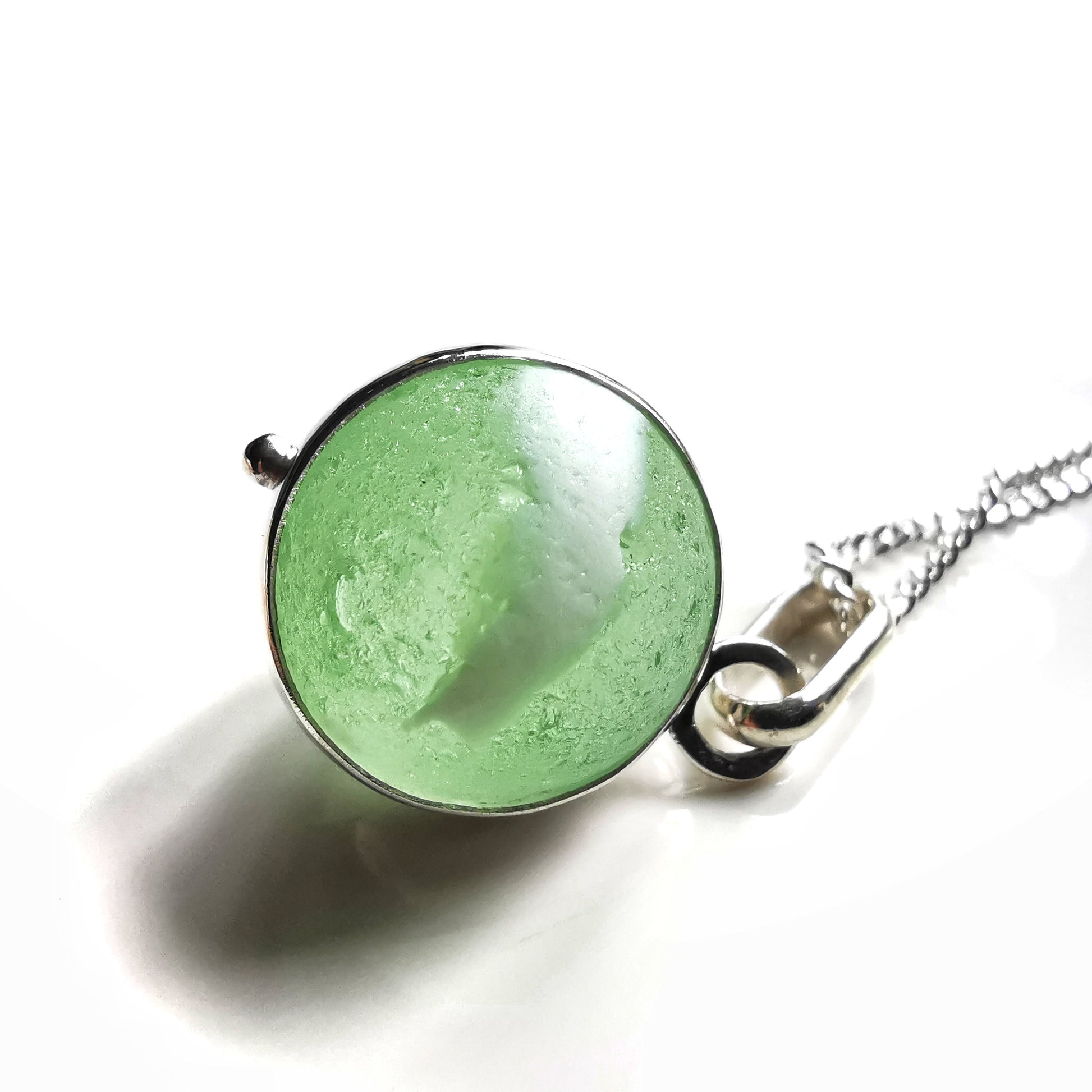 One of a kind pendant composed with genuine frosted green and white sea glass marble, found by myself on a beach in Edinburgh. The marble is set in fine silver bezel, the chain is sterling silver, marble can spin in the bezel, this is normal and it's not a fault.