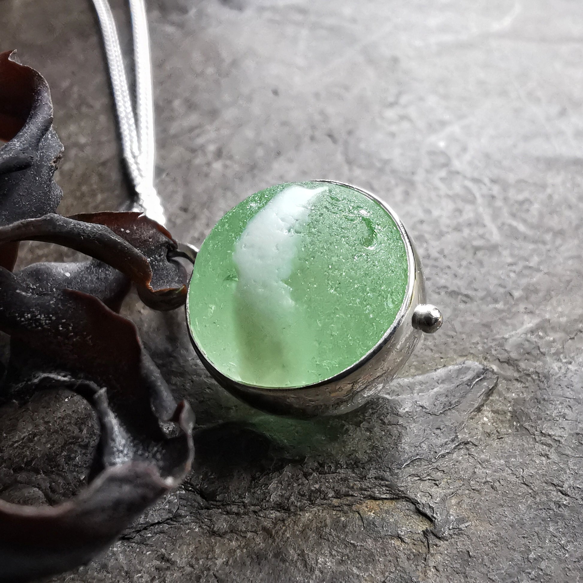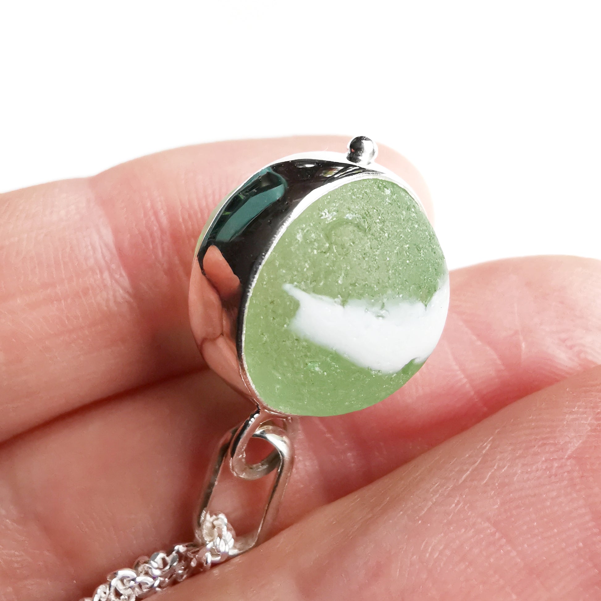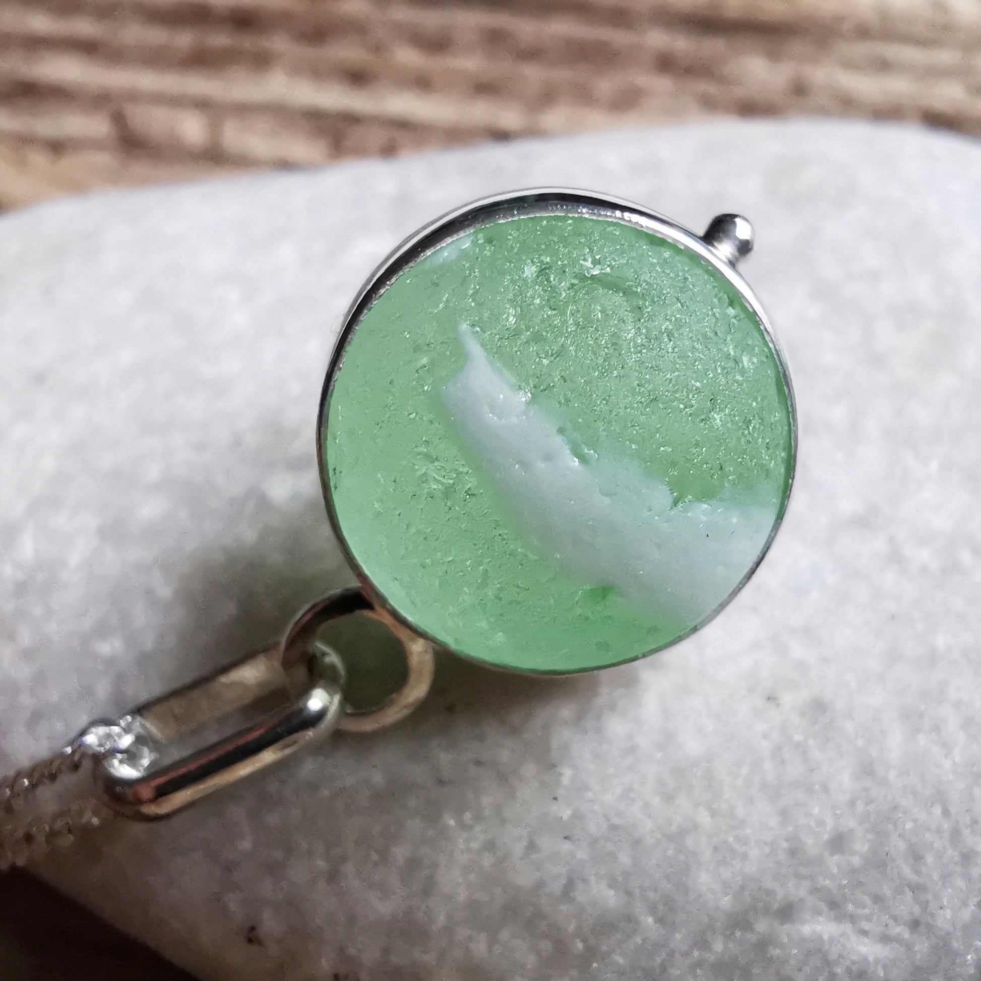 One of a kind pendant composed with genuine frosted green and white sea glass marble, found by myself on a beach in Edinburgh. The marble is set in fine silver bezel, the chain is sterling silver, marble can spin in the bezel, this is normal and it's not a fault.