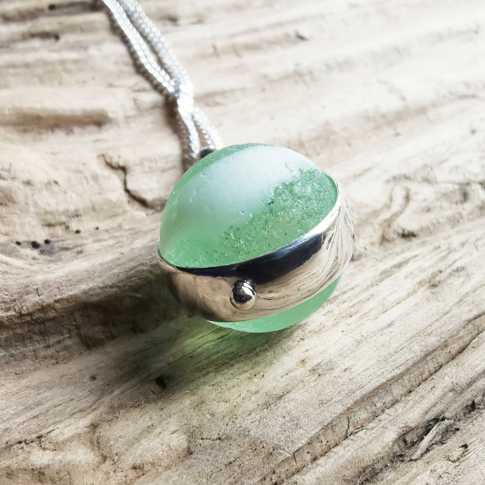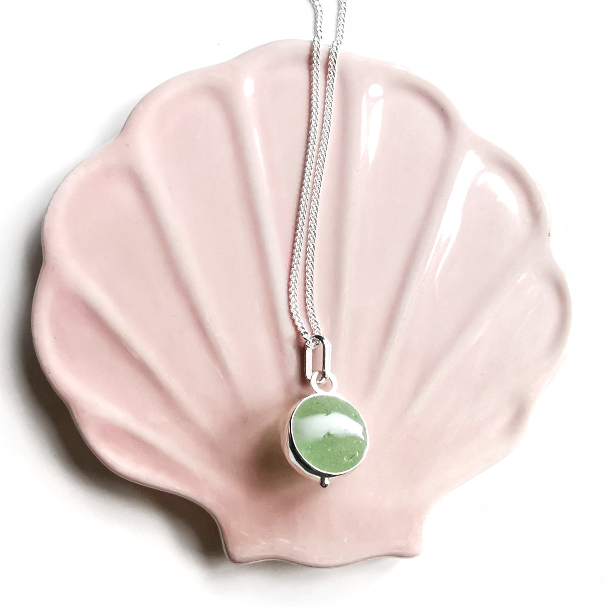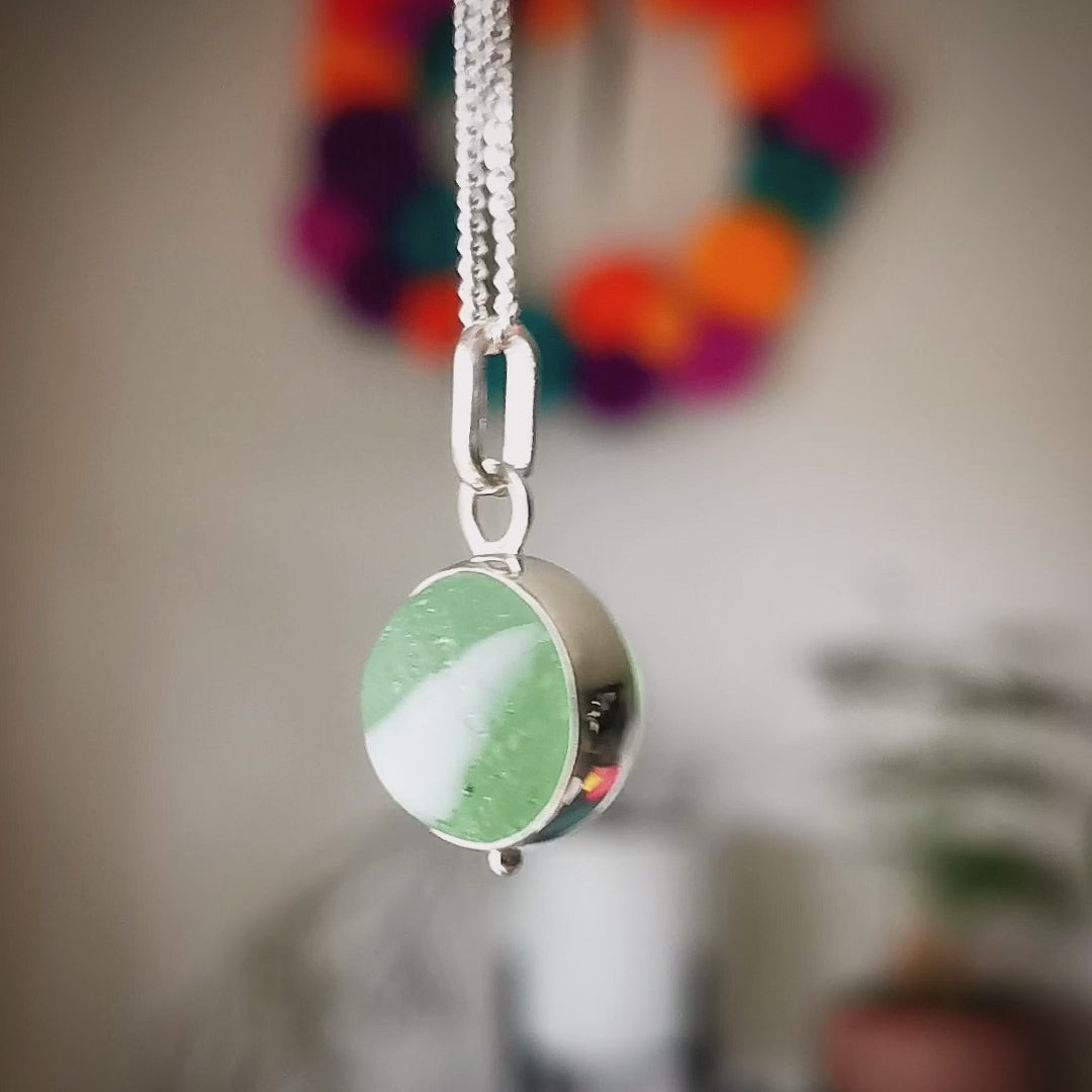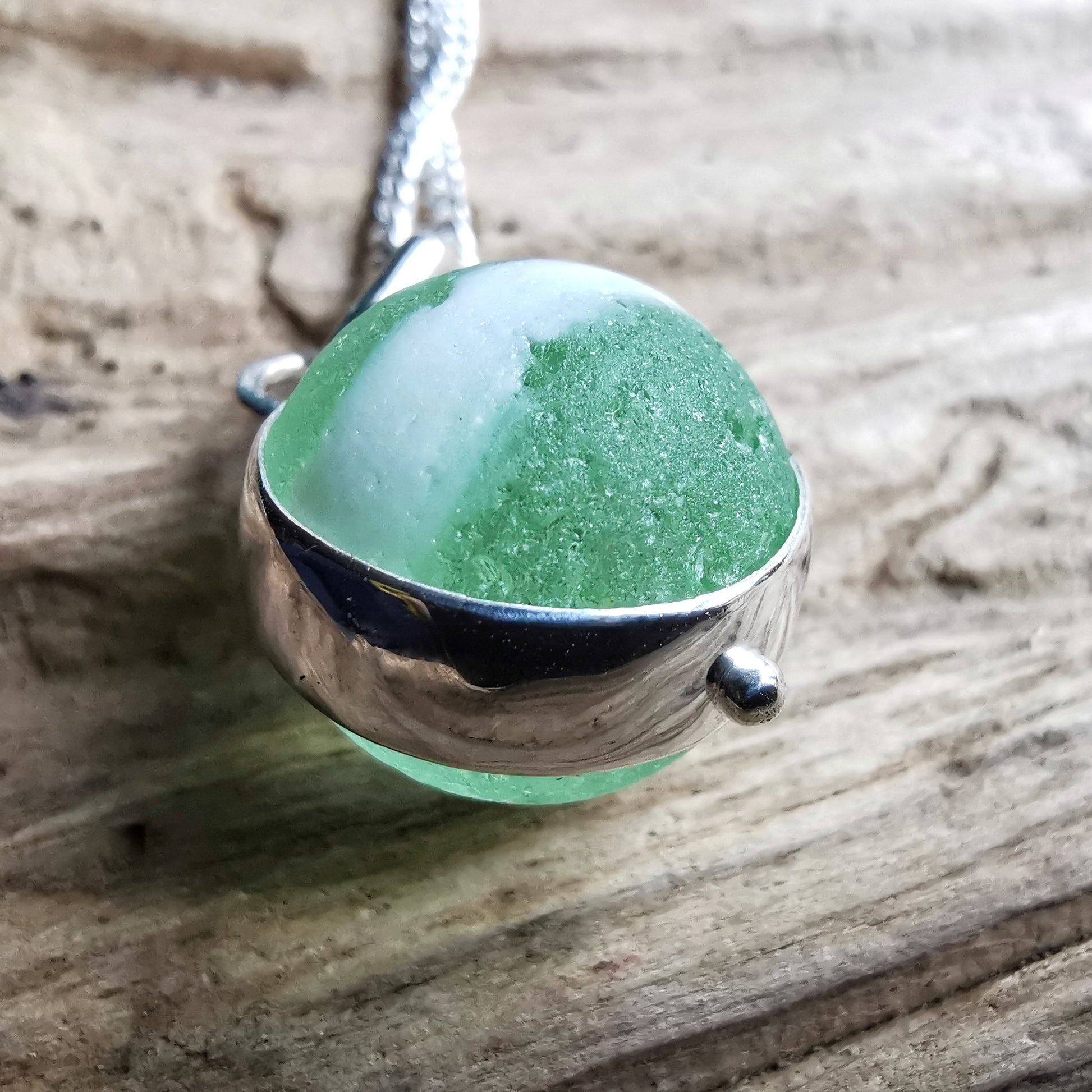 One of a kind pendant composed with genuine frosted green and white sea glass marble, found by myself on a beach in Edinburgh. The marble is set in fine silver bezel, the chain is sterling silver, marble can spin in the bezel, this is normal and it's not a fault.