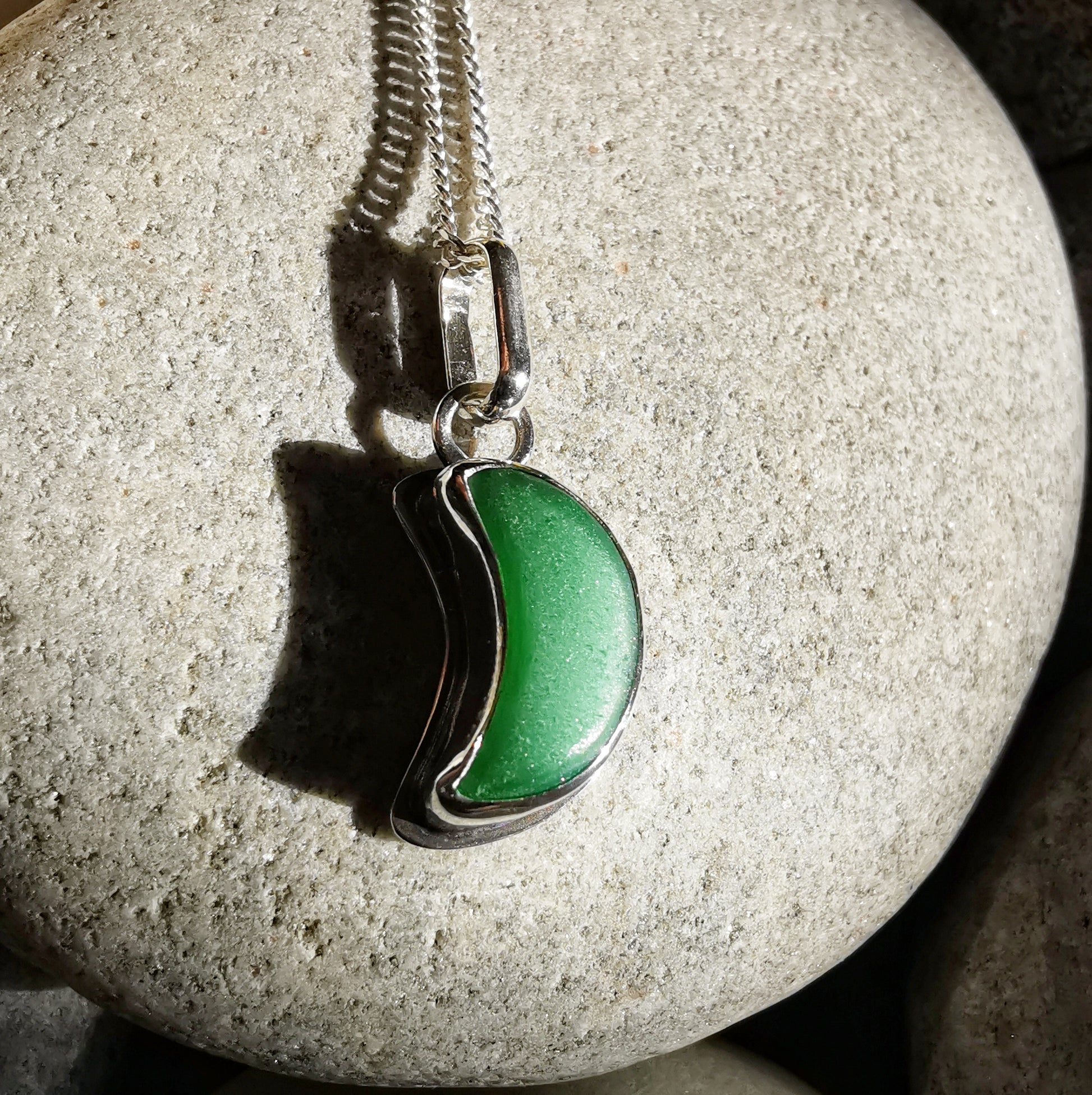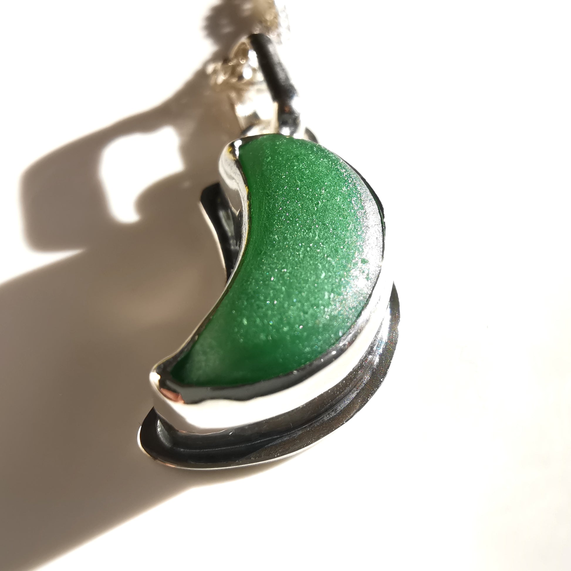 Scottish green crescent moon sea glass & sterling silver pendant.