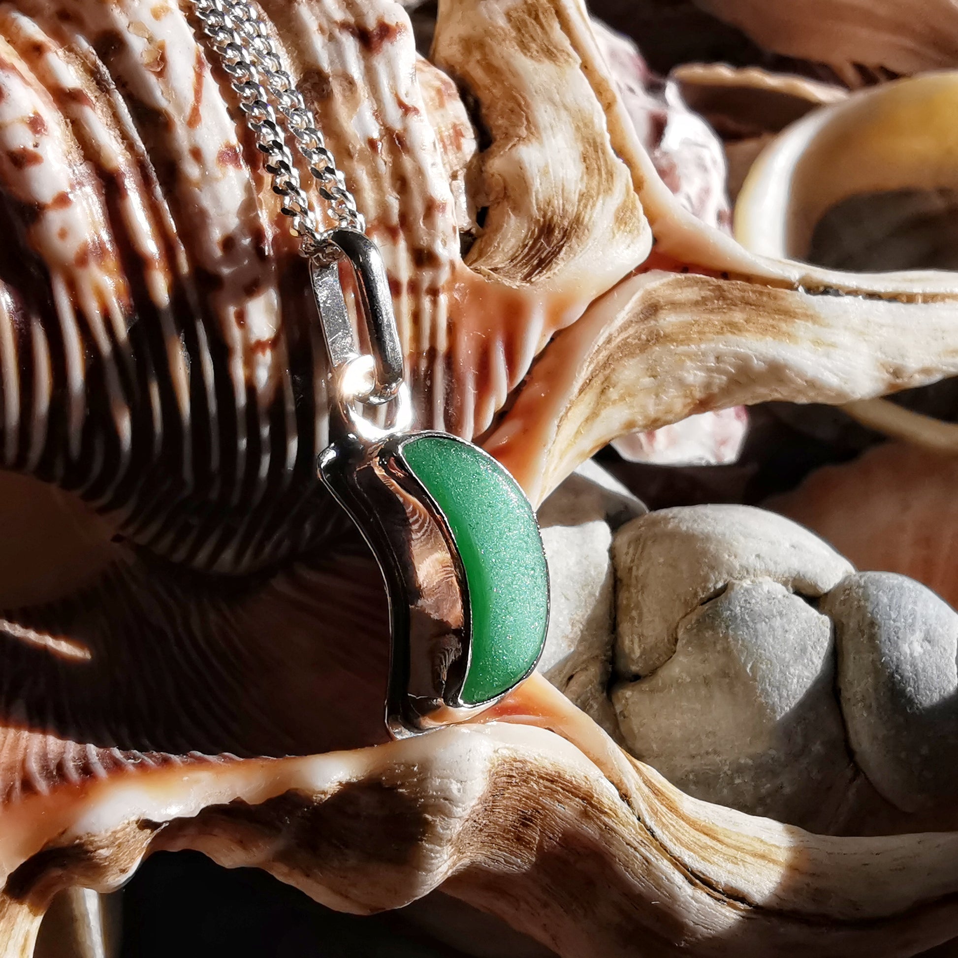One of a kind pendant composed with Scottish green sea glass found by myself on a beach in Edinburgh.